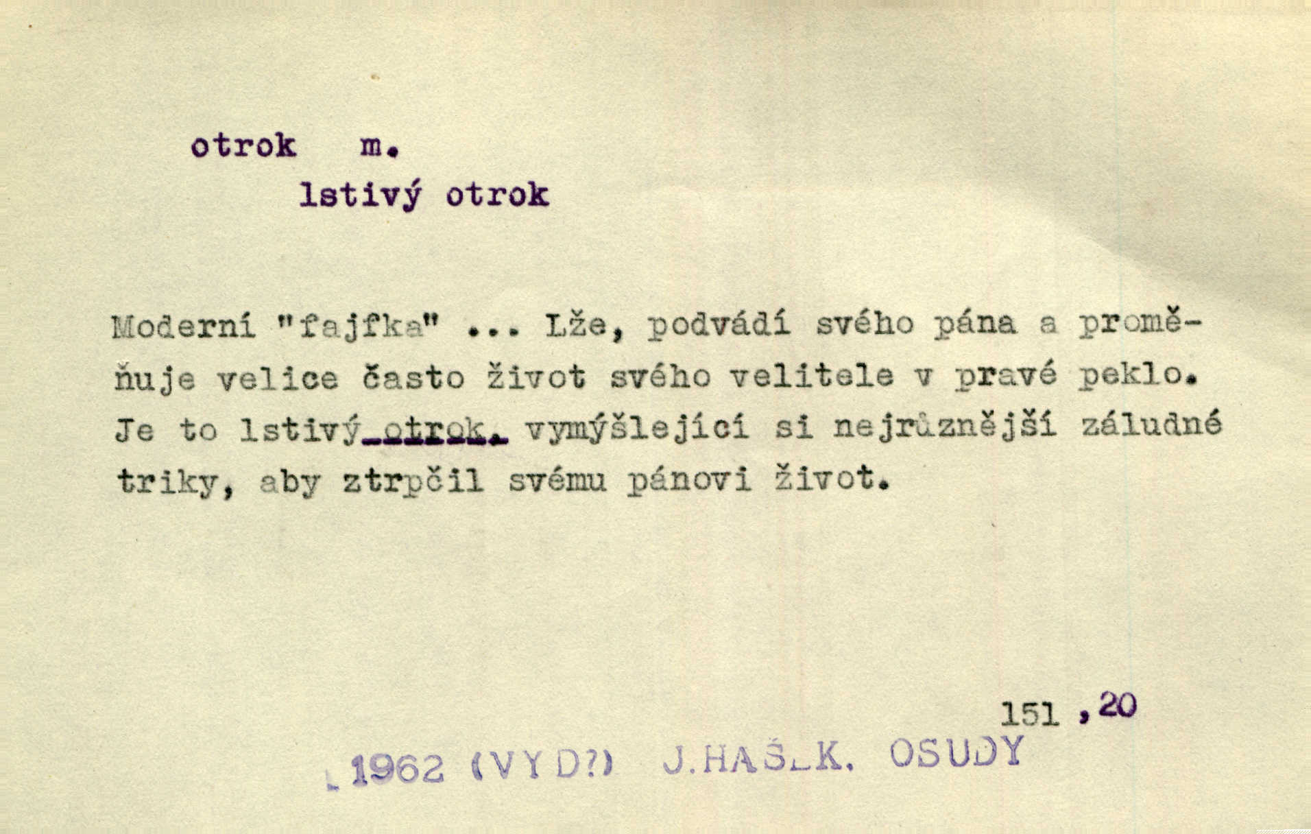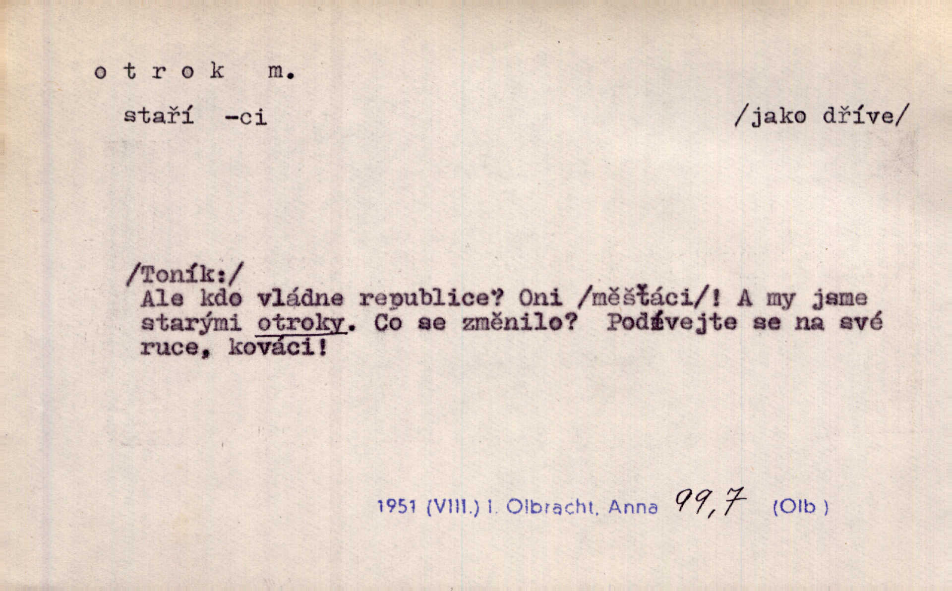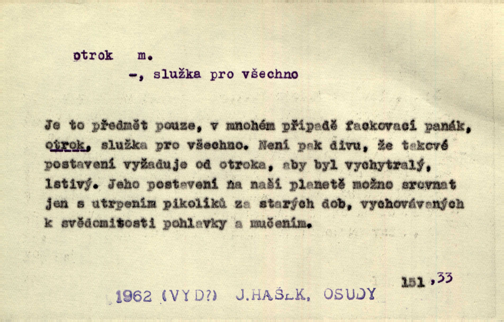 - otrok, -a m. člověk, který je zbaven všech občanských práv a je považován za majetek, věc druhého, nevolník, rab. Rolnictvím ani pastýřstvím se [Markomani a Kvádové] nezabývali sami, nýbrž užívali k tomu otroků, jednak to zbytků podmaněných kmenů starousedlých, jednak zajatců z častých válek. Vlastiv. Chytili ho [prince] loupežníci a prodali za otroka. Rad. Před dvaceti lety byl náš lid ještě polovičním otrokem, robotníkem. Svět. D (koho, čeho) člověk nemající svobodné vůle, nýbrž ovládaný, řízený někým n. něčím, závisící úplně na někom n. něčem. Ať s nimi [penězi]‚ ať bez nich, jste vždycky jejich otrokem. V. Mrš. Co dělat, můj ubohý příteli! Jsme všichni otroci okolností. Havl. Komu je zženštilé pohodlí potřebou, jest otrokem sebe sama. Hol. Byl jsem otrok snů a hříčka větrů. Vrch. Já, otrok péra, myšlenek však pán. Vrch. On ženu miloval a — otrok její krásy — snést pláče nemohl a plnil její sen. Klášt. Nikdy na mně nežádal [bratr]‚ abych rozum otrokem vášně učinil. Klicp. D Dial. nadávka n. žertovné oslovení. Ty otroku otrocká, tak ty takhle. Jir. „Proč brečíš, votroku?“ ptal se ho spolužák Řehák. Herrm. Hradečáci mají privilej na slůvko „votroku!“ Herrm. Koukal’s, abys viděl. Abys viděl a shledal dobrého bratra a kamaráda, který se třebas jmenoval Ferbas a byl krajan, „votrok“, Hradečák. Med.