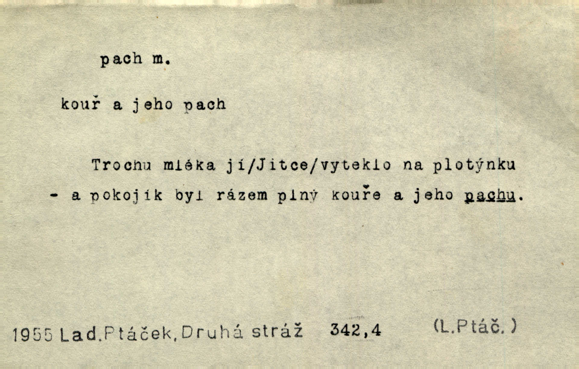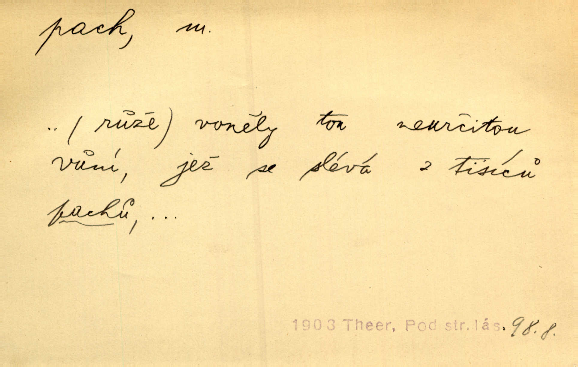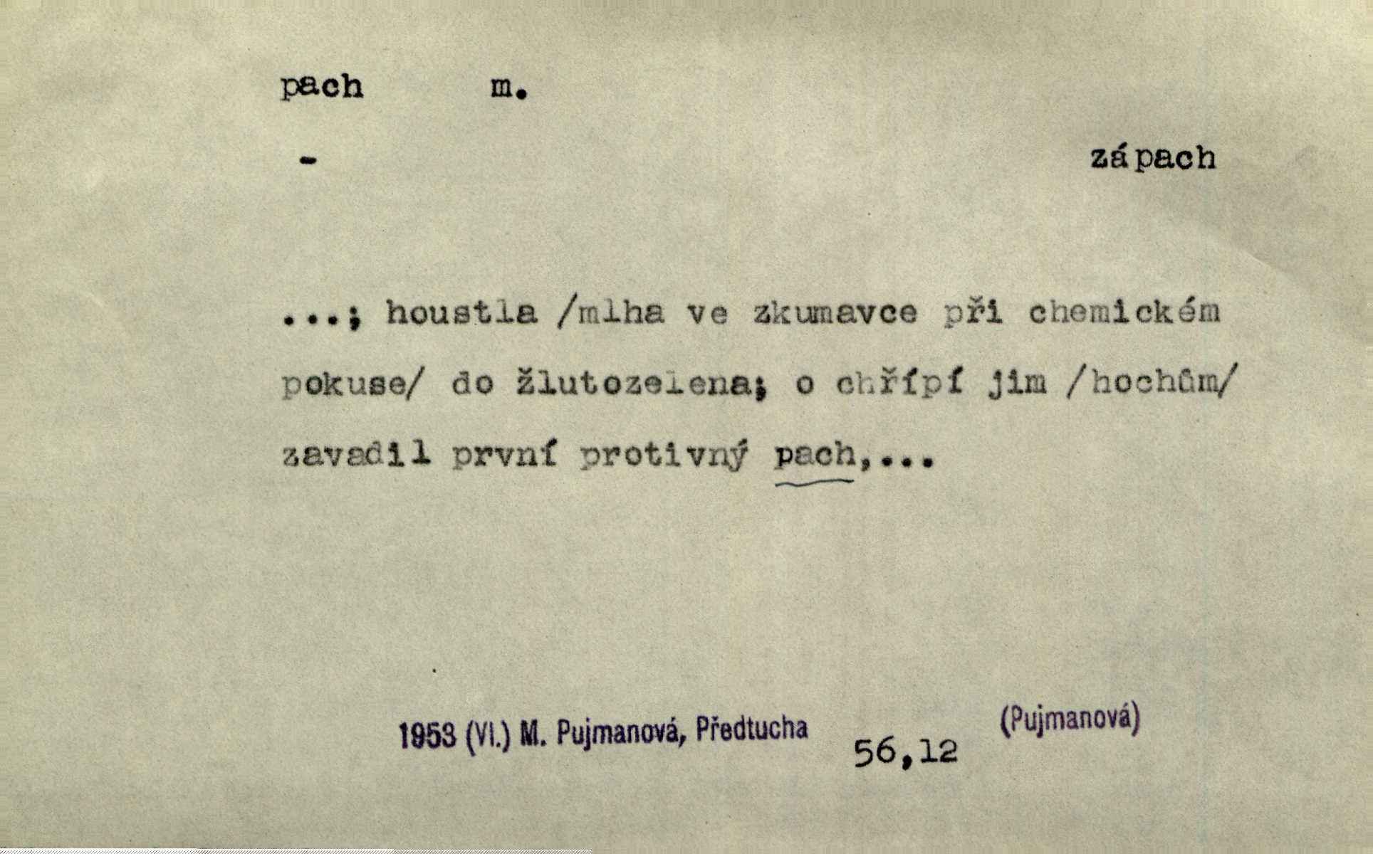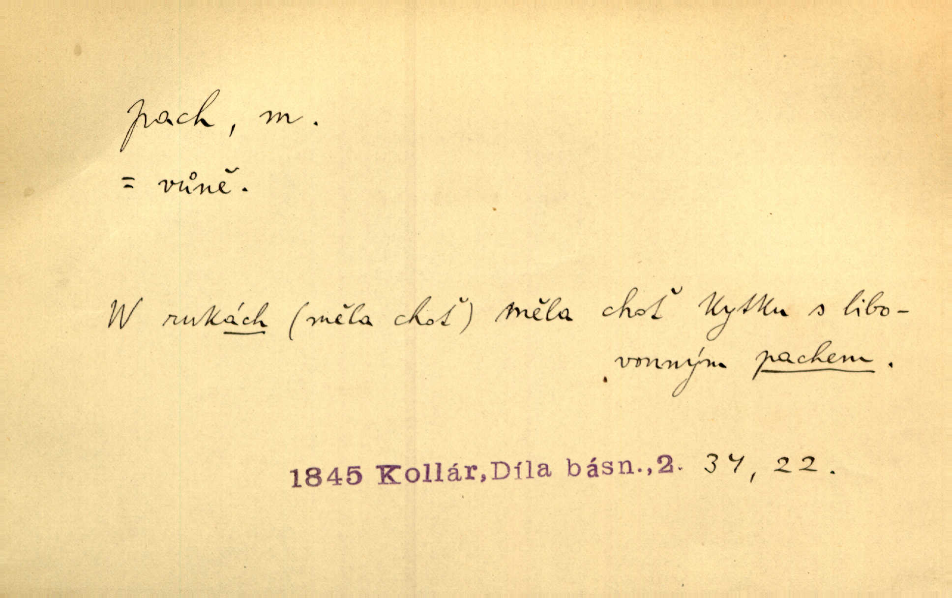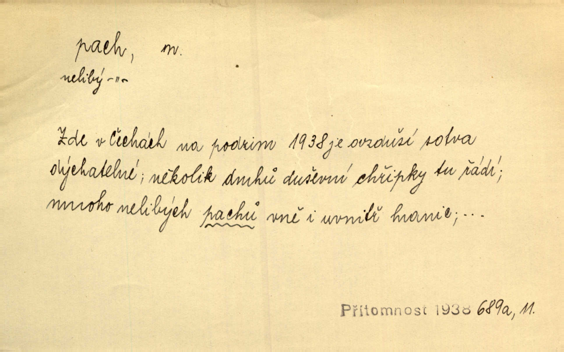 - pach, -u m. čichový vjem libý i nelibý, vůně n. zápach. Pach květů s chladem snoubil se. Zey. Vzduchem vznášel se omamný pach červnové noci. K. Červ. [Růže] voněly tou neurčitou vůní, jež se slévá z tisíců pachů. Theer. Z kuchyně už zaváněla káva a mdlý, sladký pach vanilky. Herrm. Otevřenými dveřmi [hospůdky] ho udeřil pivní a masný pach. Mart. Je [Růžena] suchá, jako vysmahlá žárem zevnitř, z podpaždí se jí dere prudký pach. Šrám. Bylo mu těžko v horkém pokoji, kde cítil pach obkladů, moče, čaje a vajec. K. Čap. Jsou záhadné pachy, záhadná záření očí, nepostižitelná fluida, která provázejí každého z nás. Kop.