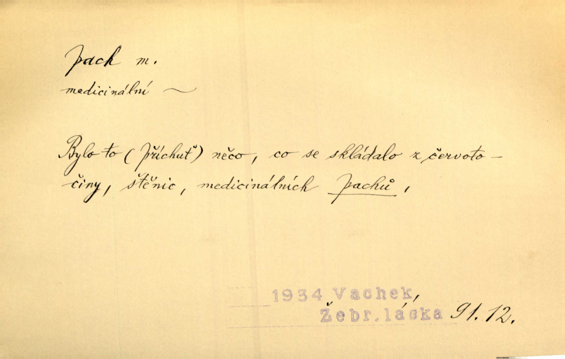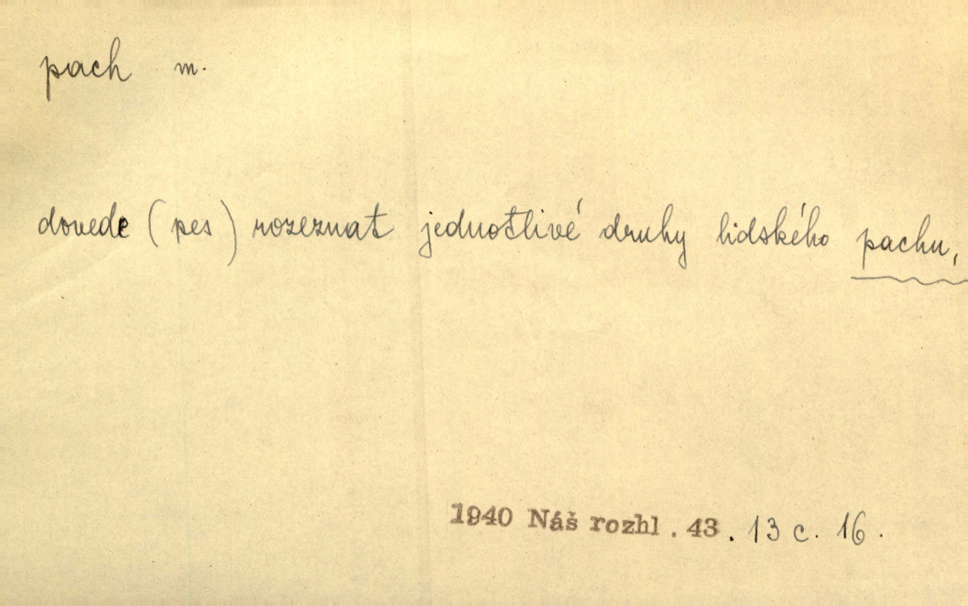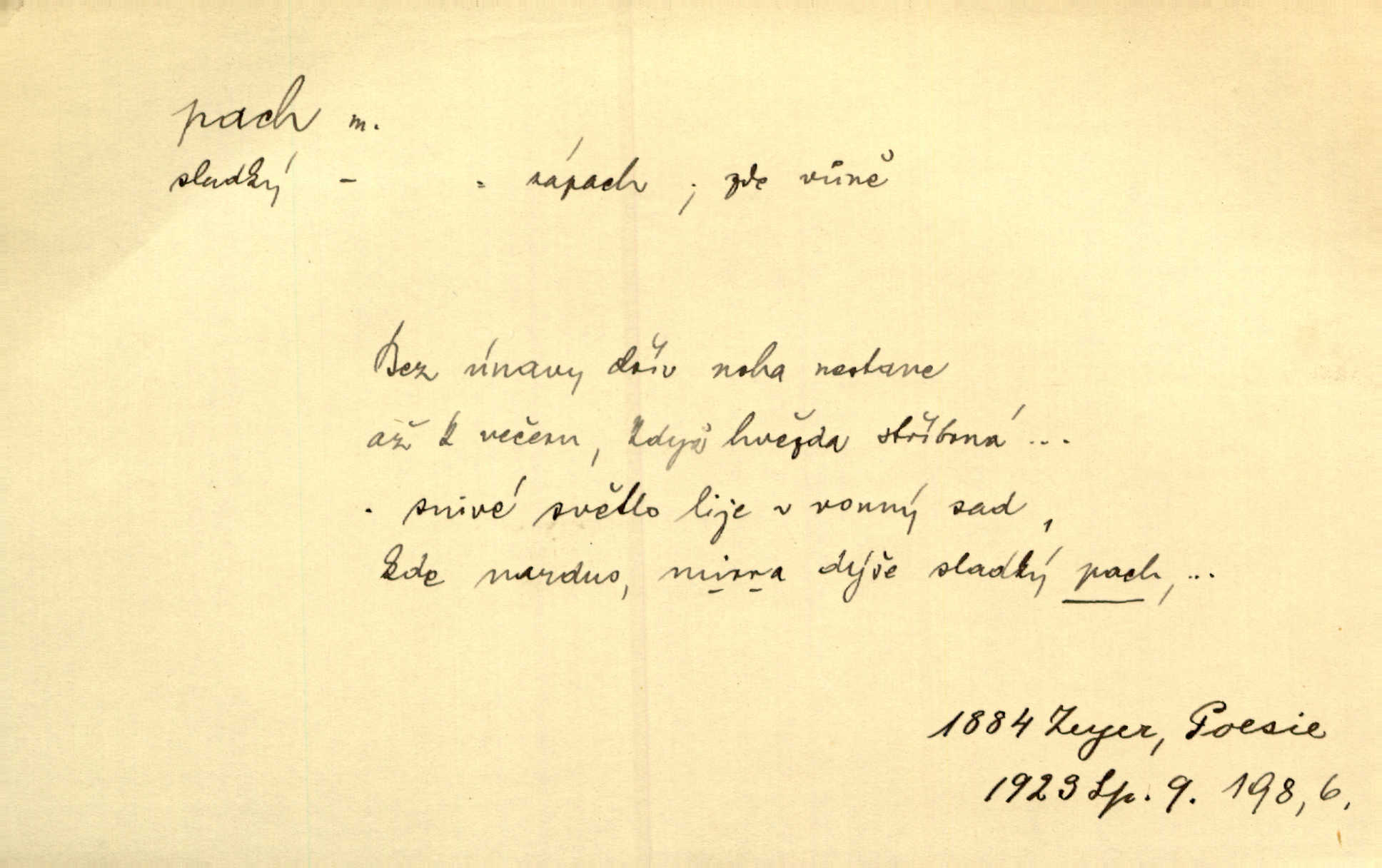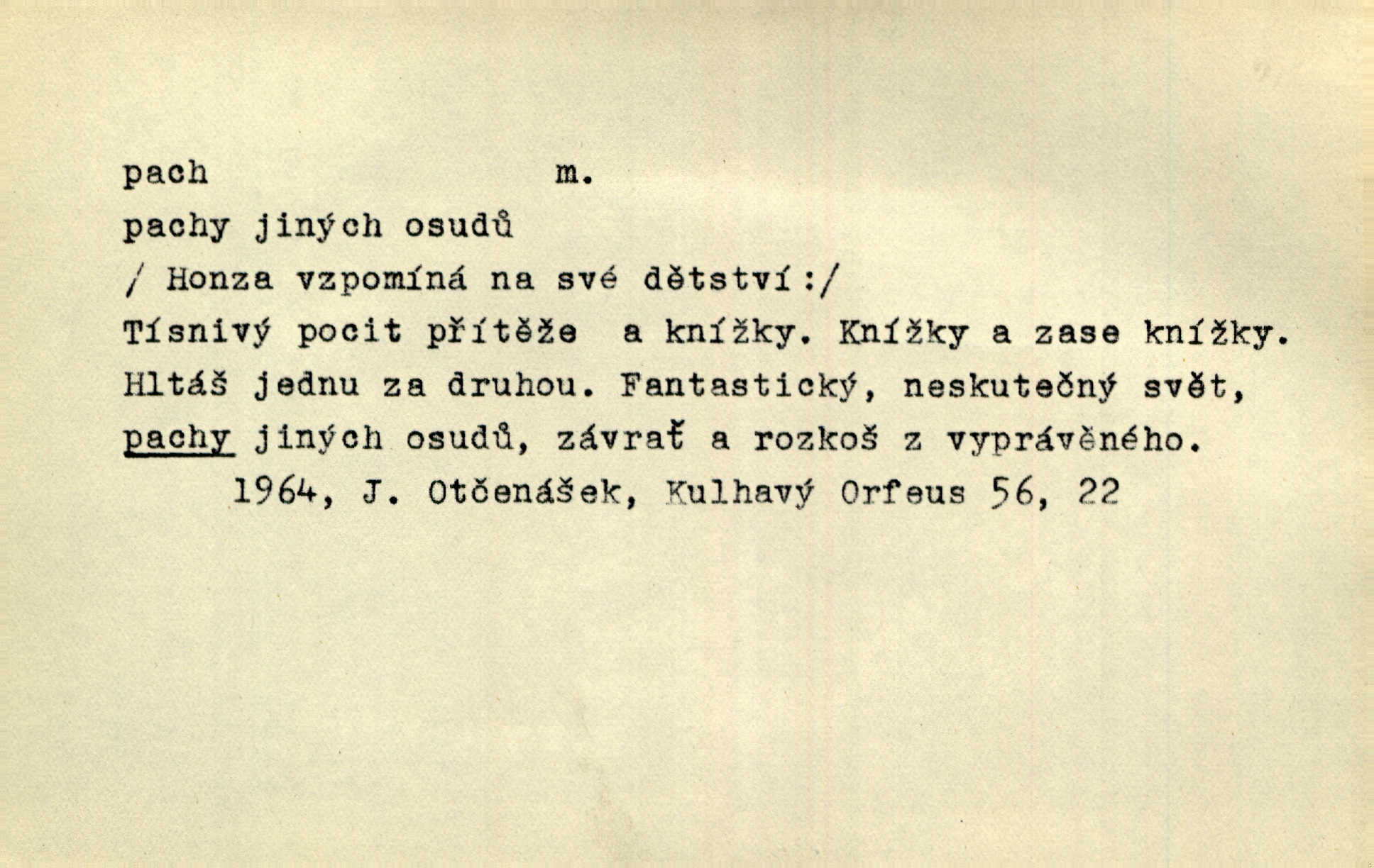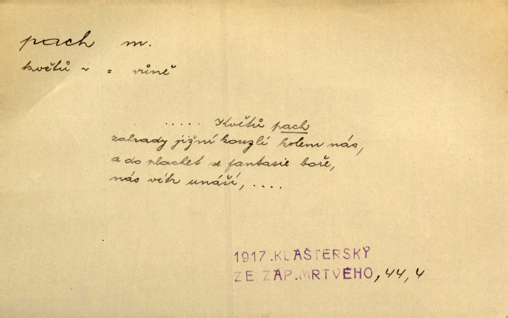 - pach, -u m. čichový vjem libý i nelibý, vůně n. zápach. Pach květů s chladem snoubil se. Zey. Vzduchem vznášel se omamný pach červnové noci. K. Červ. [Růže] voněly tou neurčitou vůní, jež se slévá z tisíců pachů. Theer. Z kuchyně už zaváněla káva a mdlý, sladký pach vanilky. Herrm. Otevřenými dveřmi [hospůdky] ho udeřil pivní a masný pach. Mart. Je [Růžena] suchá, jako vysmahlá žárem zevnitř, z podpaždí se jí dere prudký pach. Šrám. Bylo mu těžko v horkém pokoji, kde cítil pach obkladů, moče, čaje a vajec. K. Čap. Jsou záhadné pachy, záhadná záření očí, nepostižitelná fluida, která provázejí každého z nás. Kop.