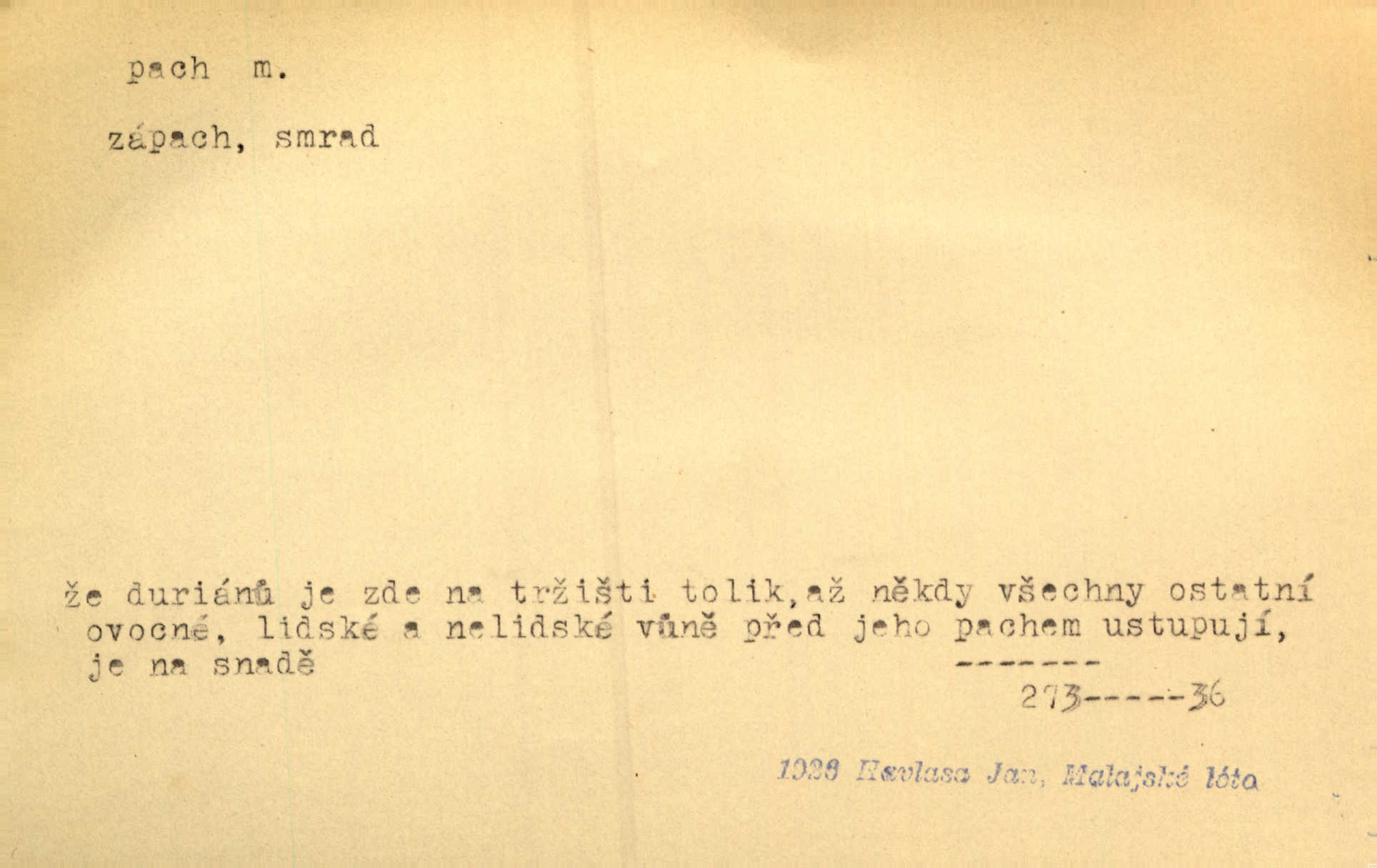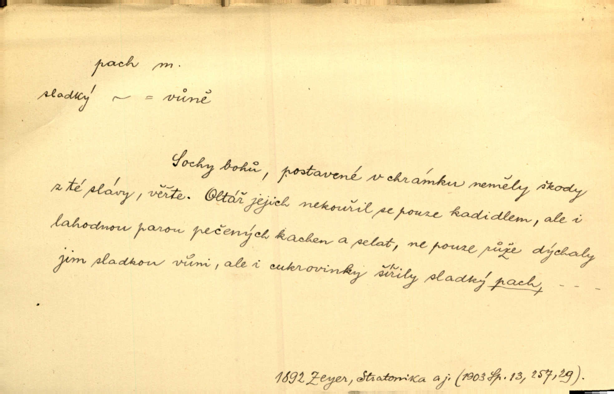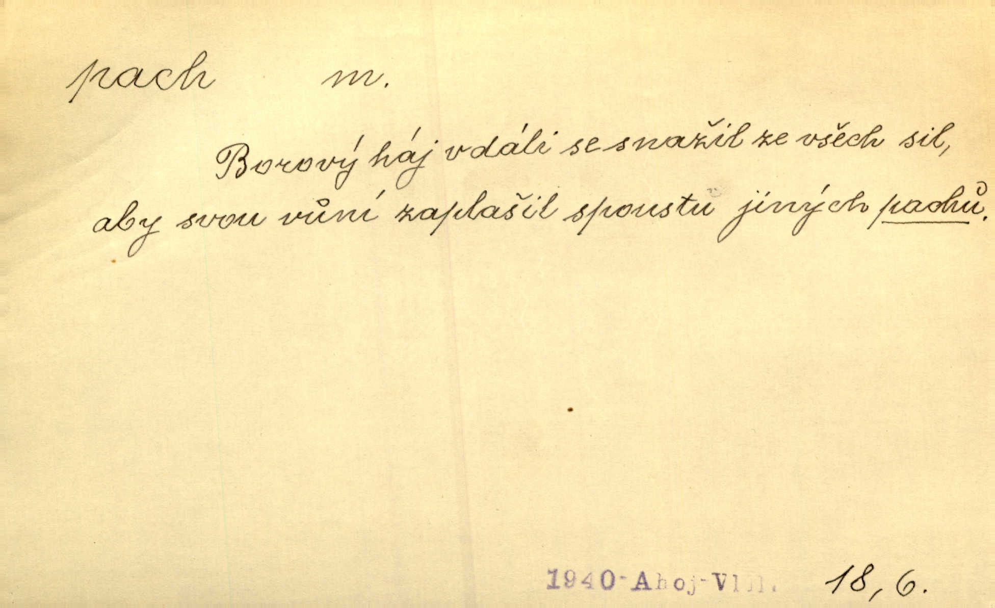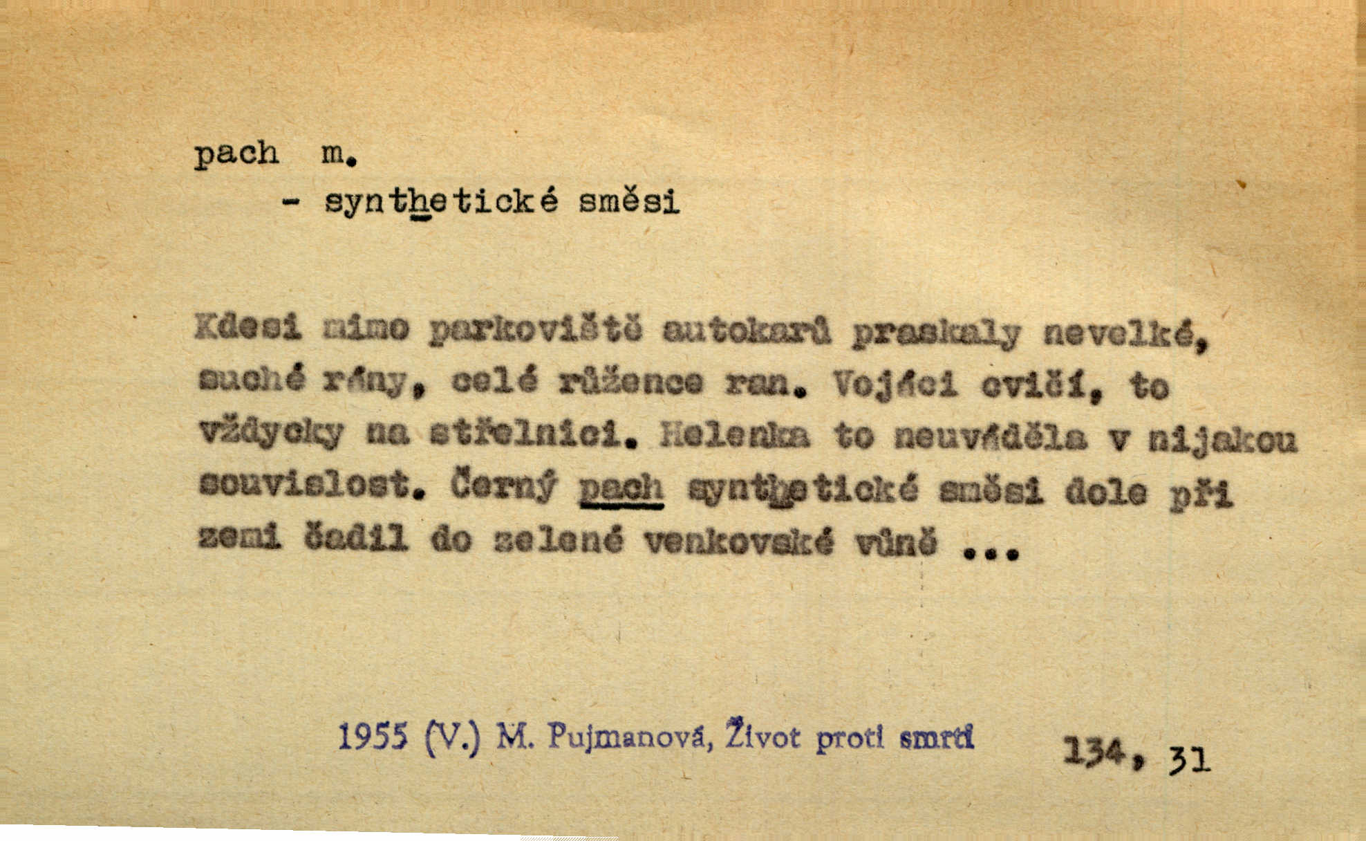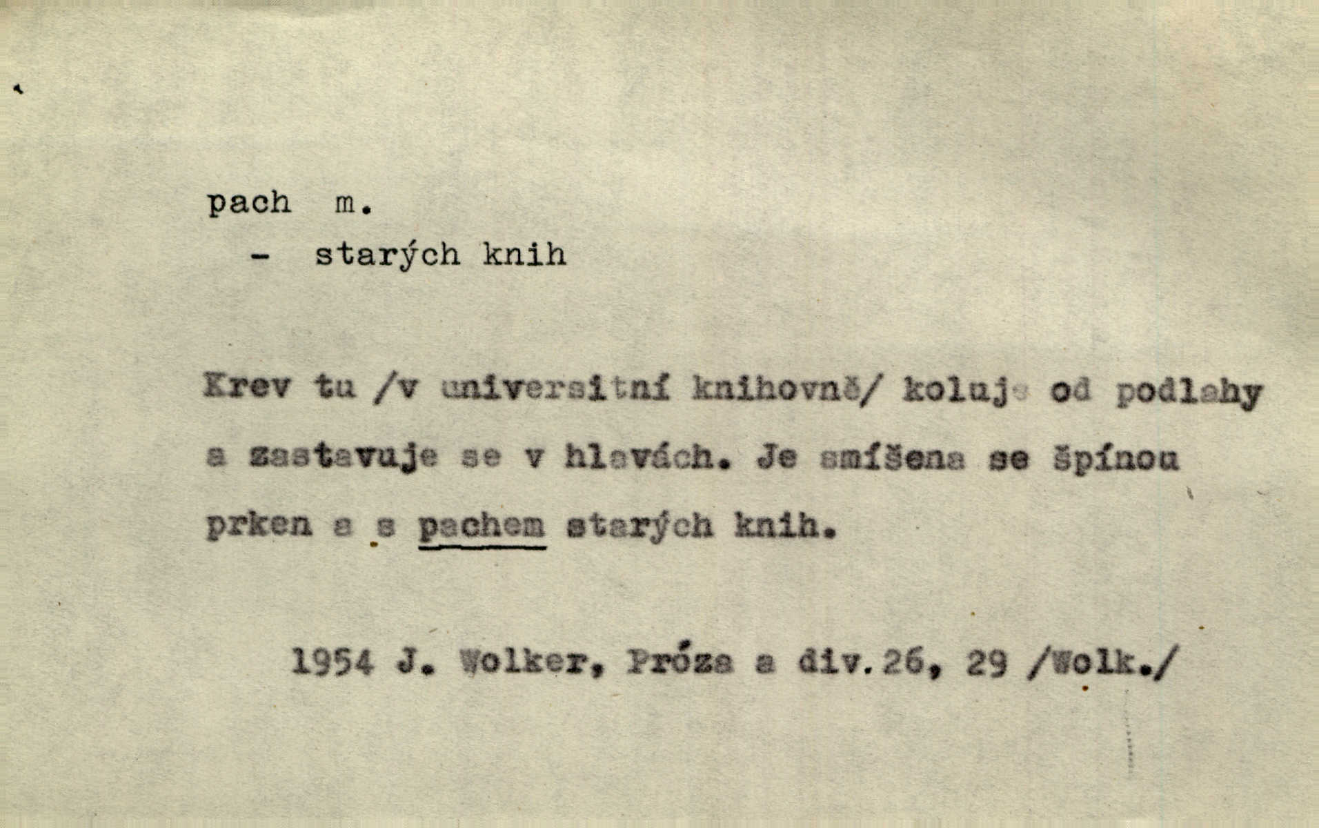 - pach, -u m. čichový vjem libý i nelibý, vůně n. zápach. Pach květů s chladem snoubil se. Zey. Vzduchem vznášel se omamný pach červnové noci. K. Červ. [Růže] voněly tou neurčitou vůní, jež se slévá z tisíců pachů. Theer. Z kuchyně už zaváněla káva a mdlý, sladký pach vanilky. Herrm. Otevřenými dveřmi [hospůdky] ho udeřil pivní a masný pach. Mart. Je [Růžena] suchá, jako vysmahlá žárem zevnitř, z podpaždí se jí dere prudký pach. Šrám. Bylo mu těžko v horkém pokoji, kde cítil pach obkladů, moče, čaje a vajec. K. Čap. Jsou záhadné pachy, záhadná záření očí, nepostižitelná fluida, která provázejí každého z nás. Kop.