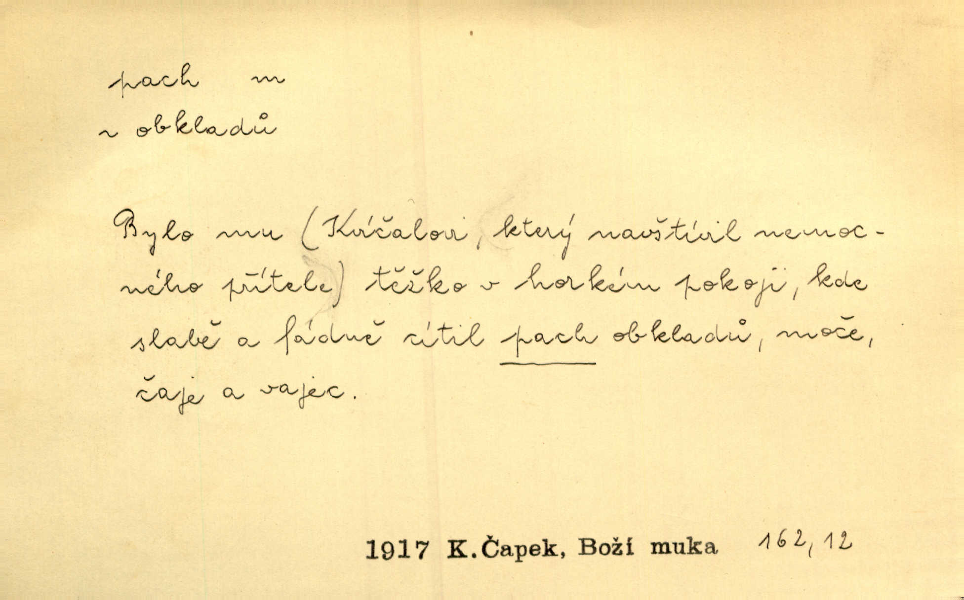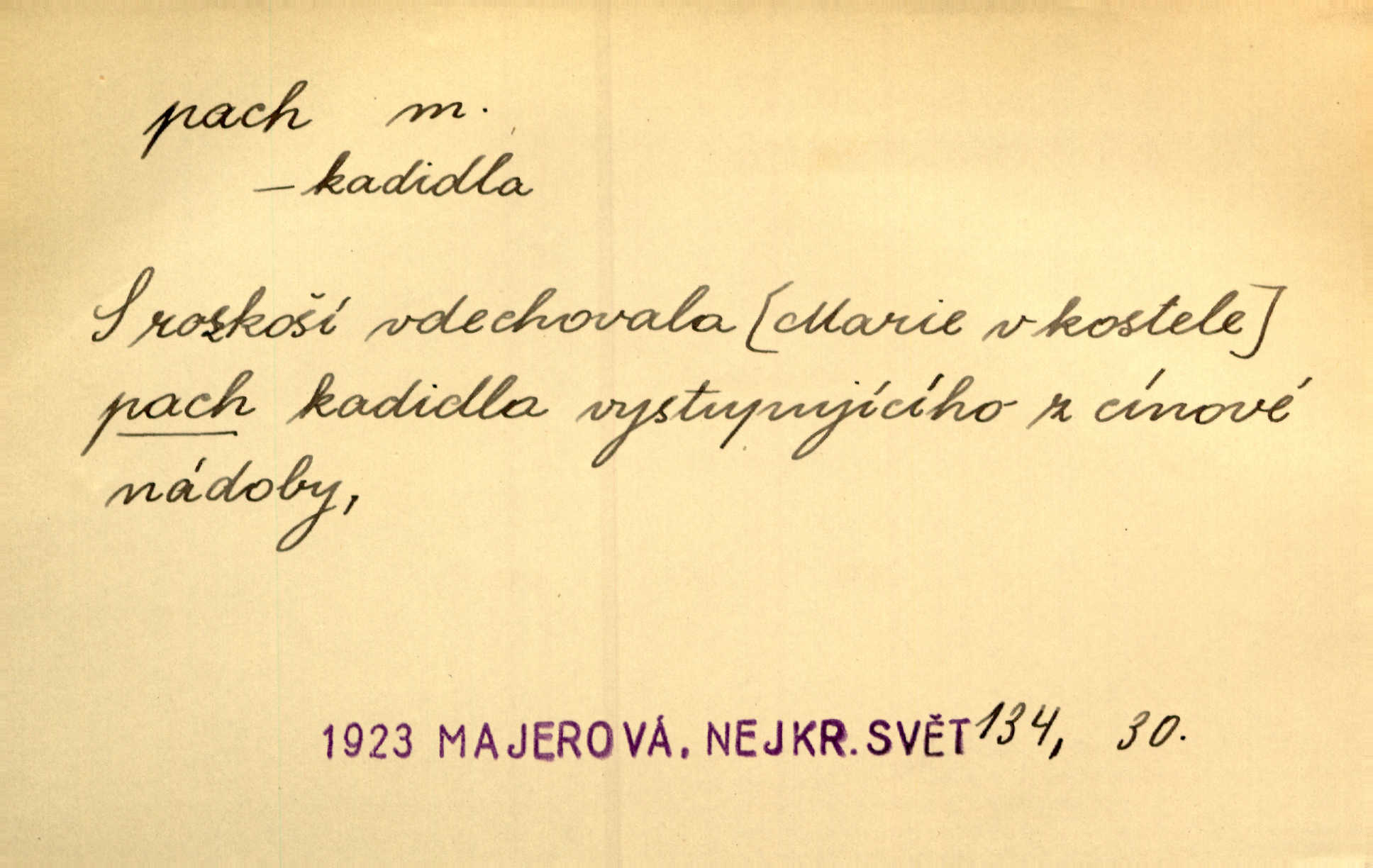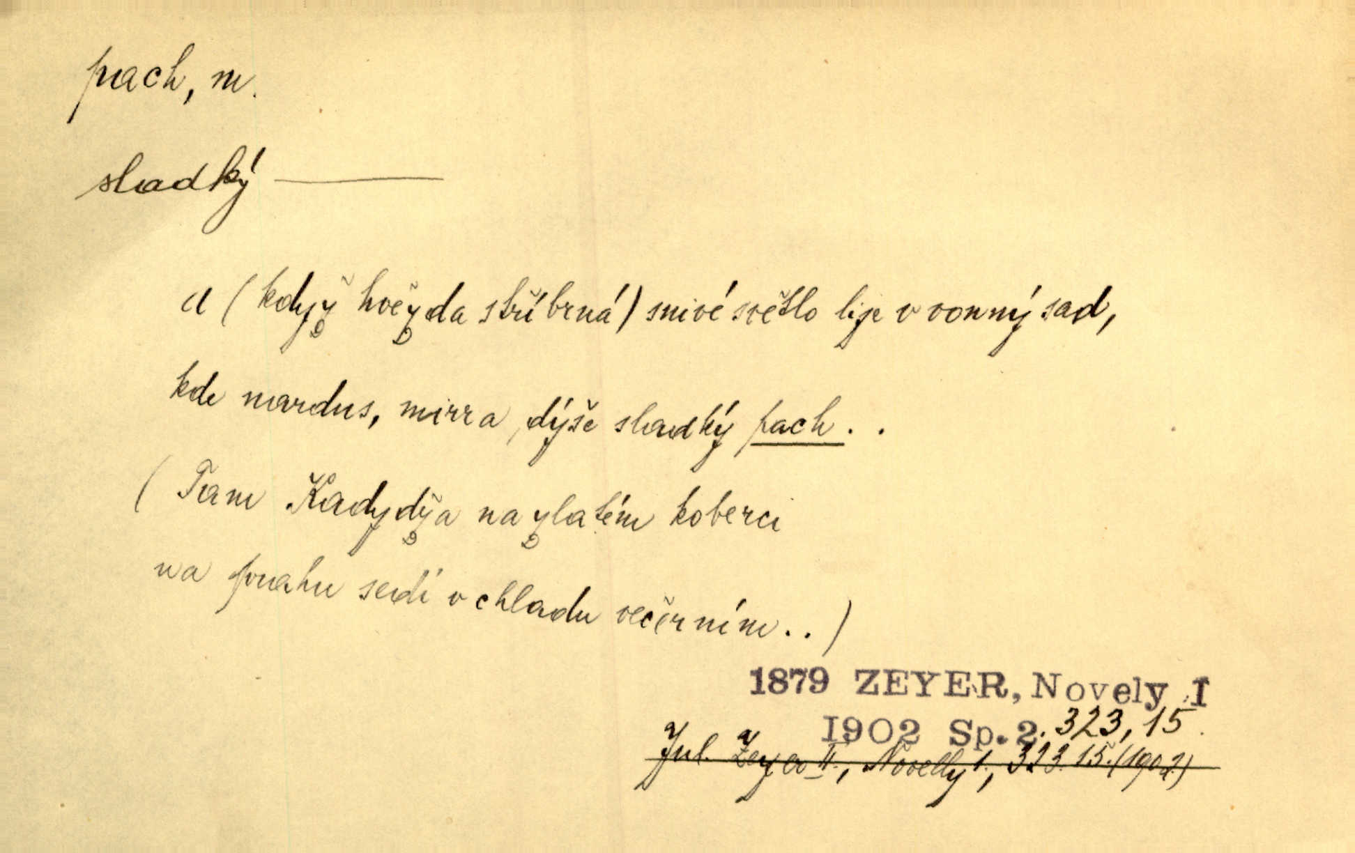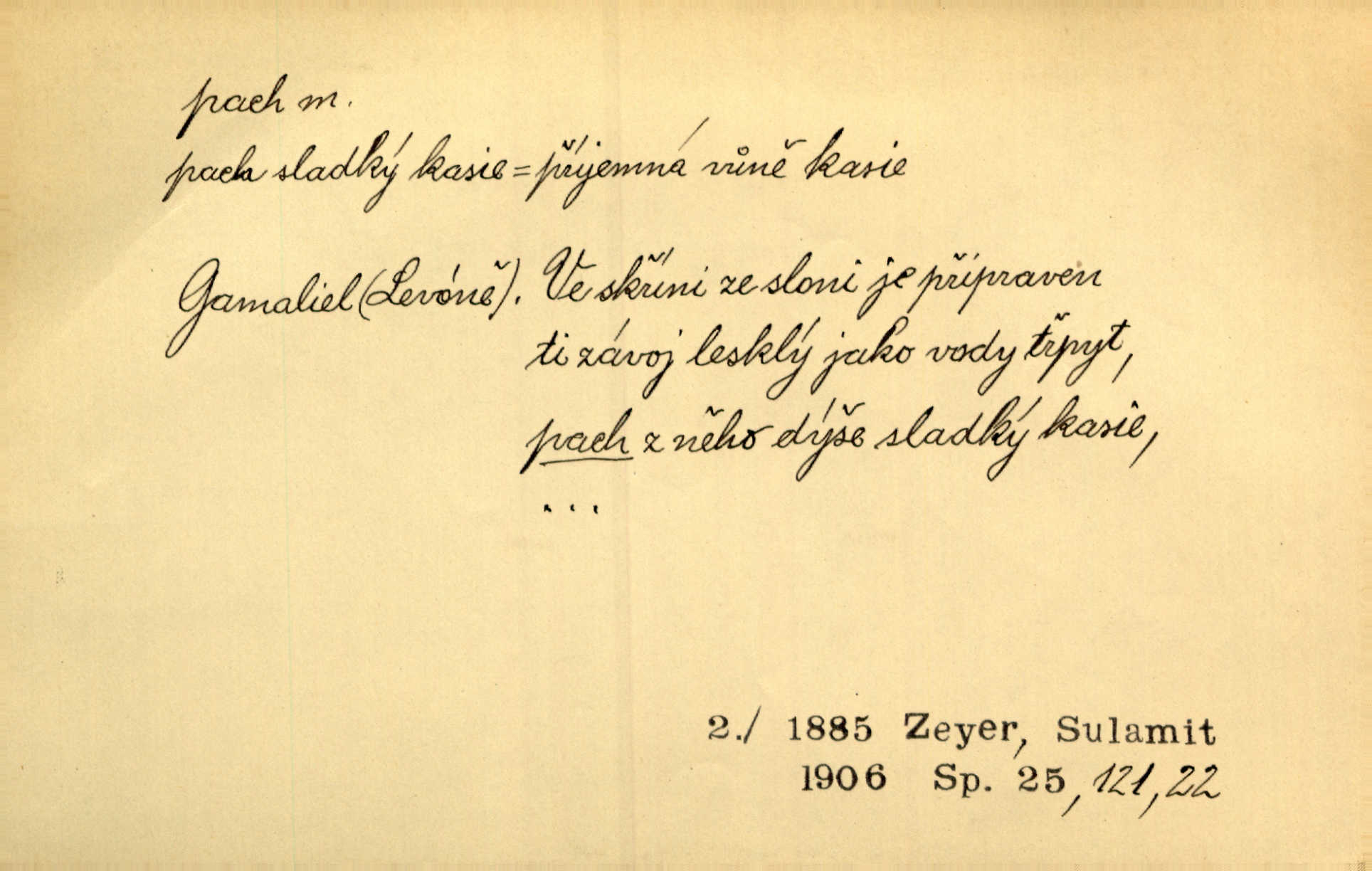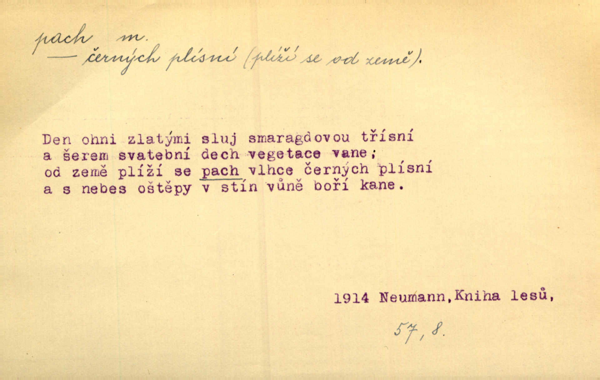 - pach, -u m. čichový vjem libý i nelibý, vůně n. zápach. Pach květů s chladem snoubil se. Zey. Vzduchem vznášel se omamný pach červnové noci. K. Červ. [Růže] voněly tou neurčitou vůní, jež se slévá z tisíců pachů. Theer. Z kuchyně už zaváněla káva a mdlý, sladký pach vanilky. Herrm. Otevřenými dveřmi [hospůdky] ho udeřil pivní a masný pach. Mart. Je [Růžena] suchá, jako vysmahlá žárem zevnitř, z podpaždí se jí dere prudký pach. Šrám. Bylo mu těžko v horkém pokoji, kde cítil pach obkladů, moče, čaje a vajec. K. Čap. Jsou záhadné pachy, záhadná záření očí, nepostižitelná fluida, která provázejí každého z nás. Kop.