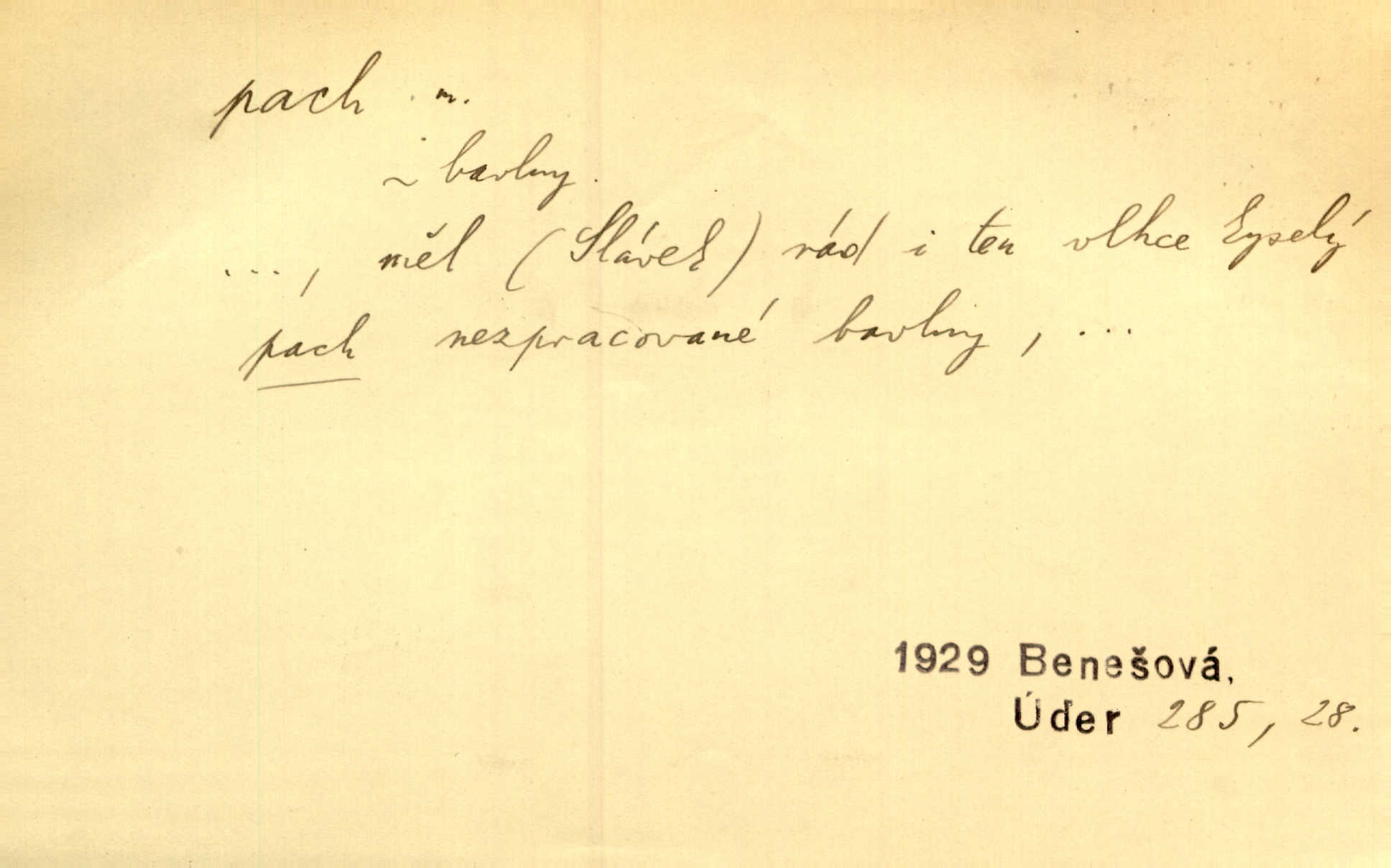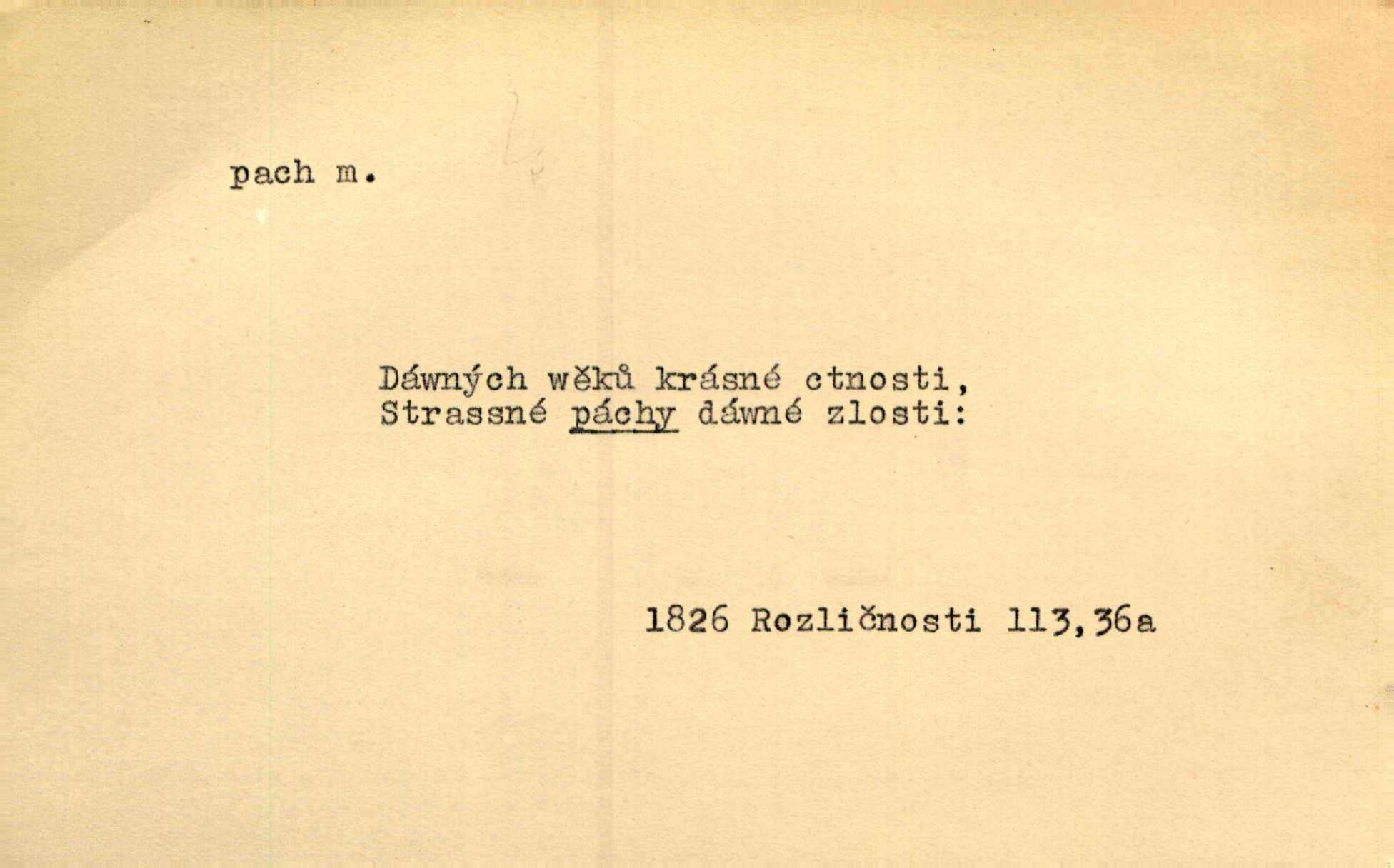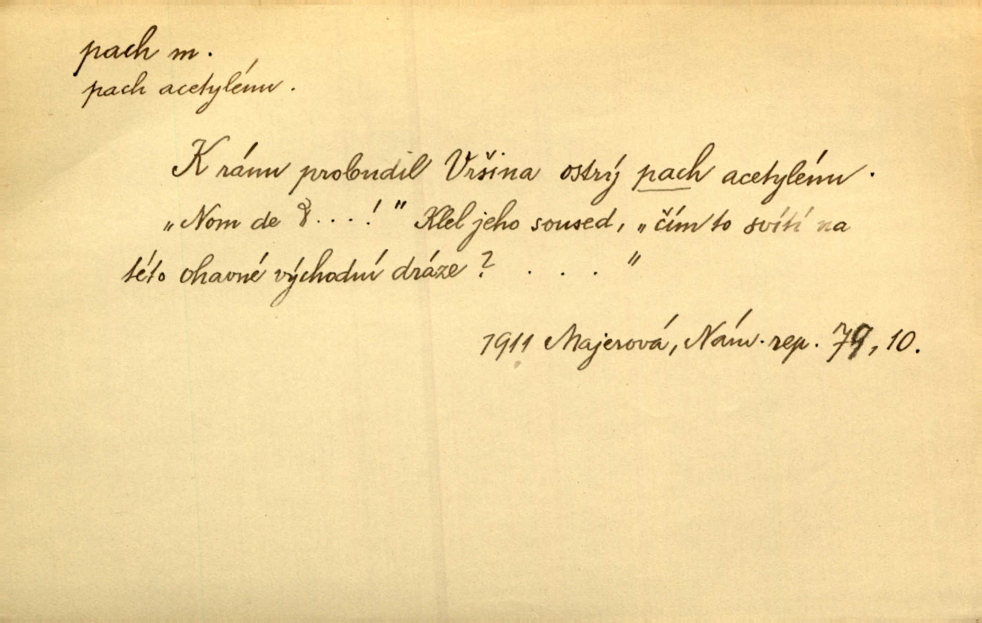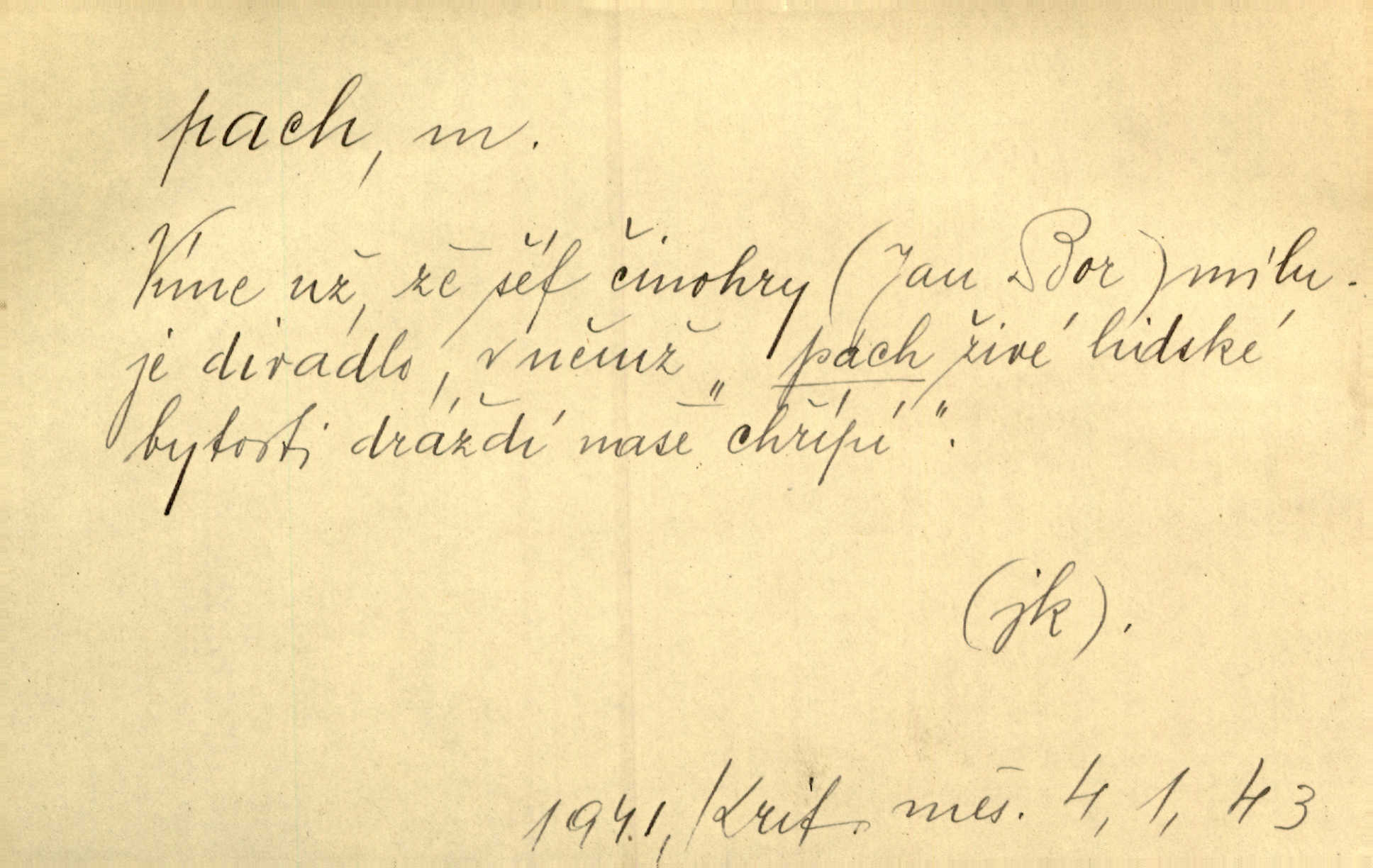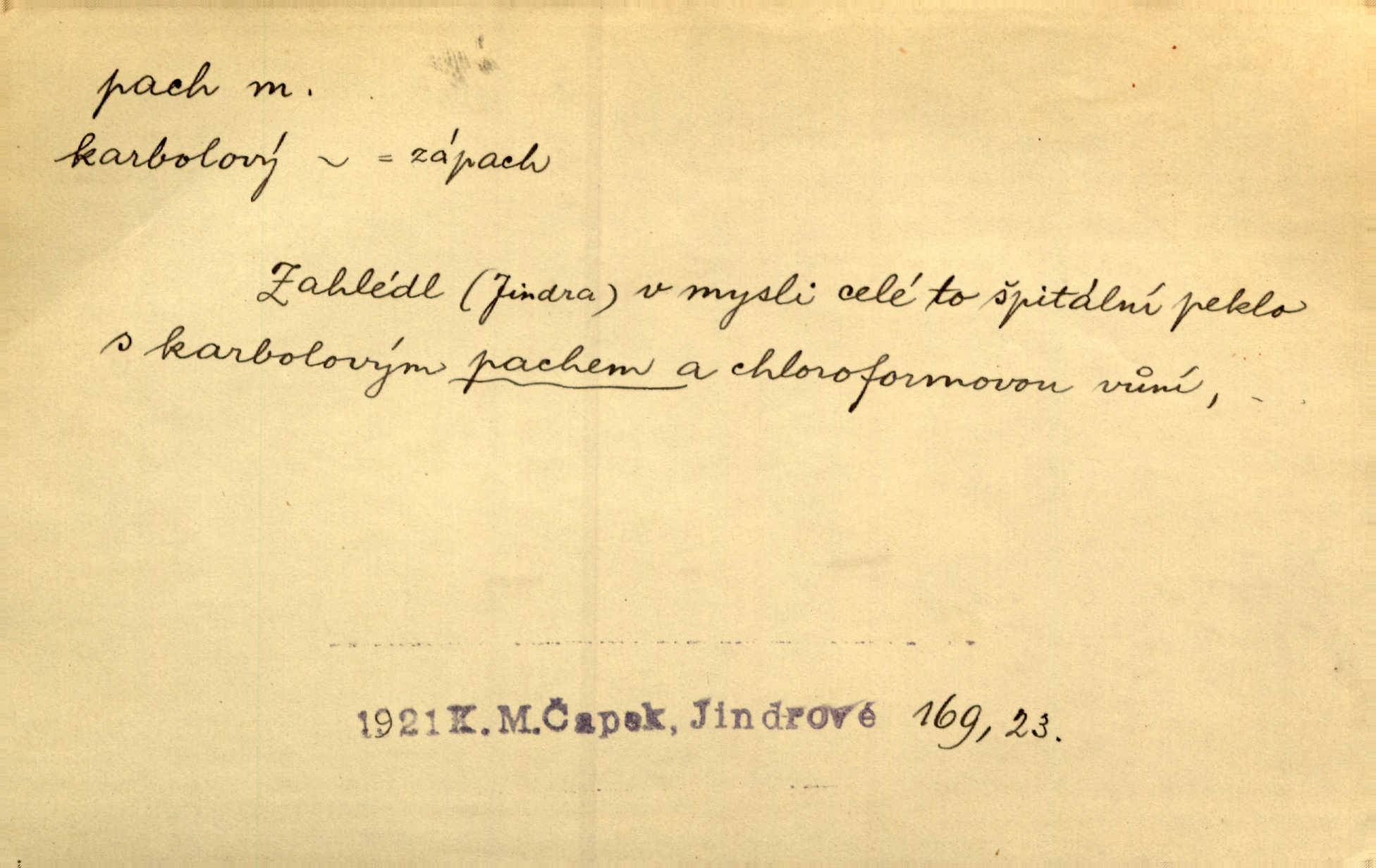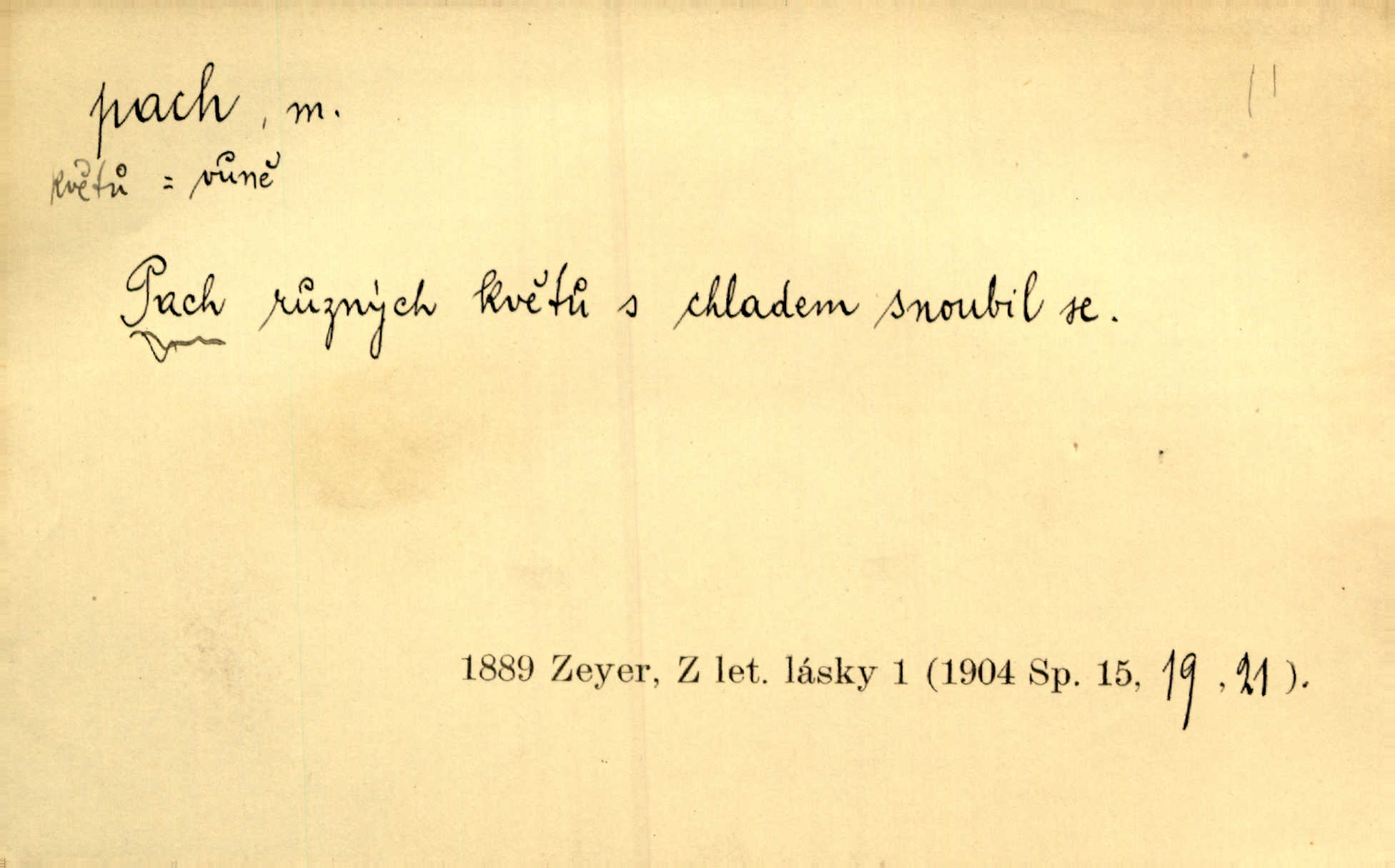 - pach, -u m. čichový vjem libý i nelibý, vůně n. zápach. Pach květů s chladem snoubil se. Zey. Vzduchem vznášel se omamný pach červnové noci. K. Červ. [Růže] voněly tou neurčitou vůní, jež se slévá z tisíců pachů. Theer. Z kuchyně už zaváněla káva a mdlý, sladký pach vanilky. Herrm. Otevřenými dveřmi [hospůdky] ho udeřil pivní a masný pach. Mart. Je [Růžena] suchá, jako vysmahlá žárem zevnitř, z podpaždí se jí dere prudký pach. Šrám. Bylo mu těžko v horkém pokoji, kde cítil pach obkladů, moče, čaje a vajec. K. Čap. Jsou záhadné pachy, záhadná záření očí, nepostižitelná fluida, která provázejí každého z nás. Kop.