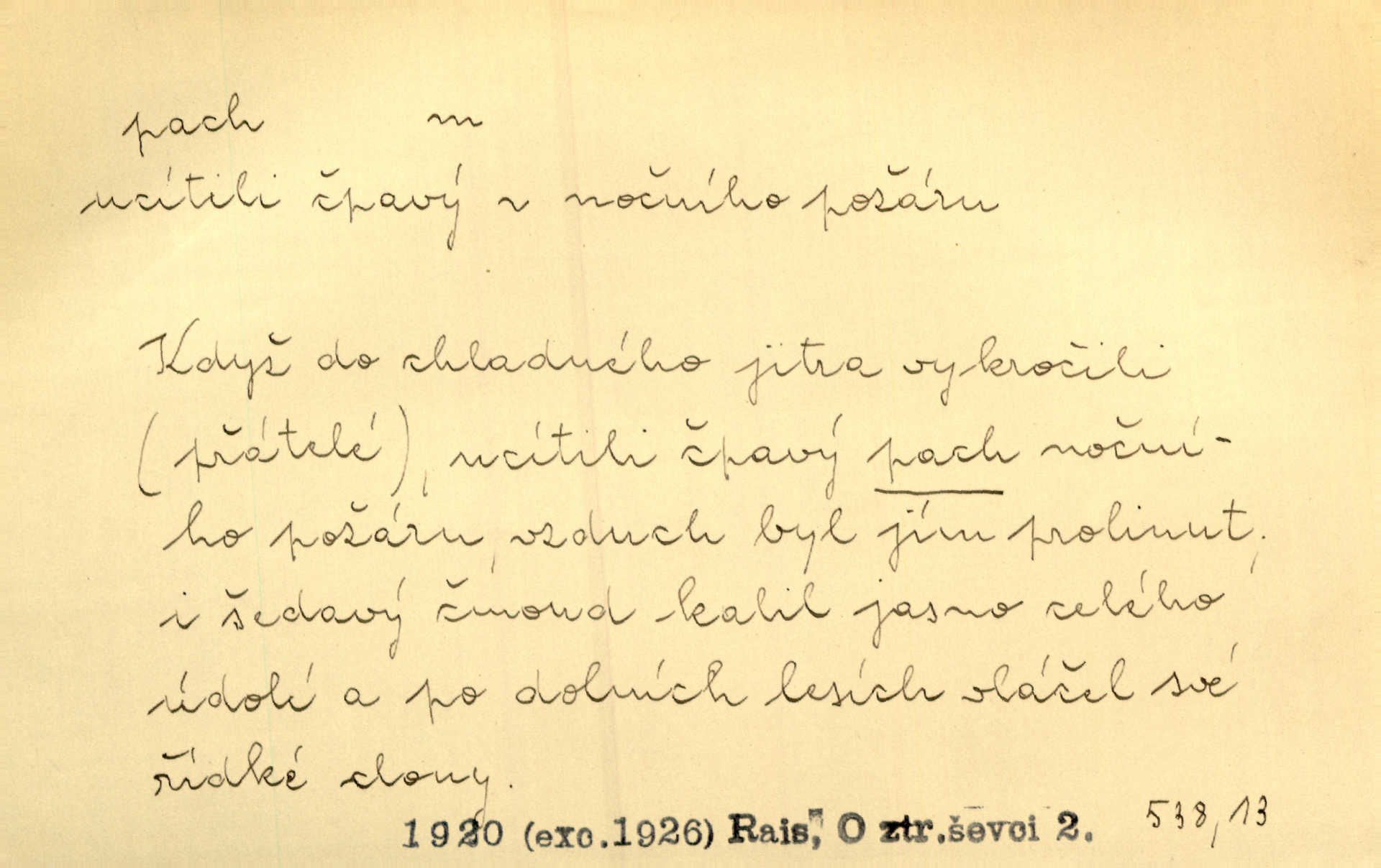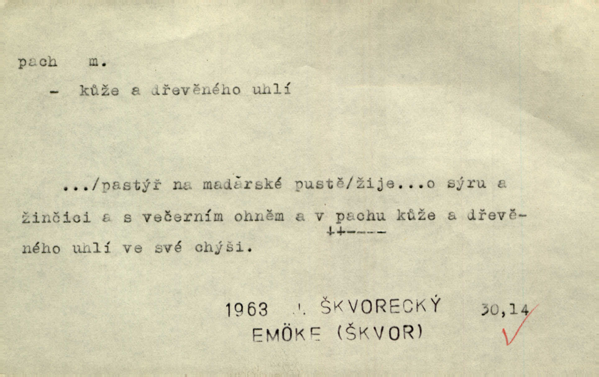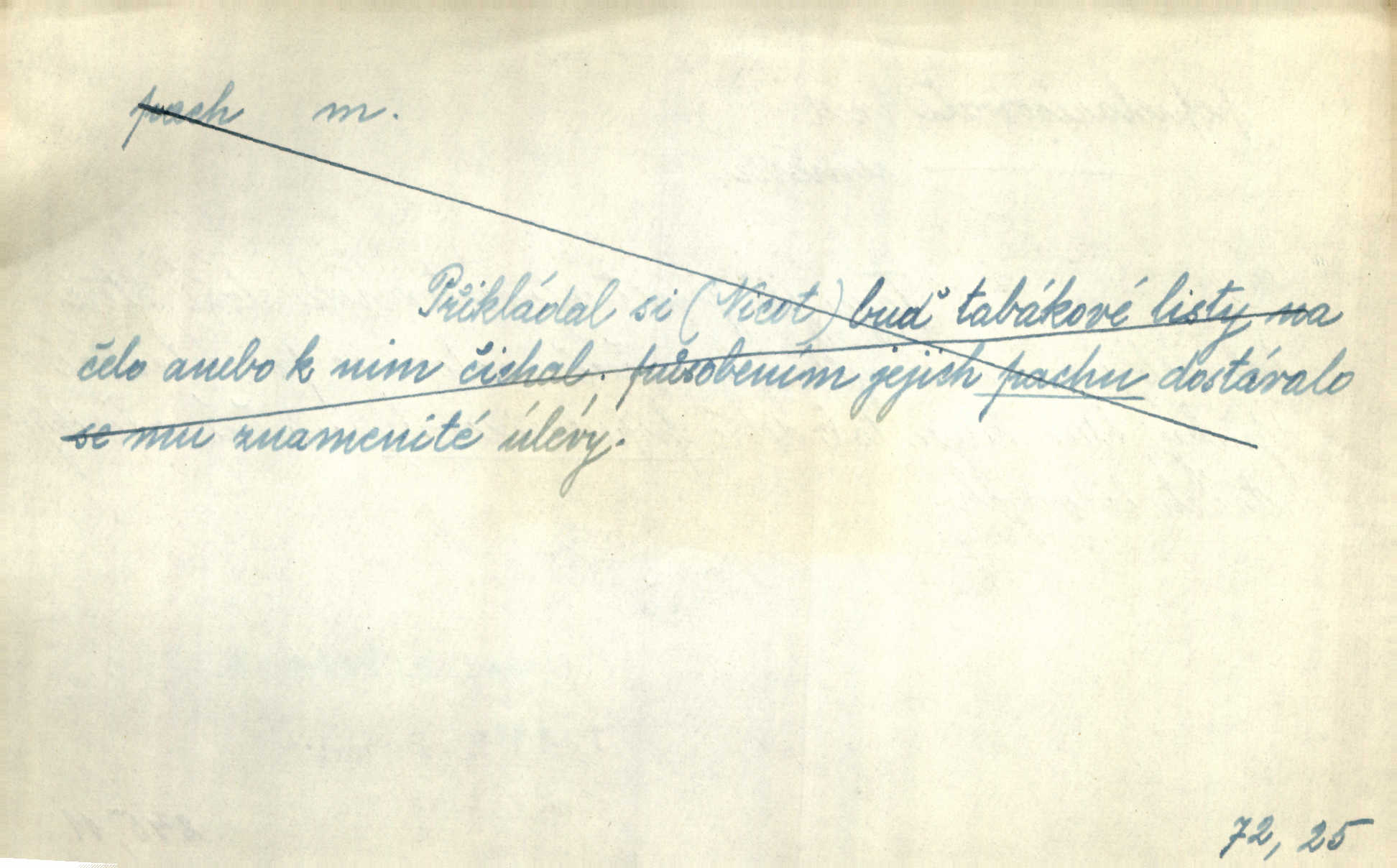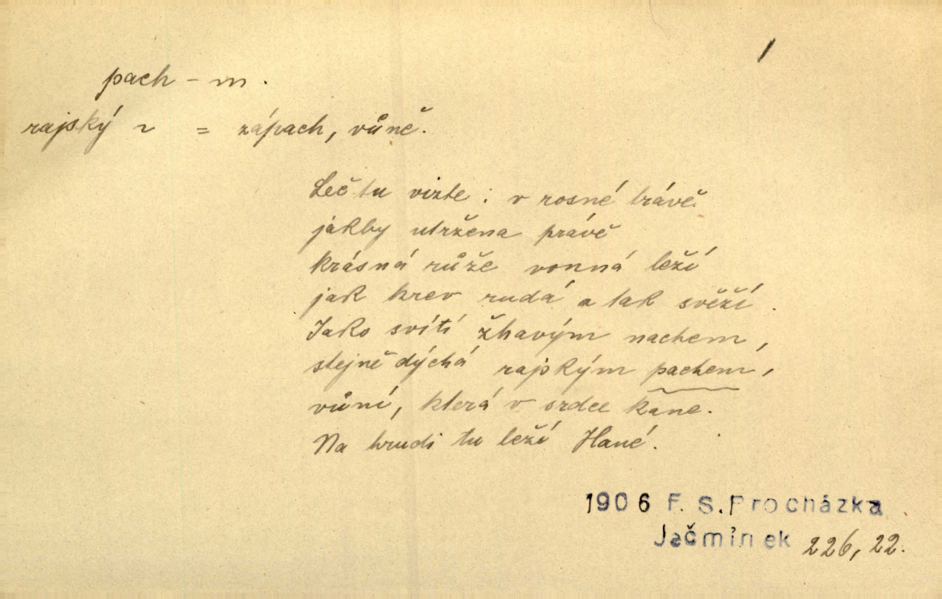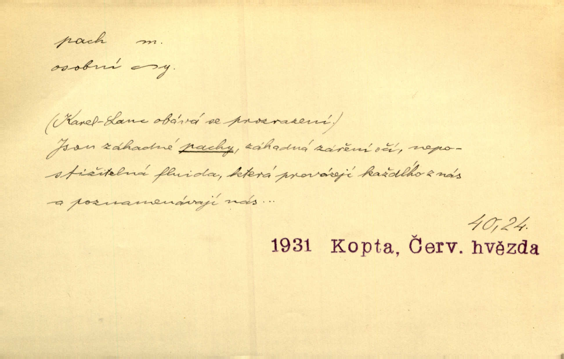- pach, -u m. čichový vjem libý i nelibý, vůně n. zápach. Pach květů s chladem snoubil se. Zey. Vzduchem vznášel se omamný pach červnové noci. K. Červ. [Růže] voněly tou neurčitou vůní, jež se slévá z tisíců pachů. Theer. Z kuchyně už zaváněla káva a mdlý, sladký pach vanilky. Herrm. Otevřenými dveřmi [hospůdky] ho udeřil pivní a masný pach. Mart. Je [Růžena] suchá, jako vysmahlá žárem zevnitř, z podpaždí se jí dere prudký pach. Šrám. Bylo mu těžko v horkém pokoji, kde cítil pach obkladů, moče, čaje a vajec. K. Čap. Jsou záhadné pachy, záhadná záření očí, nepostižitelná fluida, která provázejí každého z nás. Kop.