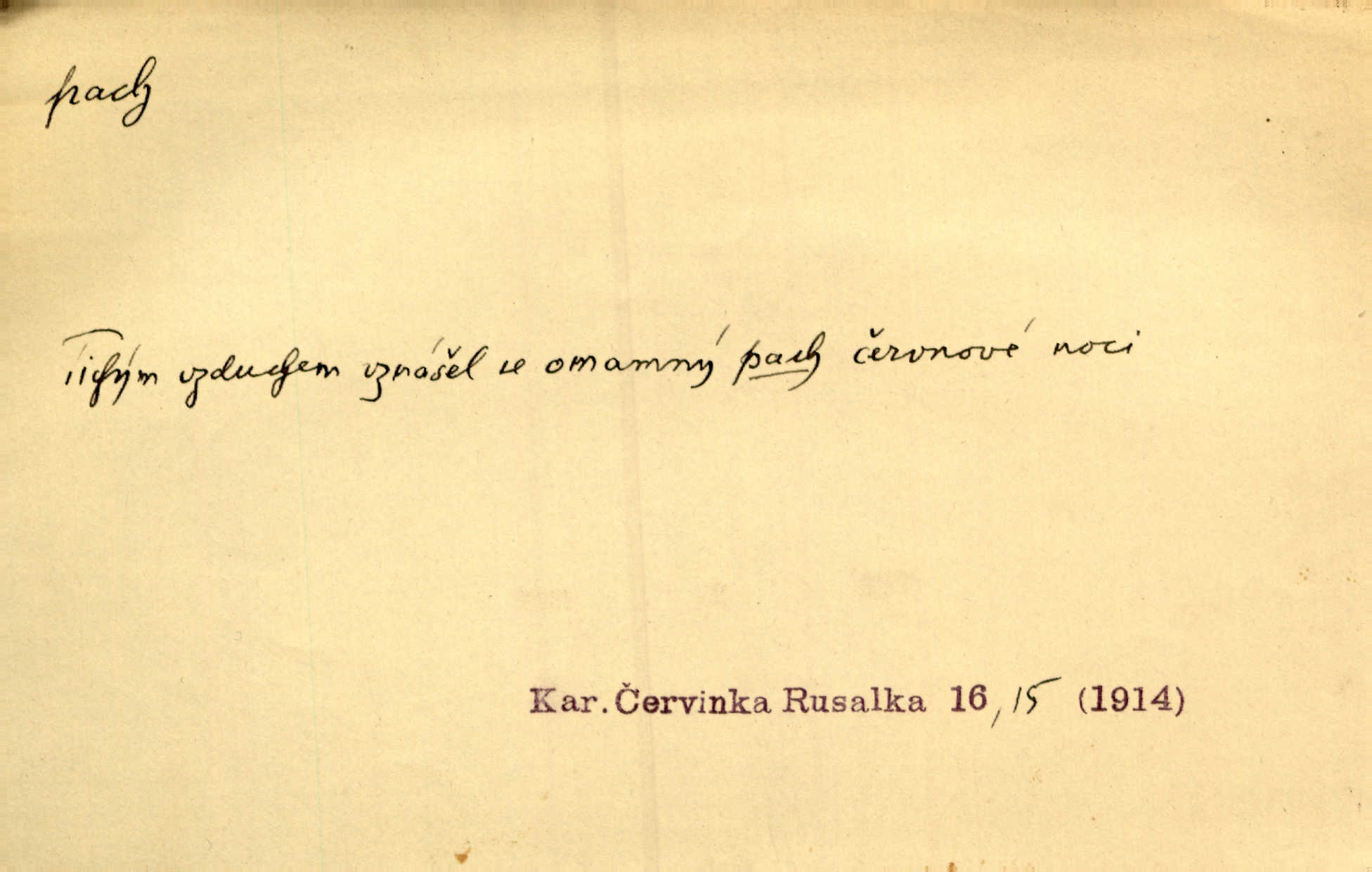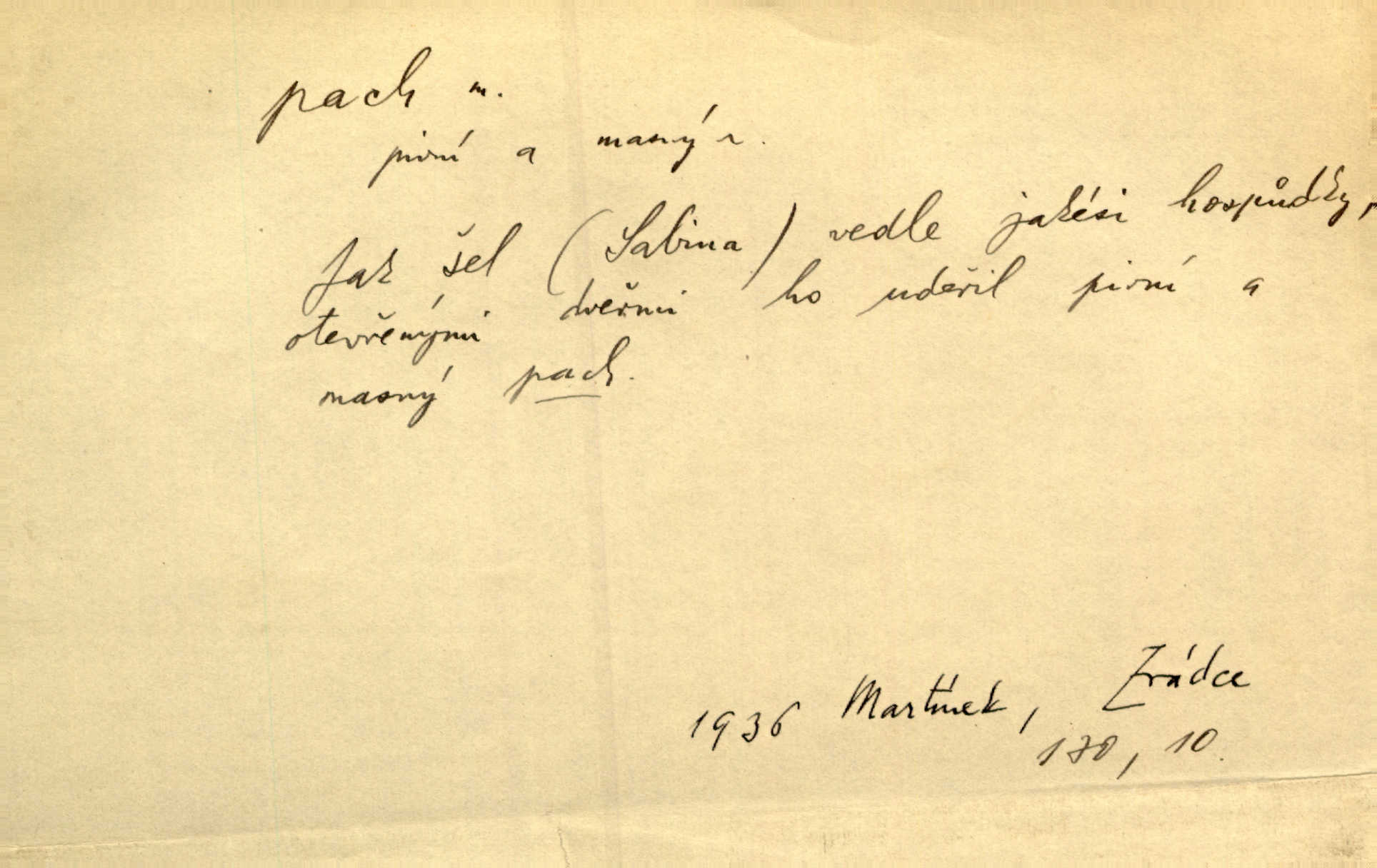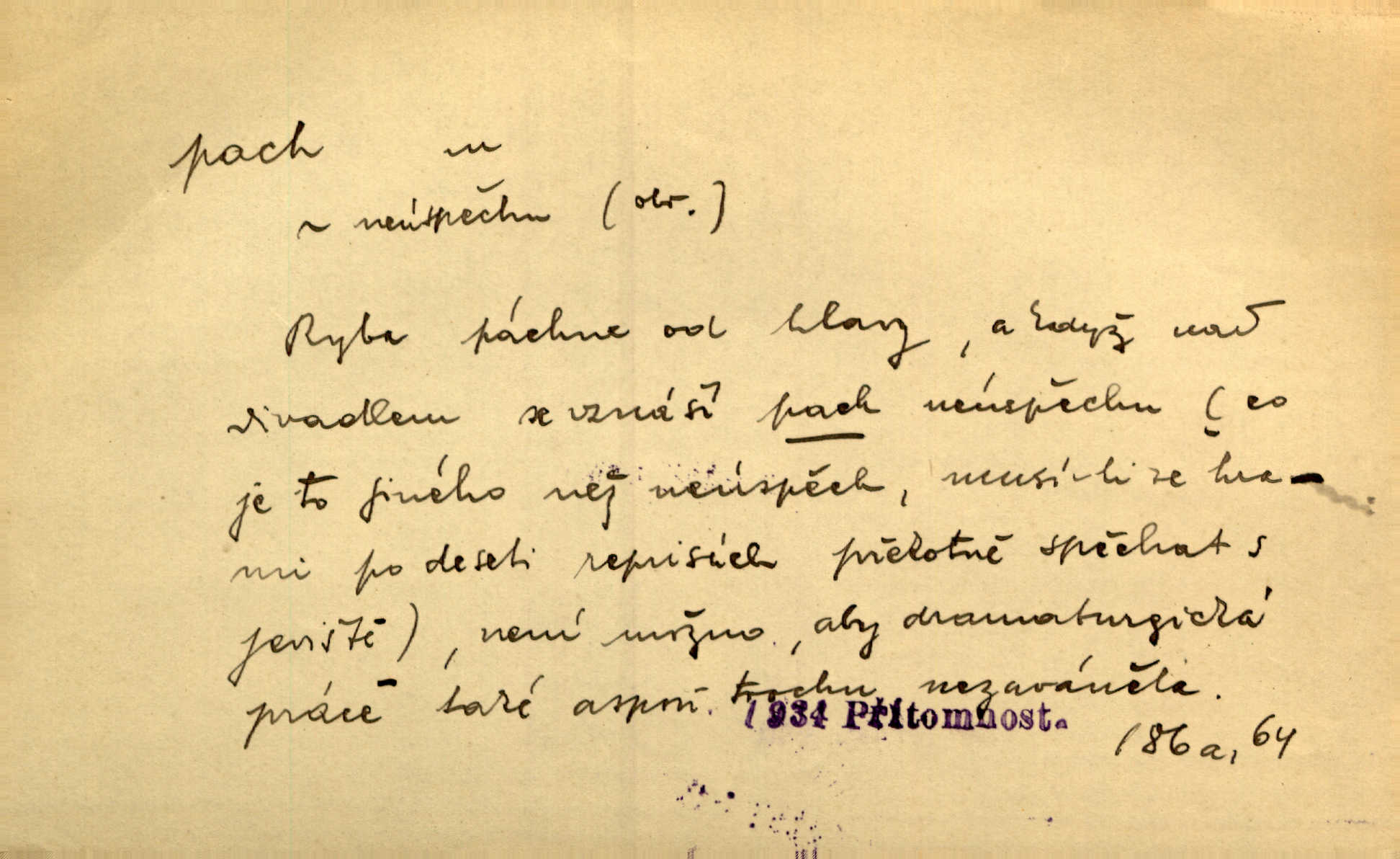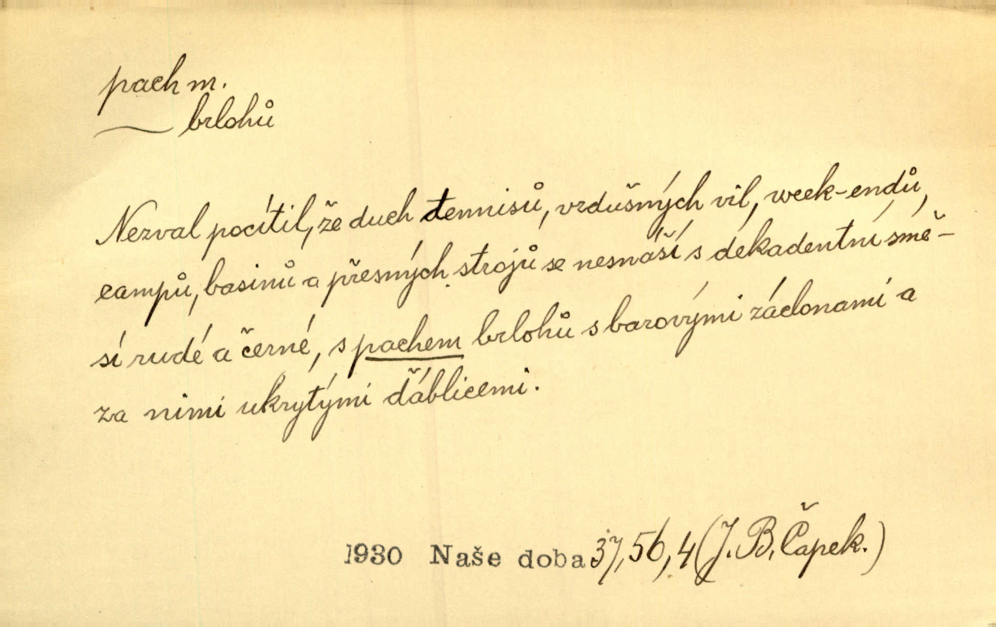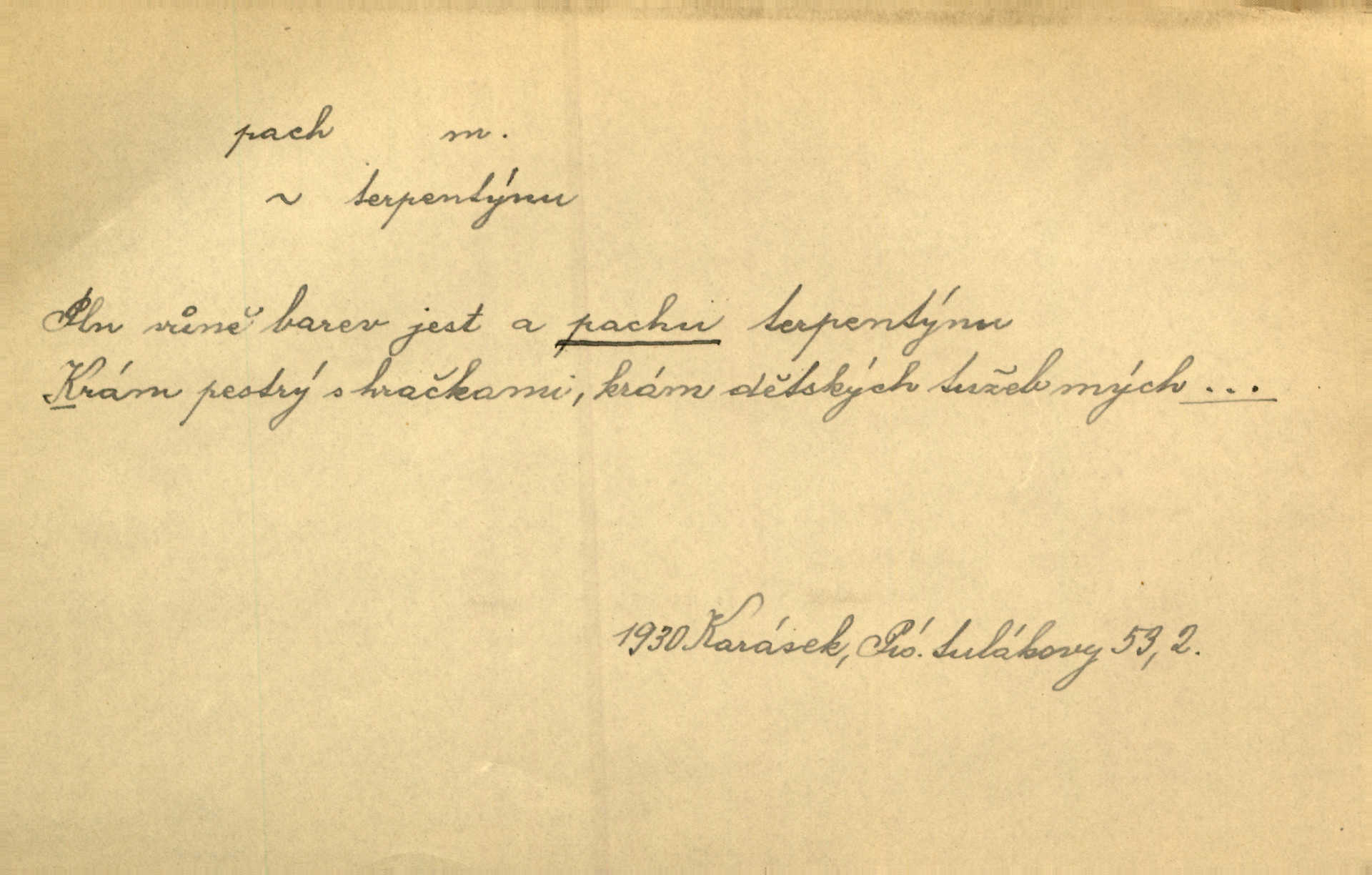 - pach, -u m. čichový vjem libý i nelibý, vůně n. zápach. Pach květů s chladem snoubil se. Zey. Vzduchem vznášel se omamný pach červnové noci. K. Červ. [Růže] voněly tou neurčitou vůní, jež se slévá z tisíců pachů. Theer. Z kuchyně už zaváněla káva a mdlý, sladký pach vanilky. Herrm. Otevřenými dveřmi [hospůdky] ho udeřil pivní a masný pach. Mart. Je [Růžena] suchá, jako vysmahlá žárem zevnitř, z podpaždí se jí dere prudký pach. Šrám. Bylo mu těžko v horkém pokoji, kde cítil pach obkladů, moče, čaje a vajec. K. Čap. Jsou záhadné pachy, záhadná záření očí, nepostižitelná fluida, která provázejí každého z nás. Kop.