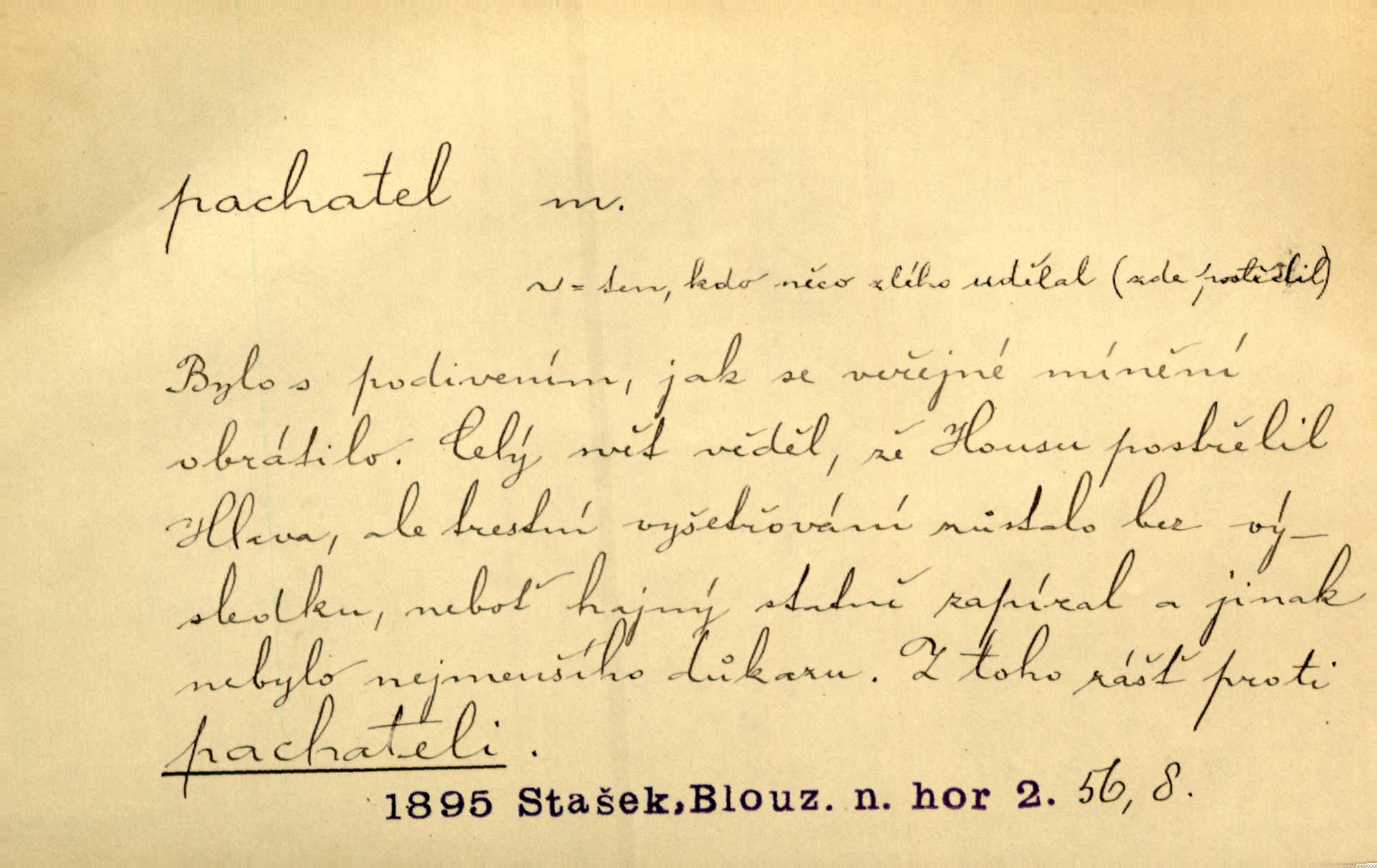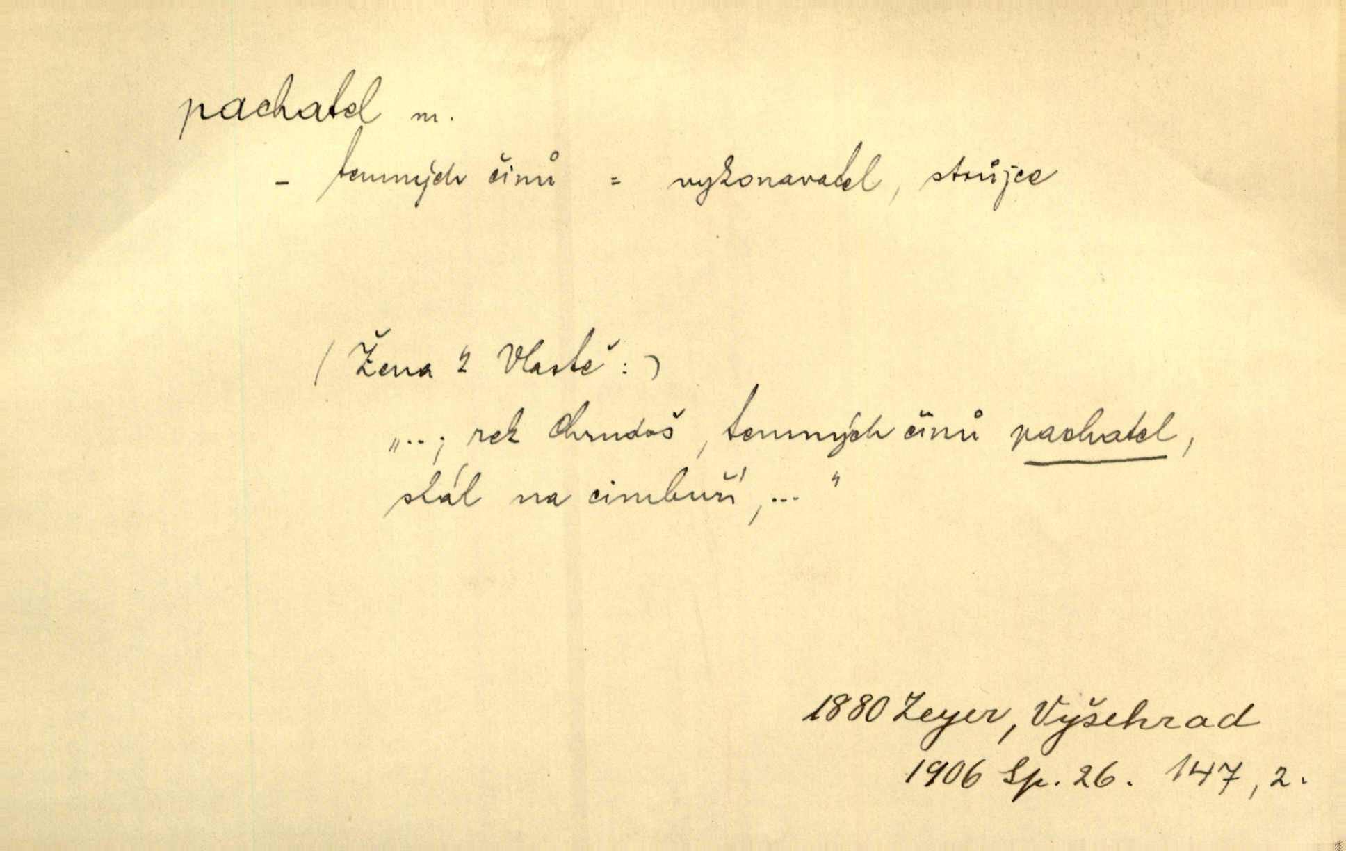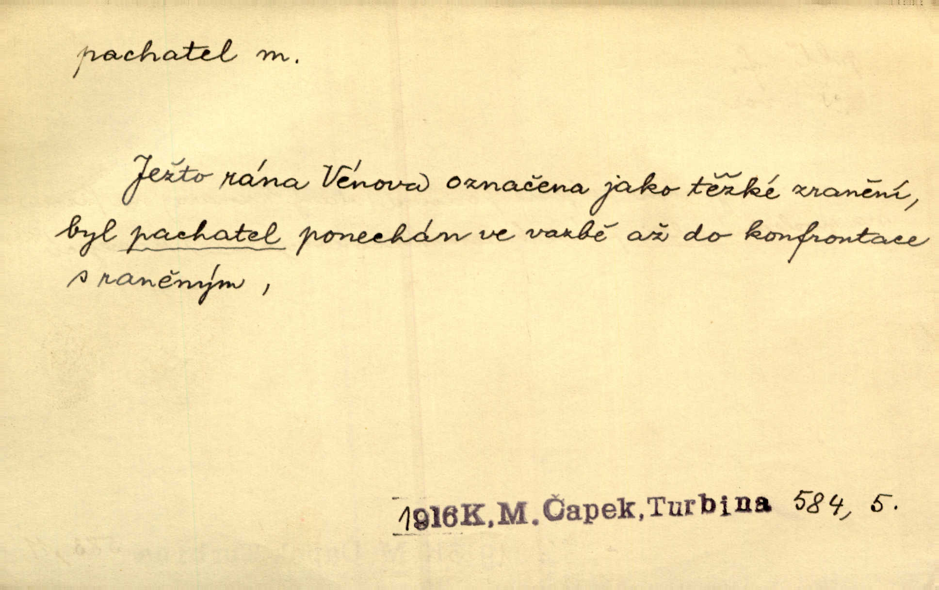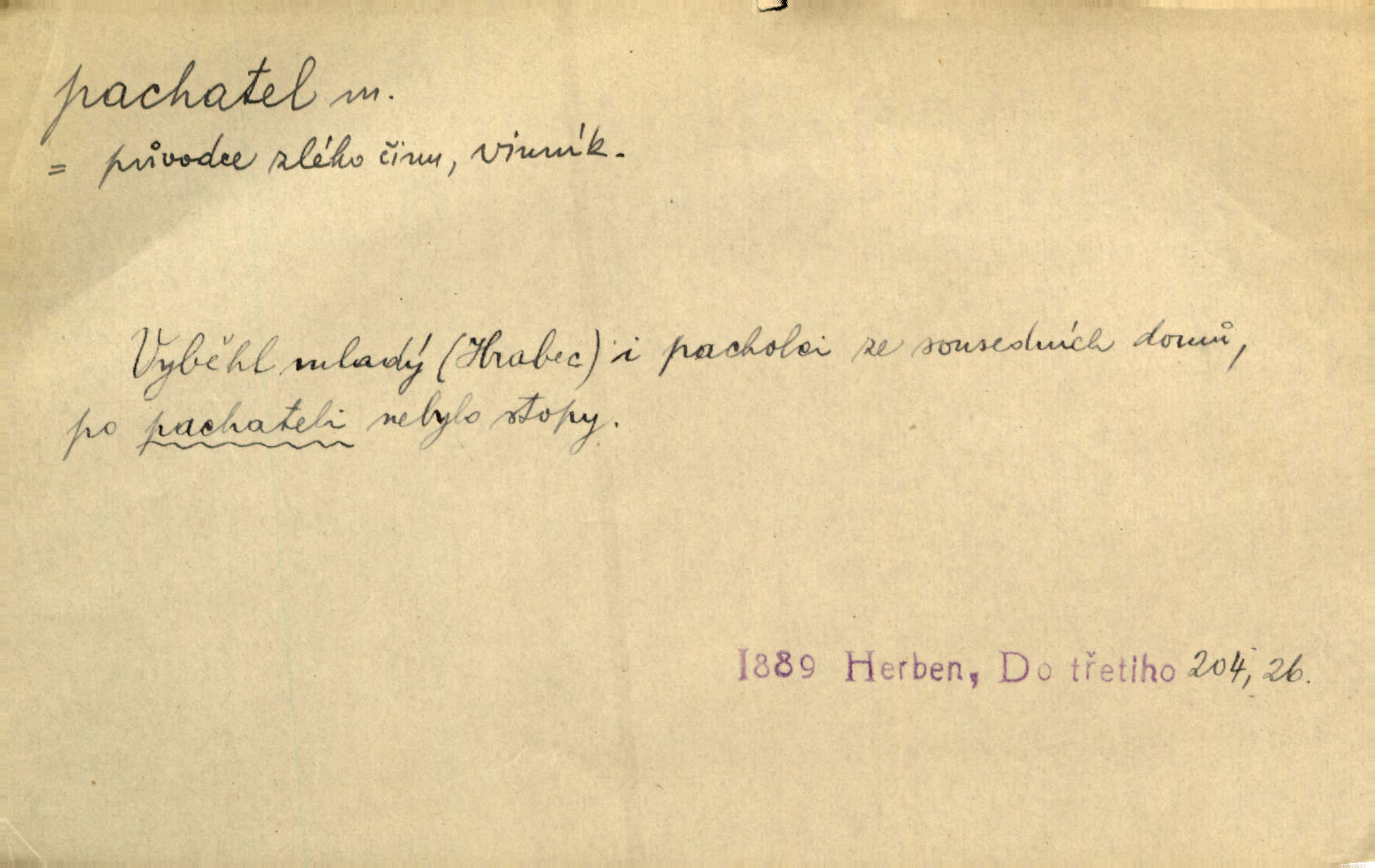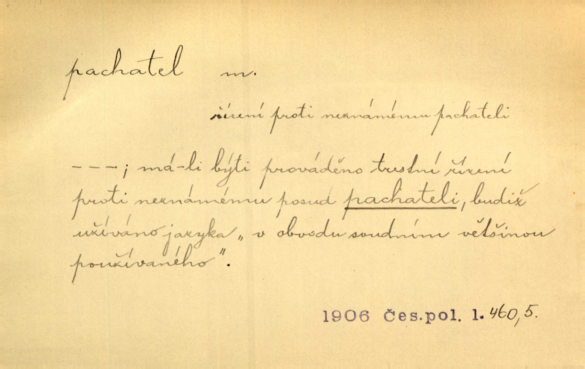- pachatel, -e m. člověk, který něco spáchal, dopustil se zlého, nepěkného činu. Ježto rána Vénova označena jako těžké zranění, byl pachatel ponechán ve vazbě až do konfrontace s raněným. Čap. Ch. Vlastní podstata zločinu je prozatím nejasná a pachatel je také neznámý. Šrám. Ihned vysláni četníci, aby pachatele stíhali. Jir. Nejdůležitějším důkazem totožnosti obžalovaného s pachatelem vraždy bylo žalobě místní ohledání. Čap. Ch. Žert. Pan kanovník brání jesuity jen co pachatel veršů, které dle jeho náhledu nedošly dostatečného uznání. Ner. Práv. pachatel trestního činu osoba, která se něčeho dopustila.