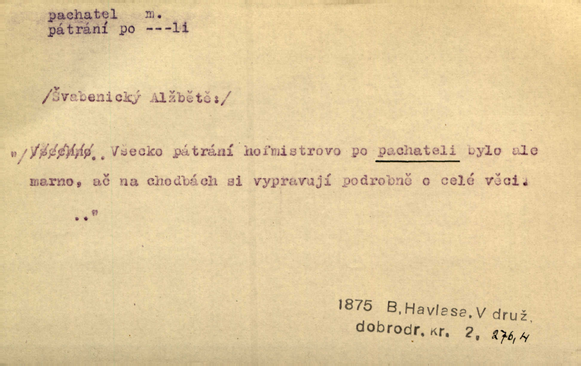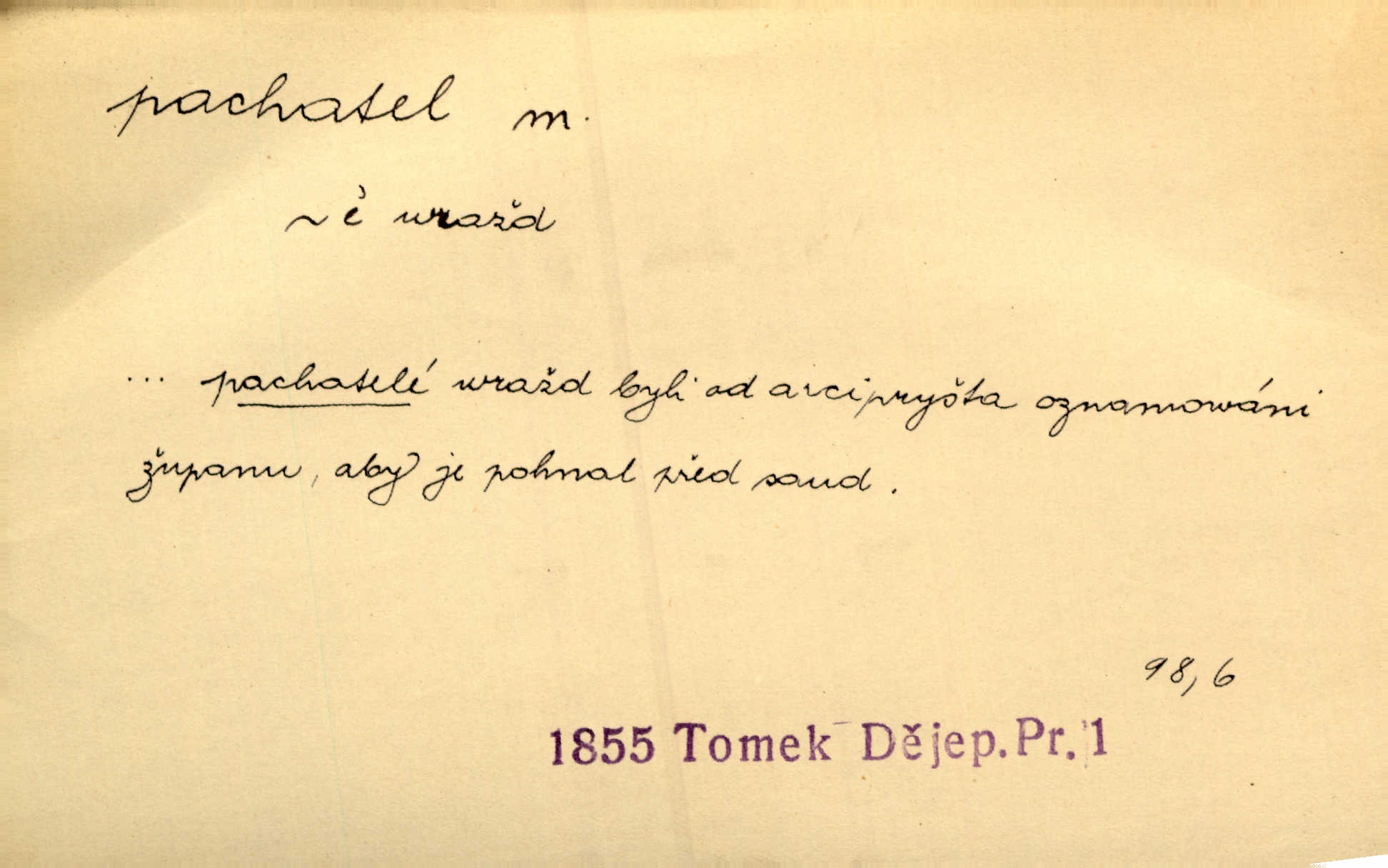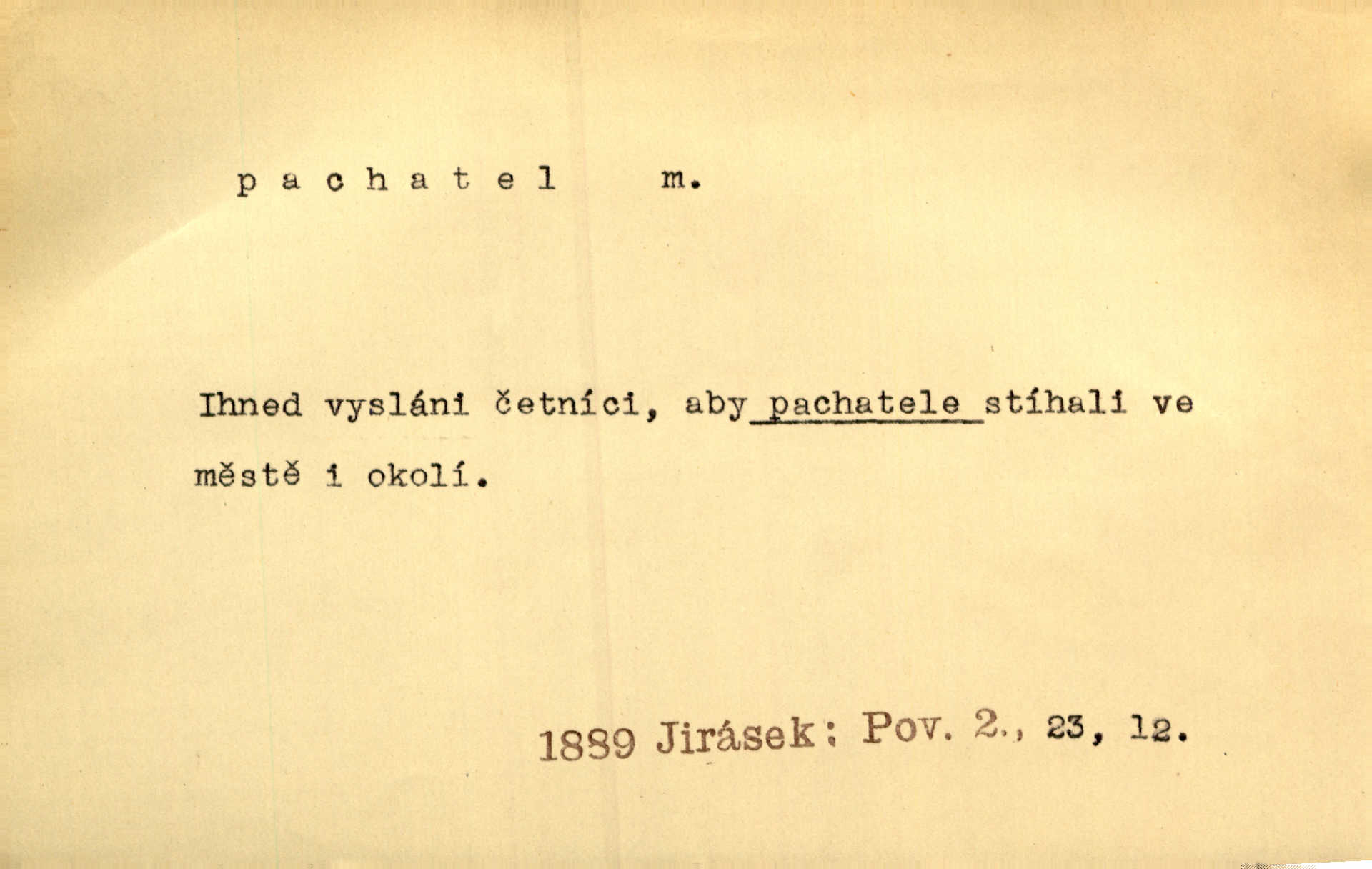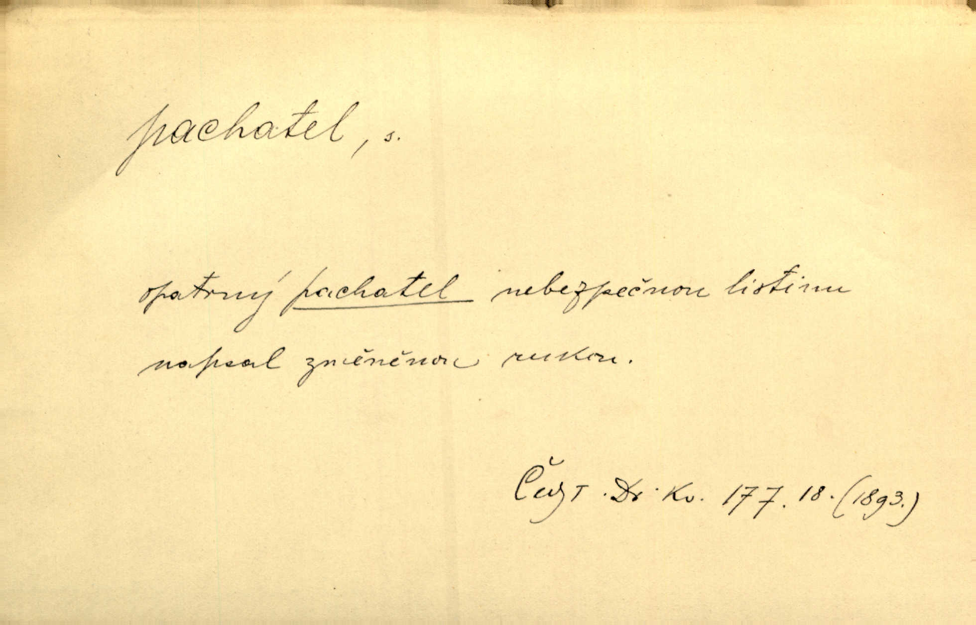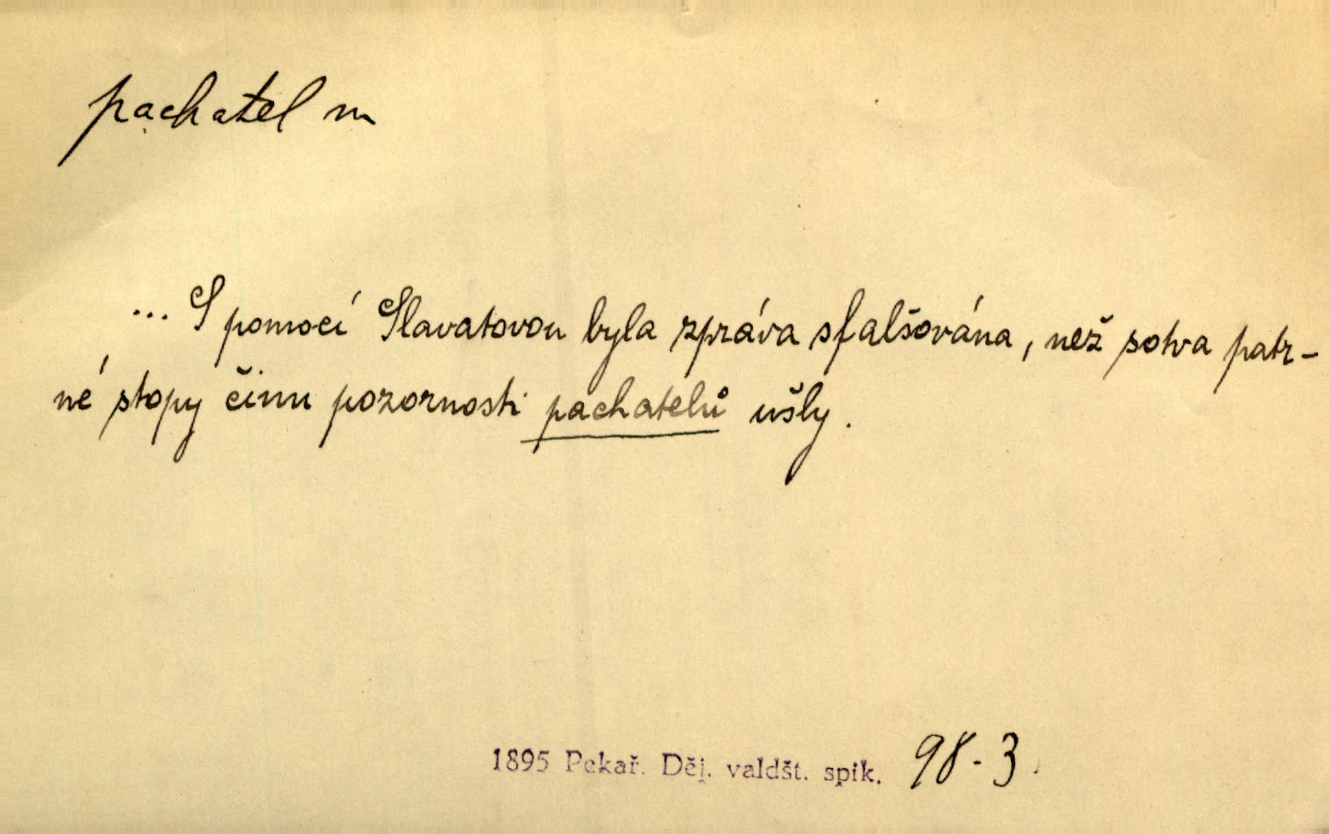 - pachatel, -e m. člověk, který něco spáchal, dopustil se zlého, nepěkného činu. Ježto rána Vénova označena jako těžké zranění, byl pachatel ponechán ve vazbě až do konfrontace s raněným. Čap. Ch. Vlastní podstata zločinu je prozatím nejasná a pachatel je také neznámý. Šrám. Ihned vysláni četníci, aby pachatele stíhali. Jir. Nejdůležitějším důkazem totožnosti obžalovaného s pachatelem vraždy bylo žalobě místní ohledání. Čap. Ch. Žert. Pan kanovník brání jesuity jen co pachatel veršů, které dle jeho náhledu nedošly dostatečného uznání. Ner. Práv. pachatel trestního činu osoba, která se něčeho dopustila.