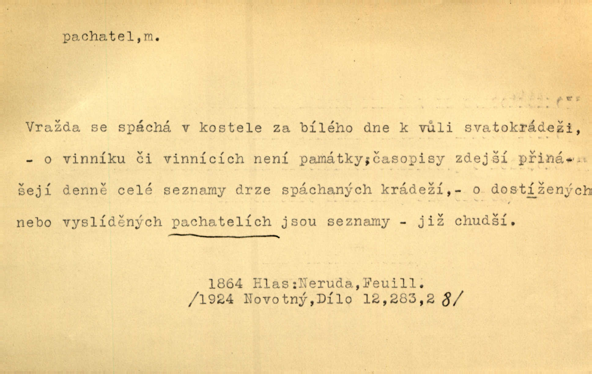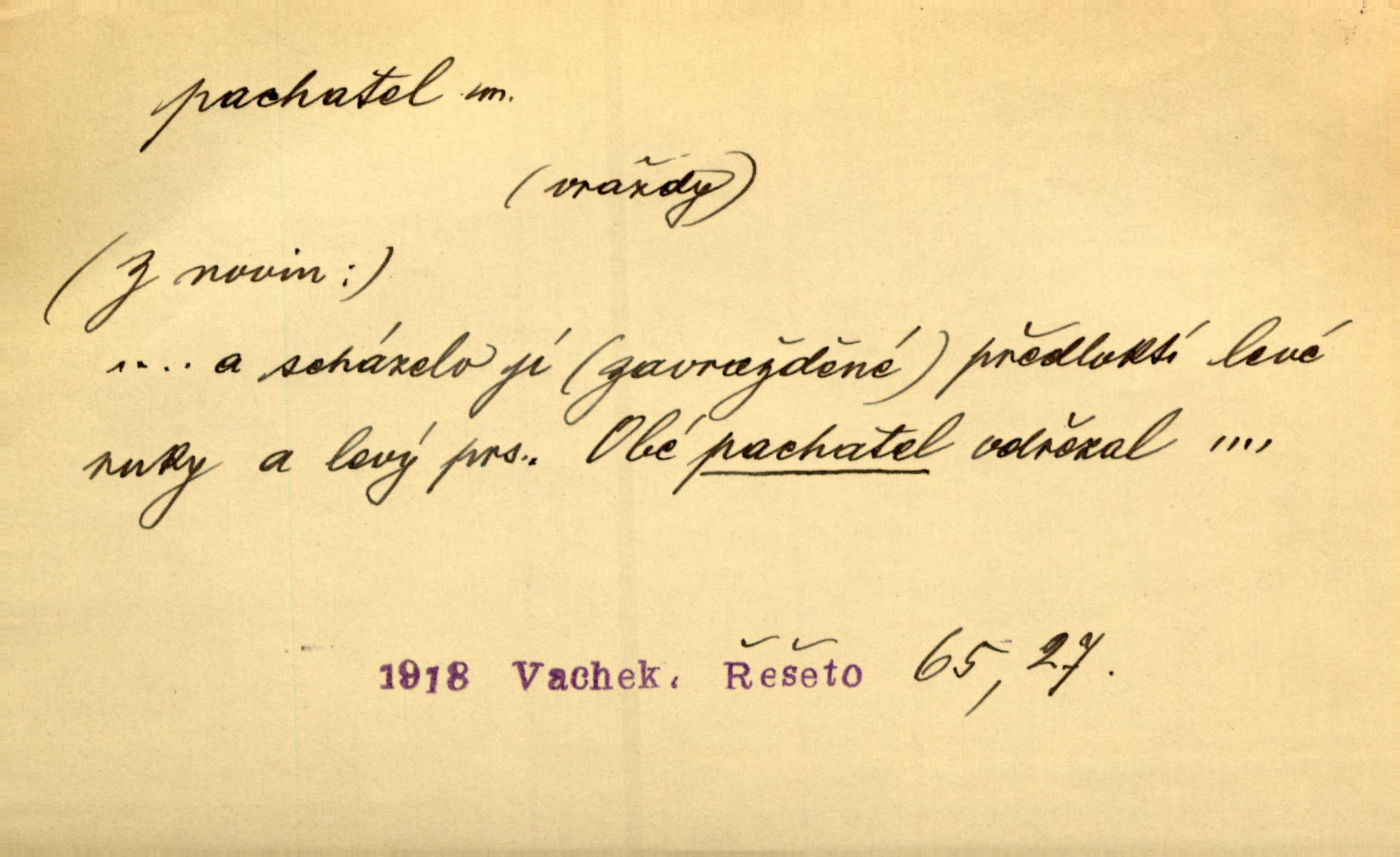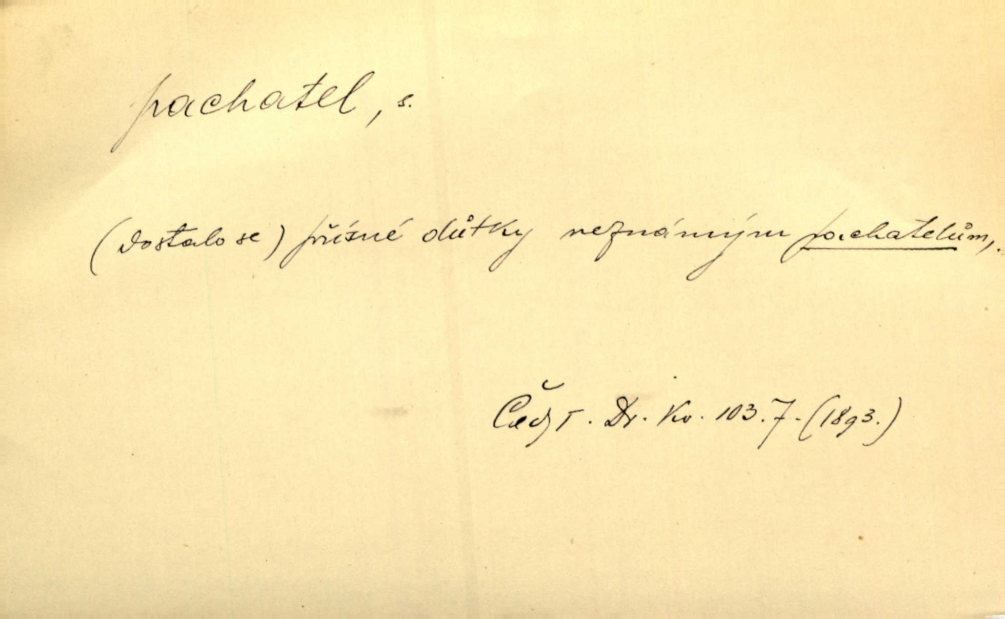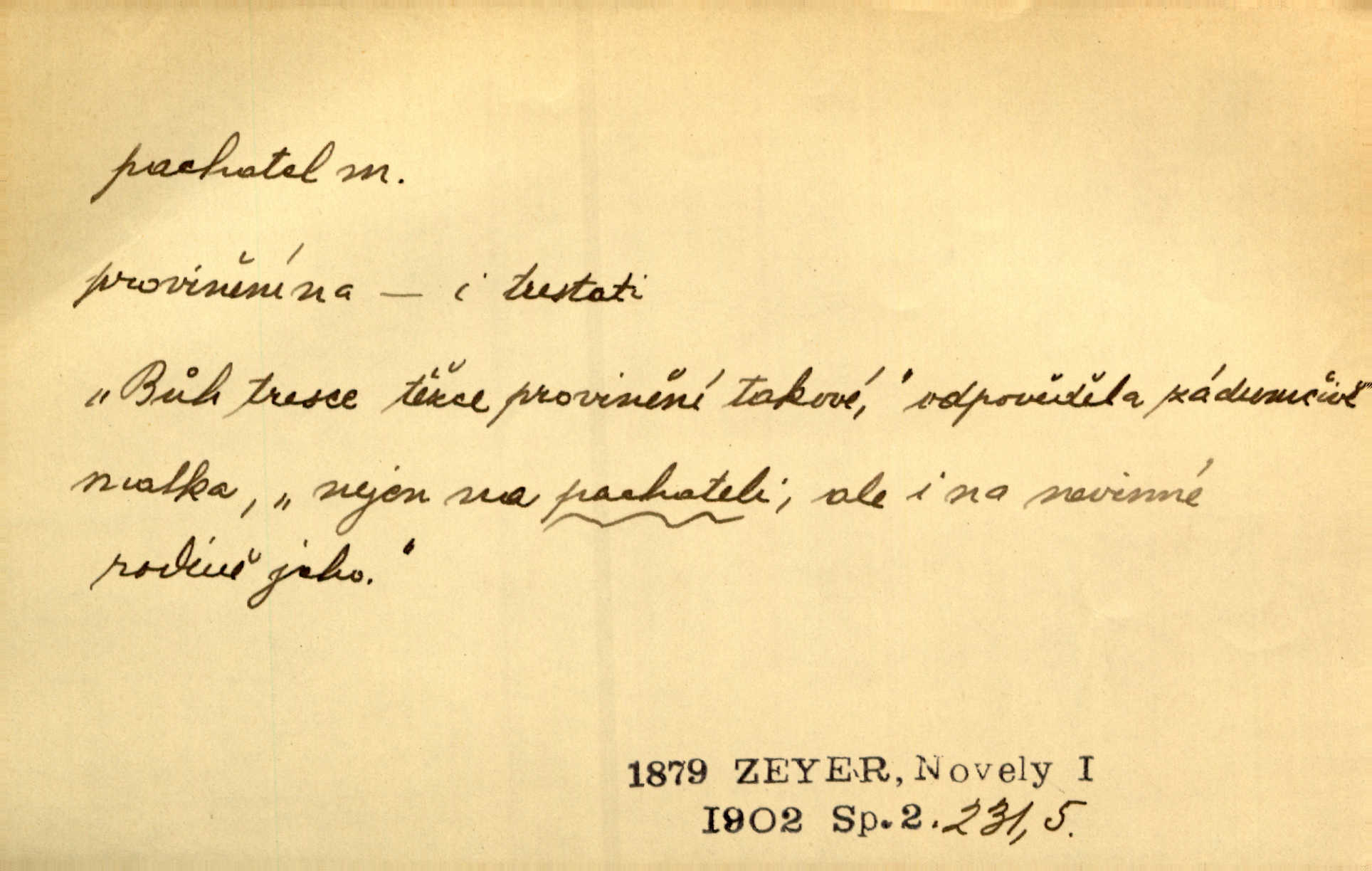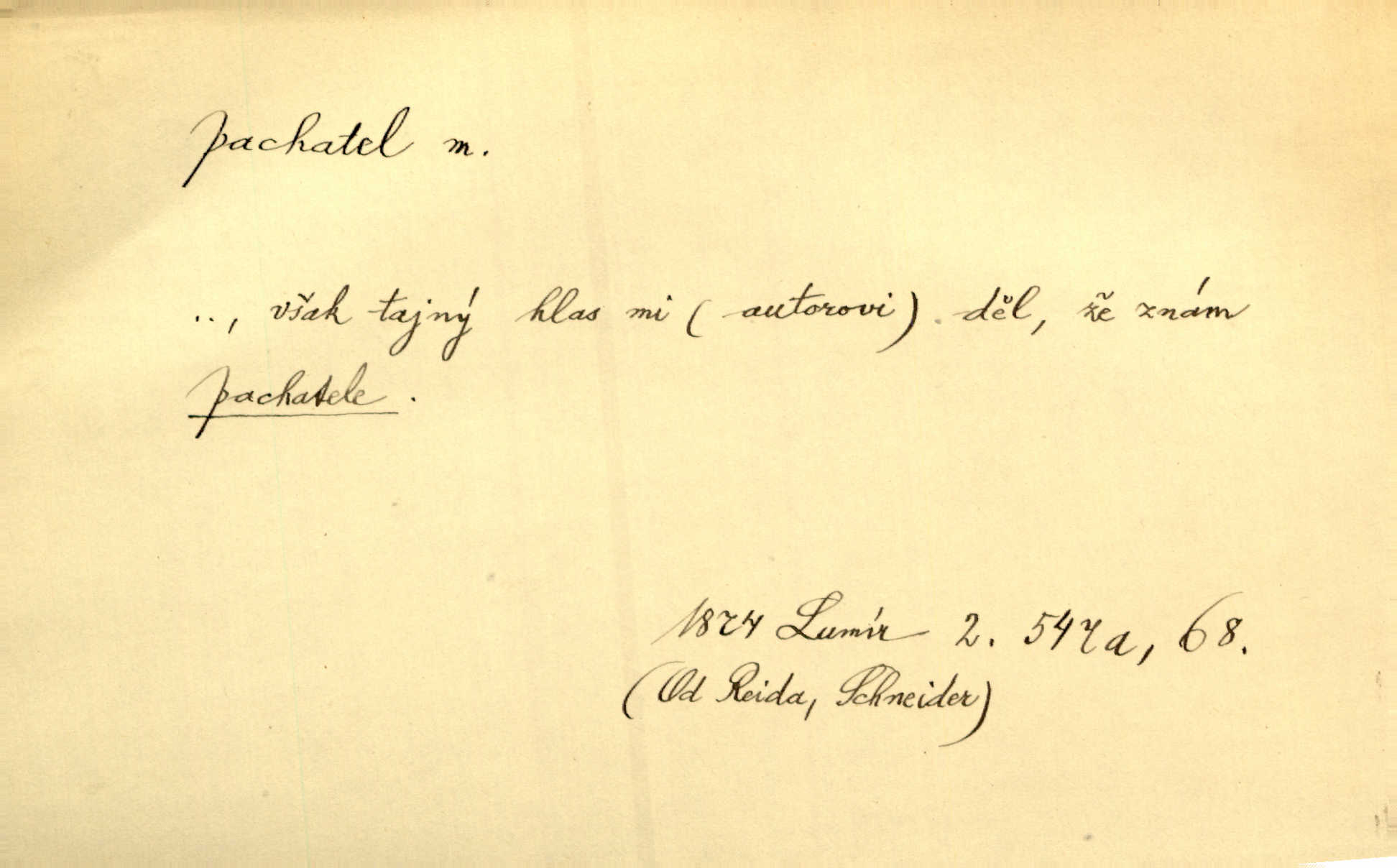 - pachatel, -e m. člověk, který něco spáchal, dopustil se zlého, nepěkného činu. Ježto rána Vénova označena jako těžké zranění, byl pachatel ponechán ve vazbě až do konfrontace s raněným. Čap. Ch. Vlastní podstata zločinu je prozatím nejasná a pachatel je také neznámý. Šrám. Ihned vysláni četníci, aby pachatele stíhali. Jir. Nejdůležitějším důkazem totožnosti obžalovaného s pachatelem vraždy bylo žalobě místní ohledání. Čap. Ch. Žert. Pan kanovník brání jesuity jen co pachatel veršů, které dle jeho náhledu nedošly dostatečného uznání. Ner. Práv. pachatel trestního činu osoba, která se něčeho dopustila.
