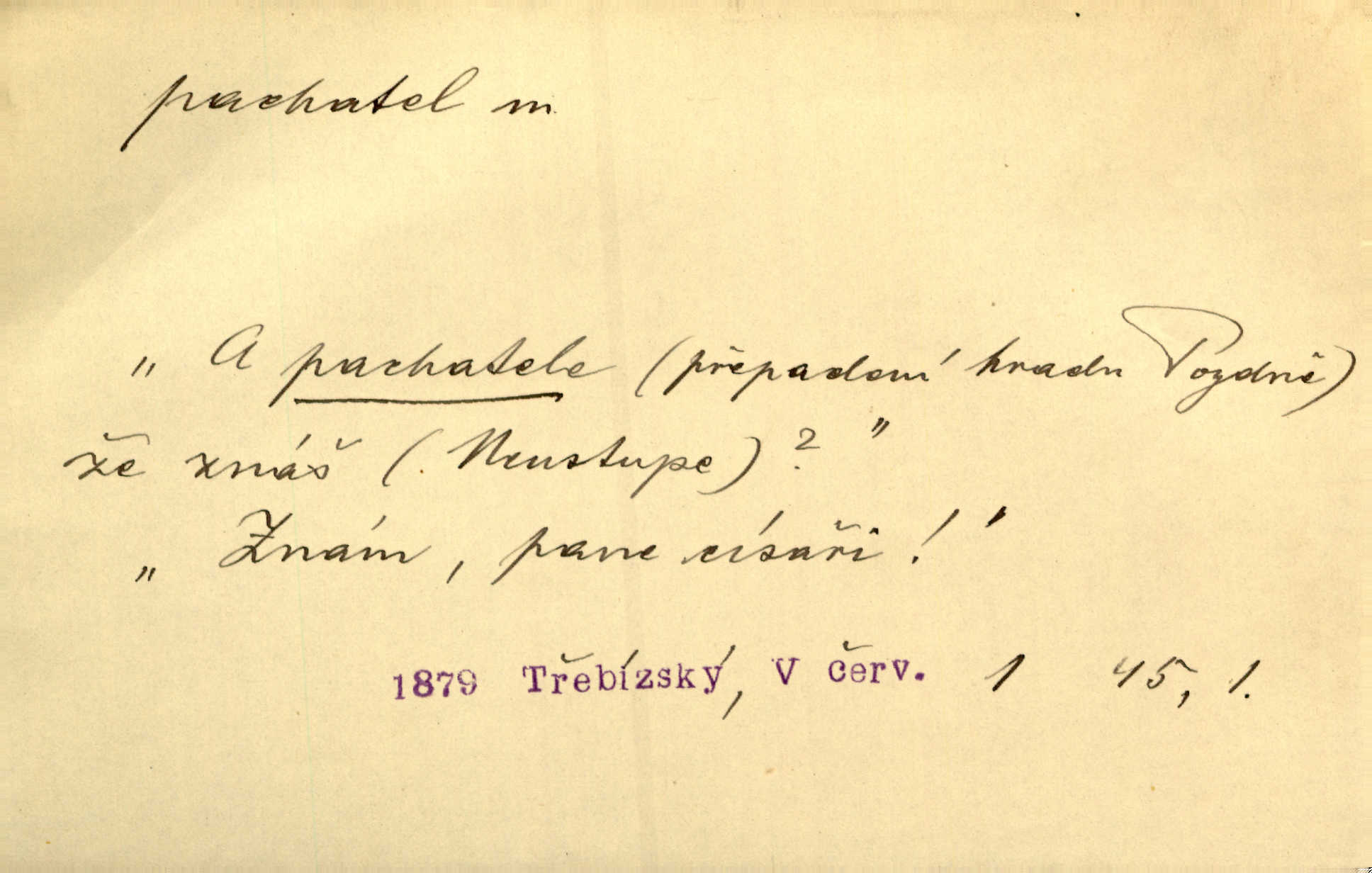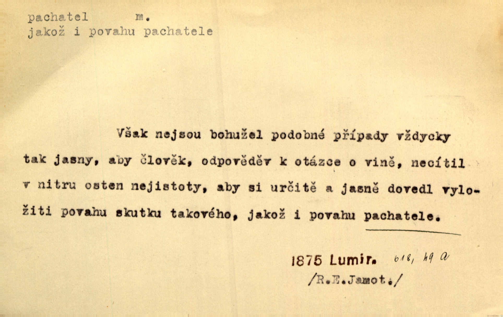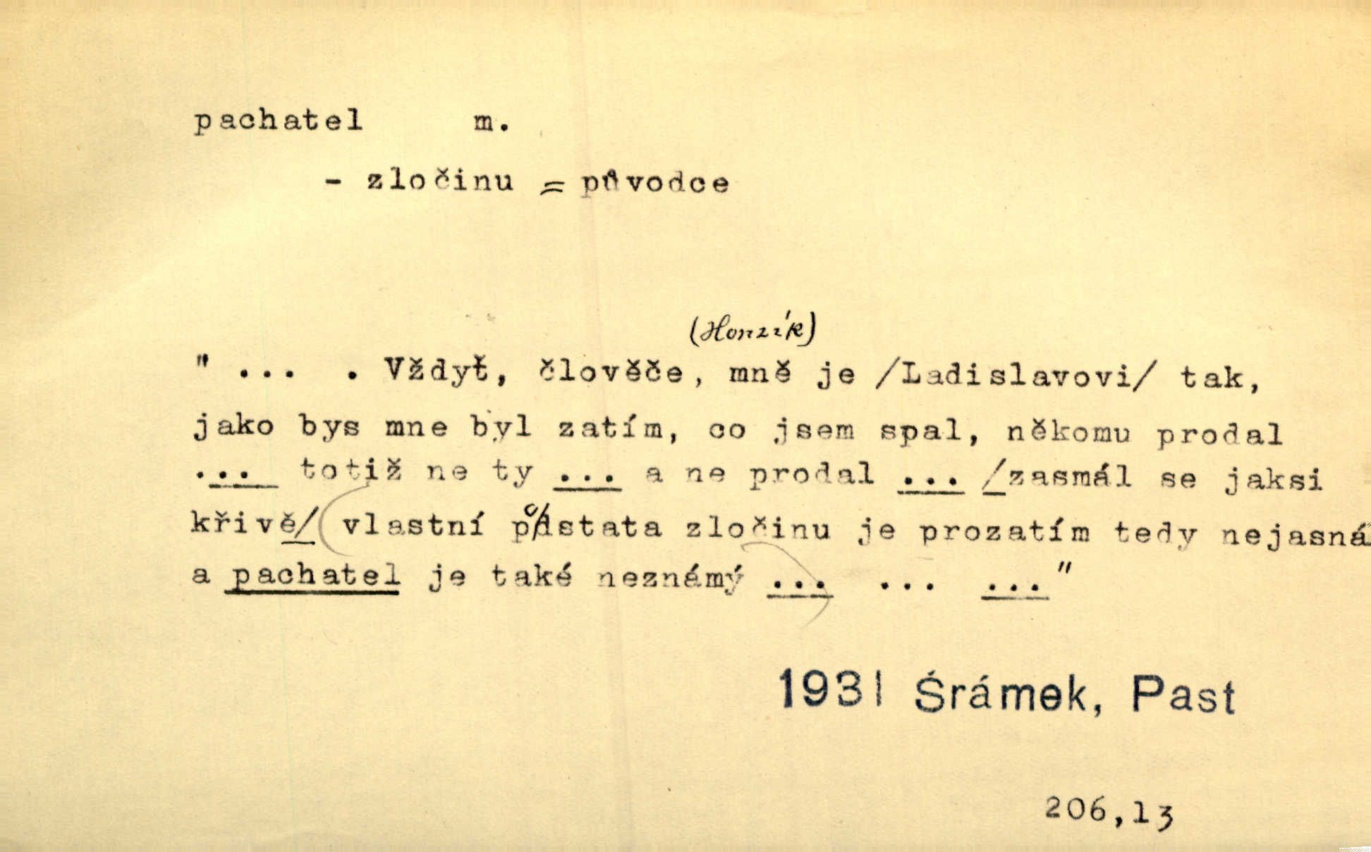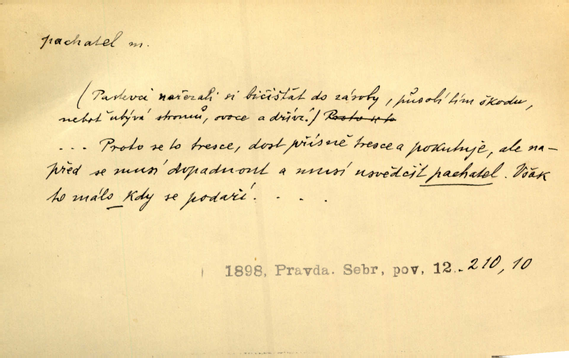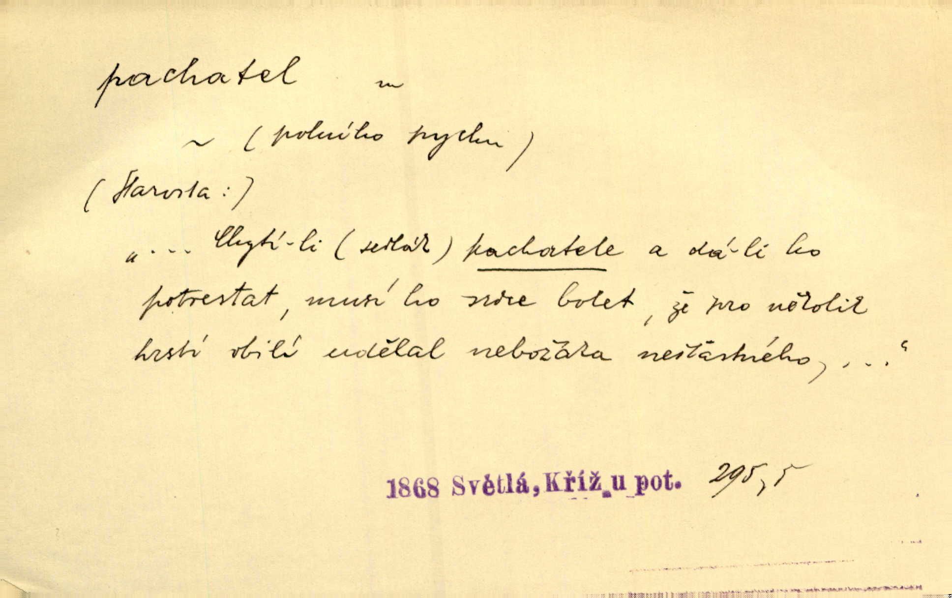 - pachatel, -e m. člověk, který něco spáchal, dopustil se zlého, nepěkného činu. Ježto rána Vénova označena jako těžké zranění, byl pachatel ponechán ve vazbě až do konfrontace s raněným. Čap. Ch. Vlastní podstata zločinu je prozatím nejasná a pachatel je také neznámý. Šrám. Ihned vysláni četníci, aby pachatele stíhali. Jir. Nejdůležitějším důkazem totožnosti obžalovaného s pachatelem vraždy bylo žalobě místní ohledání. Čap. Ch. Žert. Pan kanovník brání jesuity jen co pachatel veršů, které dle jeho náhledu nedošly dostatečného uznání. Ner. Práv. pachatel trestního činu osoba, která se něčeho dopustila.
