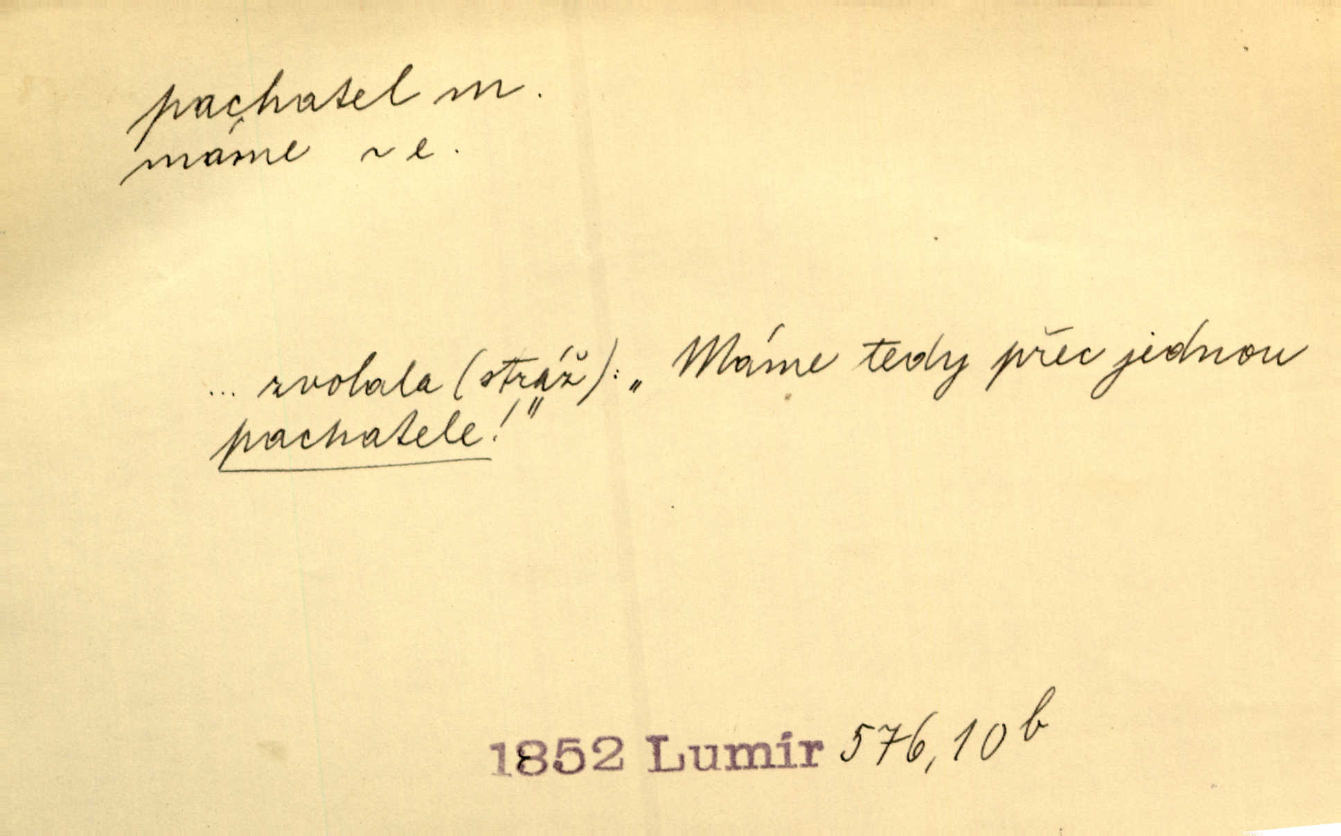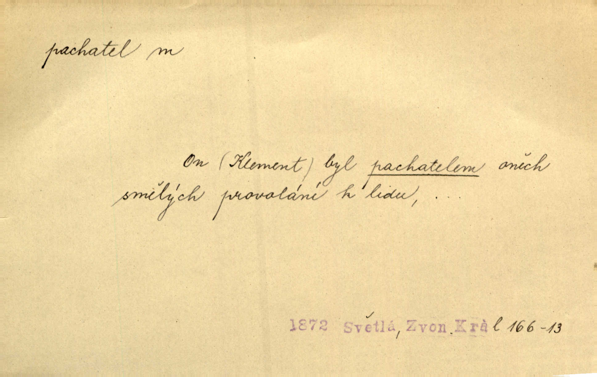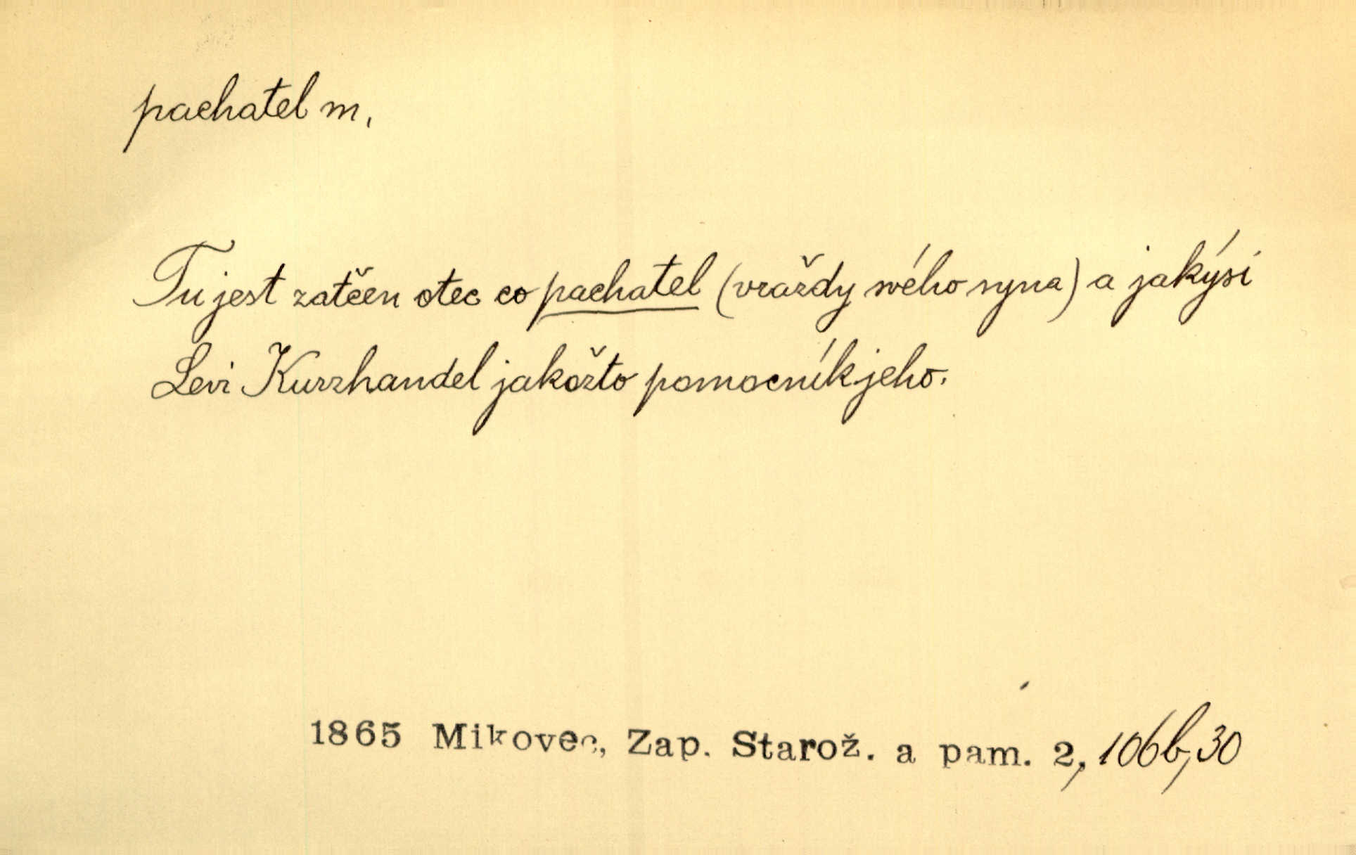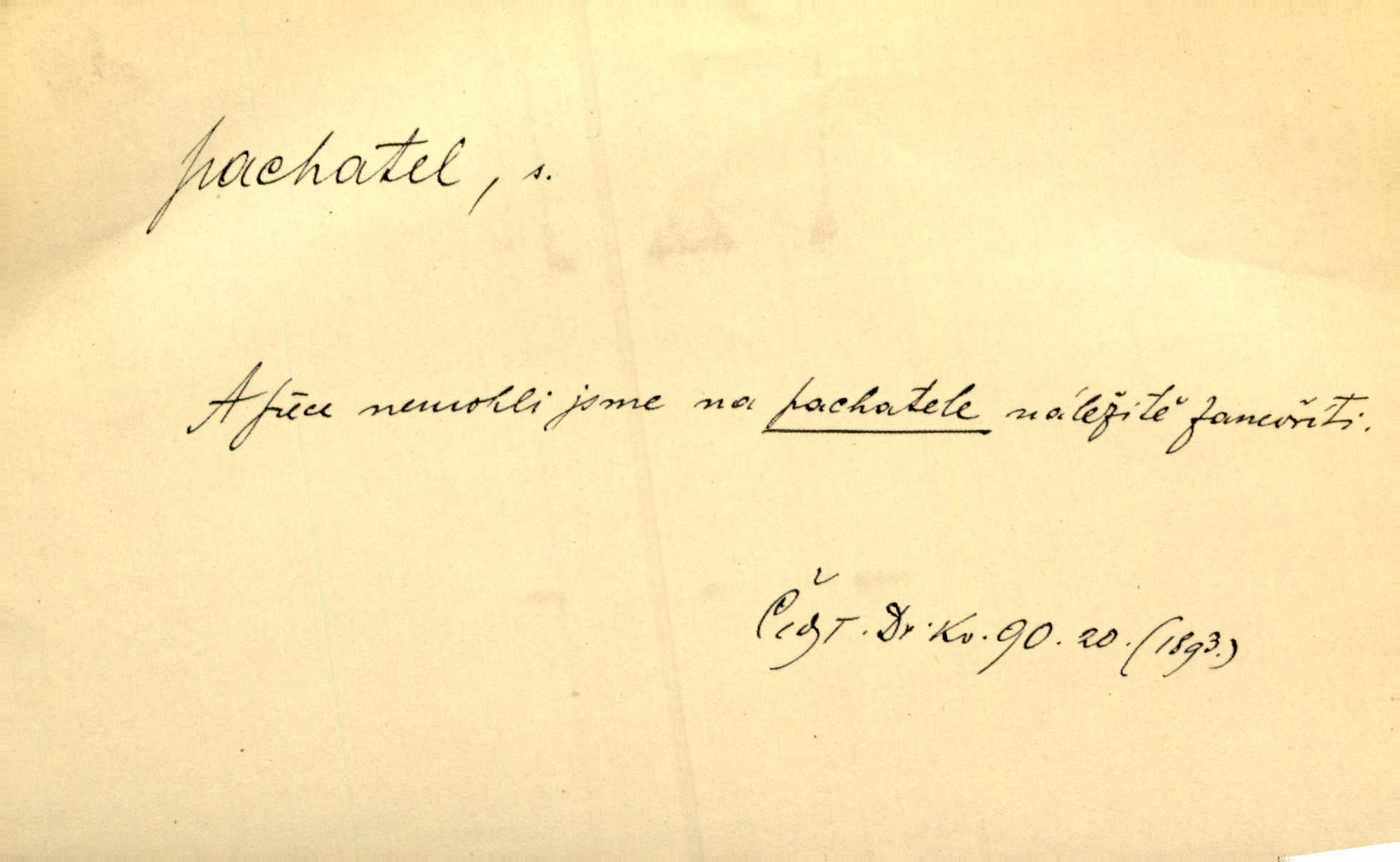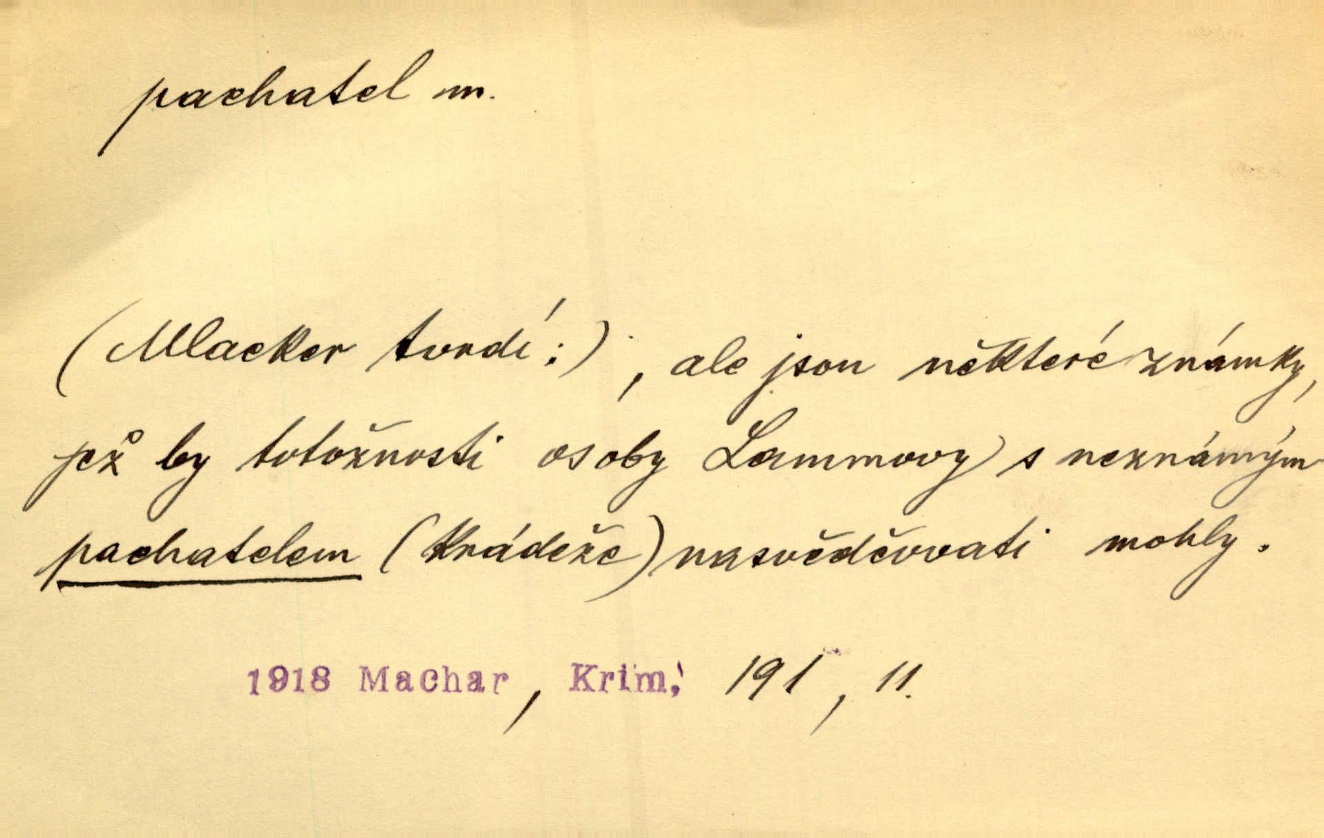 - pachatel, -e m. člověk, který něco spáchal, dopustil se zlého, nepěkného činu. Ježto rána Vénova označena jako těžké zranění, byl pachatel ponechán ve vazbě až do konfrontace s raněným. Čap. Ch. Vlastní podstata zločinu je prozatím nejasná a pachatel je také neznámý. Šrám. Ihned vysláni četníci, aby pachatele stíhali. Jir. Nejdůležitějším důkazem totožnosti obžalovaného s pachatelem vraždy bylo žalobě místní ohledání. Čap. Ch. Žert. Pan kanovník brání jesuity jen co pachatel veršů, které dle jeho náhledu nedošly dostatečného uznání. Ner. Práv. pachatel trestního činu osoba, která se něčeho dopustila.