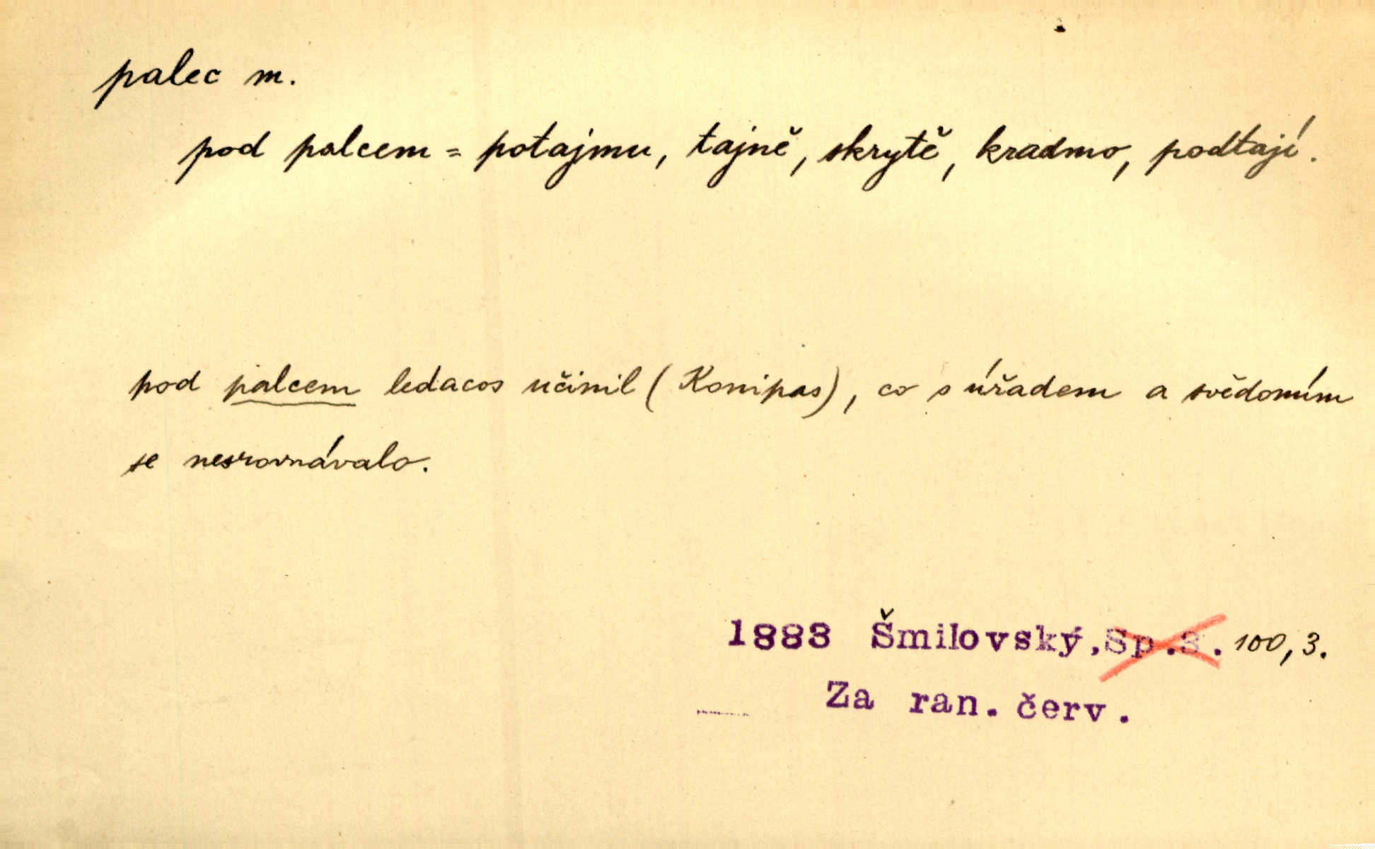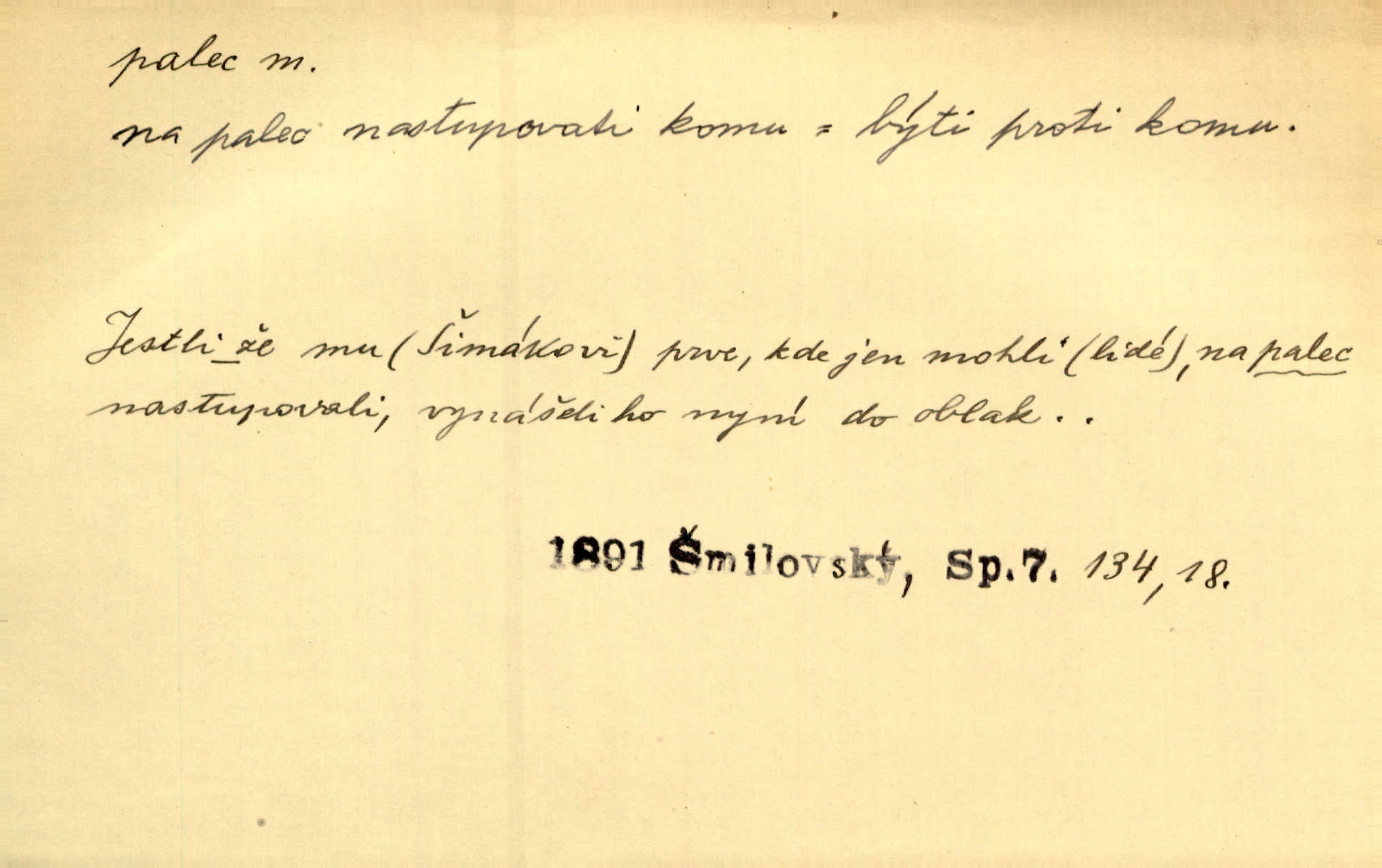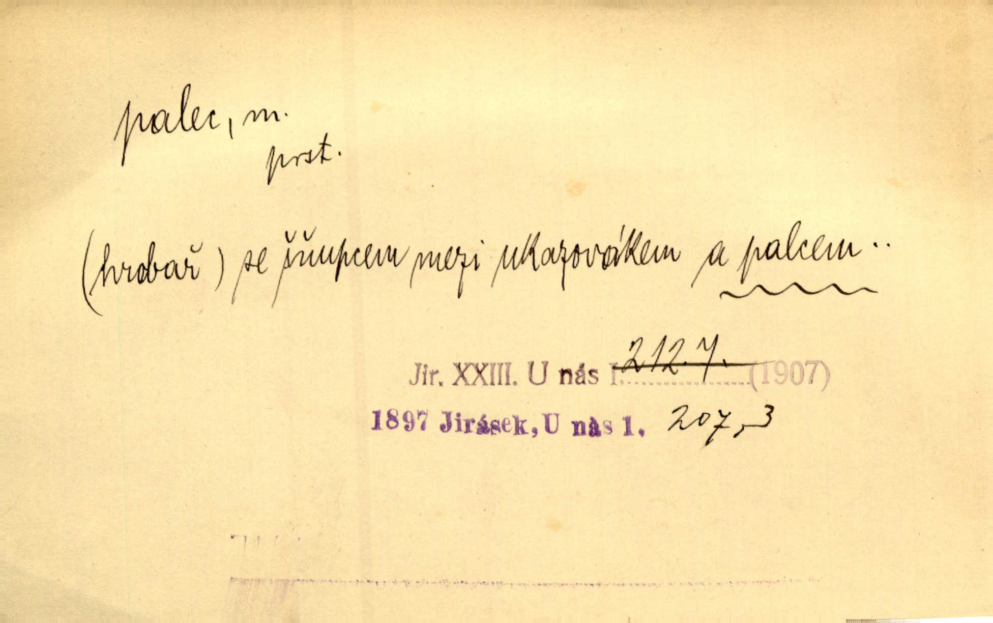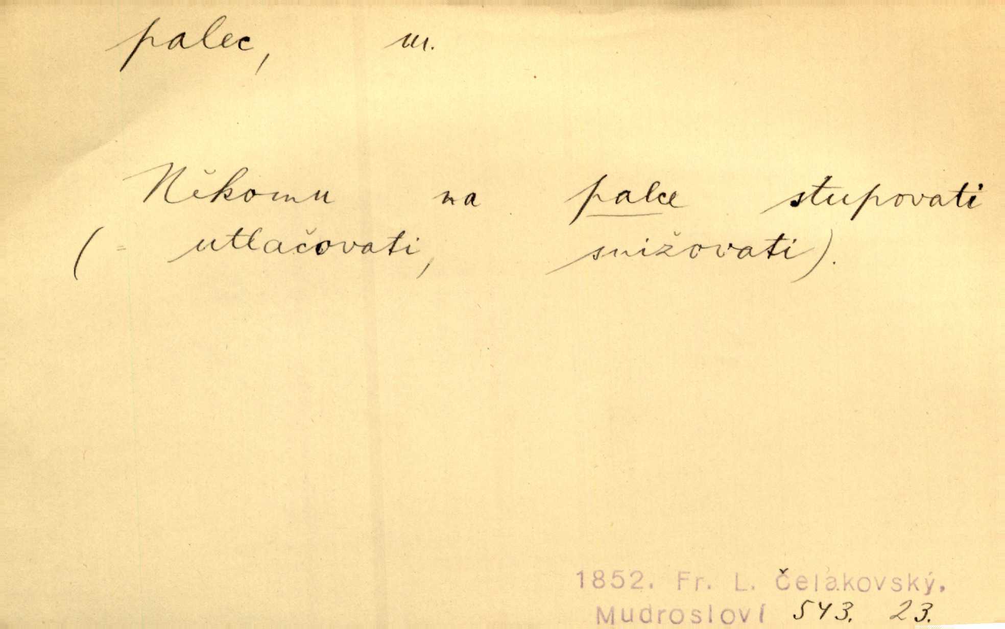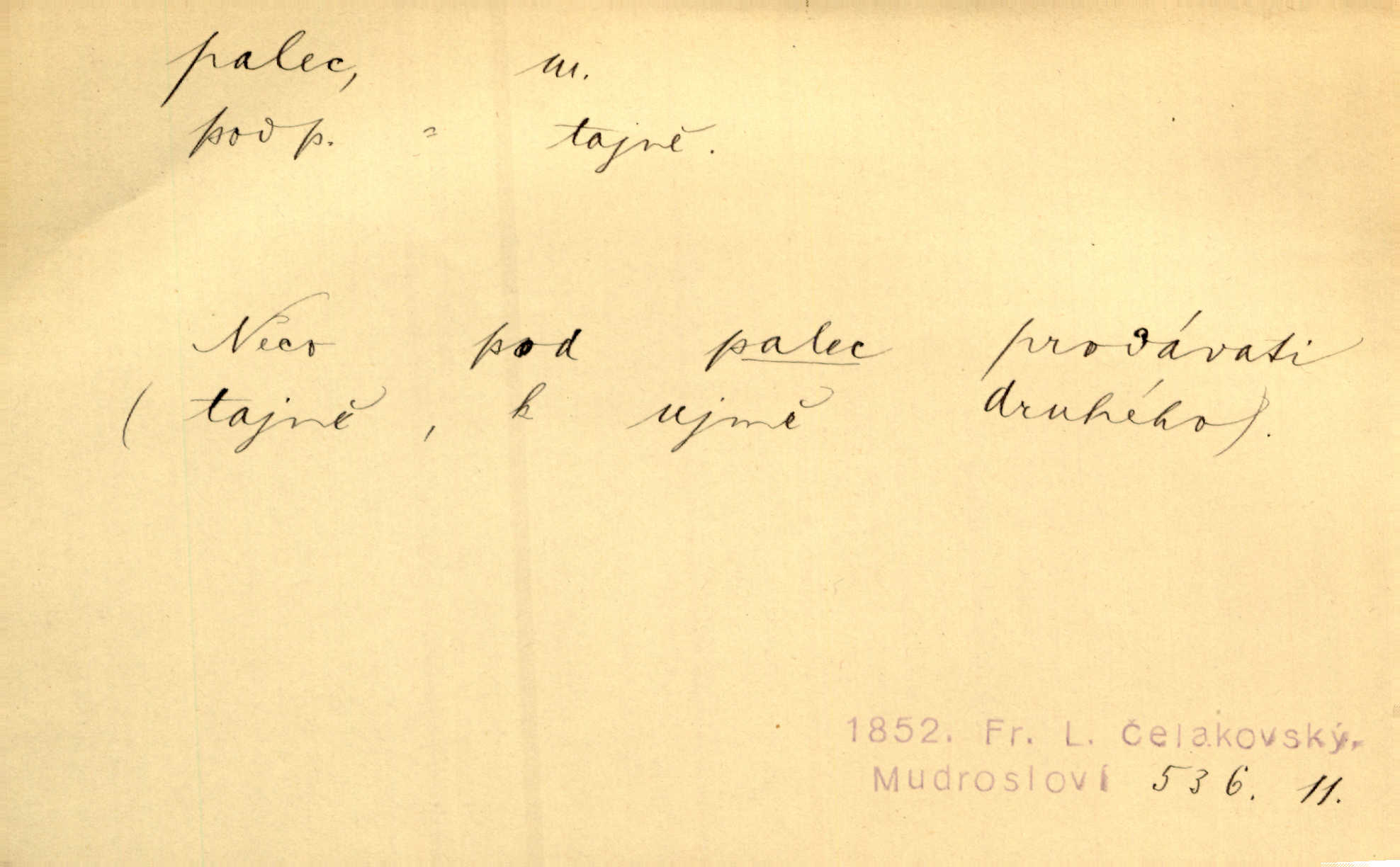 - palec, -lce m. nejsilnější prst u ruky n. nohy. [Babice] měla u pravé ruky tak široký palec, že jí celou dlaň zakrýval. Erb. Z boty vykukoval palec. Paleč. Chlapec jako palec utíkal Běláčkovi naproti maličký. Baar. Ještě dnes večer učiním mu nabídnutí k sňatku, strýče, a tu bych tě velice prosila, abys mi držel palec přál dobré pořízení mysle na mne! Čap. Ch. Nejen rakouské soudy, také státní zastupitelstvo drželo vždy policii a policajtům palec bylo jim příznivé. Herrm. Lidé by sice všichni rádi měli dobrou vládu, malé daně, spravedlivost, ale ani palcem k dosažení všeho toho hnouti nechtějí nijak se přičiniti. Havl. Víš, že ti pan Měřička skoupil včera dluhy? Víte, hoši, aby ho lepší dostal pod palec do své moci, aby ho ovládl. Šlej. K úřadům se chodilo odjakživa kuchyní do kanceláře a také sládek Krocín podmazával pánům palce podplácel je. Čečetka. Vrchní dostal asi hodně pod palec, že to [prodej panství] tak smluvil proti své vrchnosti hodný úplatek. Jir. Už jsem si včera vzpomněla, že bych pod palcem měla pro vás do Hor poslati tajně, skrytě. Šmil. [Dohazovač] vsadil všechno na kartu s Hornychem. Pod palcem měl sice také inženýrovu kartu… v záloze. Jah. D část rukavice kryjící palec. Rukavičky měly jen palce a žádných prstův. Krás. D stará délková míra, dosud běžná v anglosaských zemích, coul. Klády dvacet, čtyřiadvacet palců silné. V. Mrš. Jeník uvádí všechny granátníky své setniny jménem i jejich výšku na stopy, palce a čárky. Jir. D druh mučidla, palečnice. Španělkou, šatlavou, šibenicí, kládou a palci jí [duchovní vrchnosti] nepomůžete. Nov. D Stroj. dřevěný zub u ozubeného kola (palečného). Hosp. krátká klanice u žebřinových vozů.