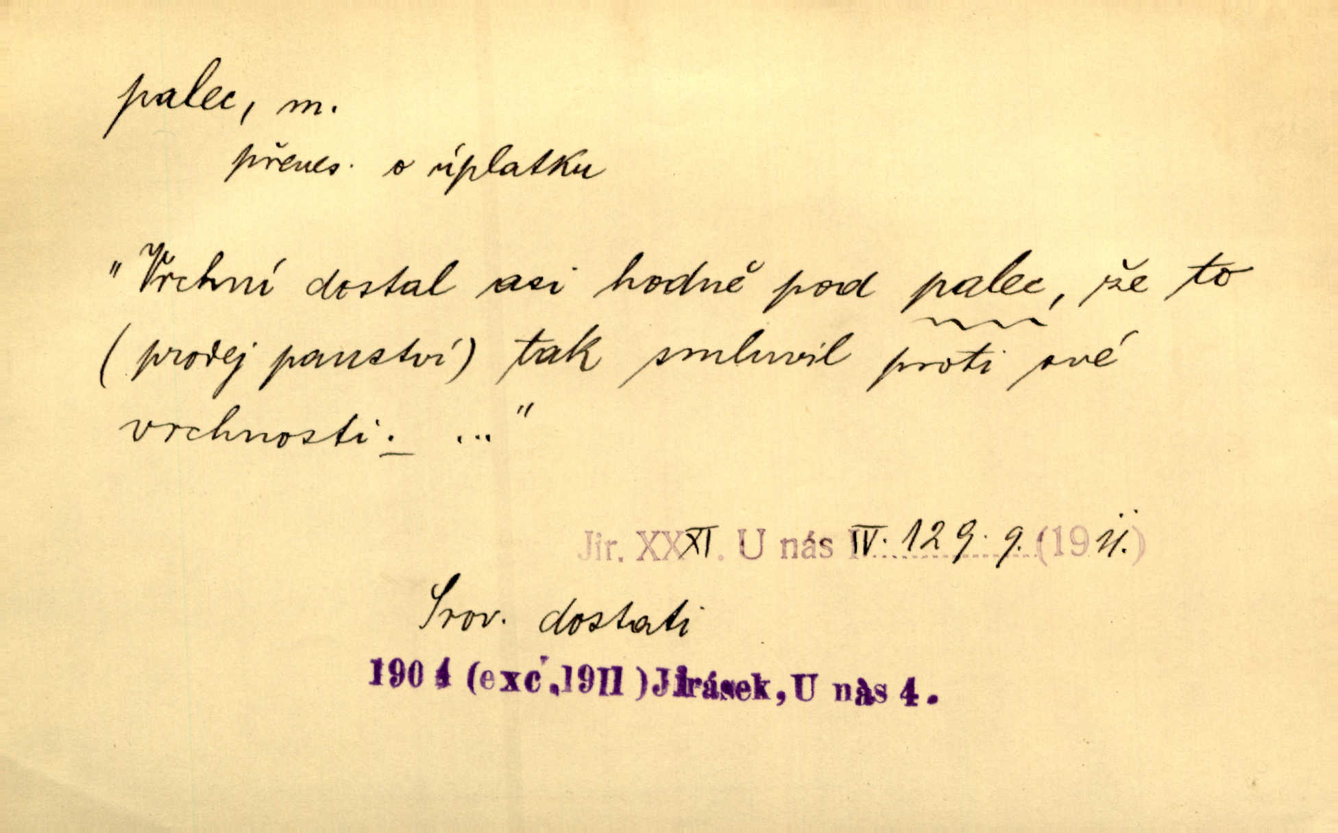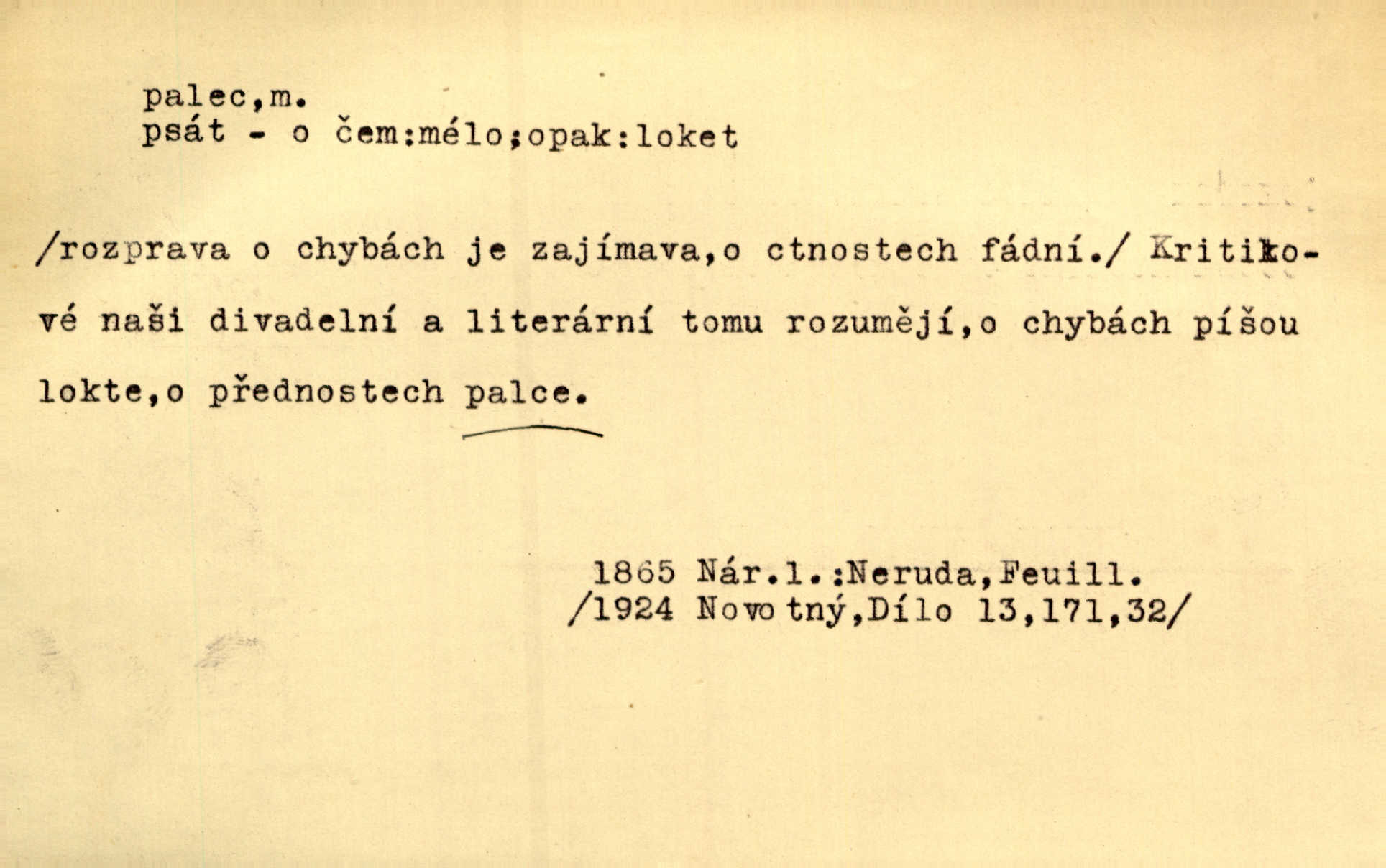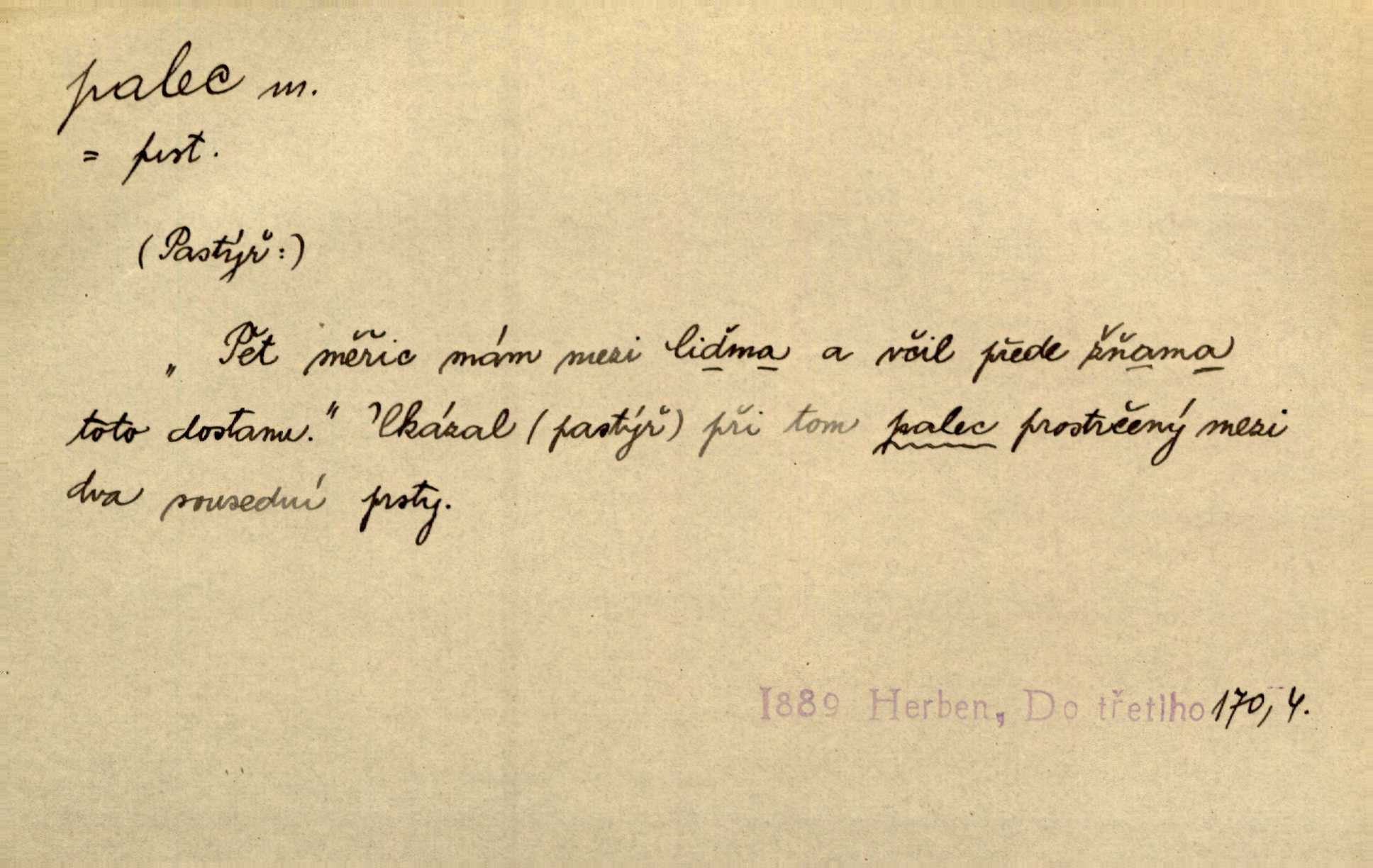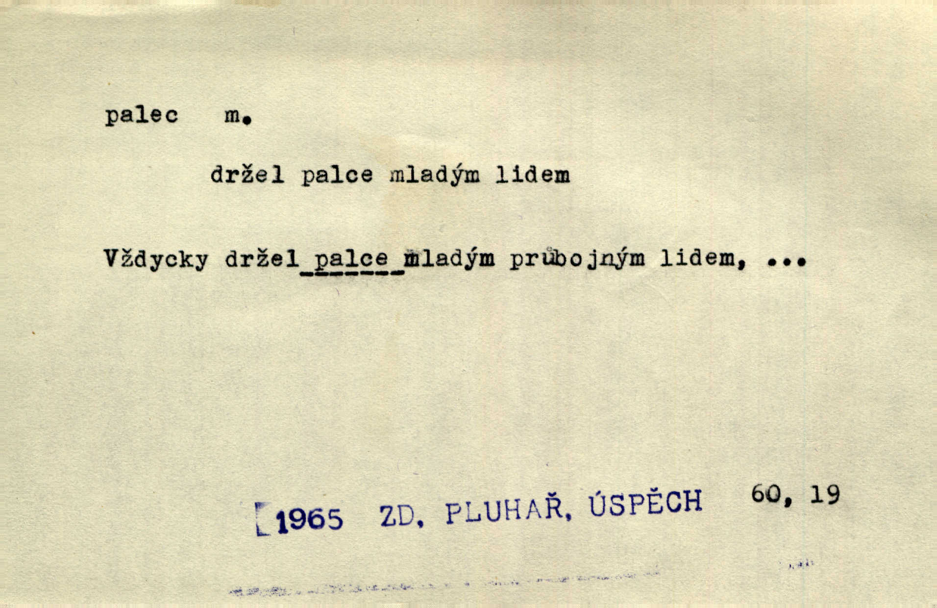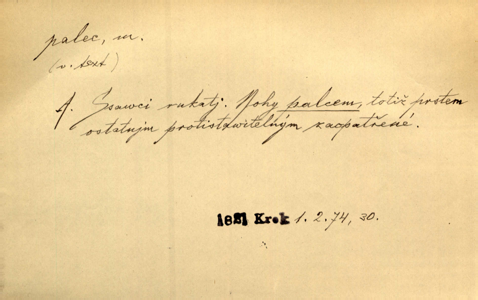 - palec, -lce m. nejsilnější prst u ruky n. nohy. [Babice] měla u pravé ruky tak široký palec, že jí celou dlaň zakrýval. Erb. Z boty vykukoval palec. Paleč. Chlapec jako palec utíkal Běláčkovi naproti maličký. Baar. Ještě dnes večer učiním mu nabídnutí k sňatku, strýče, a tu bych tě velice prosila, abys mi držel palec přál dobré pořízení mysle na mne! Čap. Ch. Nejen rakouské soudy, také státní zastupitelstvo drželo vždy policii a policajtům palec bylo jim příznivé. Herrm. Lidé by sice všichni rádi měli dobrou vládu, malé daně, spravedlivost, ale ani palcem k dosažení všeho toho hnouti nechtějí nijak se přičiniti. Havl. Víš, že ti pan Měřička skoupil včera dluhy? Víte, hoši, aby ho lepší dostal pod palec do své moci, aby ho ovládl. Šlej. K úřadům se chodilo odjakživa kuchyní do kanceláře a také sládek Krocín podmazával pánům palce podplácel je. Čečetka. Vrchní dostal asi hodně pod palec, že to [prodej panství] tak smluvil proti své vrchnosti hodný úplatek. Jir. Už jsem si včera vzpomněla, že bych pod palcem měla pro vás do Hor poslati tajně, skrytě. Šmil. [Dohazovač] vsadil všechno na kartu s Hornychem. Pod palcem měl sice také inženýrovu kartu… v záloze. Jah. D část rukavice kryjící palec. Rukavičky měly jen palce a žádných prstův. Krás. D stará délková míra, dosud běžná v anglosaských zemích, coul. Klády dvacet, čtyřiadvacet palců silné. V. Mrš. Jeník uvádí všechny granátníky své setniny jménem i jejich výšku na stopy, palce a čárky. Jir. D druh mučidla, palečnice. Španělkou, šatlavou, šibenicí, kládou a palci jí [duchovní vrchnosti] nepomůžete. Nov. D Stroj. dřevěný zub u ozubeného kola (palečného). Hosp. krátká klanice u žebřinových vozů.