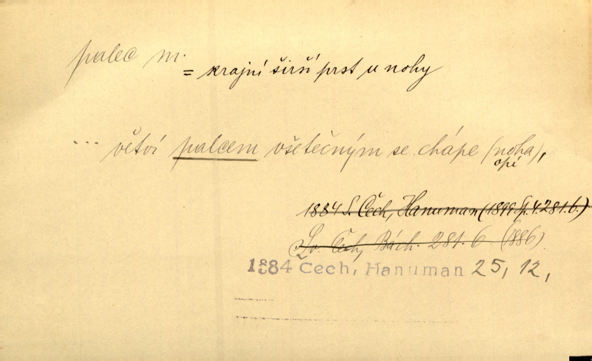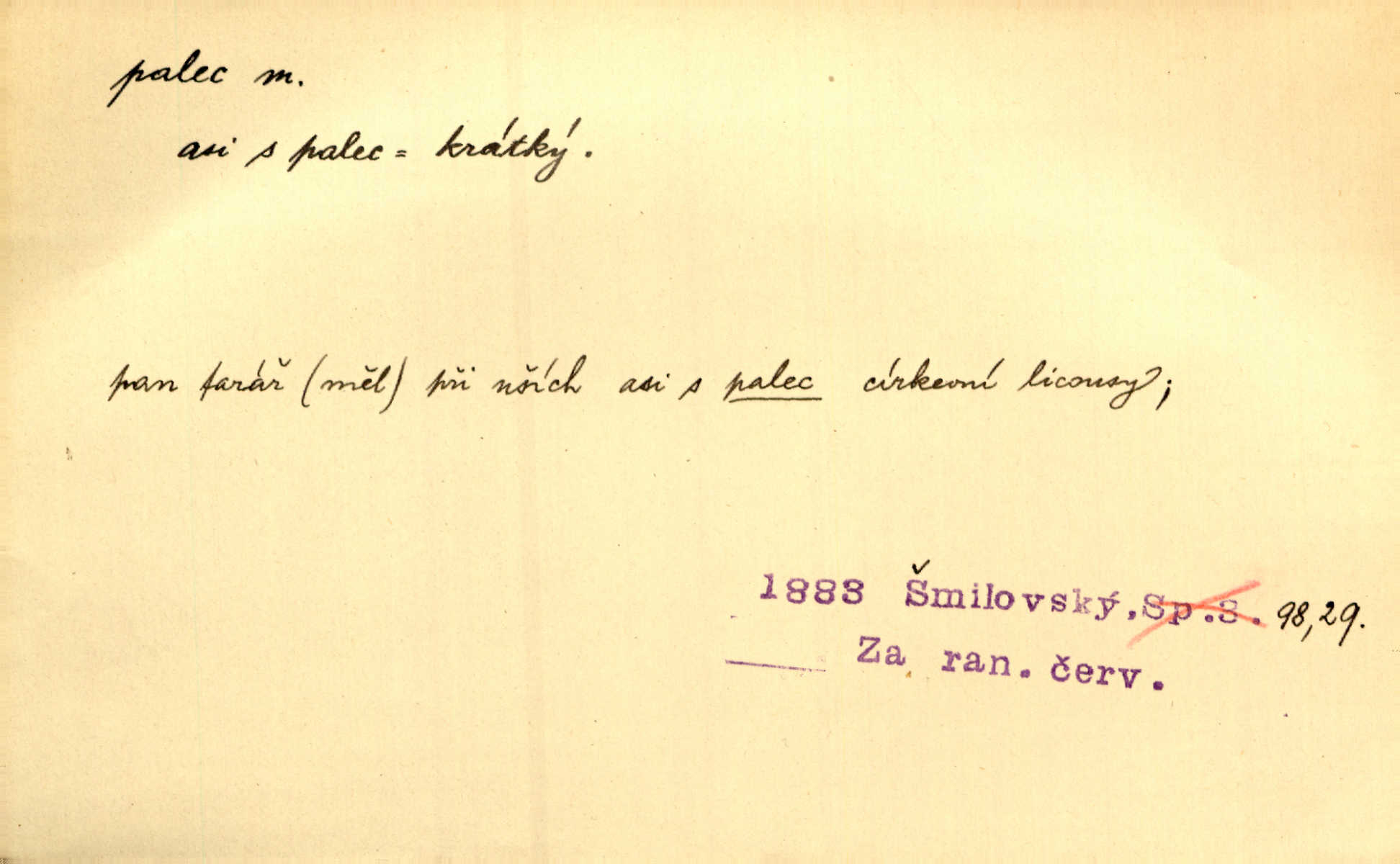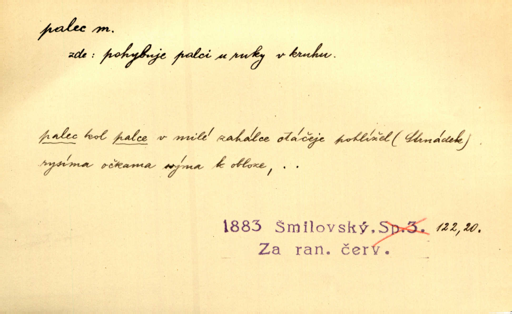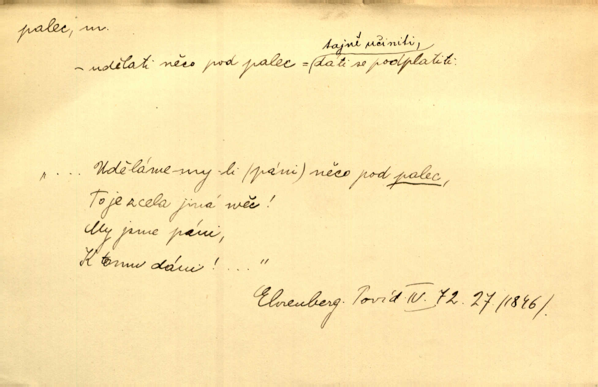 - palec, -lce m. nejsilnější prst u ruky n. nohy. [Babice] měla u pravé ruky tak široký palec, že jí celou dlaň zakrýval. Erb. Z boty vykukoval palec. Paleč. Chlapec jako palec utíkal Běláčkovi naproti maličký. Baar. Ještě dnes večer učiním mu nabídnutí k sňatku, strýče, a tu bych tě velice prosila, abys mi držel palec přál dobré pořízení mysle na mne! Čap. Ch. Nejen rakouské soudy, také státní zastupitelstvo drželo vždy policii a policajtům palec bylo jim příznivé. Herrm. Lidé by sice všichni rádi měli dobrou vládu, malé daně, spravedlivost, ale ani palcem k dosažení všeho toho hnouti nechtějí nijak se přičiniti. Havl. Víš, že ti pan Měřička skoupil včera dluhy? Víte, hoši, aby ho lepší dostal pod palec do své moci, aby ho ovládl. Šlej. K úřadům se chodilo odjakživa kuchyní do kanceláře a také sládek Krocín podmazával pánům palce podplácel je. Čečetka. Vrchní dostal asi hodně pod palec, že to [prodej panství] tak smluvil proti své vrchnosti hodný úplatek. Jir. Už jsem si včera vzpomněla, že bych pod palcem měla pro vás do Hor poslati tajně, skrytě. Šmil. [Dohazovač] vsadil všechno na kartu s Hornychem. Pod palcem měl sice také inženýrovu kartu… v záloze. Jah. D část rukavice kryjící palec. Rukavičky měly jen palce a žádných prstův. Krás. D stará délková míra, dosud běžná v anglosaských zemích, coul. Klády dvacet, čtyřiadvacet palců silné. V. Mrš. Jeník uvádí všechny granátníky své setniny jménem i jejich výšku na stopy, palce a čárky. Jir. D druh mučidla, palečnice. Španělkou, šatlavou, šibenicí, kládou a palci jí [duchovní vrchnosti] nepomůžete. Nov. D Stroj. dřevěný zub u ozubeného kola (palečného). Hosp. krátká klanice u žebřinových vozů.