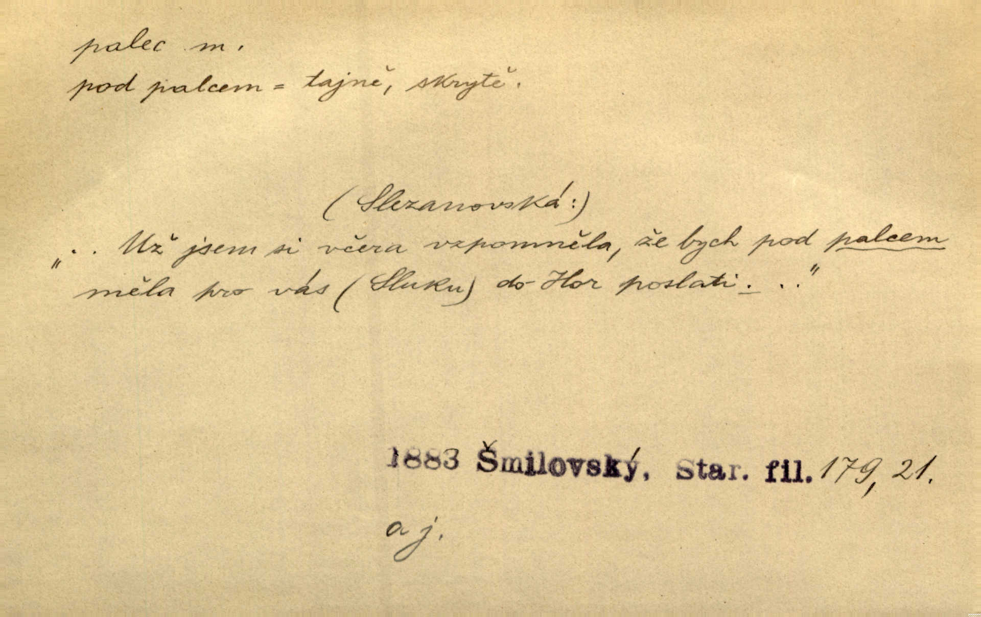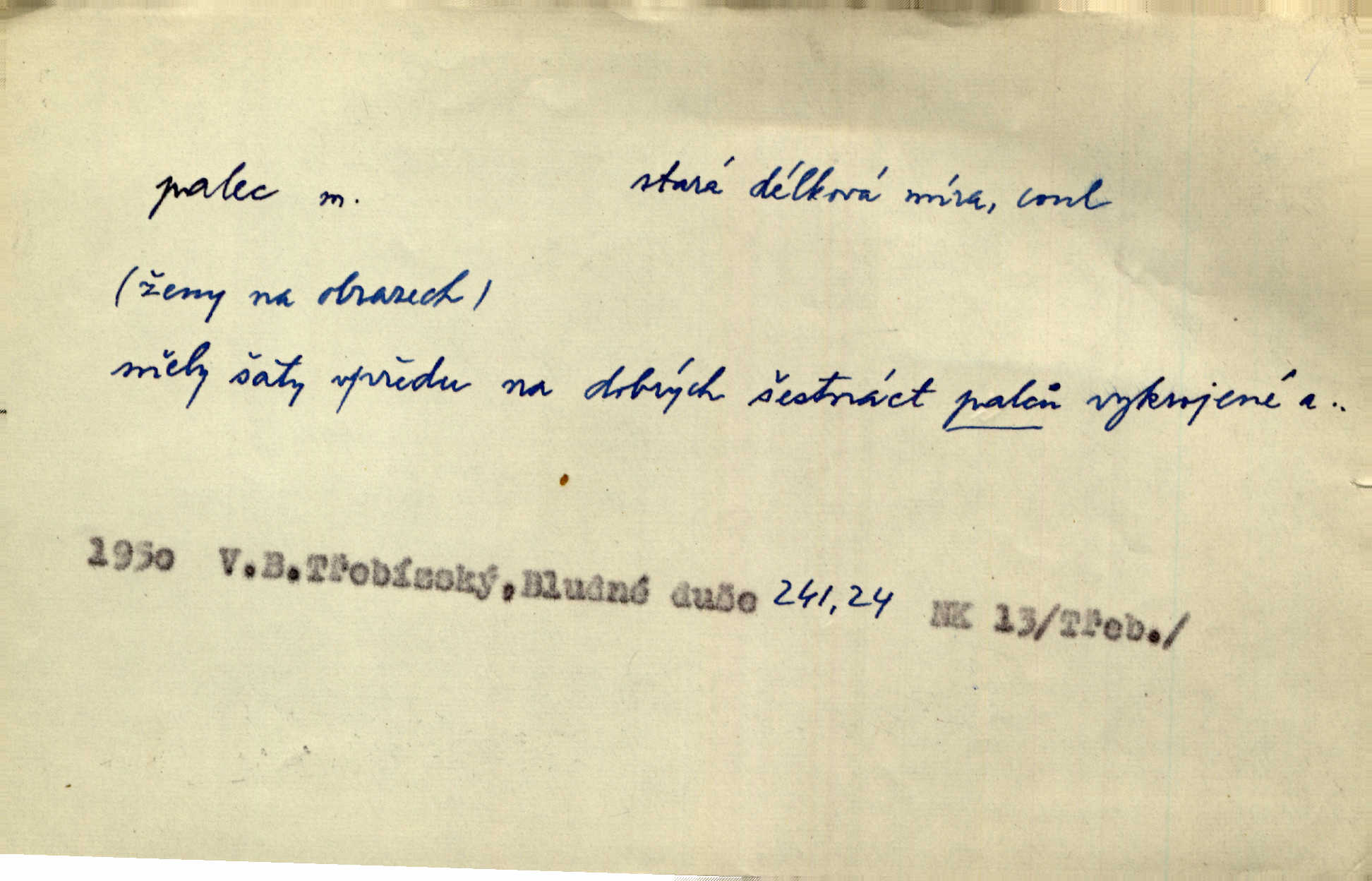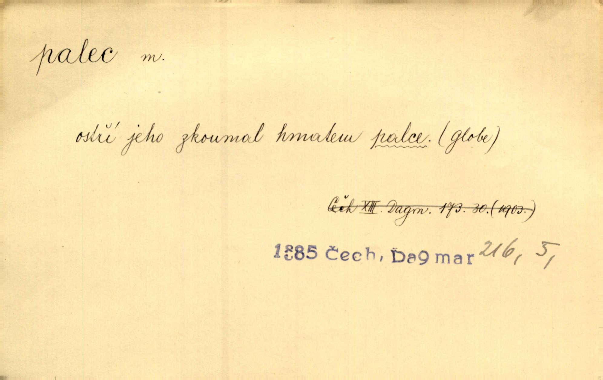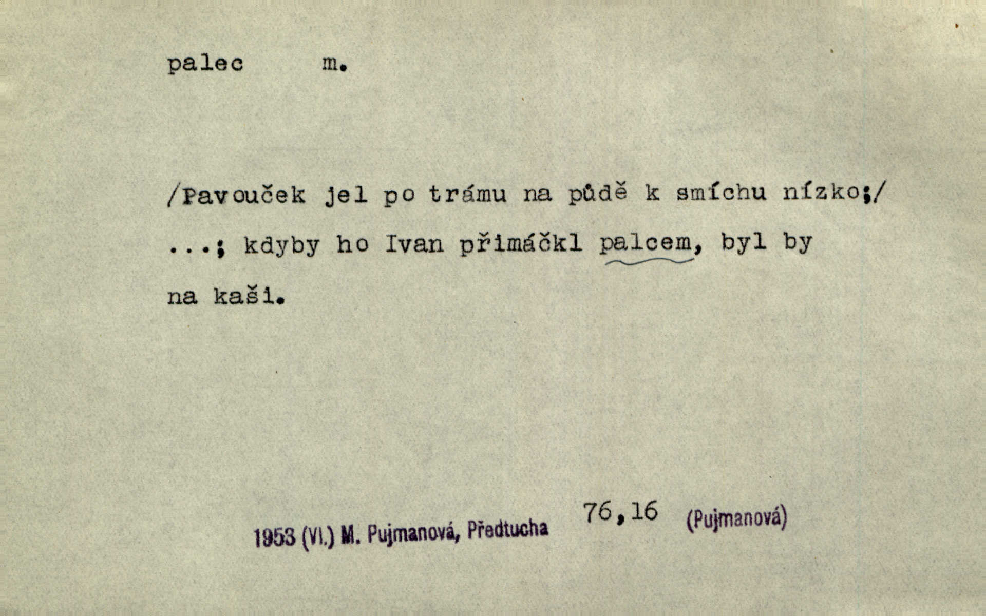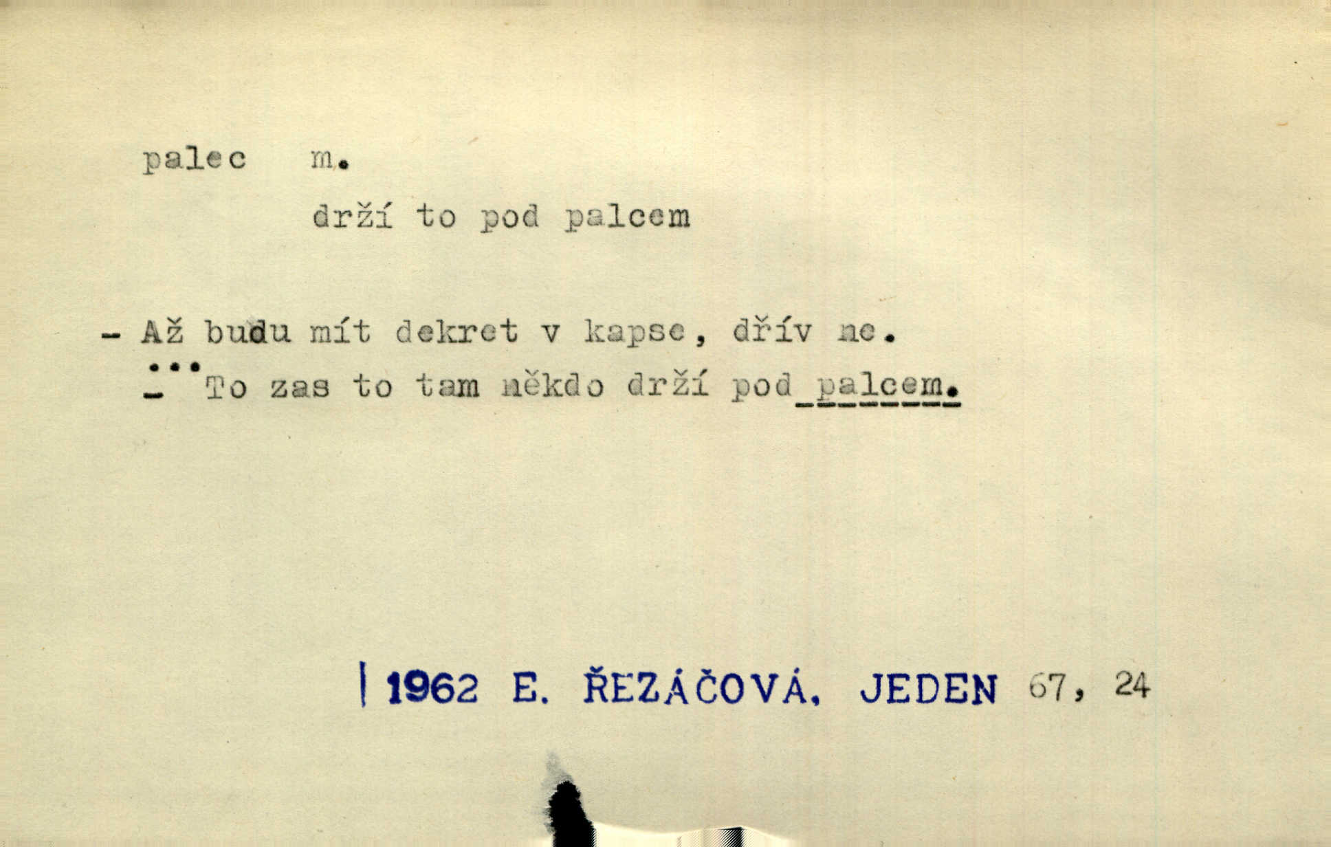 - palec, -lce m. nejsilnější prst u ruky n. nohy. [Babice] měla u pravé ruky tak široký palec, že jí celou dlaň zakrýval. Erb. Z boty vykukoval palec. Paleč. Chlapec jako palec utíkal Běláčkovi naproti maličký. Baar. Ještě dnes večer učiním mu nabídnutí k sňatku, strýče, a tu bych tě velice prosila, abys mi držel palec přál dobré pořízení mysle na mne! Čap. Ch. Nejen rakouské soudy, také státní zastupitelstvo drželo vždy policii a policajtům palec bylo jim příznivé. Herrm. Lidé by sice všichni rádi měli dobrou vládu, malé daně, spravedlivost, ale ani palcem k dosažení všeho toho hnouti nechtějí nijak se přičiniti. Havl. Víš, že ti pan Měřička skoupil včera dluhy? Víte, hoši, aby ho lepší dostal pod palec do své moci, aby ho ovládl. Šlej. K úřadům se chodilo odjakživa kuchyní do kanceláře a také sládek Krocín podmazával pánům palce podplácel je. Čečetka. Vrchní dostal asi hodně pod palec, že to [prodej panství] tak smluvil proti své vrchnosti hodný úplatek. Jir. Už jsem si včera vzpomněla, že bych pod palcem měla pro vás do Hor poslati tajně, skrytě. Šmil. [Dohazovač] vsadil všechno na kartu s Hornychem. Pod palcem měl sice také inženýrovu kartu… v záloze. Jah. D část rukavice kryjící palec. Rukavičky měly jen palce a žádných prstův. Krás. D stará délková míra, dosud běžná v anglosaských zemích, coul. Klády dvacet, čtyřiadvacet palců silné. V. Mrš. Jeník uvádí všechny granátníky své setniny jménem i jejich výšku na stopy, palce a čárky. Jir. D druh mučidla, palečnice. Španělkou, šatlavou, šibenicí, kládou a palci jí [duchovní vrchnosti] nepomůžete. Nov. D Stroj. dřevěný zub u ozubeného kola (palečného). Hosp. krátká klanice u žebřinových vozů.