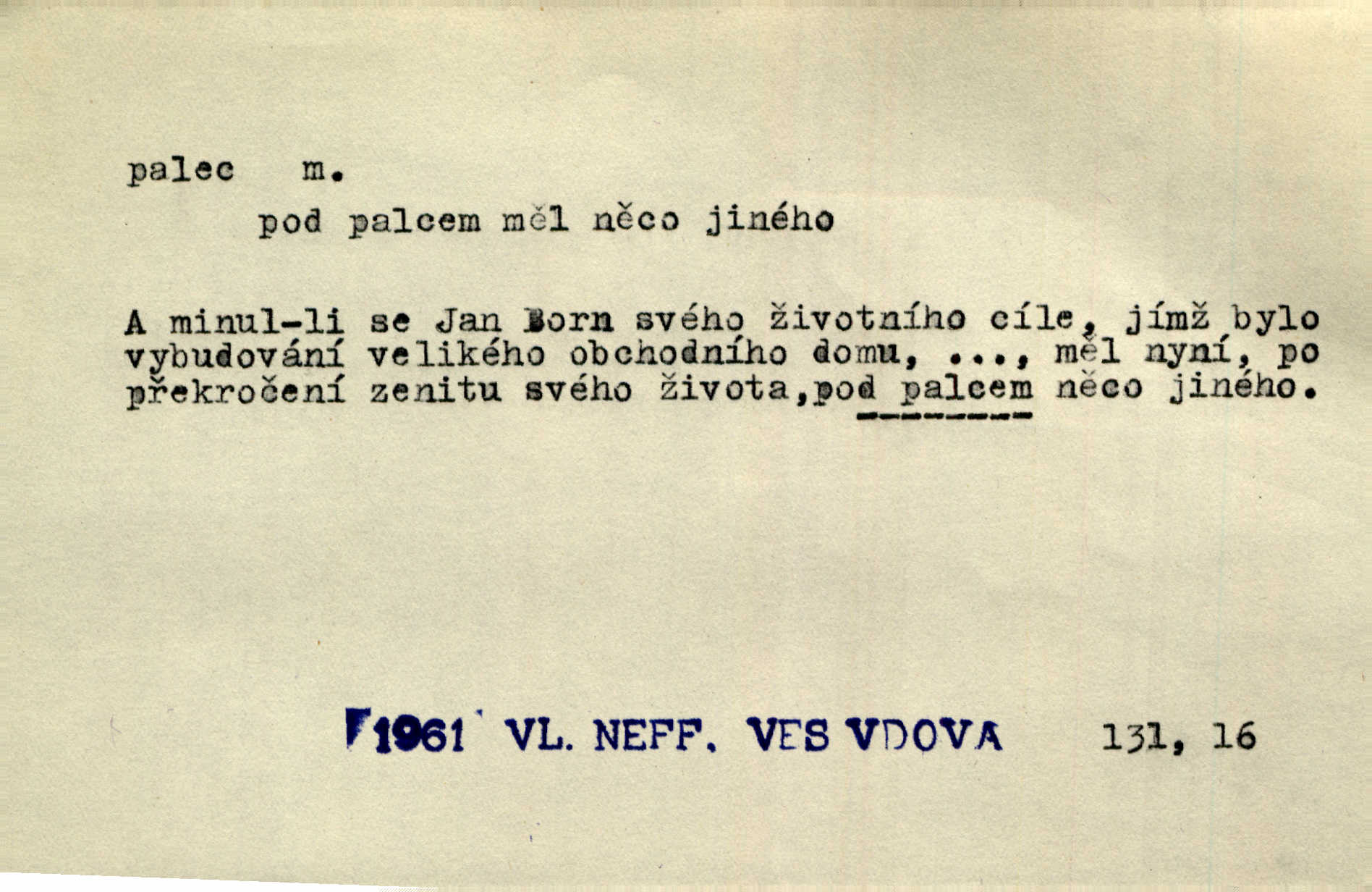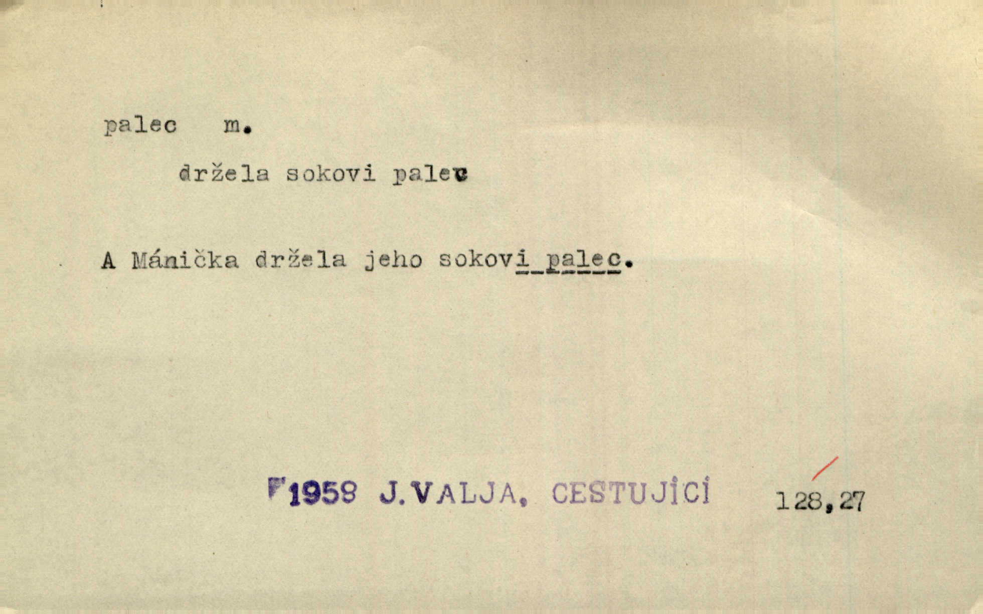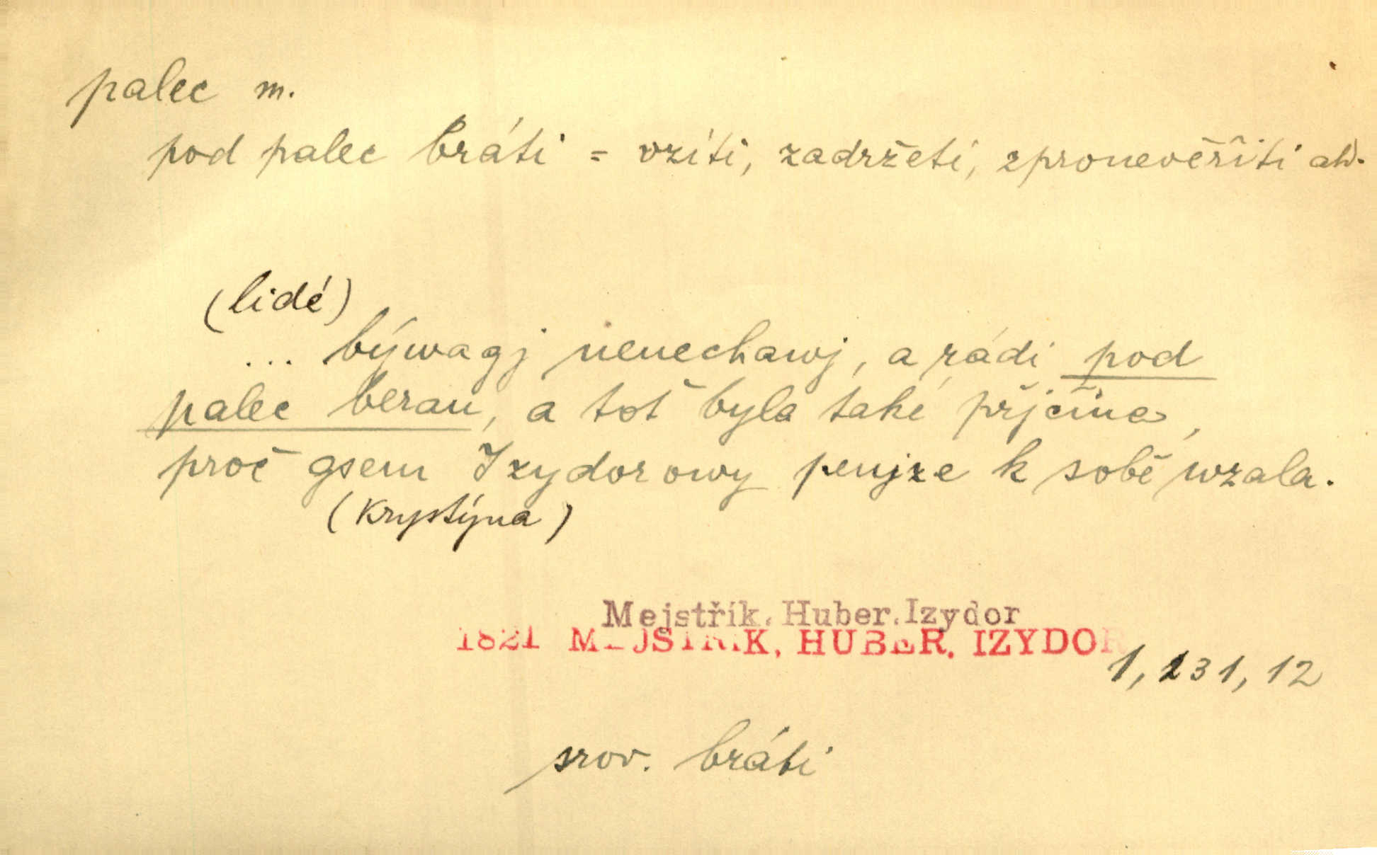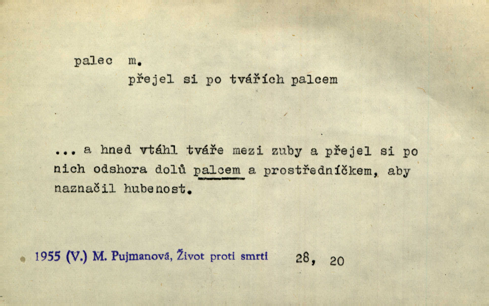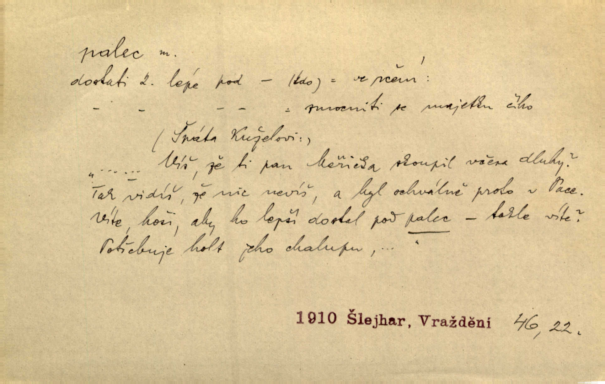 - palec, -lce m. nejsilnější prst u ruky n. nohy. [Babice] měla u pravé ruky tak široký palec, že jí celou dlaň zakrýval. Erb. Z boty vykukoval palec. Paleč. Chlapec jako palec utíkal Běláčkovi naproti maličký. Baar. Ještě dnes večer učiním mu nabídnutí k sňatku, strýče, a tu bych tě velice prosila, abys mi držel palec přál dobré pořízení mysle na mne! Čap. Ch. Nejen rakouské soudy, také státní zastupitelstvo drželo vždy policii a policajtům palec bylo jim příznivé. Herrm. Lidé by sice všichni rádi měli dobrou vládu, malé daně, spravedlivost, ale ani palcem k dosažení všeho toho hnouti nechtějí nijak se přičiniti. Havl. Víš, že ti pan Měřička skoupil včera dluhy? Víte, hoši, aby ho lepší dostal pod palec do své moci, aby ho ovládl. Šlej. K úřadům se chodilo odjakživa kuchyní do kanceláře a také sládek Krocín podmazával pánům palce podplácel je. Čečetka. Vrchní dostal asi hodně pod palec, že to [prodej panství] tak smluvil proti své vrchnosti hodný úplatek. Jir. Už jsem si včera vzpomněla, že bych pod palcem měla pro vás do Hor poslati tajně, skrytě. Šmil. [Dohazovač] vsadil všechno na kartu s Hornychem. Pod palcem měl sice také inženýrovu kartu… v záloze. Jah. D část rukavice kryjící palec. Rukavičky měly jen palce a žádných prstův. Krás. D stará délková míra, dosud běžná v anglosaských zemích, coul. Klády dvacet, čtyřiadvacet palců silné. V. Mrš. Jeník uvádí všechny granátníky své setniny jménem i jejich výšku na stopy, palce a čárky. Jir. D druh mučidla, palečnice. Španělkou, šatlavou, šibenicí, kládou a palci jí [duchovní vrchnosti] nepomůžete. Nov. D Stroj. dřevěný zub u ozubeného kola (palečného). Hosp. krátká klanice u žebřinových vozů.