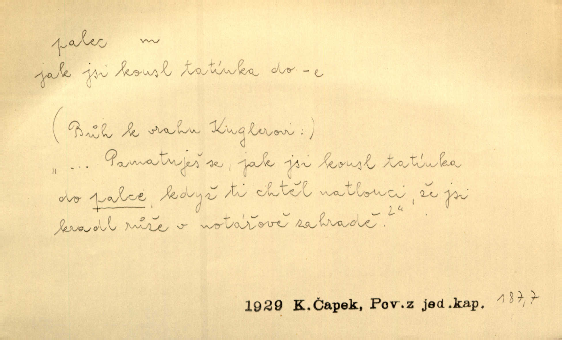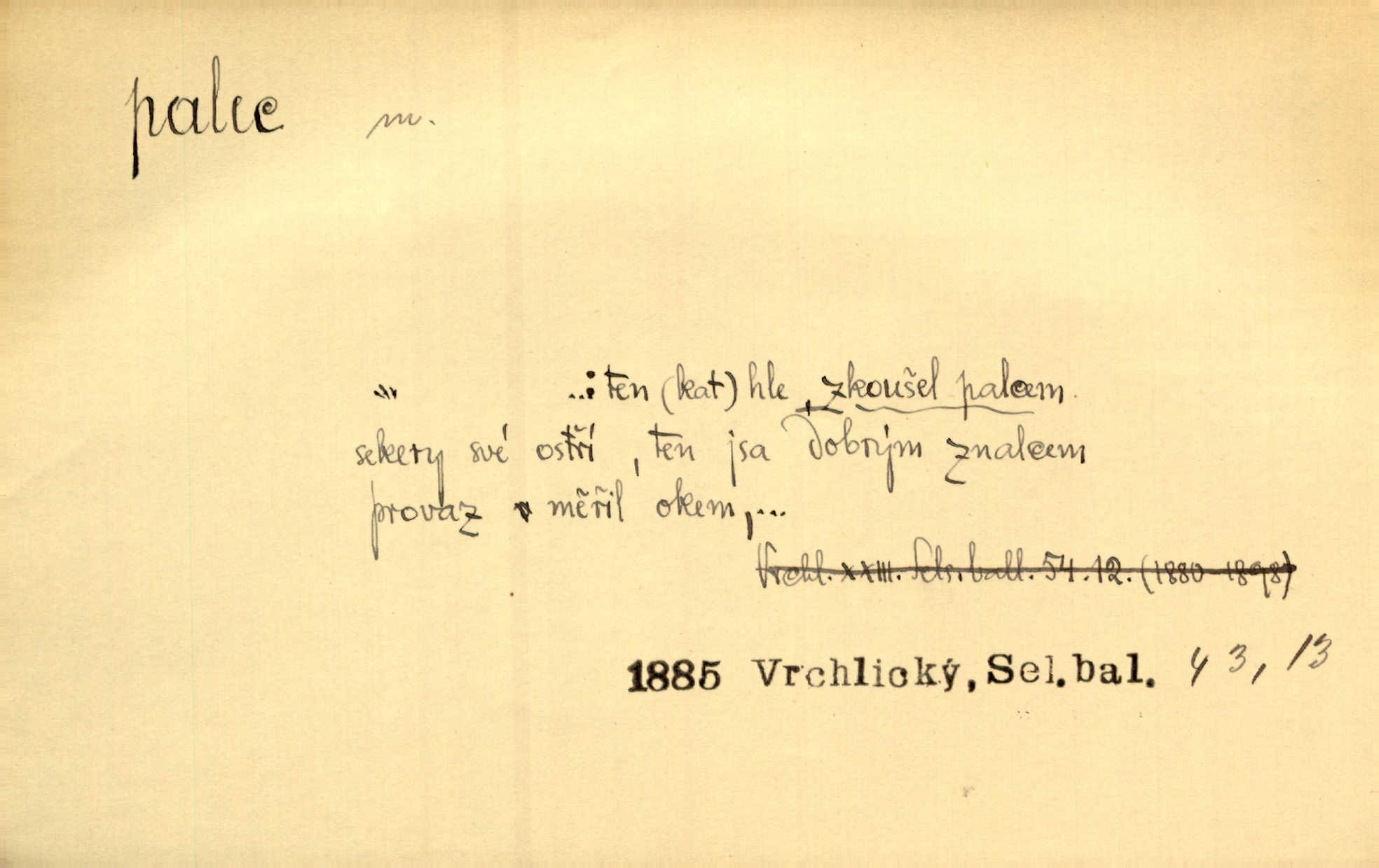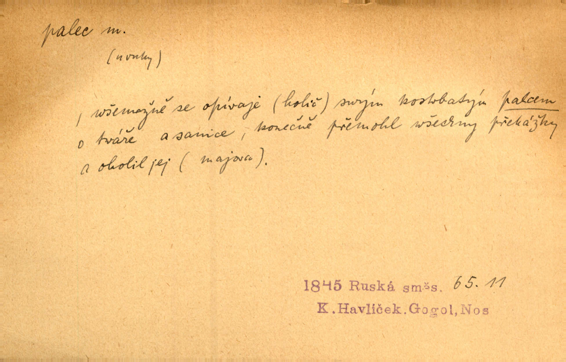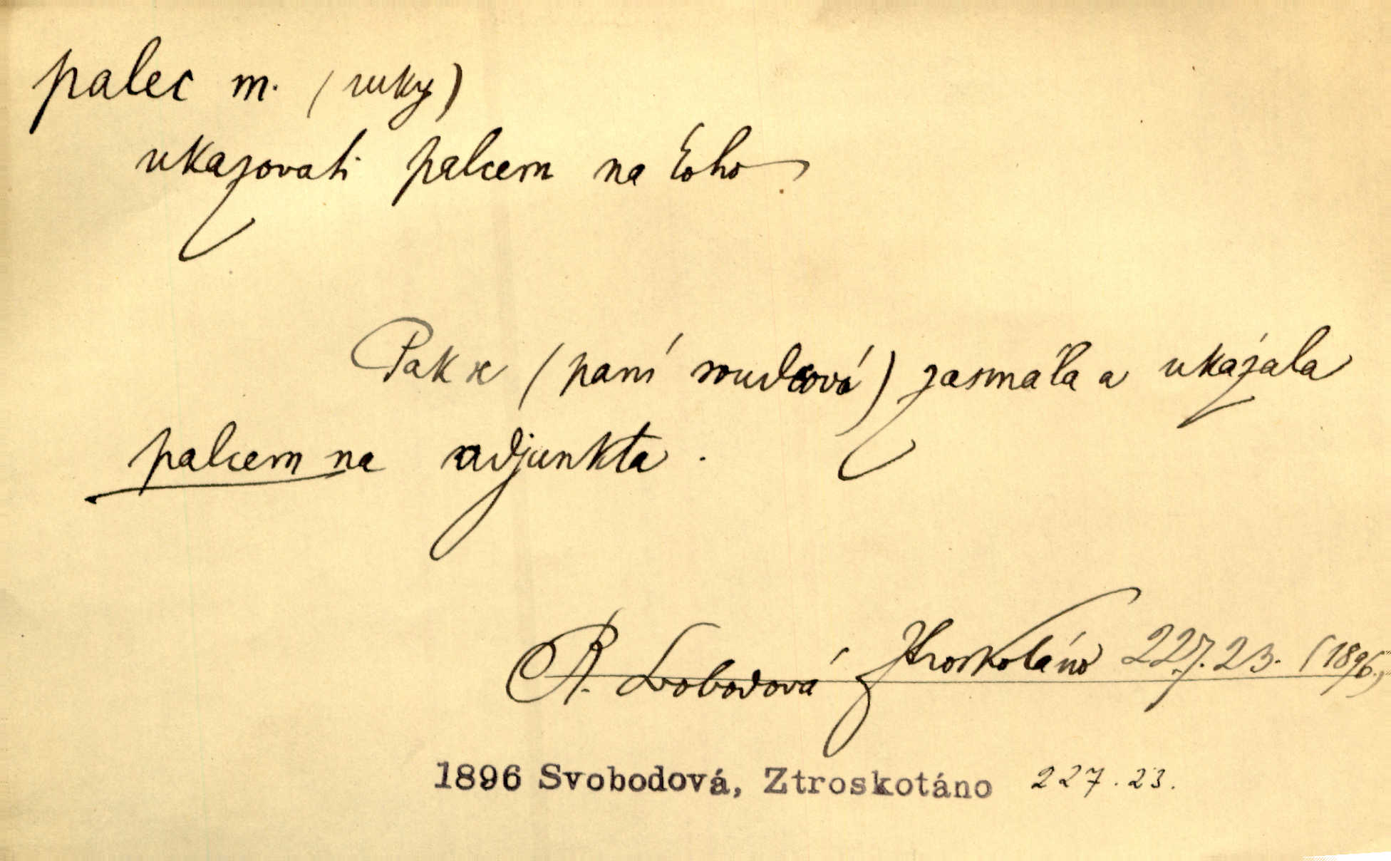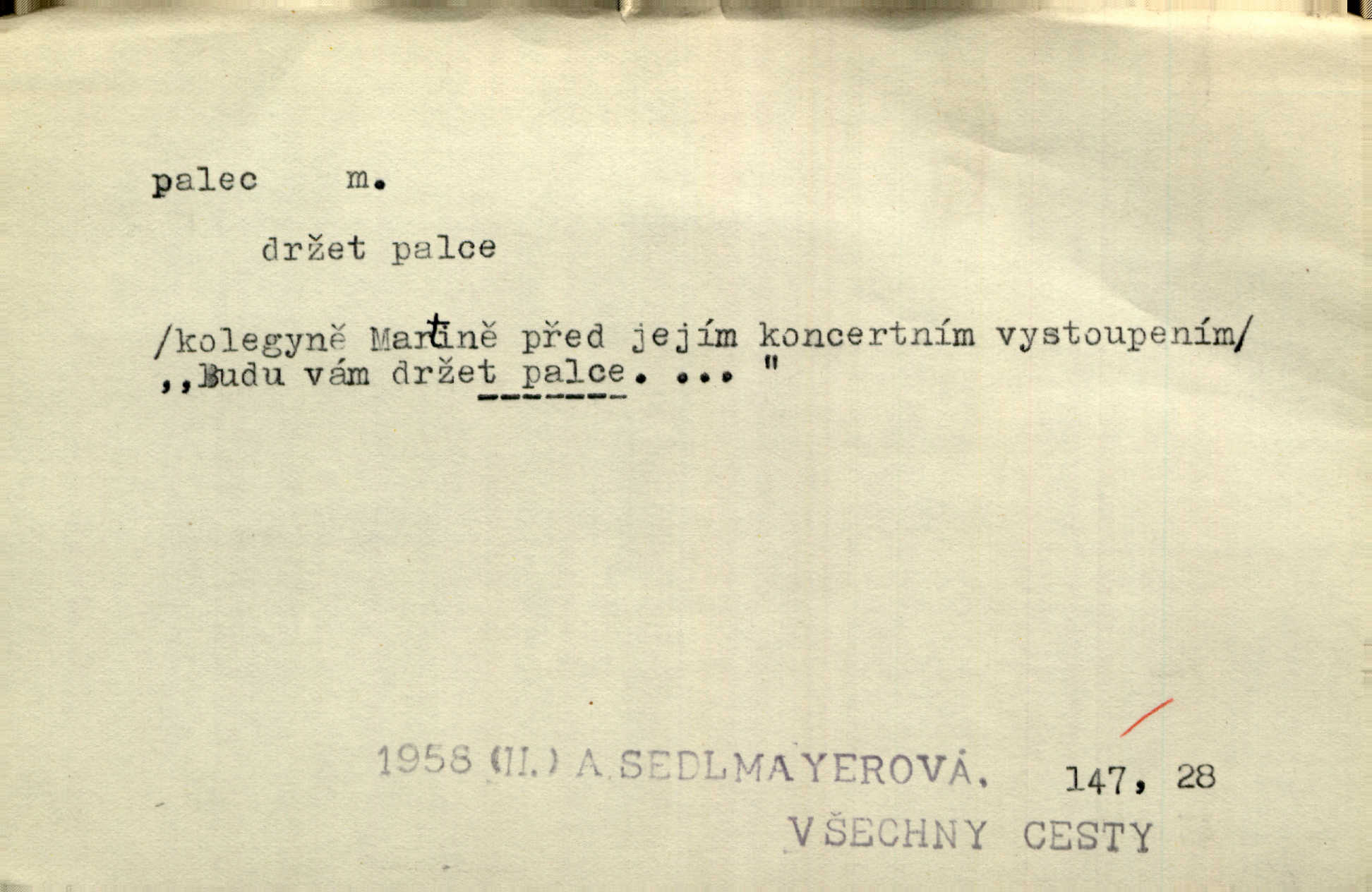 - palec, -lce m. nejsilnější prst u ruky n. nohy. [Babice] měla u pravé ruky tak široký palec, že jí celou dlaň zakrýval. Erb. Z boty vykukoval palec. Paleč. Chlapec jako palec utíkal Běláčkovi naproti maličký. Baar. Ještě dnes večer učiním mu nabídnutí k sňatku, strýče, a tu bych tě velice prosila, abys mi držel palec přál dobré pořízení mysle na mne! Čap. Ch. Nejen rakouské soudy, také státní zastupitelstvo drželo vždy policii a policajtům palec bylo jim příznivé. Herrm. Lidé by sice všichni rádi měli dobrou vládu, malé daně, spravedlivost, ale ani palcem k dosažení všeho toho hnouti nechtějí nijak se přičiniti. Havl. Víš, že ti pan Měřička skoupil včera dluhy? Víte, hoši, aby ho lepší dostal pod palec do své moci, aby ho ovládl. Šlej. K úřadům se chodilo odjakživa kuchyní do kanceláře a také sládek Krocín podmazával pánům palce podplácel je. Čečetka. Vrchní dostal asi hodně pod palec, že to [prodej panství] tak smluvil proti své vrchnosti hodný úplatek. Jir. Už jsem si včera vzpomněla, že bych pod palcem měla pro vás do Hor poslati tajně, skrytě. Šmil. [Dohazovač] vsadil všechno na kartu s Hornychem. Pod palcem měl sice také inženýrovu kartu… v záloze. Jah. D část rukavice kryjící palec. Rukavičky měly jen palce a žádných prstův. Krás. D stará délková míra, dosud běžná v anglosaských zemích, coul. Klády dvacet, čtyřiadvacet palců silné. V. Mrš. Jeník uvádí všechny granátníky své setniny jménem i jejich výšku na stopy, palce a čárky. Jir. D druh mučidla, palečnice. Španělkou, šatlavou, šibenicí, kládou a palci jí [duchovní vrchnosti] nepomůžete. Nov. D Stroj. dřevěný zub u ozubeného kola (palečného). Hosp. krátká klanice u žebřinových vozů.