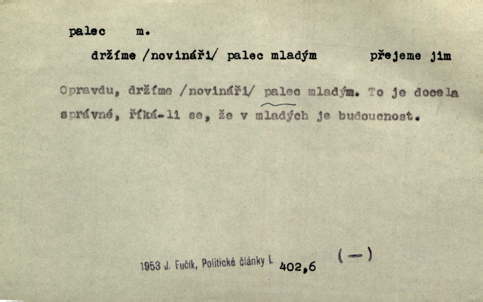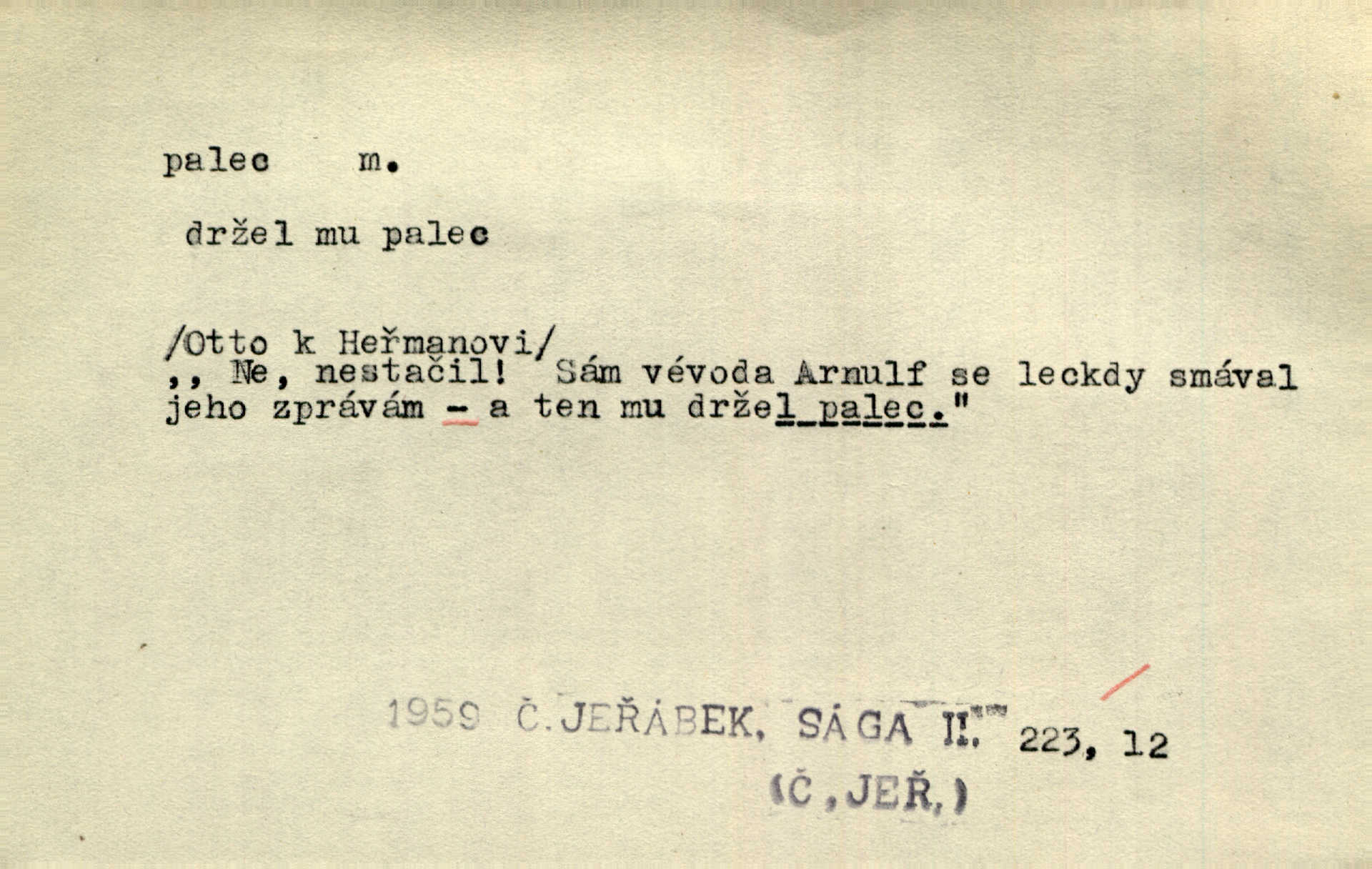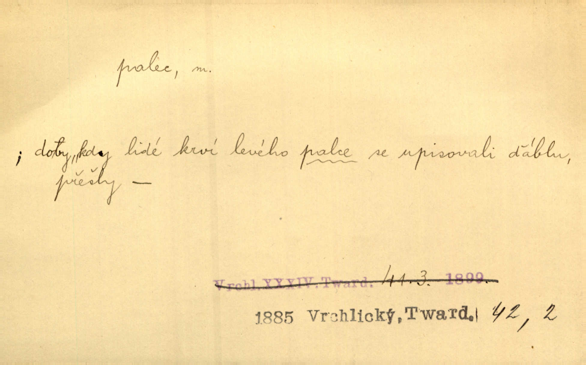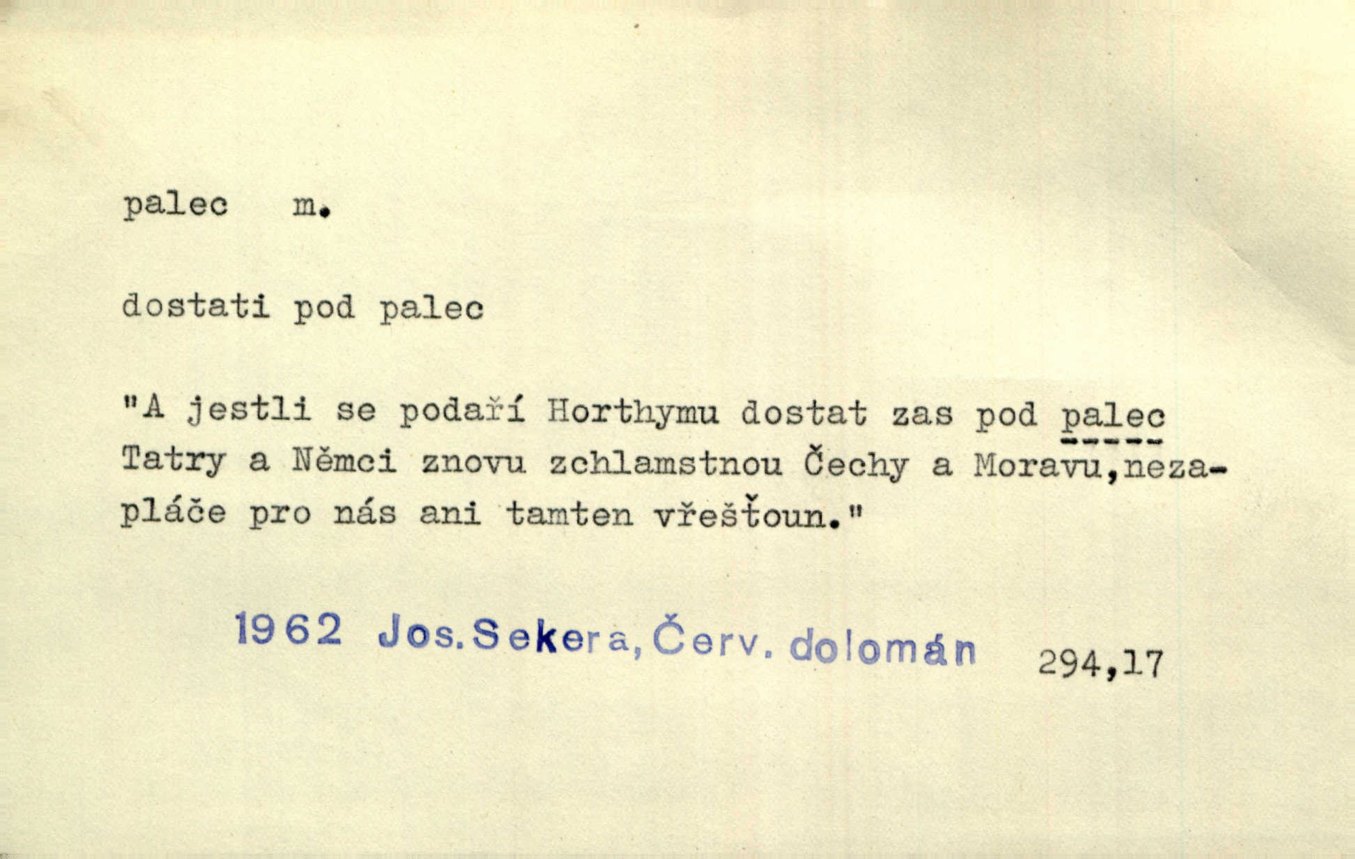 - palec, -lce m. nejsilnější prst u ruky n. nohy. [Babice] měla u pravé ruky tak široký palec, že jí celou dlaň zakrýval. Erb. Z boty vykukoval palec. Paleč. Chlapec jako palec utíkal Běláčkovi naproti maličký. Baar. Ještě dnes večer učiním mu nabídnutí k sňatku, strýče, a tu bych tě velice prosila, abys mi držel palec přál dobré pořízení mysle na mne! Čap. Ch. Nejen rakouské soudy, také státní zastupitelstvo drželo vždy policii a policajtům palec bylo jim příznivé. Herrm. Lidé by sice všichni rádi měli dobrou vládu, malé daně, spravedlivost, ale ani palcem k dosažení všeho toho hnouti nechtějí nijak se přičiniti. Havl. Víš, že ti pan Měřička skoupil včera dluhy? Víte, hoši, aby ho lepší dostal pod palec do své moci, aby ho ovládl. Šlej. K úřadům se chodilo odjakživa kuchyní do kanceláře a také sládek Krocín podmazával pánům palce podplácel je. Čečetka. Vrchní dostal asi hodně pod palec, že to [prodej panství] tak smluvil proti své vrchnosti hodný úplatek. Jir. Už jsem si včera vzpomněla, že bych pod palcem měla pro vás do Hor poslati tajně, skrytě. Šmil. [Dohazovač] vsadil všechno na kartu s Hornychem. Pod palcem měl sice také inženýrovu kartu… v záloze. Jah. D část rukavice kryjící palec. Rukavičky měly jen palce a žádných prstův. Krás. D stará délková míra, dosud běžná v anglosaských zemích, coul. Klády dvacet, čtyřiadvacet palců silné. V. Mrš. Jeník uvádí všechny granátníky své setniny jménem i jejich výšku na stopy, palce a čárky. Jir. D druh mučidla, palečnice. Španělkou, šatlavou, šibenicí, kládou a palci jí [duchovní vrchnosti] nepomůžete. Nov. D Stroj. dřevěný zub u ozubeného kola (palečného). Hosp. krátká klanice u žebřinových vozů.