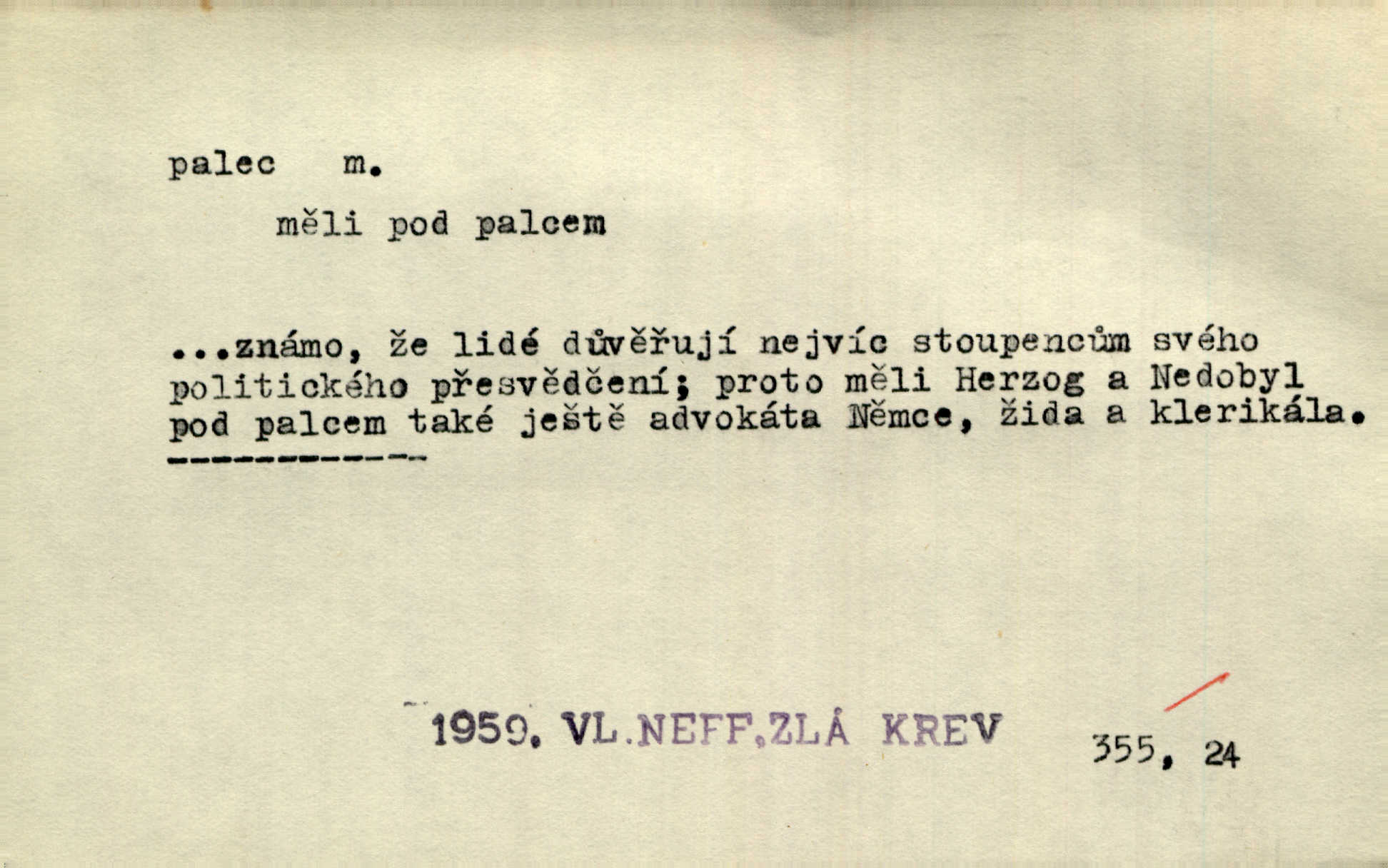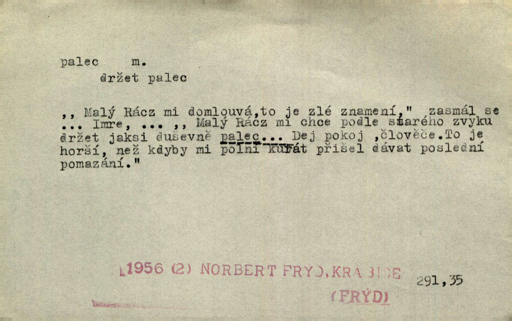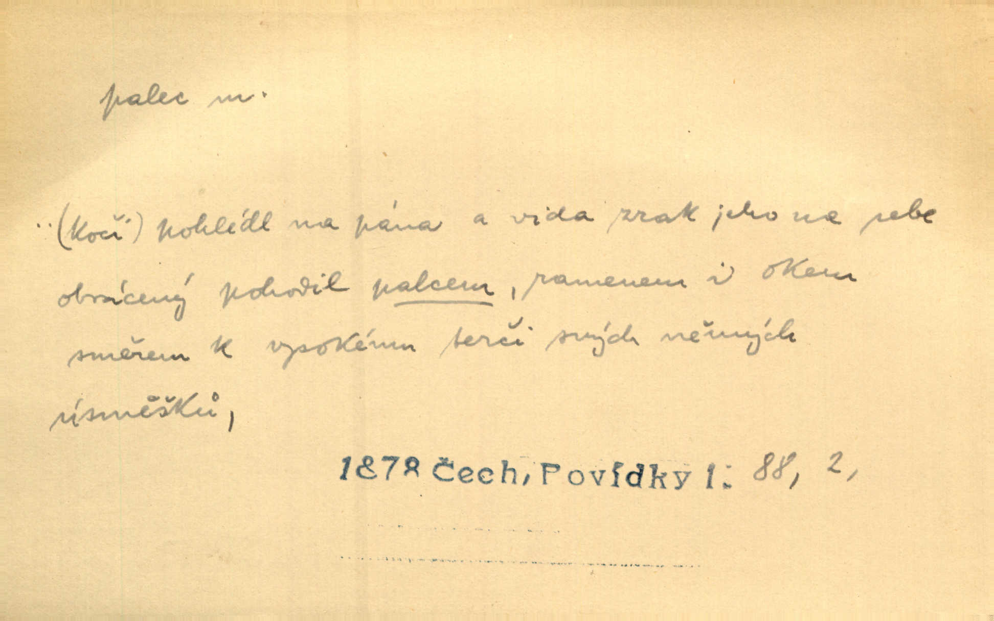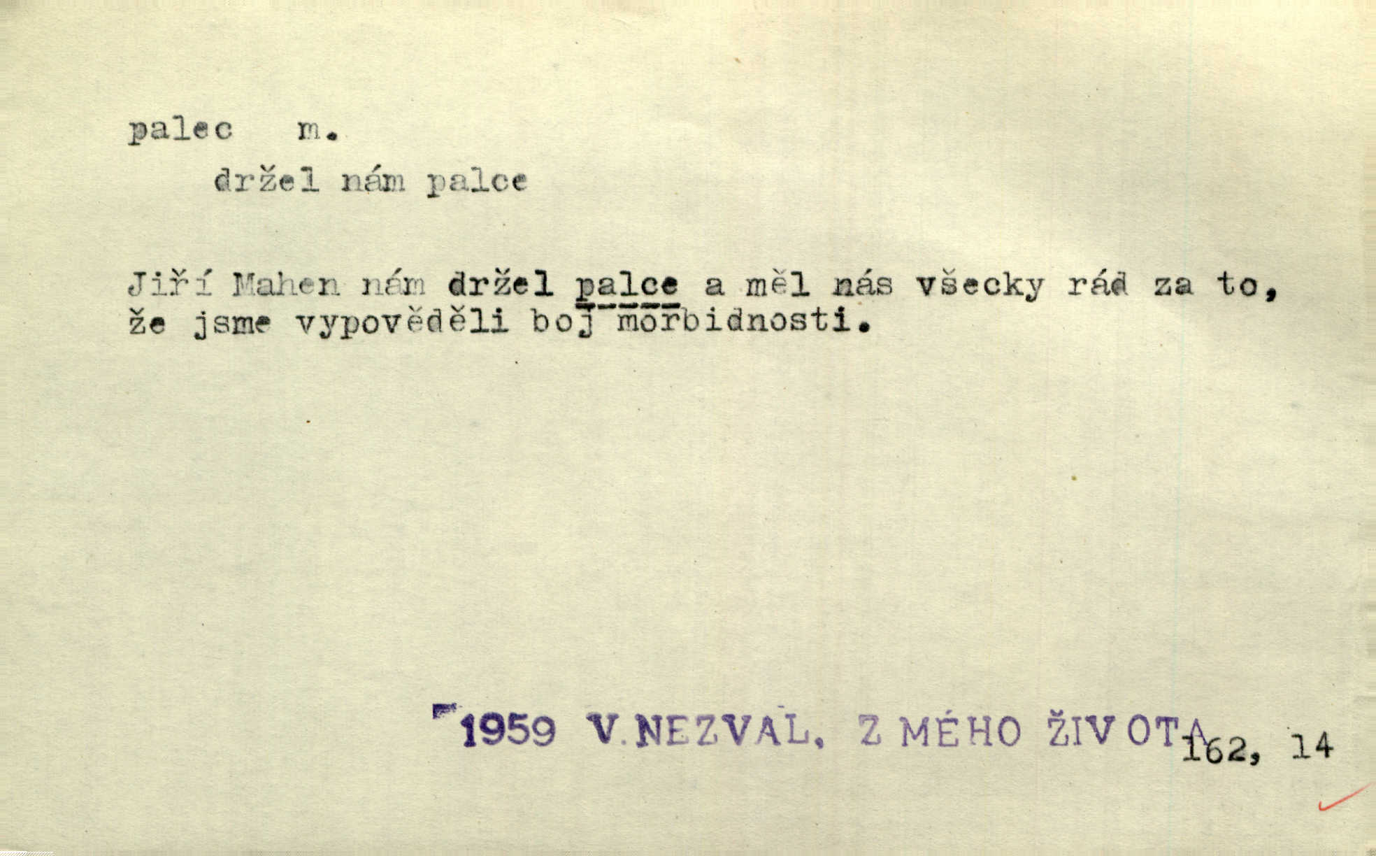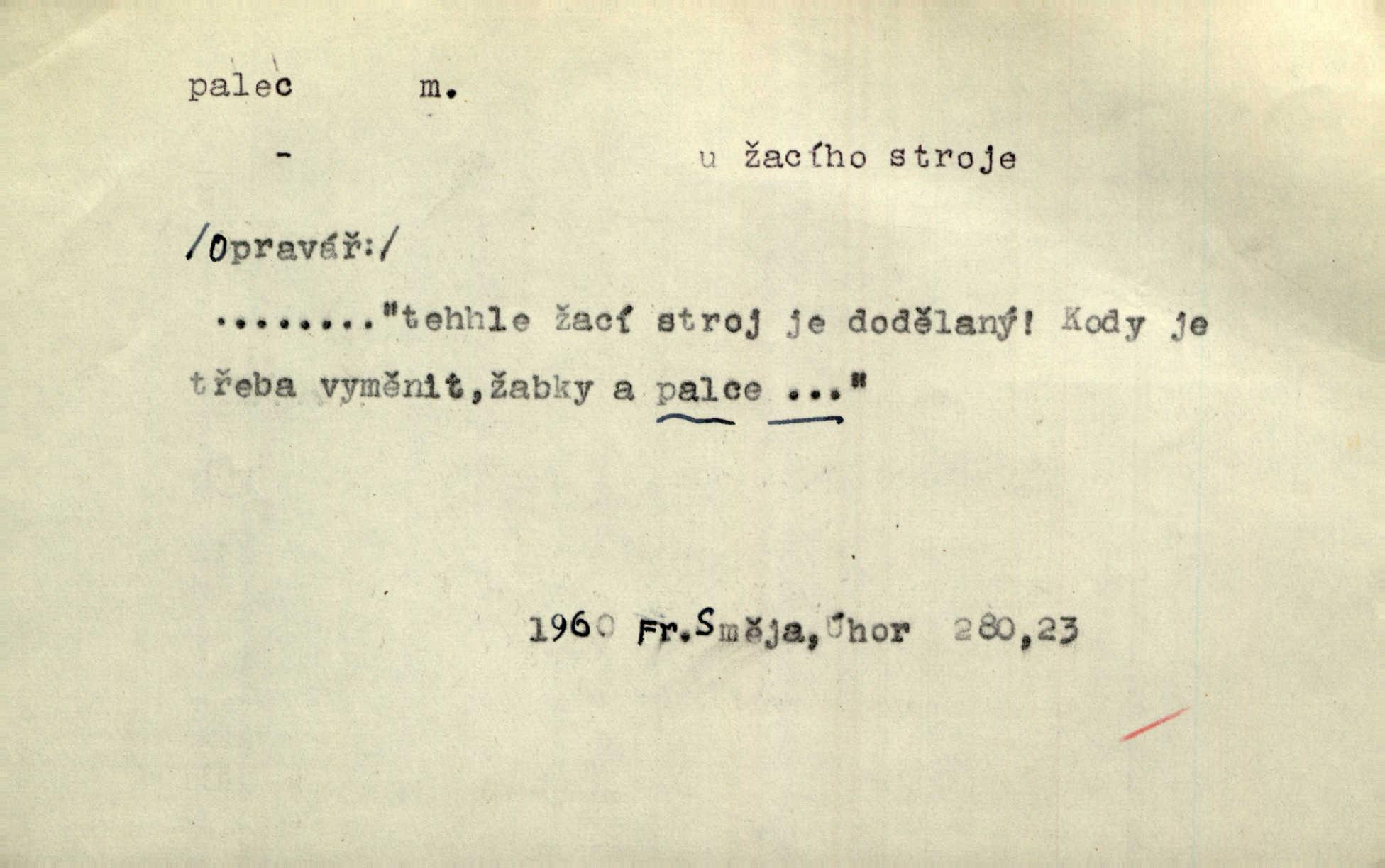 - palec, -lce m. nejsilnější prst u ruky n. nohy. [Babice] měla u pravé ruky tak široký palec, že jí celou dlaň zakrýval. Erb. Z boty vykukoval palec. Paleč. Chlapec jako palec utíkal Běláčkovi naproti maličký. Baar. Ještě dnes večer učiním mu nabídnutí k sňatku, strýče, a tu bych tě velice prosila, abys mi držel palec přál dobré pořízení mysle na mne! Čap. Ch. Nejen rakouské soudy, také státní zastupitelstvo drželo vždy policii a policajtům palec bylo jim příznivé. Herrm. Lidé by sice všichni rádi měli dobrou vládu, malé daně, spravedlivost, ale ani palcem k dosažení všeho toho hnouti nechtějí nijak se přičiniti. Havl. Víš, že ti pan Měřička skoupil včera dluhy? Víte, hoši, aby ho lepší dostal pod palec do své moci, aby ho ovládl. Šlej. K úřadům se chodilo odjakživa kuchyní do kanceláře a také sládek Krocín podmazával pánům palce podplácel je. Čečetka. Vrchní dostal asi hodně pod palec, že to [prodej panství] tak smluvil proti své vrchnosti hodný úplatek. Jir. Už jsem si včera vzpomněla, že bych pod palcem měla pro vás do Hor poslati tajně, skrytě. Šmil. [Dohazovač] vsadil všechno na kartu s Hornychem. Pod palcem měl sice také inženýrovu kartu… v záloze. Jah. D část rukavice kryjící palec. Rukavičky měly jen palce a žádných prstův. Krás. D stará délková míra, dosud běžná v anglosaských zemích, coul. Klády dvacet, čtyřiadvacet palců silné. V. Mrš. Jeník uvádí všechny granátníky své setniny jménem i jejich výšku na stopy, palce a čárky. Jir. D druh mučidla, palečnice. Španělkou, šatlavou, šibenicí, kládou a palci jí [duchovní vrchnosti] nepomůžete. Nov. D Stroj. dřevěný zub u ozubeného kola (palečného). Hosp. krátká klanice u žebřinových vozů.