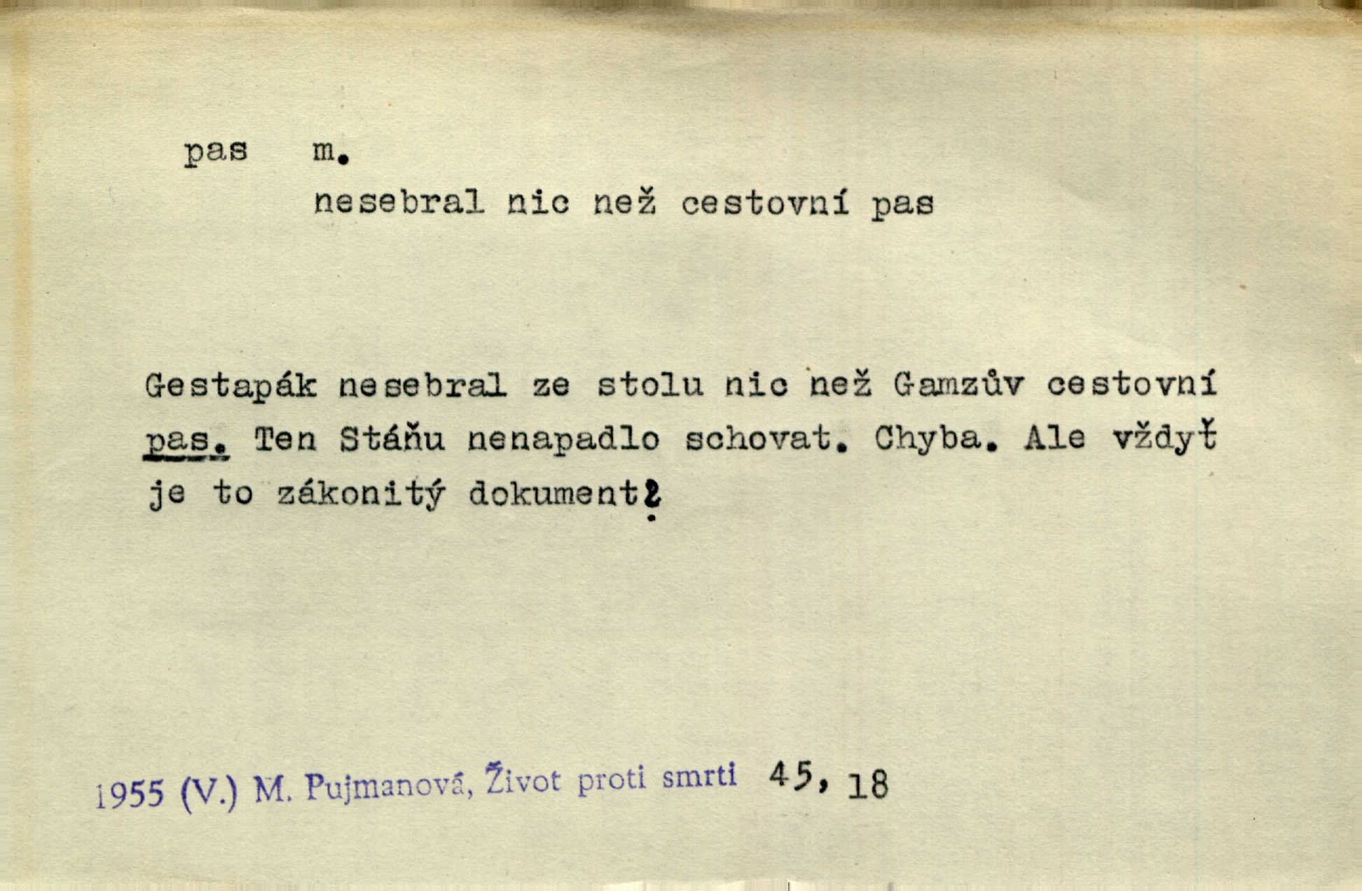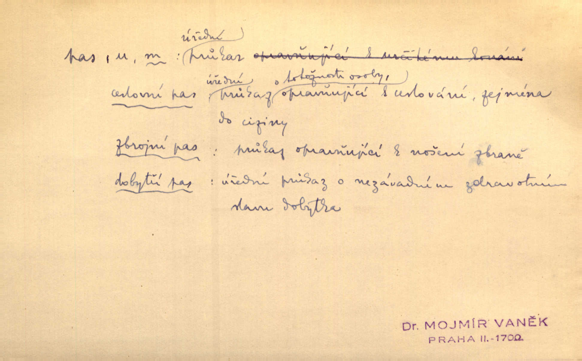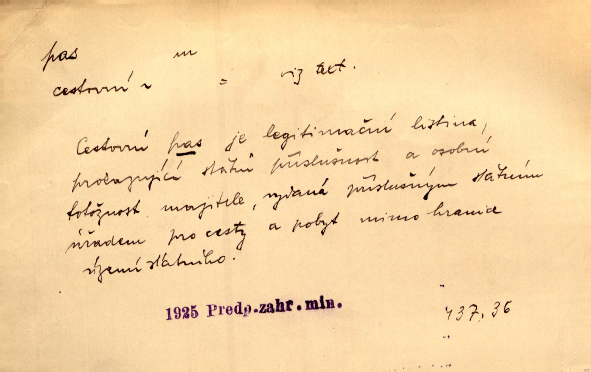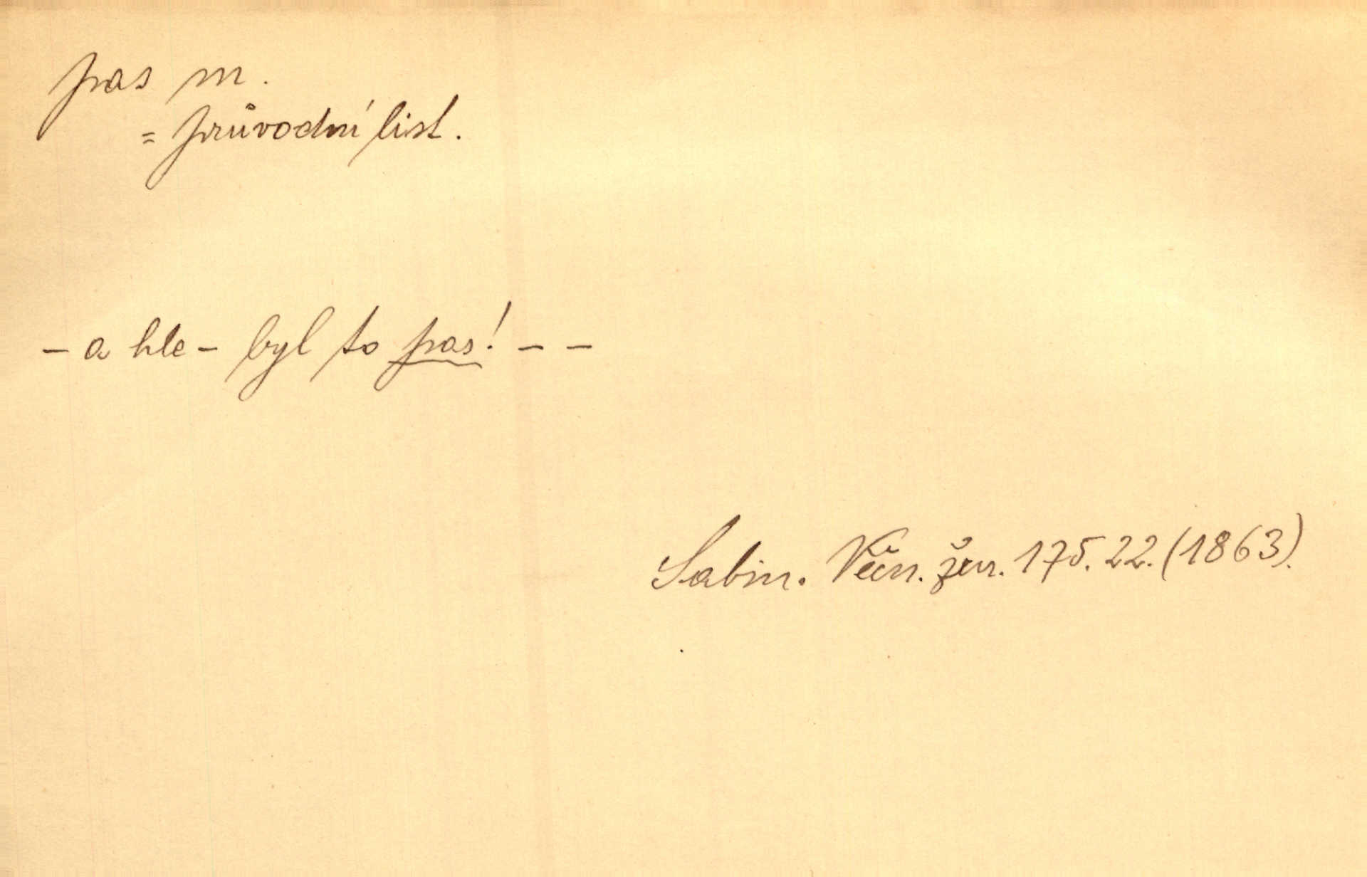 - pas, -u m. 1. úřední průkaz. S cizím pasem vinníci prchli přes hranice. Mach. Šel tedy [sedlák] k panu správci, aby mu dal vysvědčení a pas, že půjde s prosbou ke králi. Něm. Holandský a dánský vyslanec požádali o své pasy. K. Čap. Práv. cestovní pas úřední průkaz o totožnosti osoby, opravňující k cestování, zejména do ciziny; zbrojní pas průkaz opravňující nositi zbraň; dobytčí pas průkaz o nezávadném zdravotním stavu dobytčete.