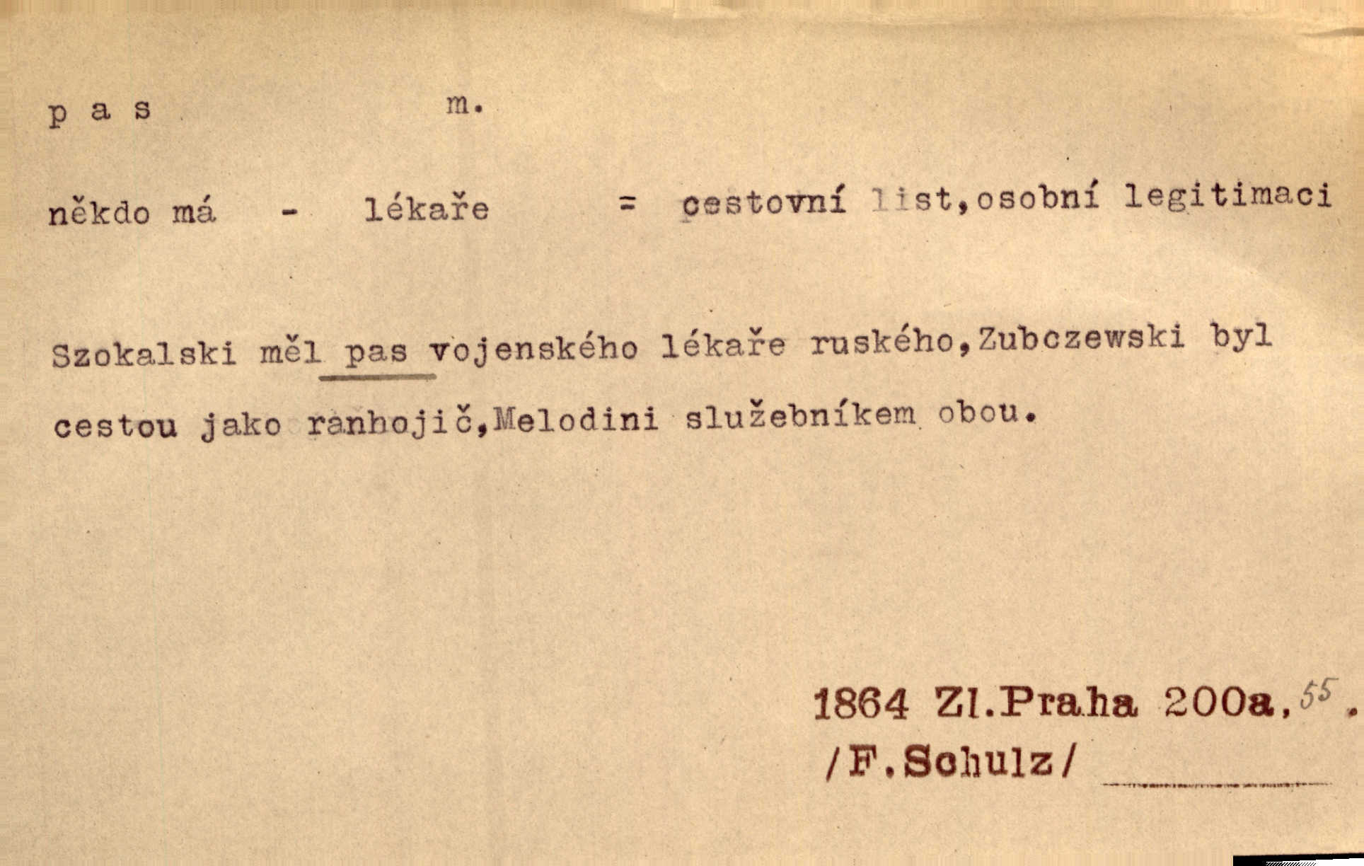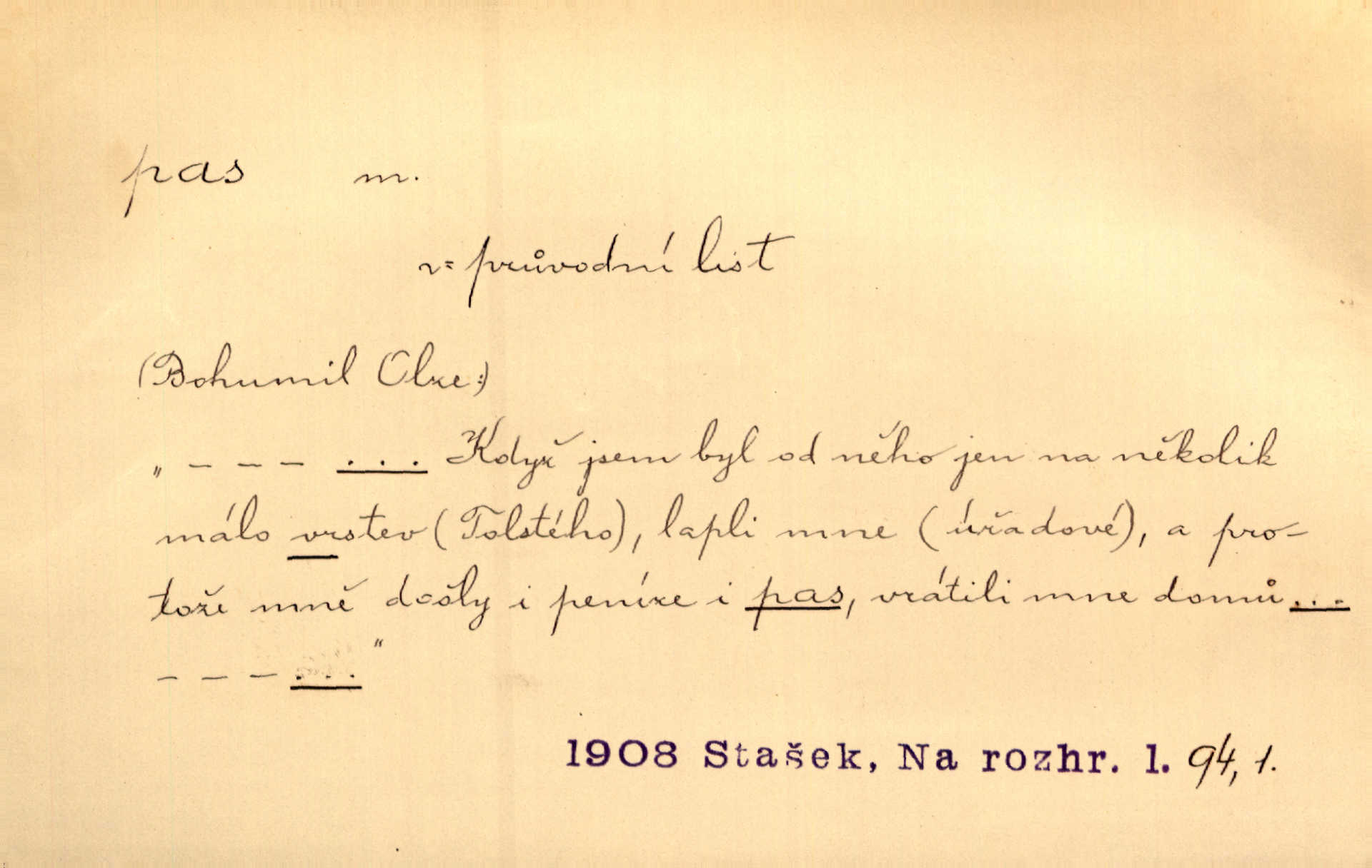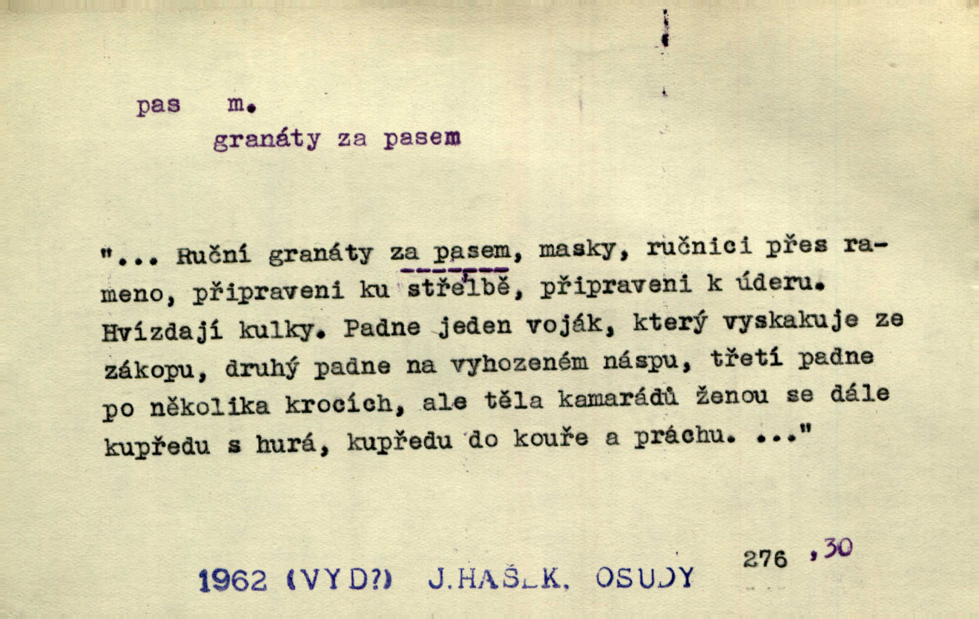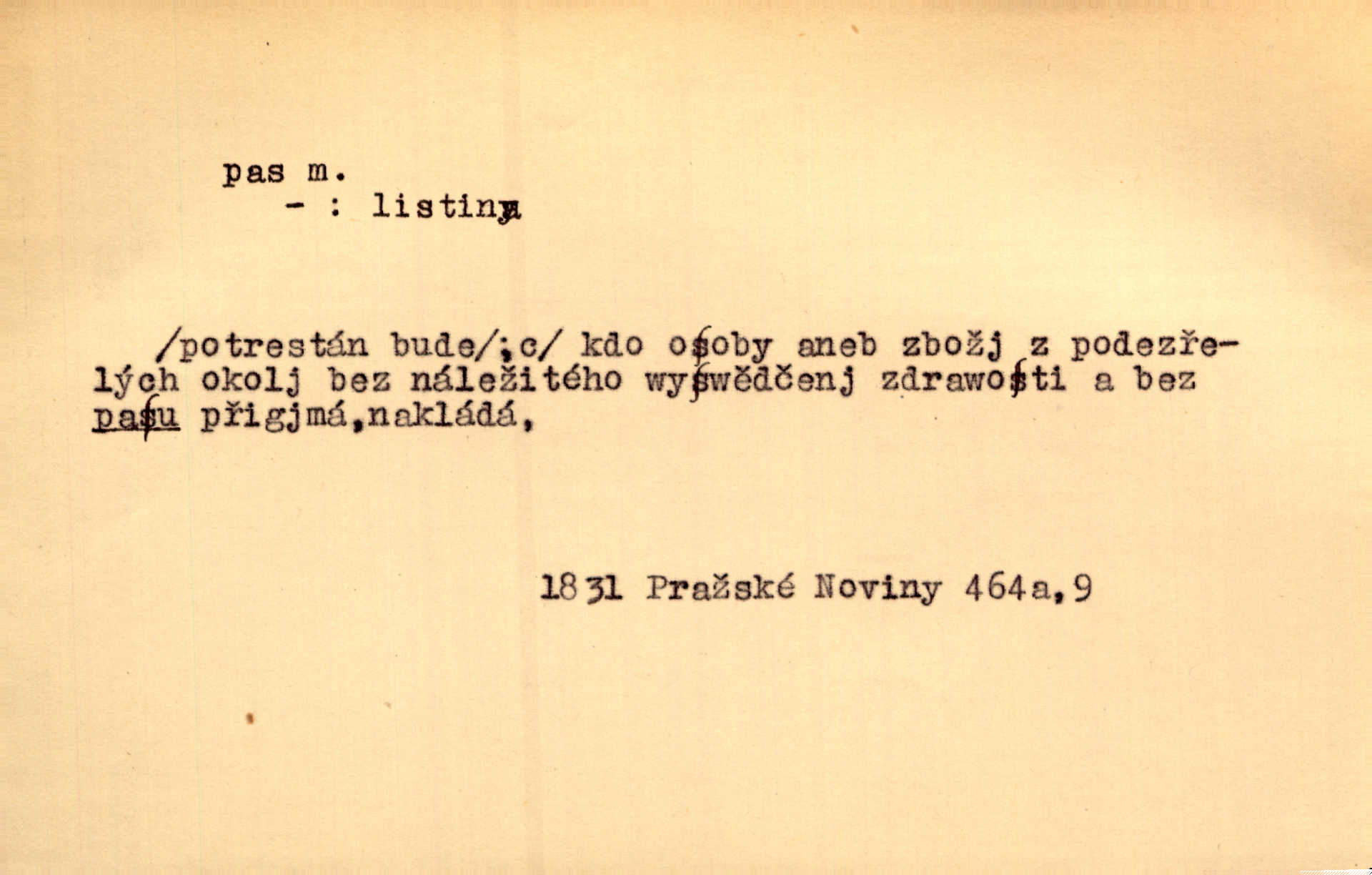 - pas, -u m. 1. úřední průkaz. S cizím pasem vinníci prchli přes hranice. Mach. Šel tedy [sedlák] k panu správci, aby mu dal vysvědčení a pas, že půjde s prosbou ke králi. Něm. Holandský a dánský vyslanec požádali o své pasy. K. Čap. Práv. cestovní pas úřední průkaz o totožnosti osoby, opravňující k cestování, zejména do ciziny; zbrojní pas průkaz opravňující nositi zbraň; dobytčí pas průkaz o nezávadném zdravotním stavu dobytčete.