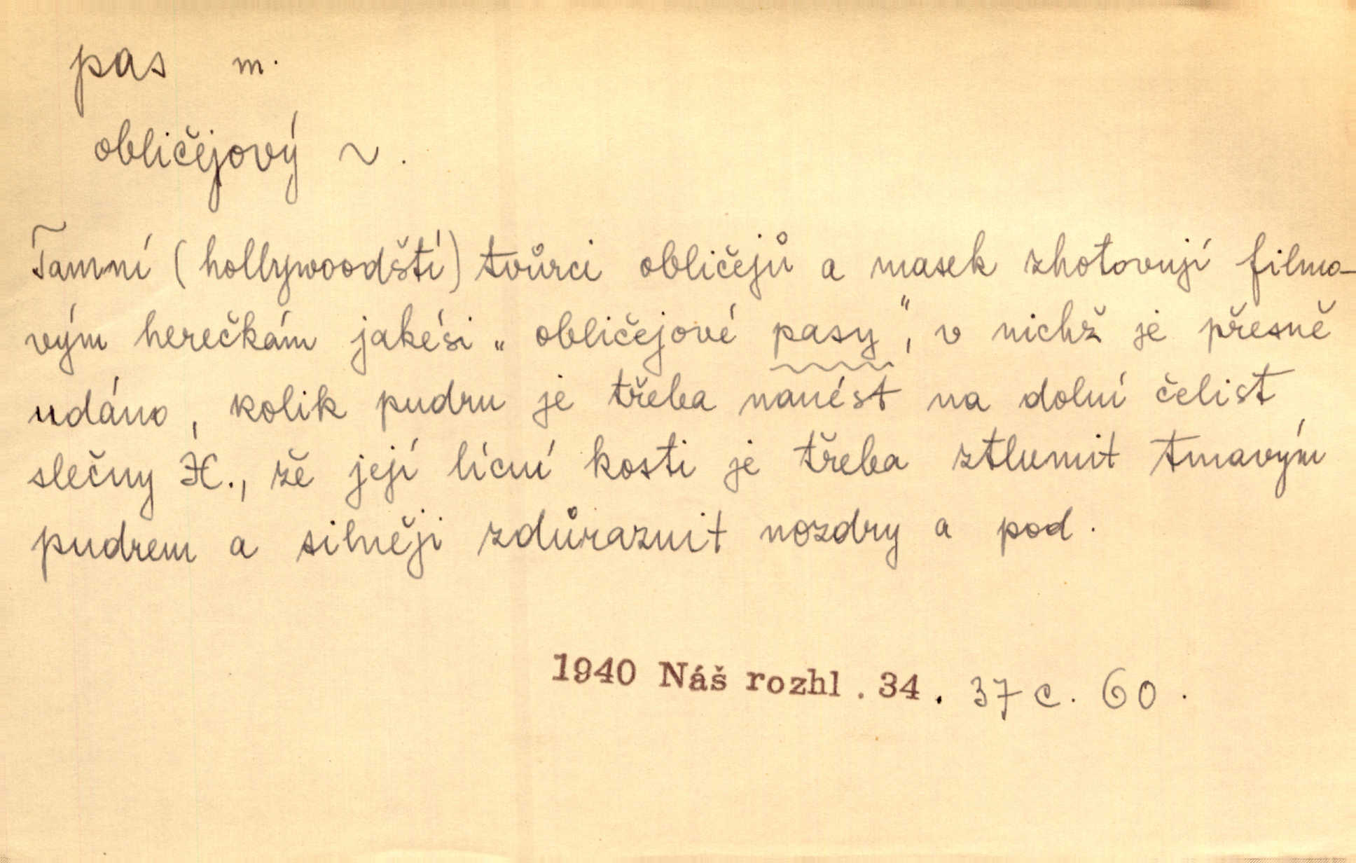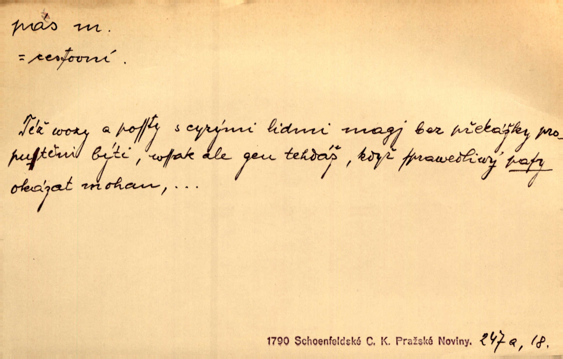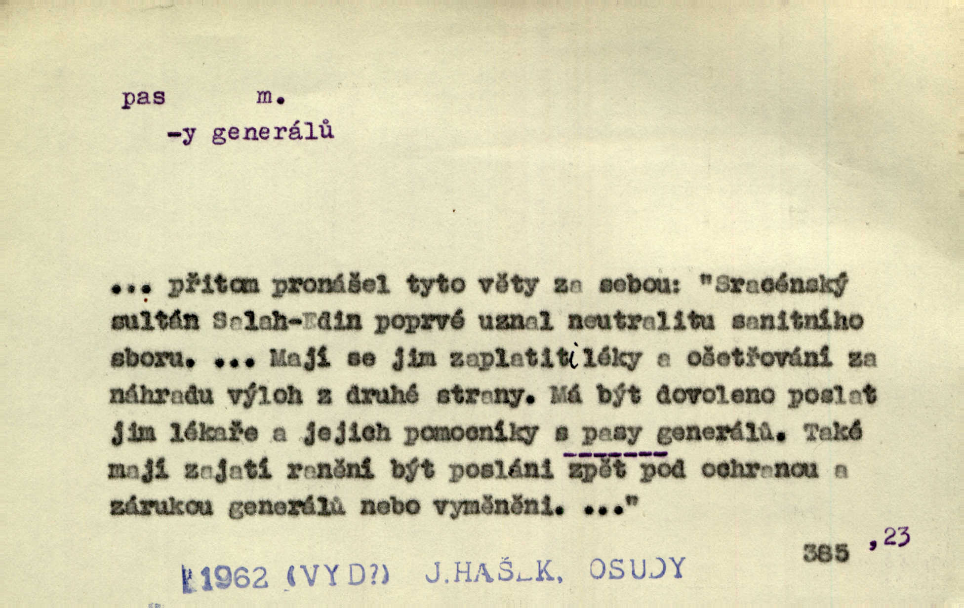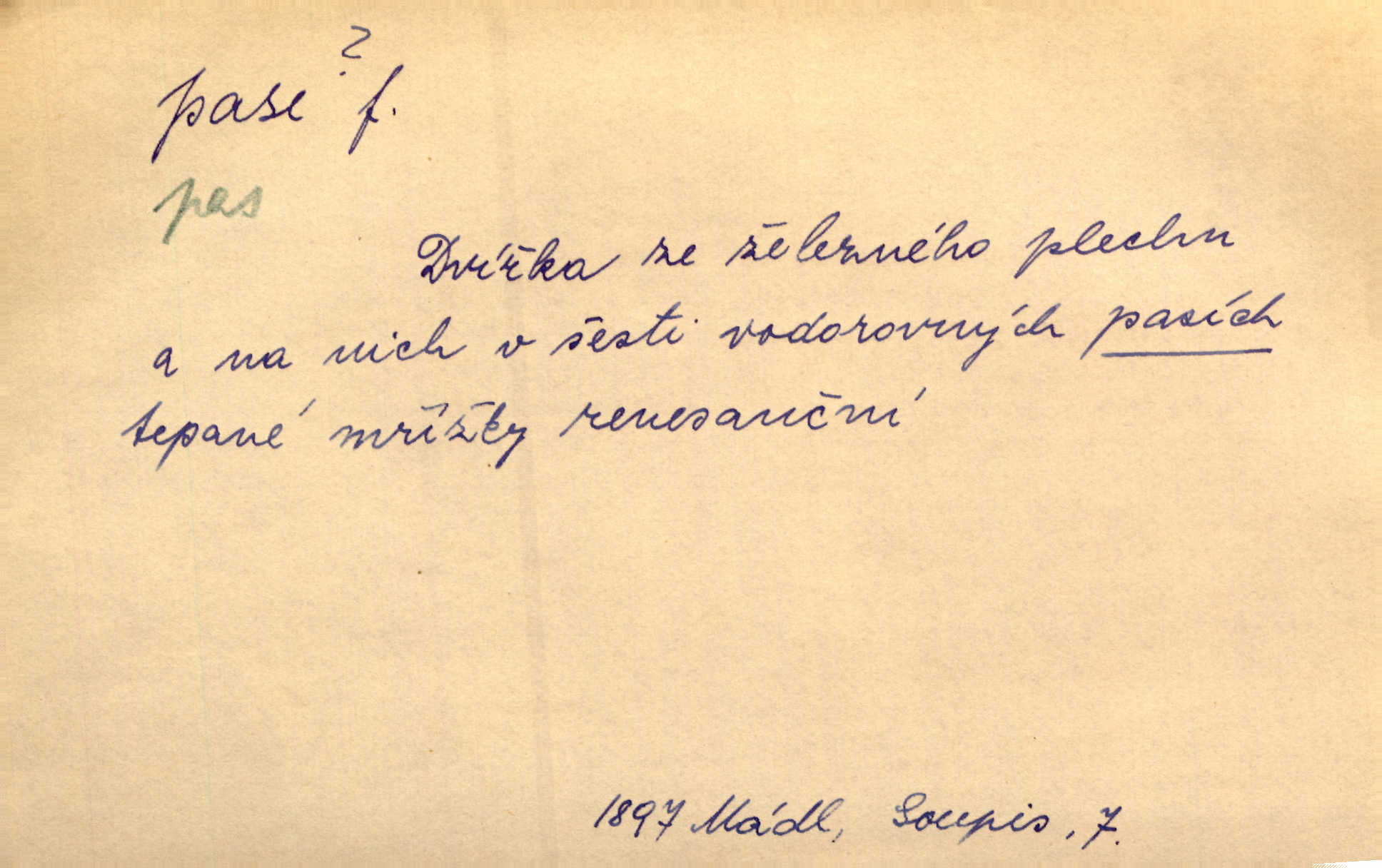 - pas, -u m. 1. úřední průkaz. S cizím pasem vinníci prchli přes hranice. Mach. Šel tedy [sedlák] k panu správci, aby mu dal vysvědčení a pas, že půjde s prosbou ke králi. Něm. Holandský a dánský vyslanec požádali o své pasy. K. Čap. Práv. cestovní pas úřední průkaz o totožnosti osoby, opravňující k cestování, zejména do ciziny; zbrojní pas průkaz opravňující nositi zbraň; dobytčí pas průkaz o nezávadném zdravotním stavu dobytčete.