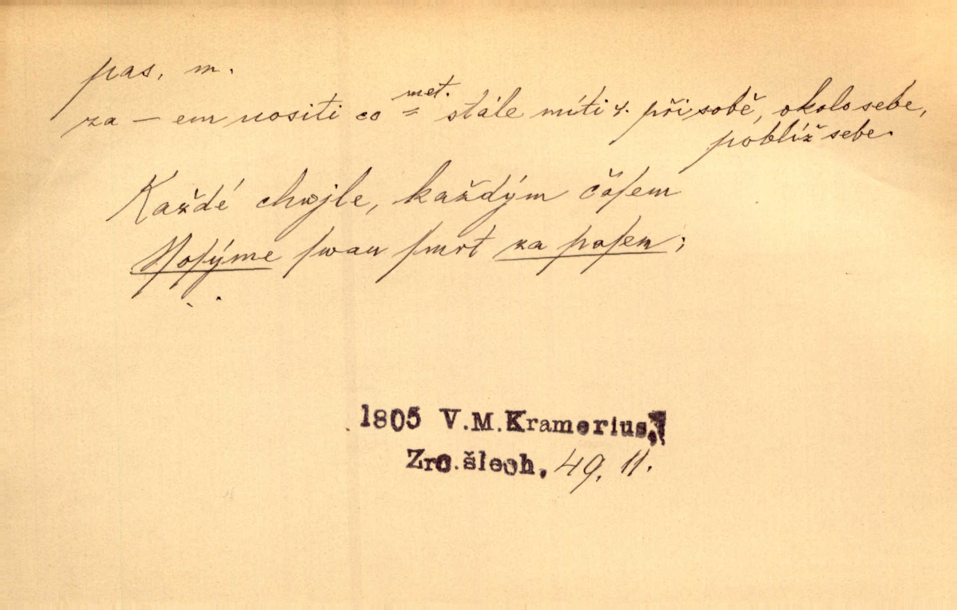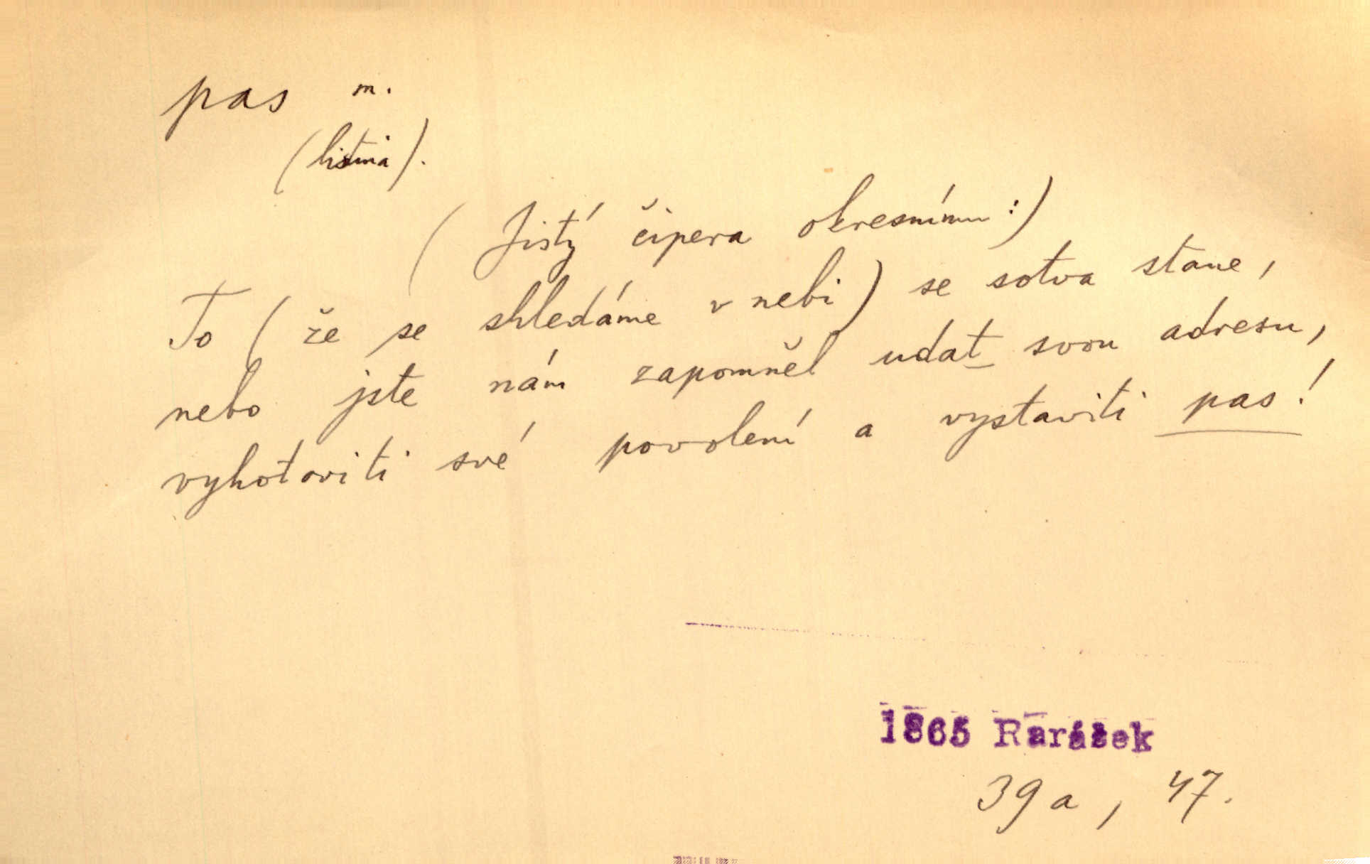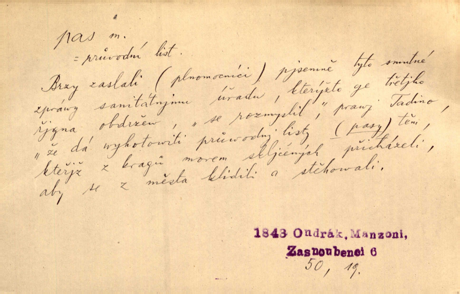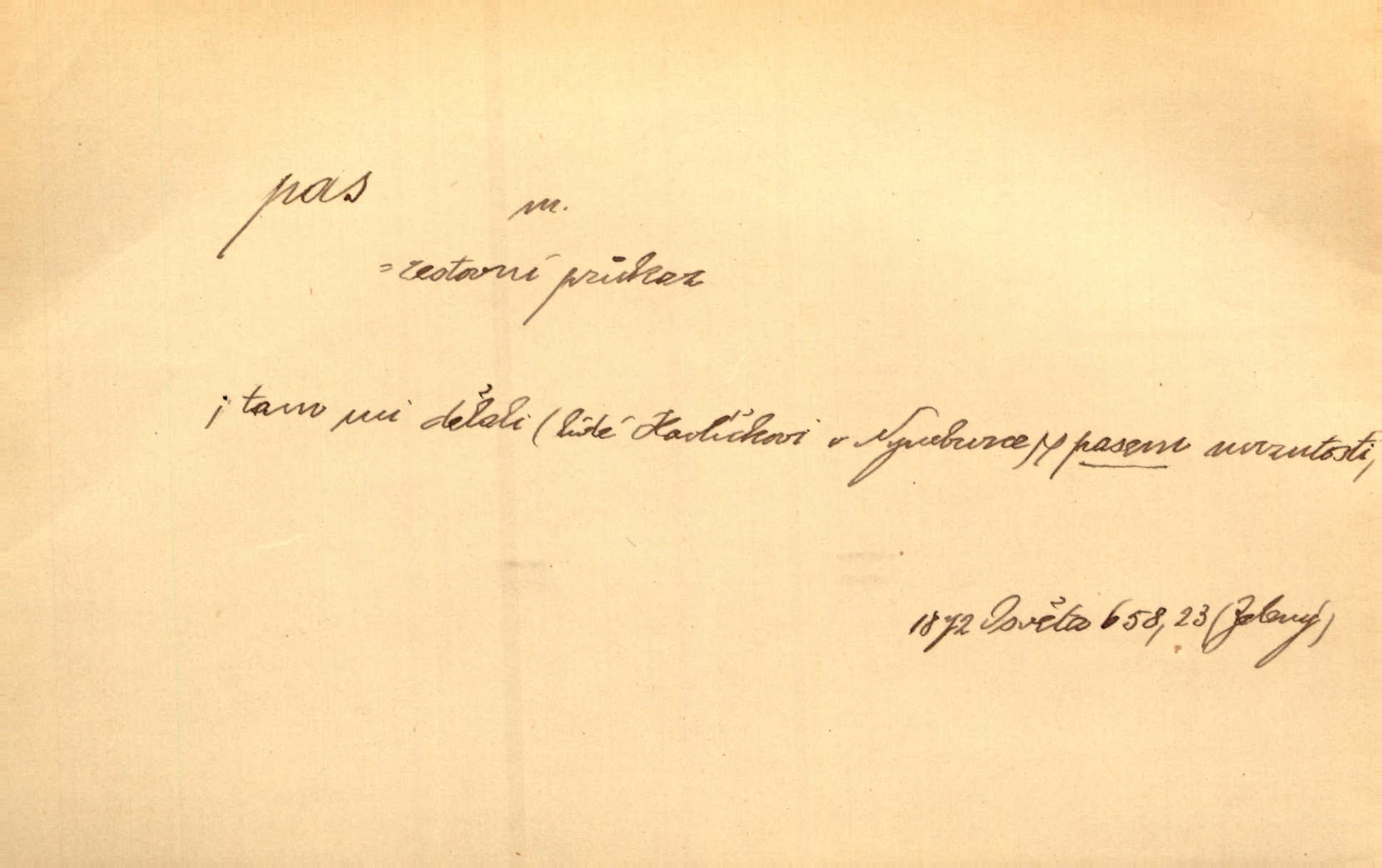 - pas, -u m. 1. úřední průkaz. S cizím pasem vinníci prchli přes hranice. Mach. Šel tedy [sedlák] k panu správci, aby mu dal vysvědčení a pas, že půjde s prosbou ke králi. Něm. Holandský a dánský vyslanec požádali o své pasy. K. Čap. Práv. cestovní pas úřední průkaz o totožnosti osoby, opravňující k cestování, zejména do ciziny; zbrojní pas průkaz opravňující nositi zbraň; dobytčí pas průkaz o nezávadném zdravotním stavu dobytčete.