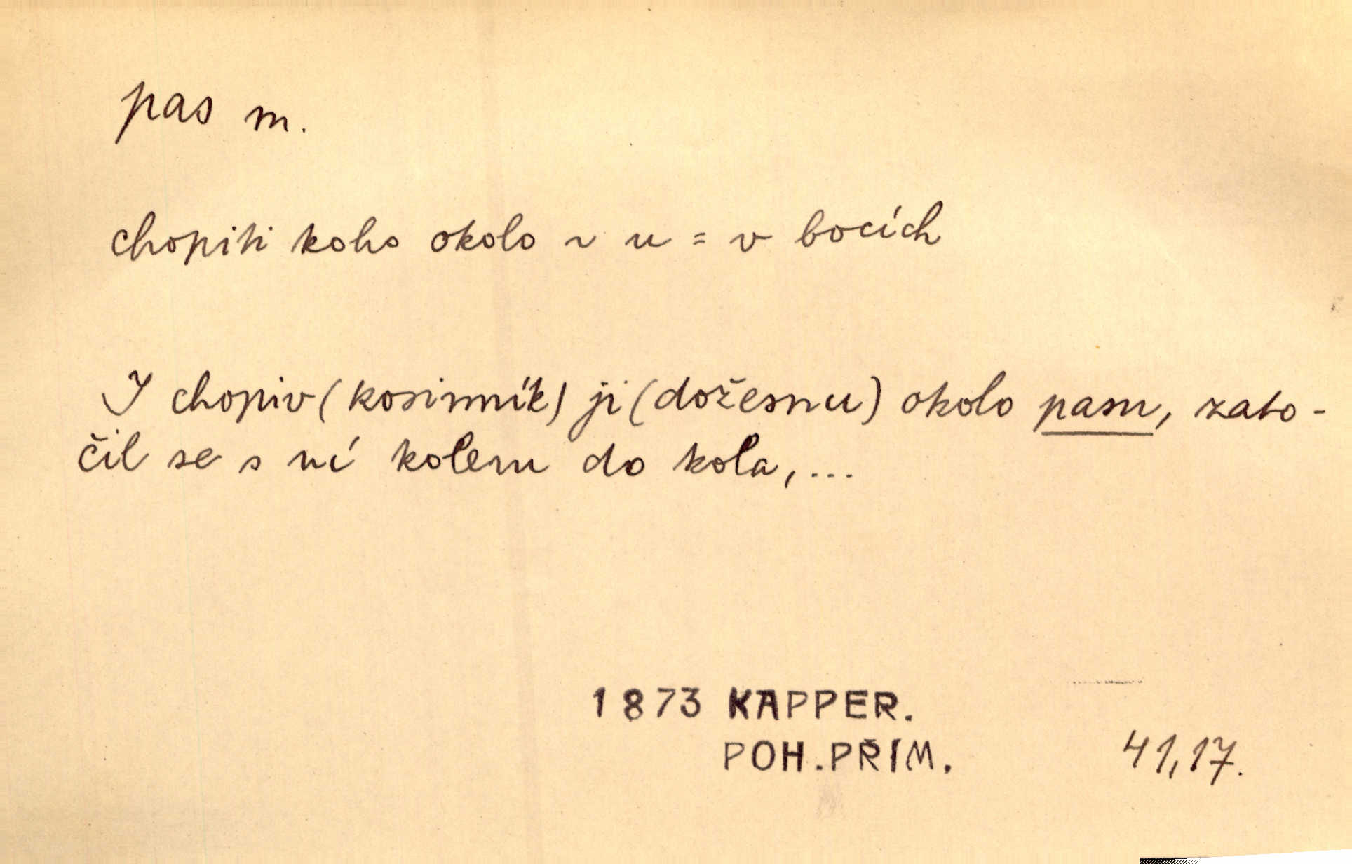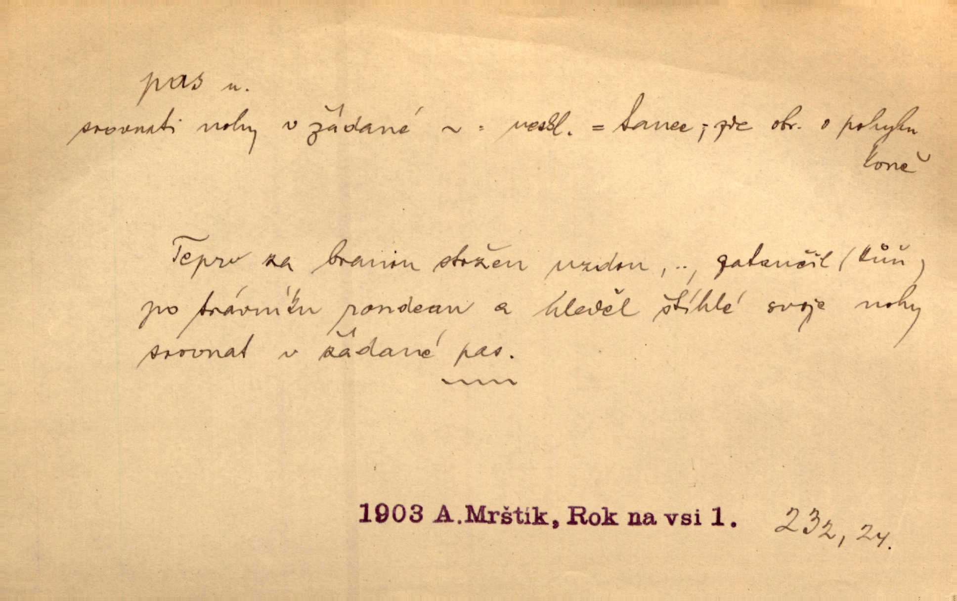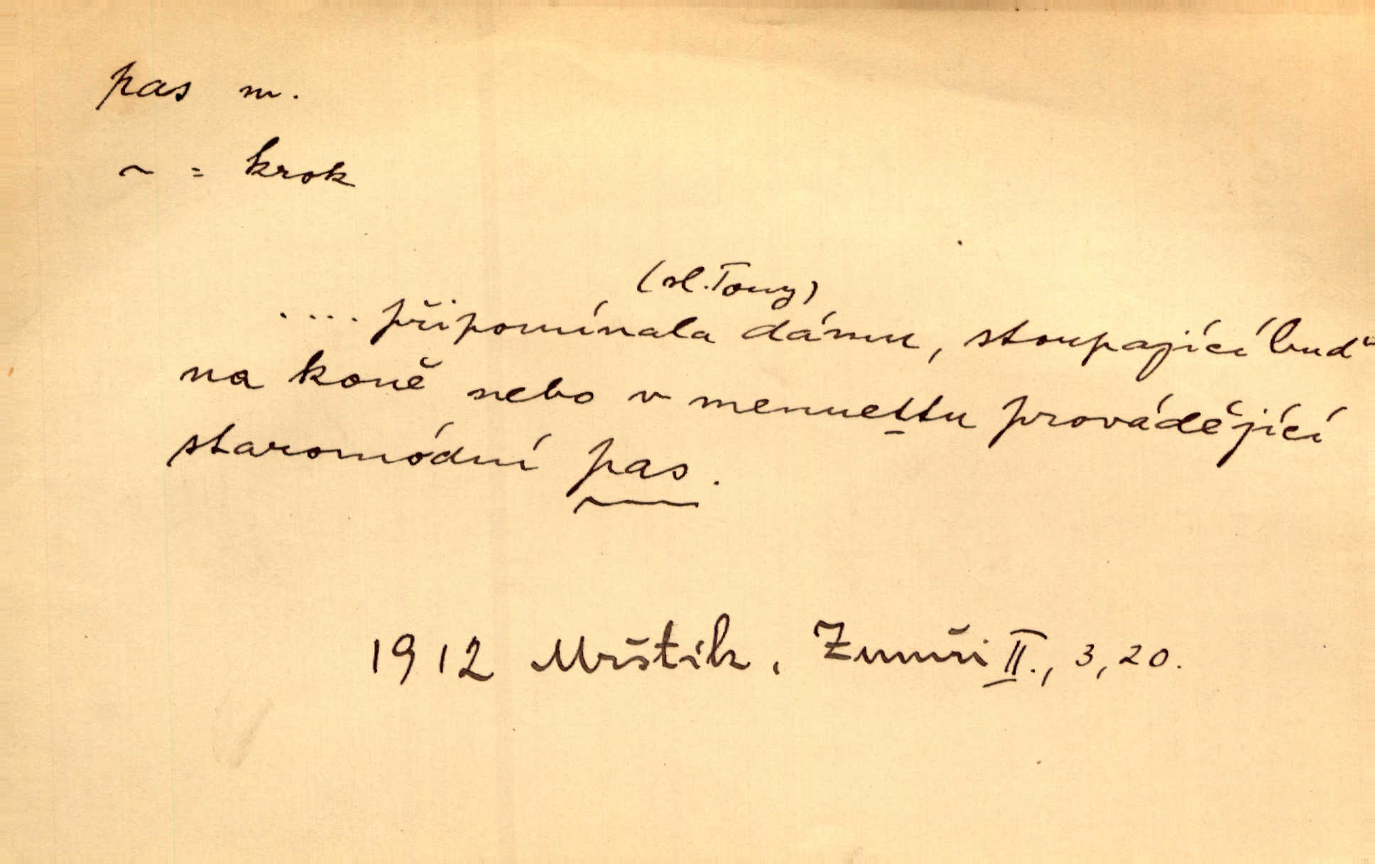 - pas (vysl. pa) n. neskl. taneční krok. Připomínala dámu, stoupající buď na koně, nebo v menuettu provádějící staromódní pas. V. Mrš.