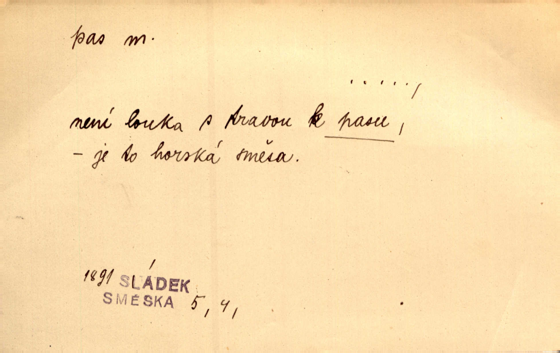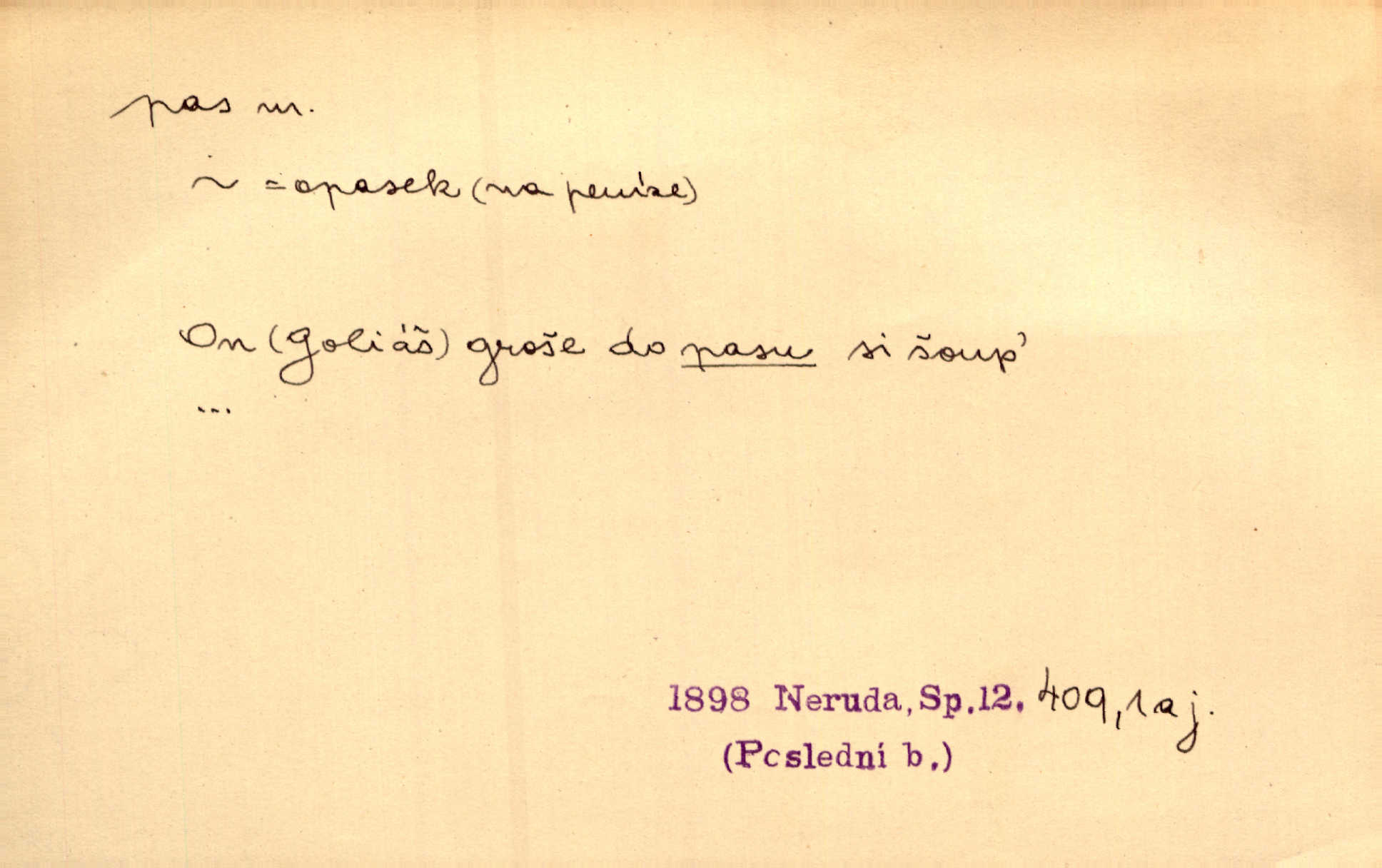 - *pas, -u m. bás. 2. pastva. Není louka s travou k pasu, — je to horská směsa. Slád.