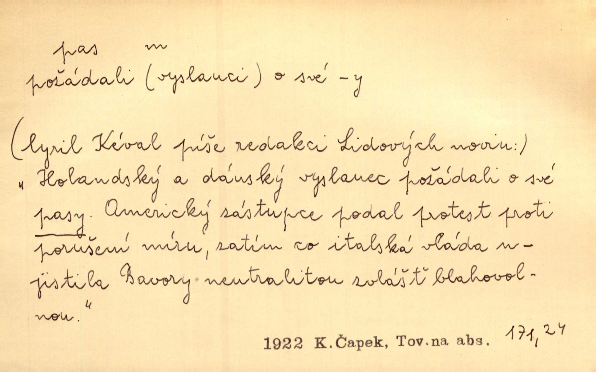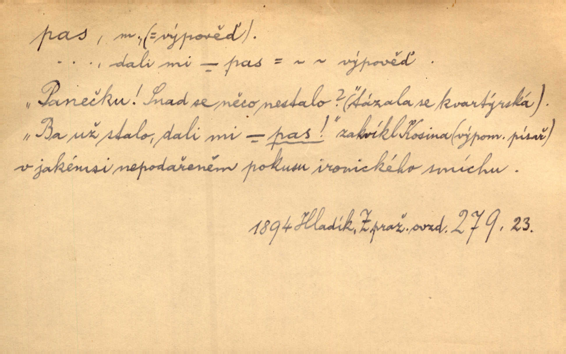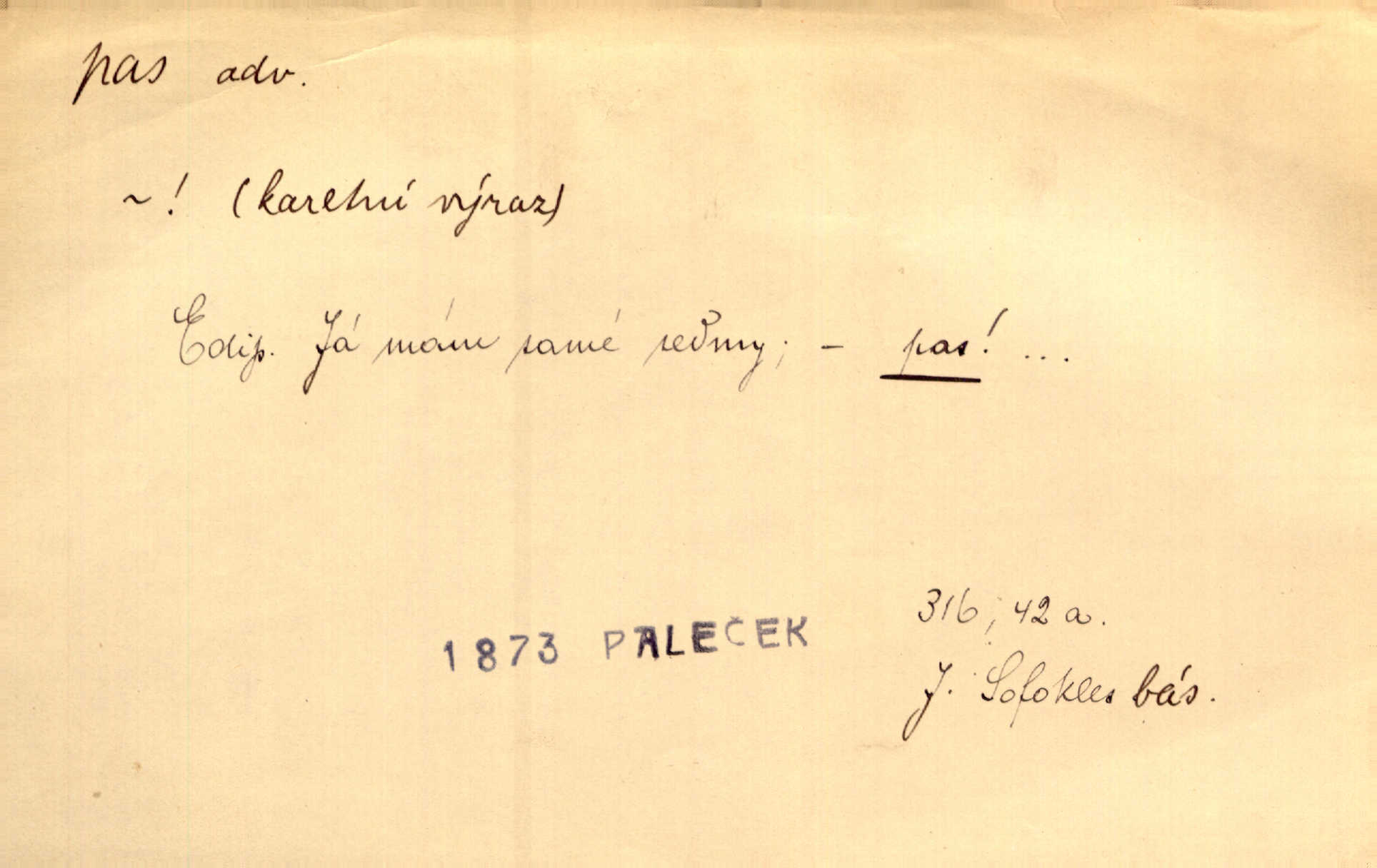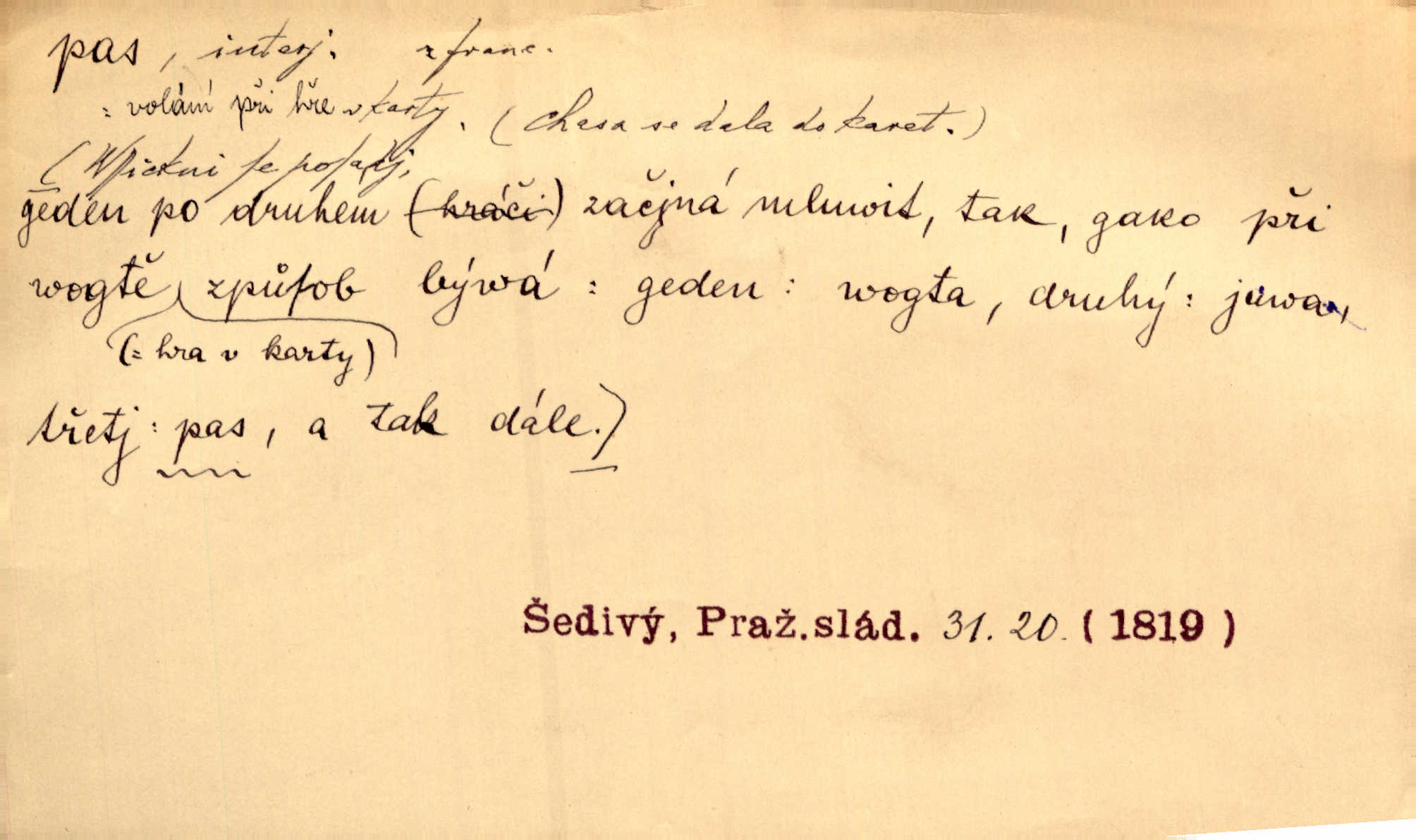- pas (ps. též pass) adv. vyjadřující při hře v karty, že se hráč neúčastní hry. Já mám samé sedmy — pas! Paleč. Dychtivě sáhl zase po kartě a praštil jí o stůl. „Pass,“ zasyčel. V. Mrš.