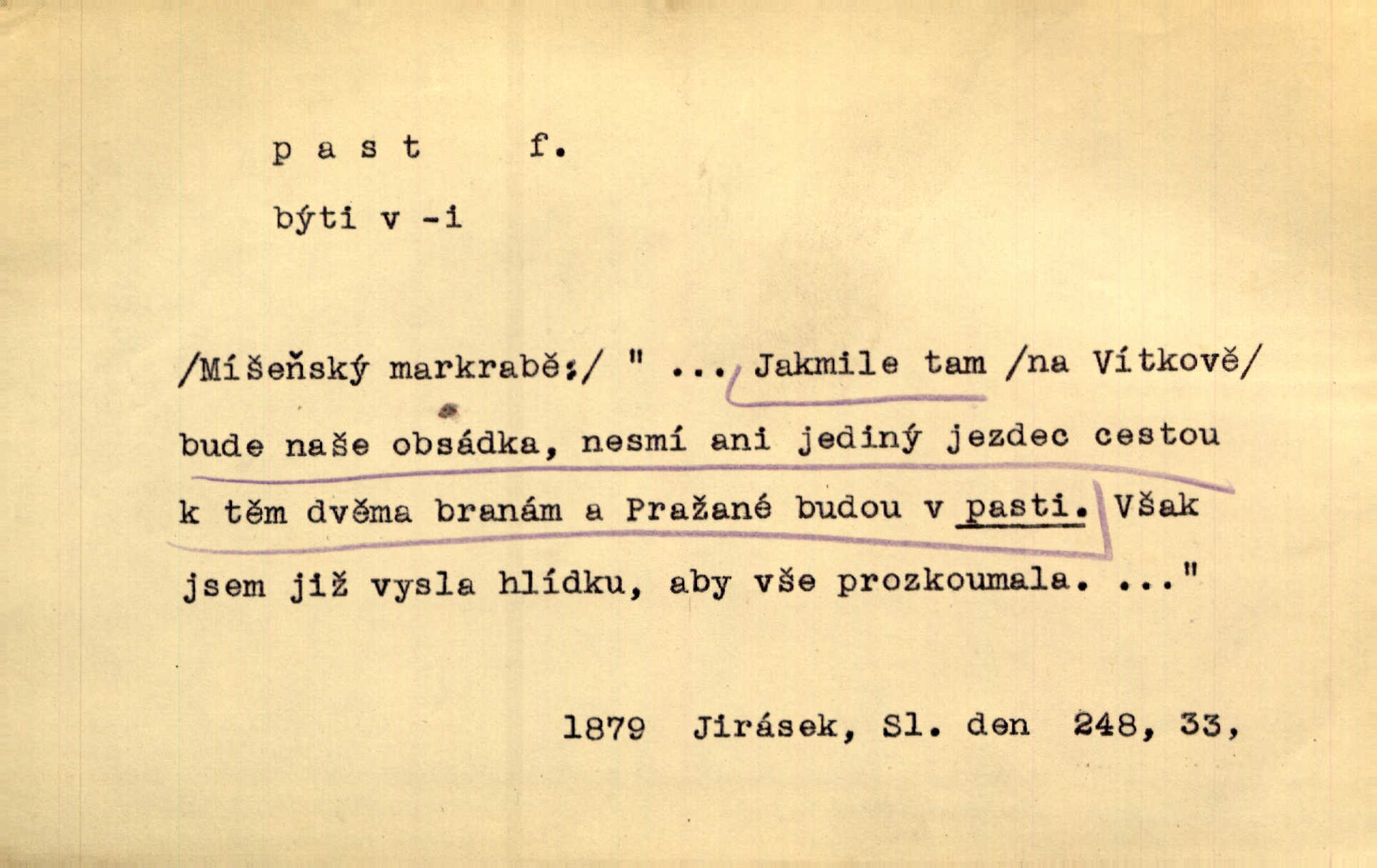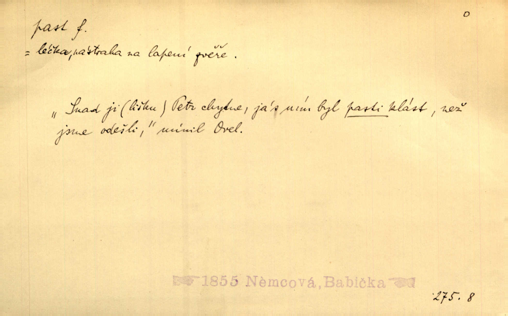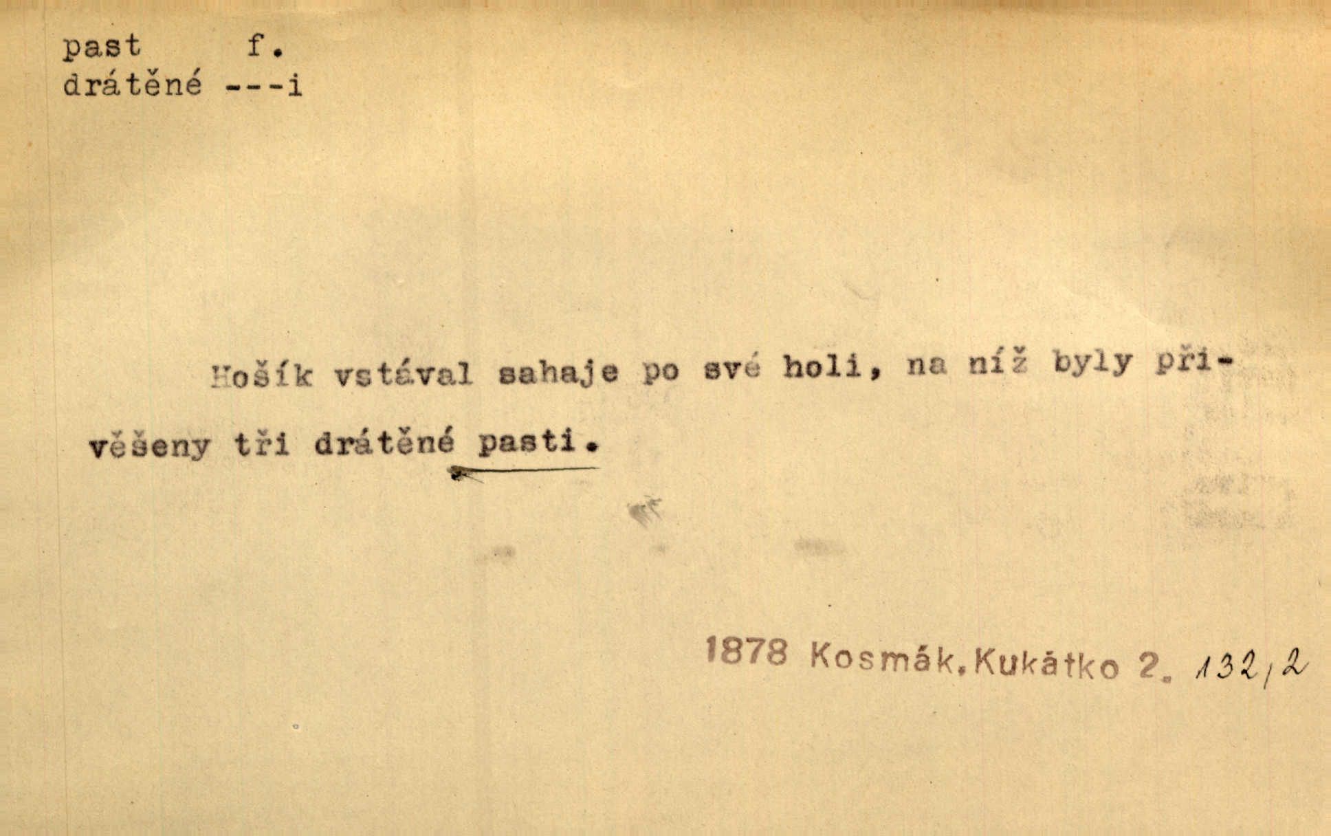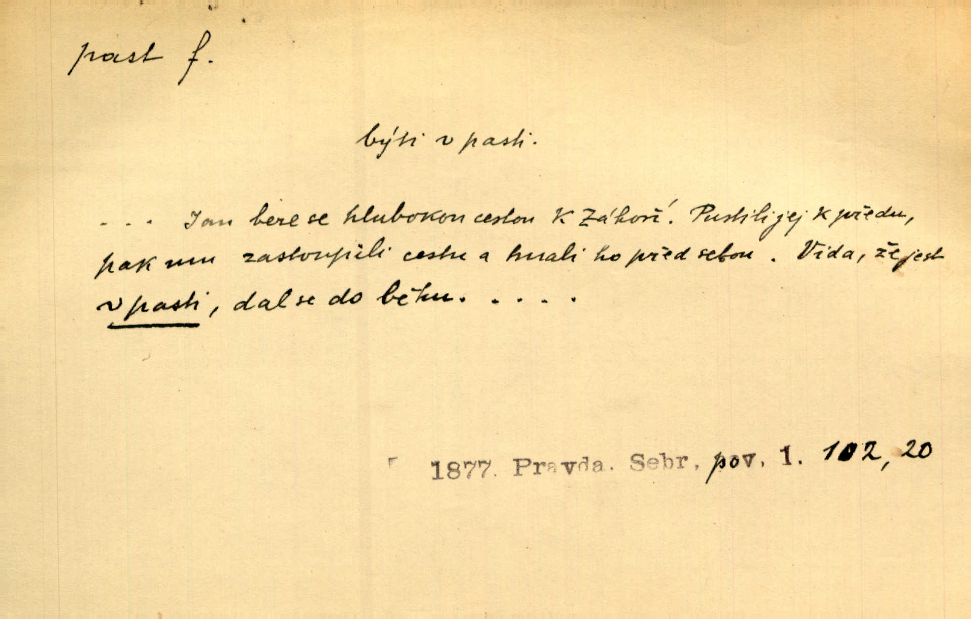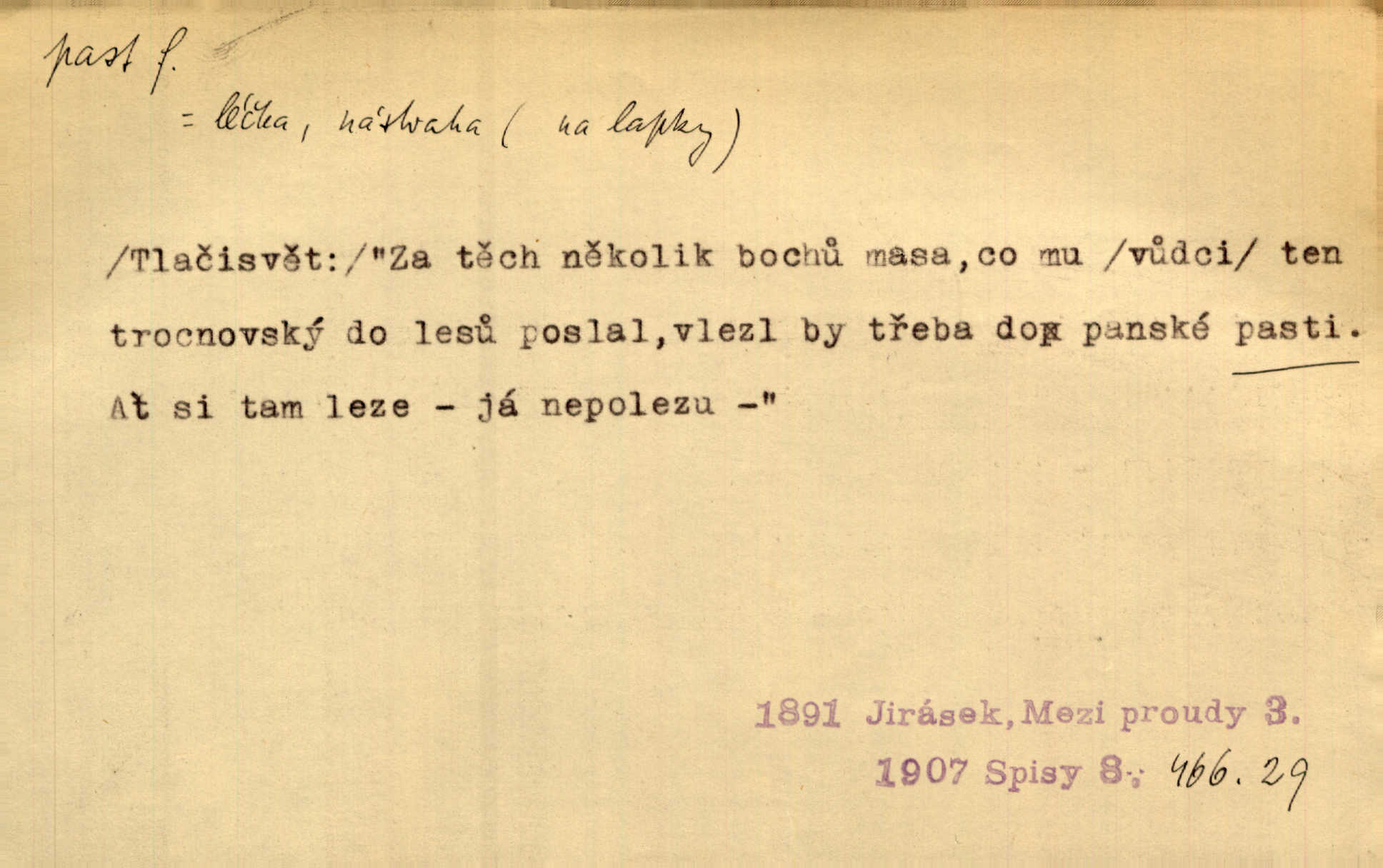 - past, -i f. zařízení k lapání škodné zvěře. Kde kdo v sousedství měl nějakou pasť na ptáky anebo na myši. Ner. Hošík vstával sahaje po své holi, na níž byly přivěšeny tři drátěné pasti. Kosm. Snad ji [lišku] chytne, já s ním byl pasti klást. Něm. Nyní chytl se [kadeřábek] jako myš v pasti podlehl nástrahám. Dyk. Světnice nízká, okénka jako do pasti malá. Rais. Huž sme kerak v pasti, vojska všudy kolem do kola obklíčeni. Jir. Hola, brachu, zle si steleš, do pasti hlavu strkáš v nebezpečí se vydáváš. Hol. Kdo se jednou v pasti přiskřípl, podruhé stěží do ní vleze byl oklamán, obelstěn. Šmil. Žert. Do té pasti manželské já nikdy nepolezu do stavu manželského. Svět. D nástraha, záloha uchystaná k zajetí, obklíčení někoho; léčka, úklad k přelstění, oklamání někoho. Jakmile tam [na Vítkově] bude naše posádka, nesmí ani jediný jezdec cestou k těm dvěma branám, a Pražané budou v pasti. Jir. Tlupa křižáků je [husity] měla v pasti. Mach. [Žižka] je sklíčen od pánů z Plzeňska a z té pasti nevyrazí. Jir. Již jsme je [podloudníky] měli zcela v pasti měli chyceny. Mož. Vida, že jest v pasti, dal se do běhu nebezpečně obklíčen. Prav. Byl to nějaký pěkný kvítek, který tu past na pátera Dominika nastrojil. Schulz. Jak jen je to možno, že jsem toho Bakulu nepronikl a vlezl mu do pasti. Hol. Strojí [intelekt] slovní pasti, aby vytvořil paradoxní slovní situace. K. Čap.