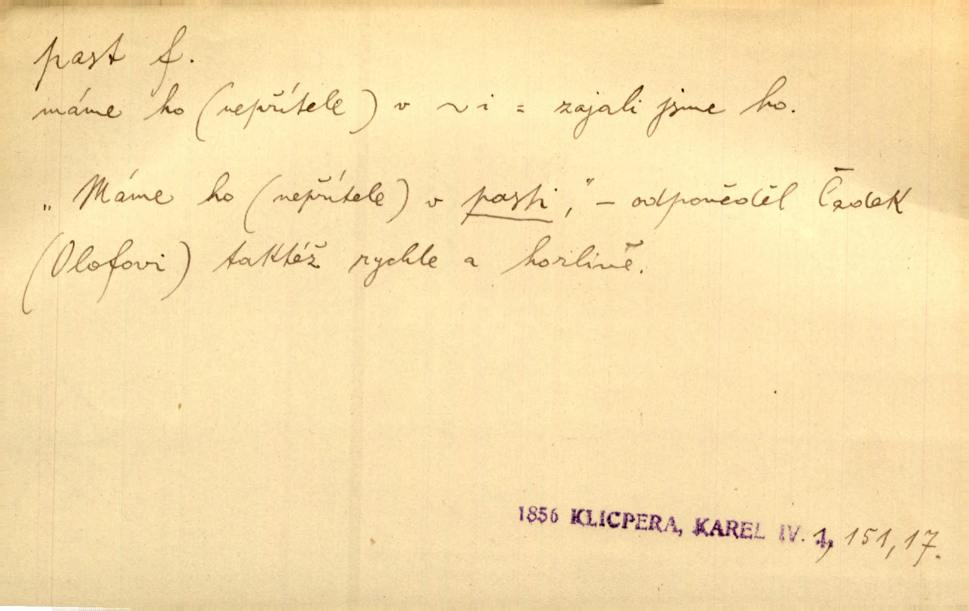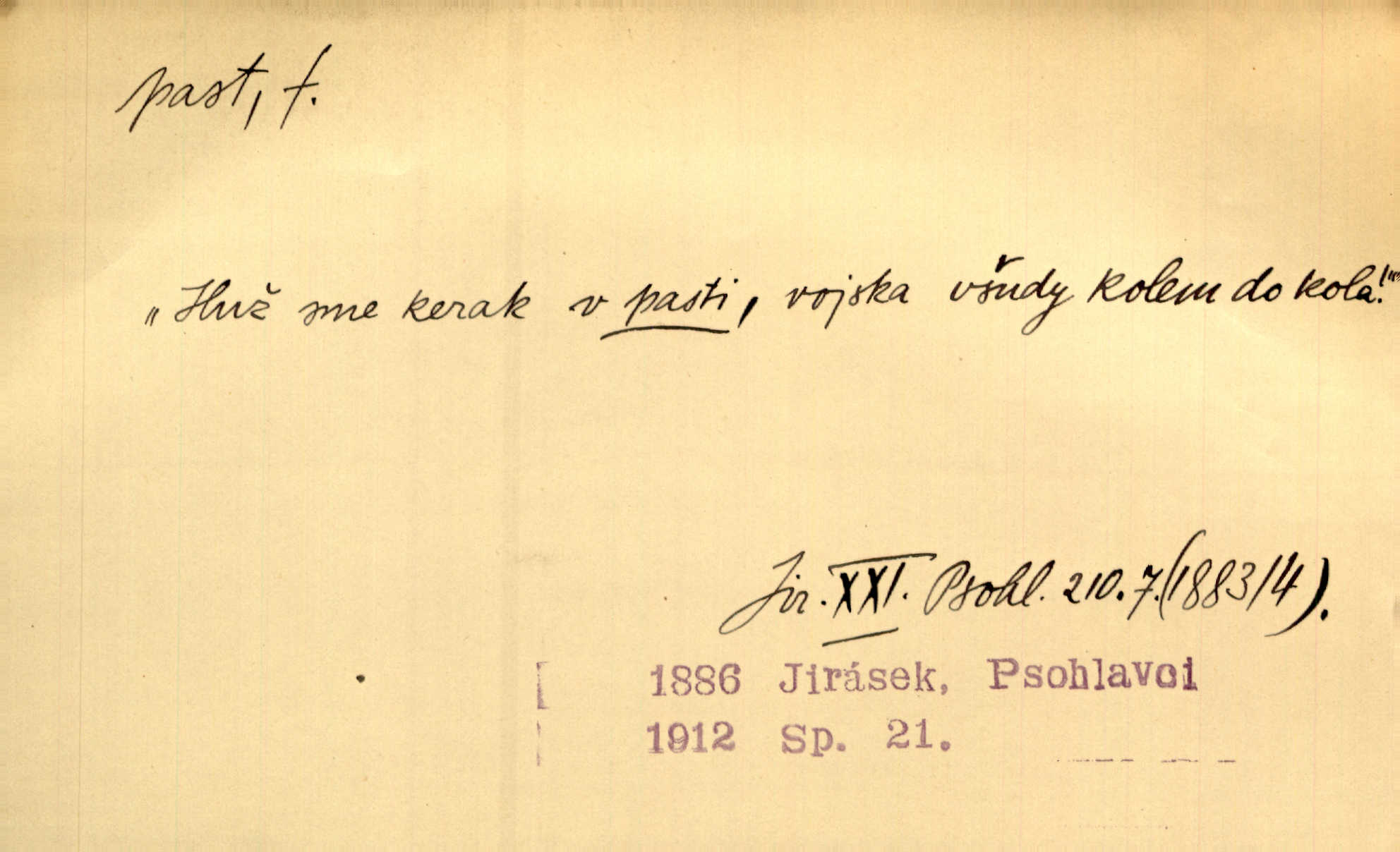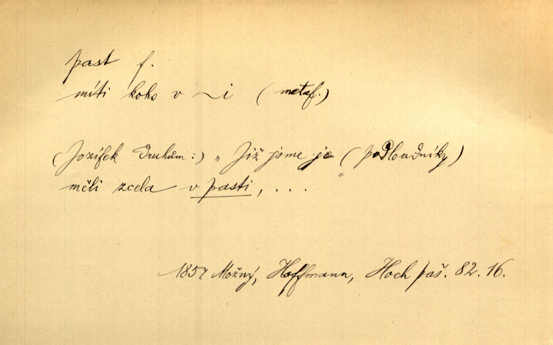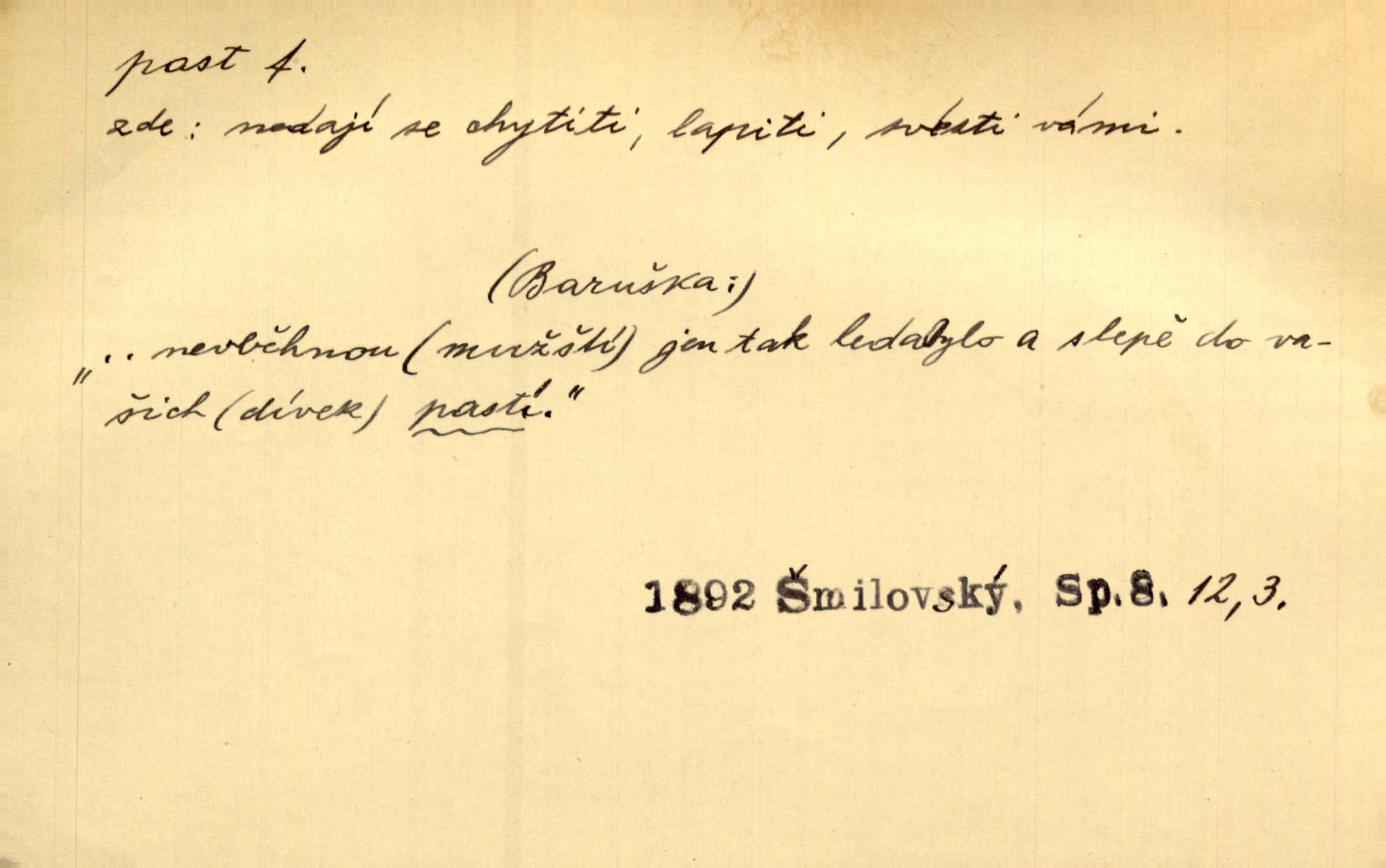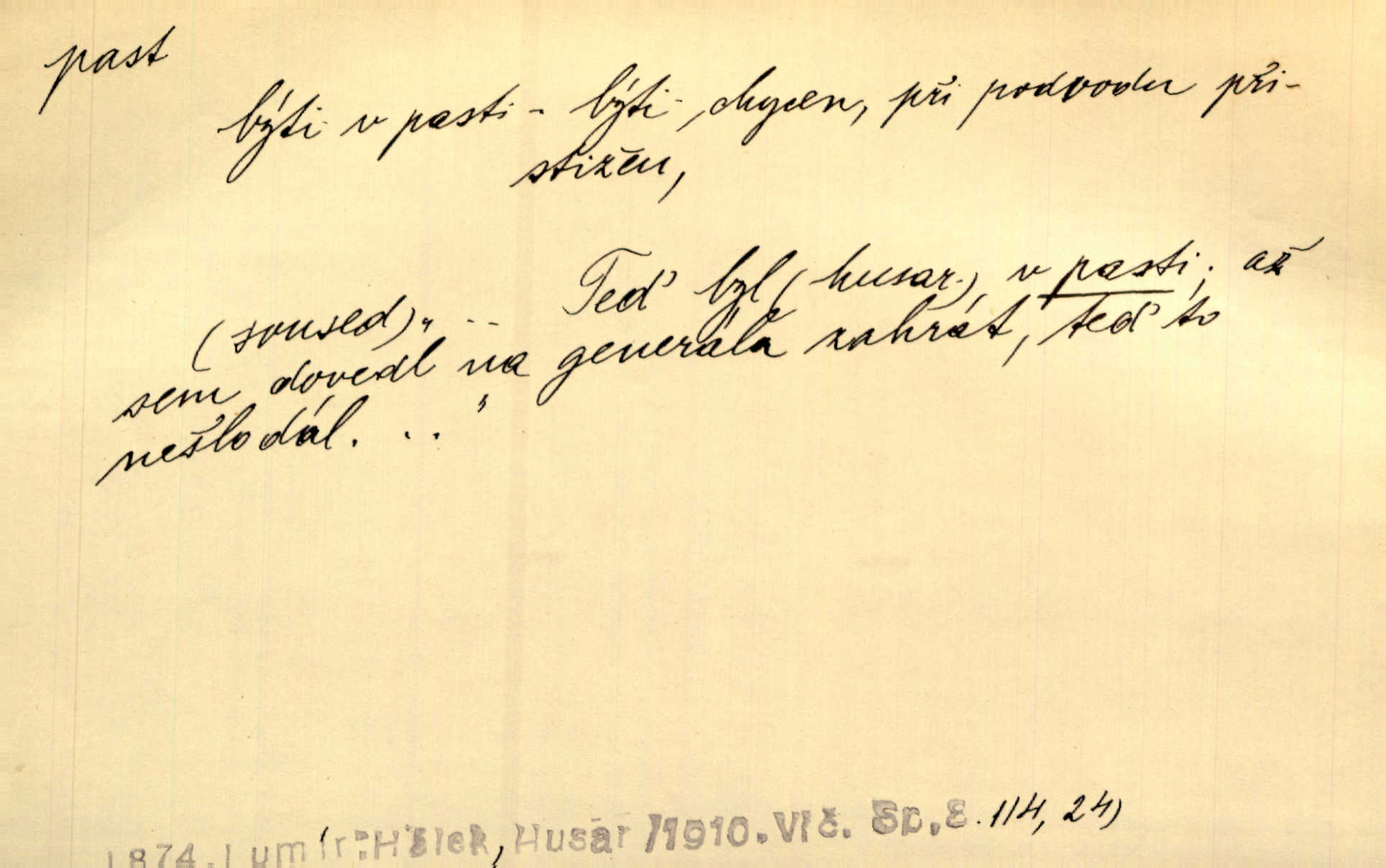 - past, -i f. zařízení k lapání škodné zvěře. Kde kdo v sousedství měl nějakou pasť na ptáky anebo na myši. Ner. Hošík vstával sahaje po své holi, na níž byly přivěšeny tři drátěné pasti. Kosm. Snad ji [lišku] chytne, já s ním byl pasti klást. Něm. Nyní chytl se [kadeřábek] jako myš v pasti podlehl nástrahám. Dyk. Světnice nízká, okénka jako do pasti malá. Rais. Huž sme kerak v pasti, vojska všudy kolem do kola obklíčeni. Jir. Hola, brachu, zle si steleš, do pasti hlavu strkáš v nebezpečí se vydáváš. Hol. Kdo se jednou v pasti přiskřípl, podruhé stěží do ní vleze byl oklamán, obelstěn. Šmil. Žert. Do té pasti manželské já nikdy nepolezu do stavu manželského. Svět. D nástraha, záloha uchystaná k zajetí, obklíčení někoho; léčka, úklad k přelstění, oklamání někoho. Jakmile tam [na Vítkově] bude naše posádka, nesmí ani jediný jezdec cestou k těm dvěma branám, a Pražané budou v pasti. Jir. Tlupa křižáků je [husity] měla v pasti. Mach. [Žižka] je sklíčen od pánů z Plzeňska a z té pasti nevyrazí. Jir. Již jsme je [podloudníky] měli zcela v pasti měli chyceny. Mož. Vida, že jest v pasti, dal se do běhu nebezpečně obklíčen. Prav. Byl to nějaký pěkný kvítek, který tu past na pátera Dominika nastrojil. Schulz. Jak jen je to možno, že jsem toho Bakulu nepronikl a vlezl mu do pasti. Hol. Strojí [intelekt] slovní pasti, aby vytvořil paradoxní slovní situace. K. Čap.