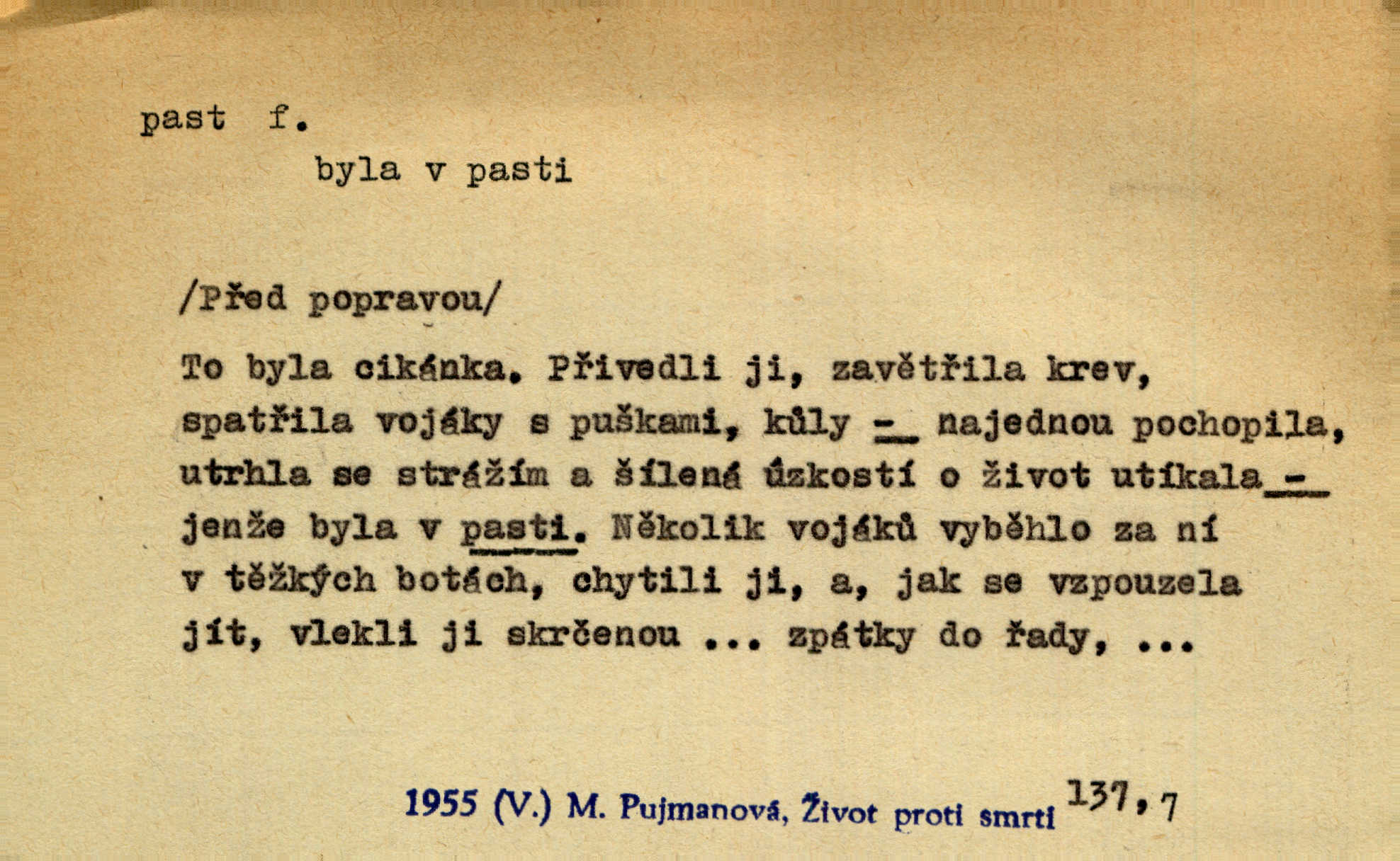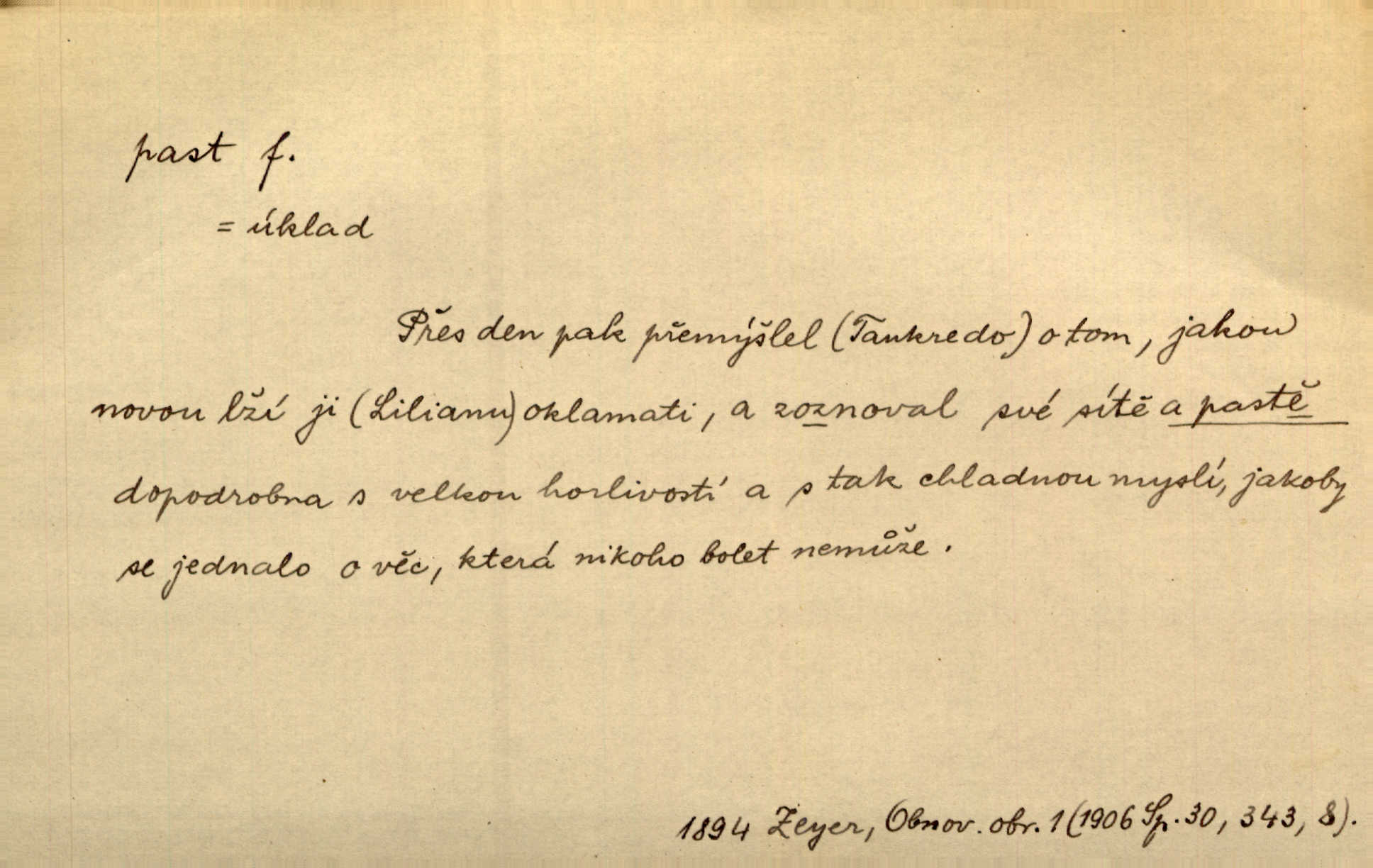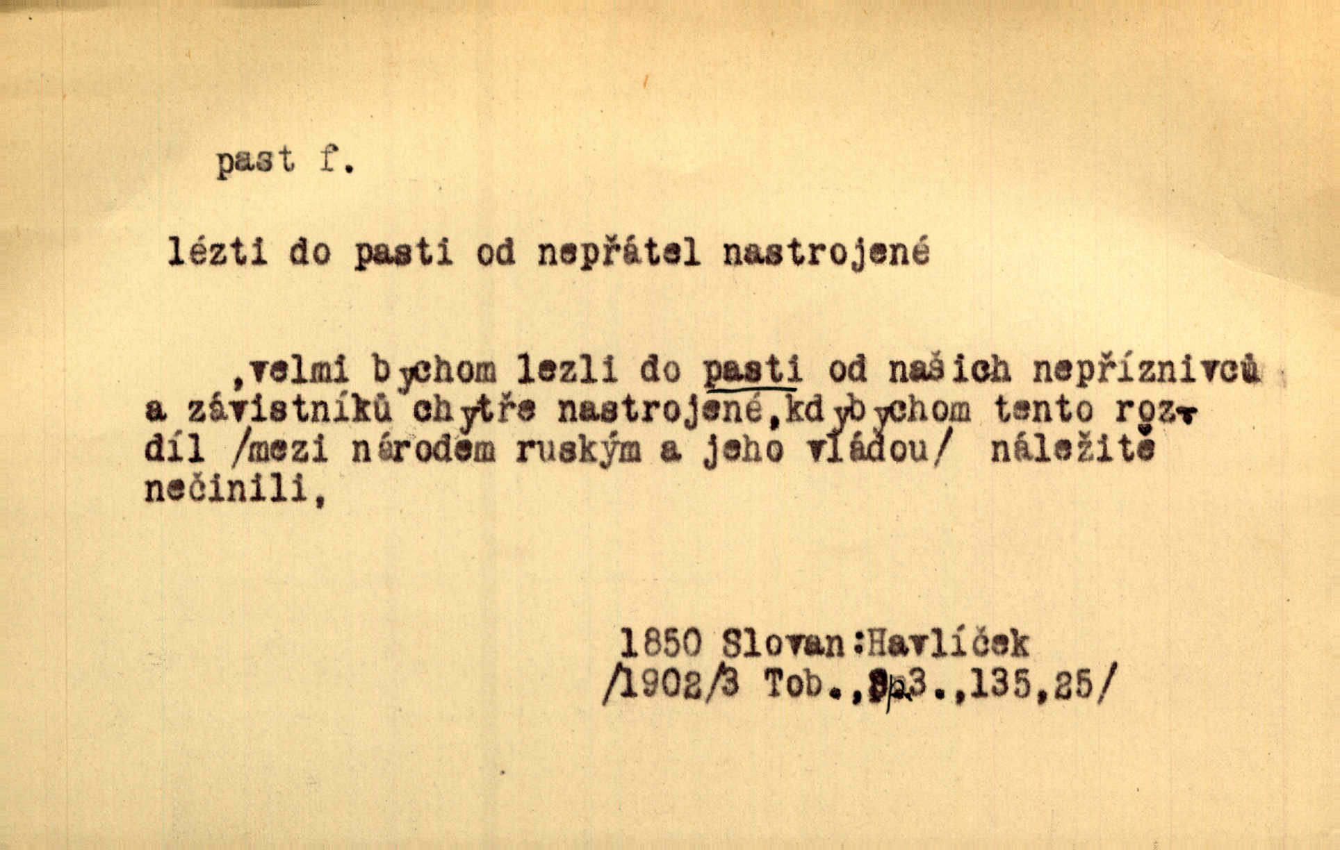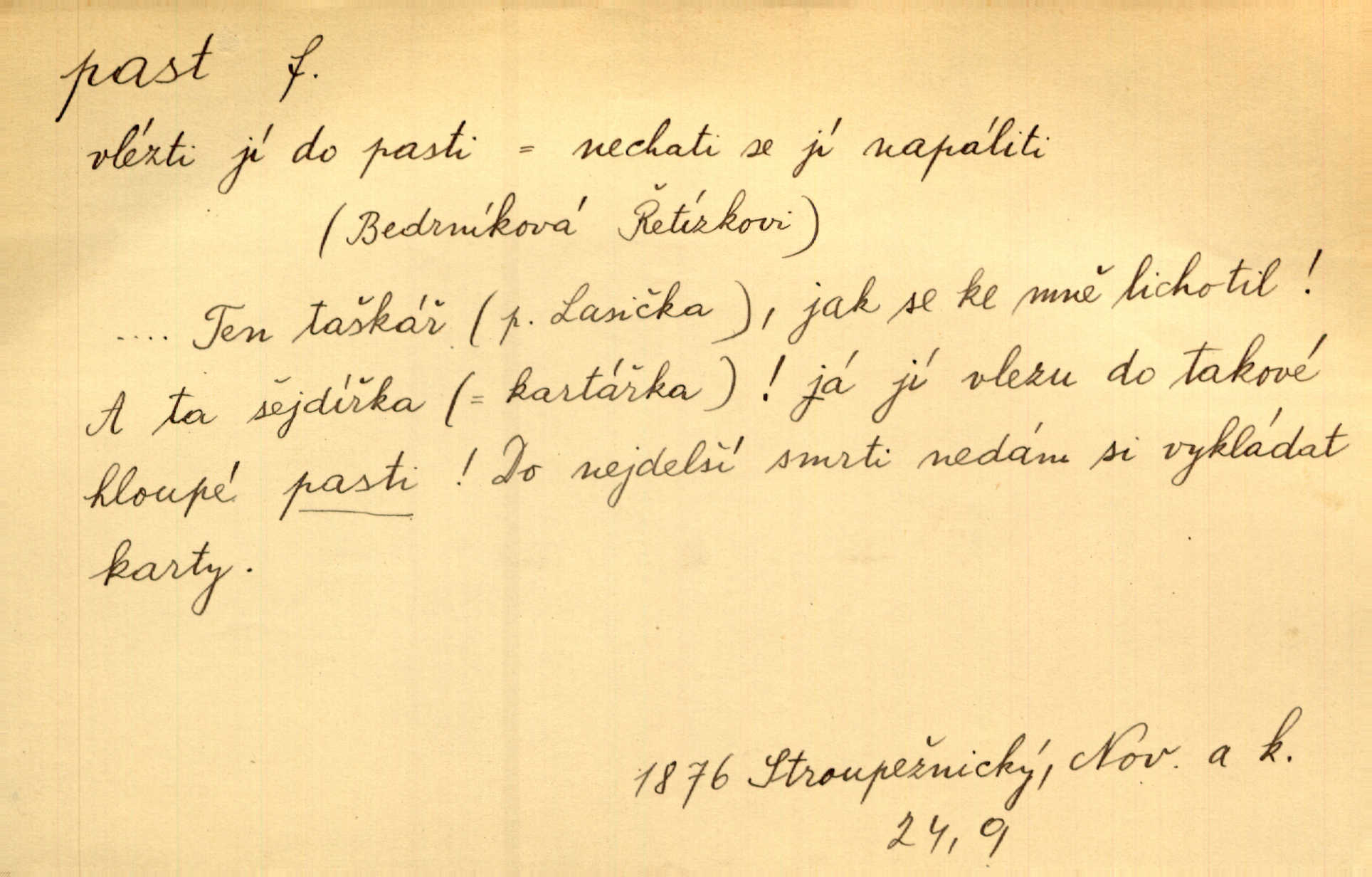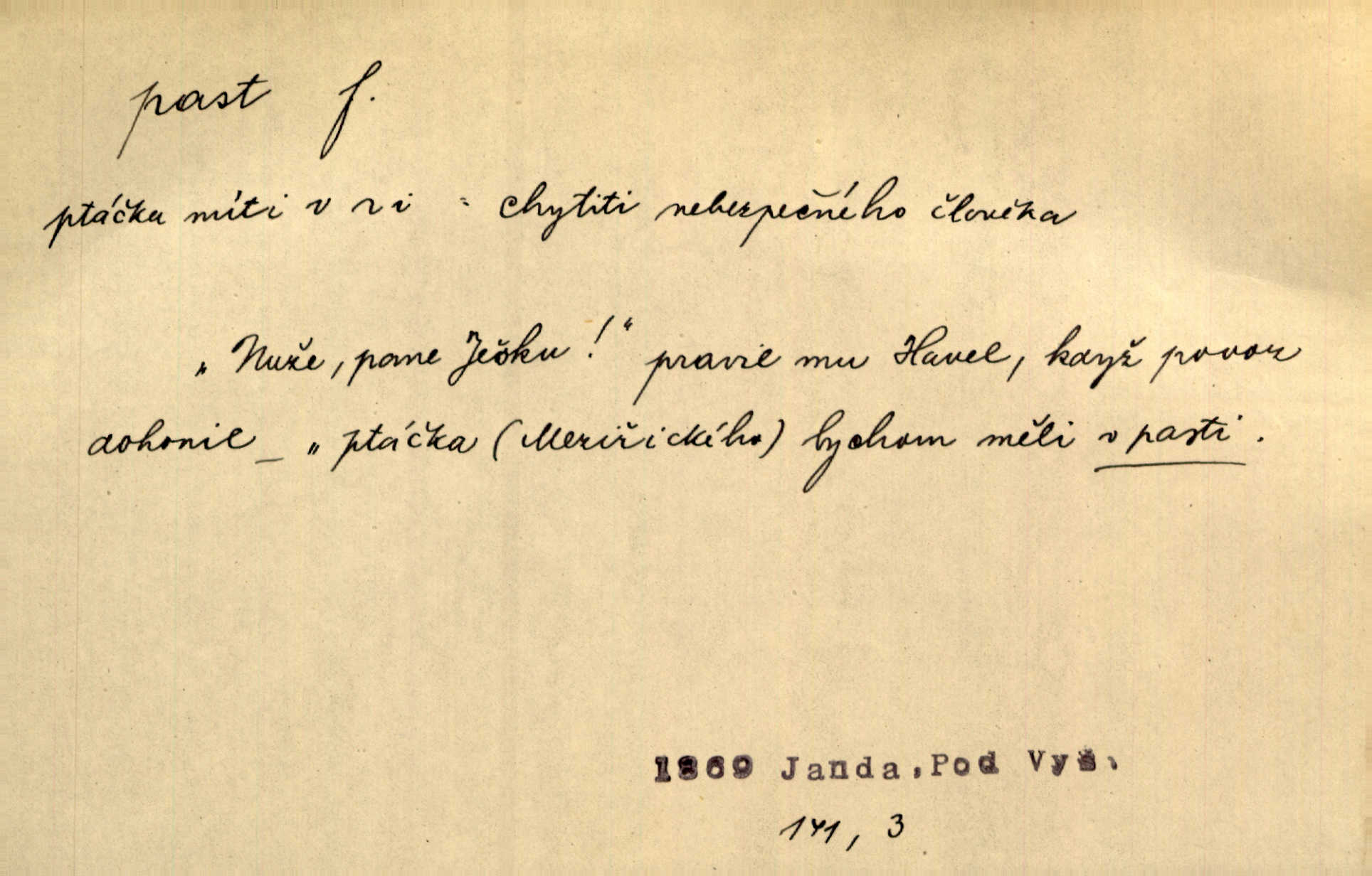 - past, -i f. zařízení k lapání škodné zvěře. Kde kdo v sousedství měl nějakou pasť na ptáky anebo na myši. Ner. Hošík vstával sahaje po své holi, na níž byly přivěšeny tři drátěné pasti. Kosm. Snad ji [lišku] chytne, já s ním byl pasti klást. Něm. Nyní chytl se [kadeřábek] jako myš v pasti podlehl nástrahám. Dyk. Světnice nízká, okénka jako do pasti malá. Rais. Huž sme kerak v pasti, vojska všudy kolem do kola obklíčeni. Jir. Hola, brachu, zle si steleš, do pasti hlavu strkáš v nebezpečí se vydáváš. Hol. Kdo se jednou v pasti přiskřípl, podruhé stěží do ní vleze byl oklamán, obelstěn. Šmil. Žert. Do té pasti manželské já nikdy nepolezu do stavu manželského. Svět. D nástraha, záloha uchystaná k zajetí, obklíčení někoho; léčka, úklad k přelstění, oklamání někoho. Jakmile tam [na Vítkově] bude naše posádka, nesmí ani jediný jezdec cestou k těm dvěma branám, a Pražané budou v pasti. Jir. Tlupa křižáků je [husity] měla v pasti. Mach. [Žižka] je sklíčen od pánů z Plzeňska a z té pasti nevyrazí. Jir. Již jsme je [podloudníky] měli zcela v pasti měli chyceny. Mož. Vida, že jest v pasti, dal se do běhu nebezpečně obklíčen. Prav. Byl to nějaký pěkný kvítek, který tu past na pátera Dominika nastrojil. Schulz. Jak jen je to možno, že jsem toho Bakulu nepronikl a vlezl mu do pasti. Hol. Strojí [intelekt] slovní pasti, aby vytvořil paradoxní slovní situace. K. Čap.