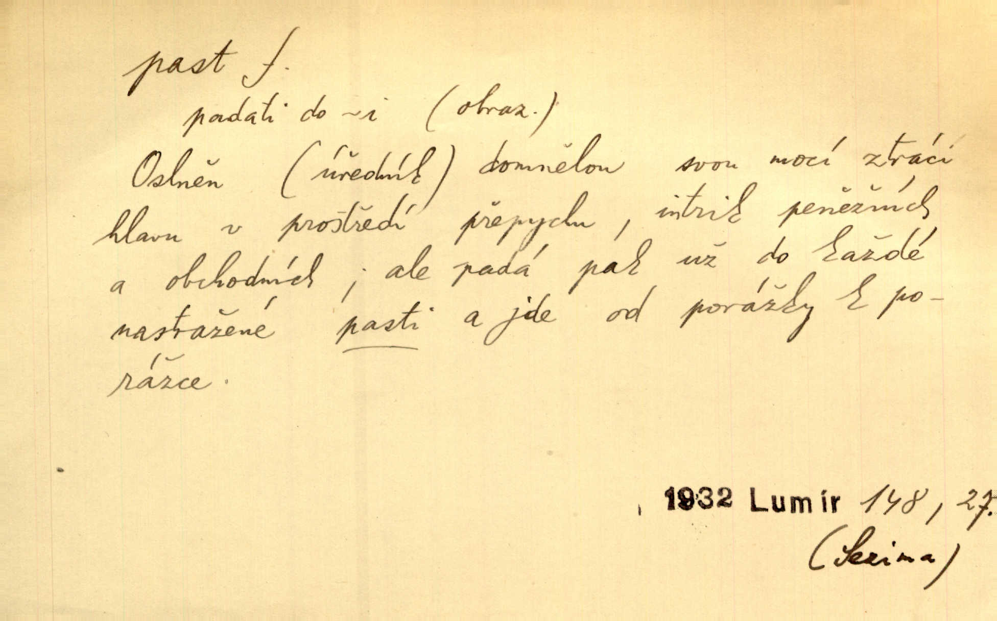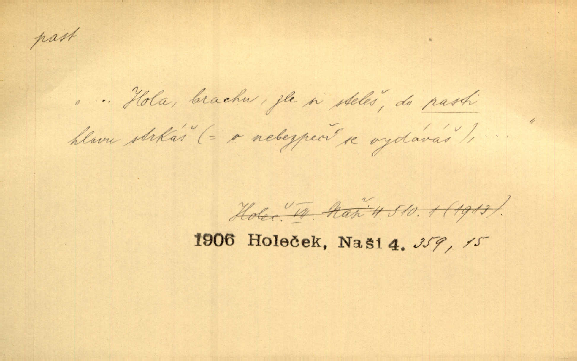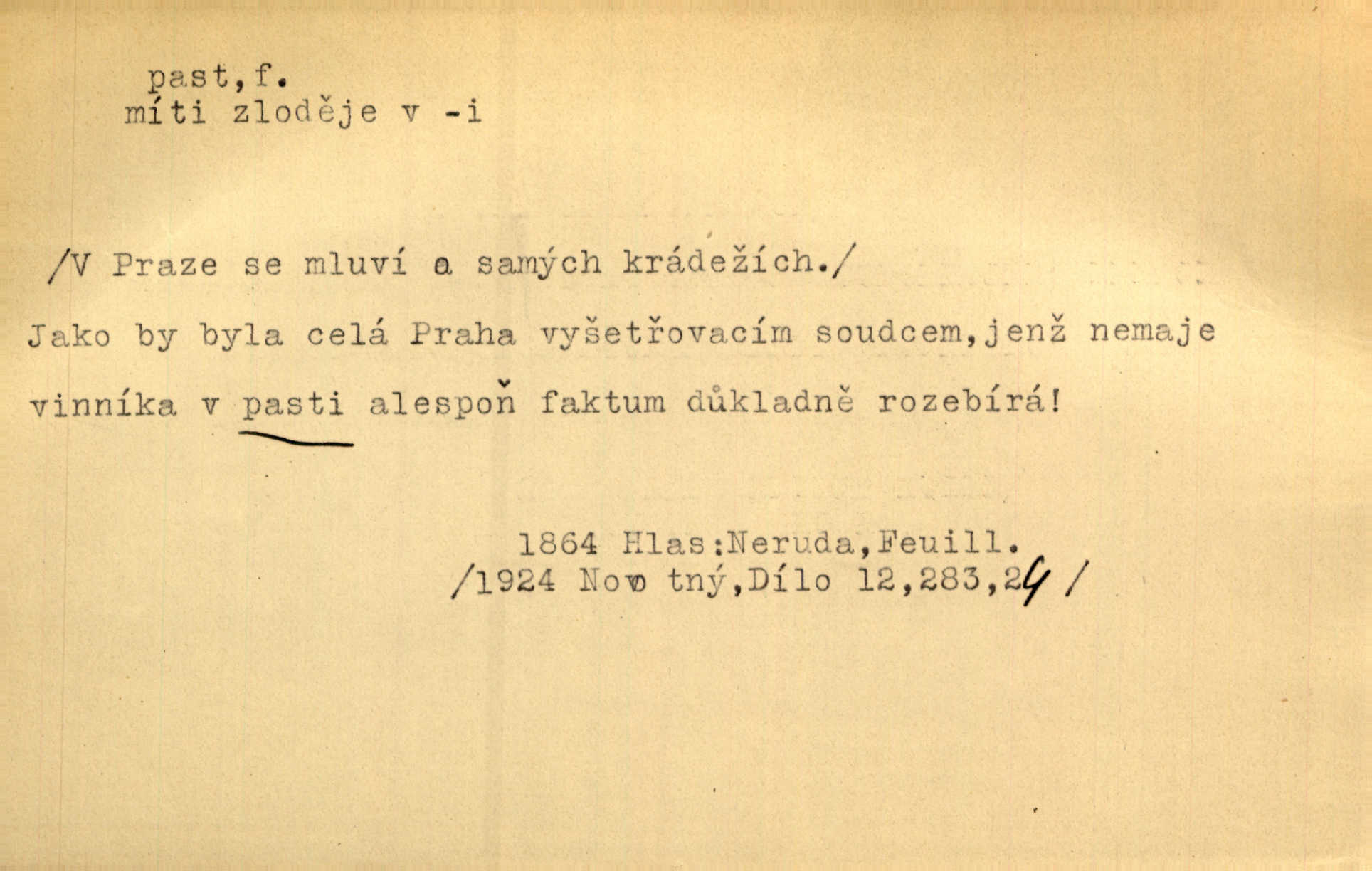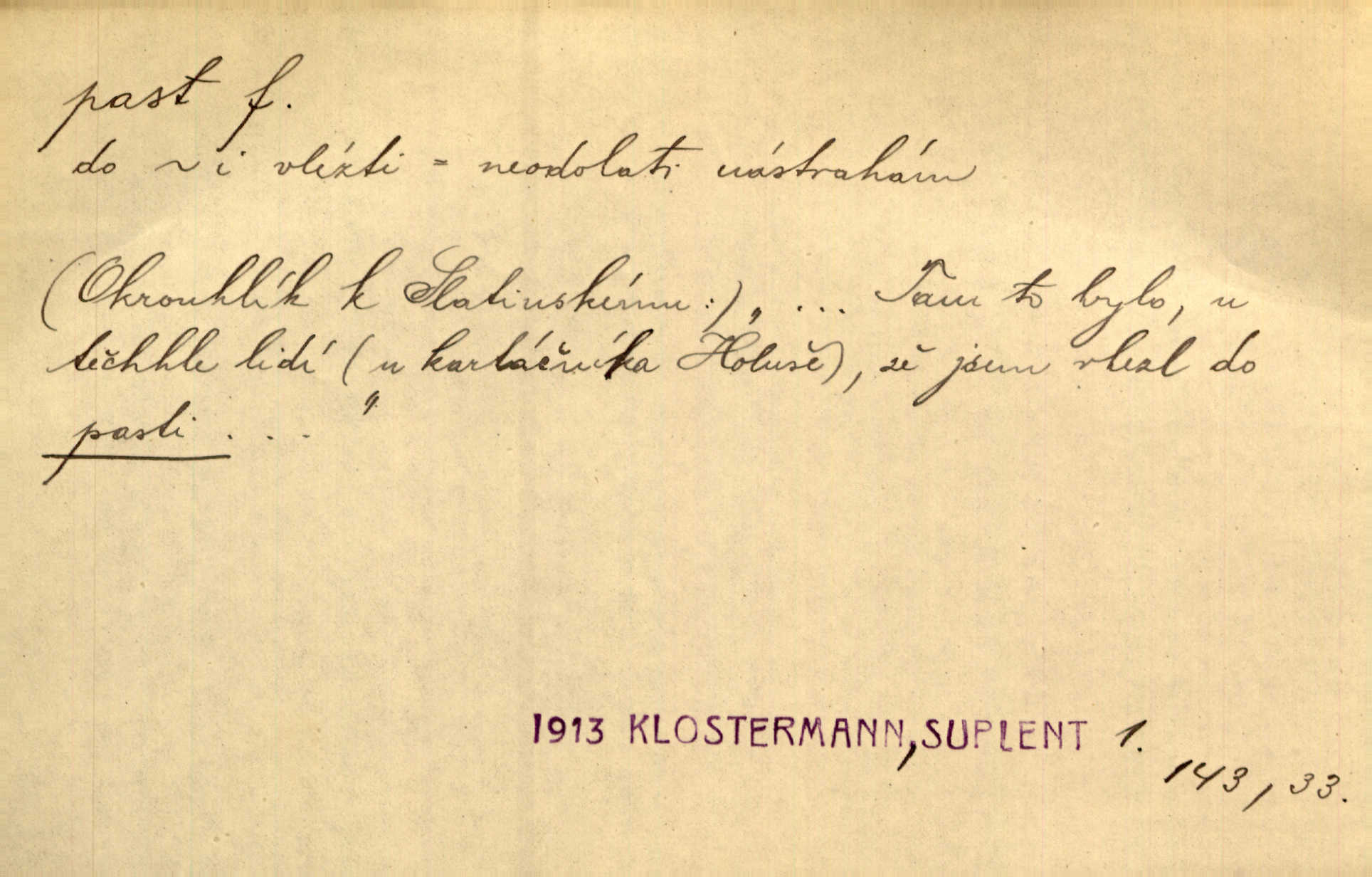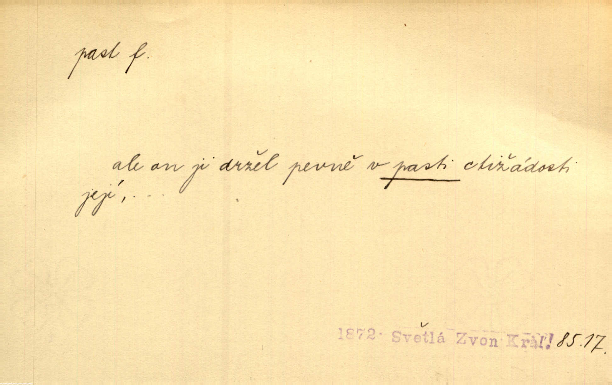 - past, -i f. zařízení k lapání škodné zvěře. Kde kdo v sousedství měl nějakou pasť na ptáky anebo na myši. Ner. Hošík vstával sahaje po své holi, na níž byly přivěšeny tři drátěné pasti. Kosm. Snad ji [lišku] chytne, já s ním byl pasti klást. Něm. Nyní chytl se [kadeřábek] jako myš v pasti podlehl nástrahám. Dyk. Světnice nízká, okénka jako do pasti malá. Rais. Huž sme kerak v pasti, vojska všudy kolem do kola obklíčeni. Jir. Hola, brachu, zle si steleš, do pasti hlavu strkáš v nebezpečí se vydáváš. Hol. Kdo se jednou v pasti přiskřípl, podruhé stěží do ní vleze byl oklamán, obelstěn. Šmil. Žert. Do té pasti manželské já nikdy nepolezu do stavu manželského. Svět. D nástraha, záloha uchystaná k zajetí, obklíčení někoho; léčka, úklad k přelstění, oklamání někoho. Jakmile tam [na Vítkově] bude naše posádka, nesmí ani jediný jezdec cestou k těm dvěma branám, a Pražané budou v pasti. Jir. Tlupa křižáků je [husity] měla v pasti. Mach. [Žižka] je sklíčen od pánů z Plzeňska a z té pasti nevyrazí. Jir. Již jsme je [podloudníky] měli zcela v pasti měli chyceny. Mož. Vida, že jest v pasti, dal se do běhu nebezpečně obklíčen. Prav. Byl to nějaký pěkný kvítek, který tu past na pátera Dominika nastrojil. Schulz. Jak jen je to možno, že jsem toho Bakulu nepronikl a vlezl mu do pasti. Hol. Strojí [intelekt] slovní pasti, aby vytvořil paradoxní slovní situace. K. Čap.