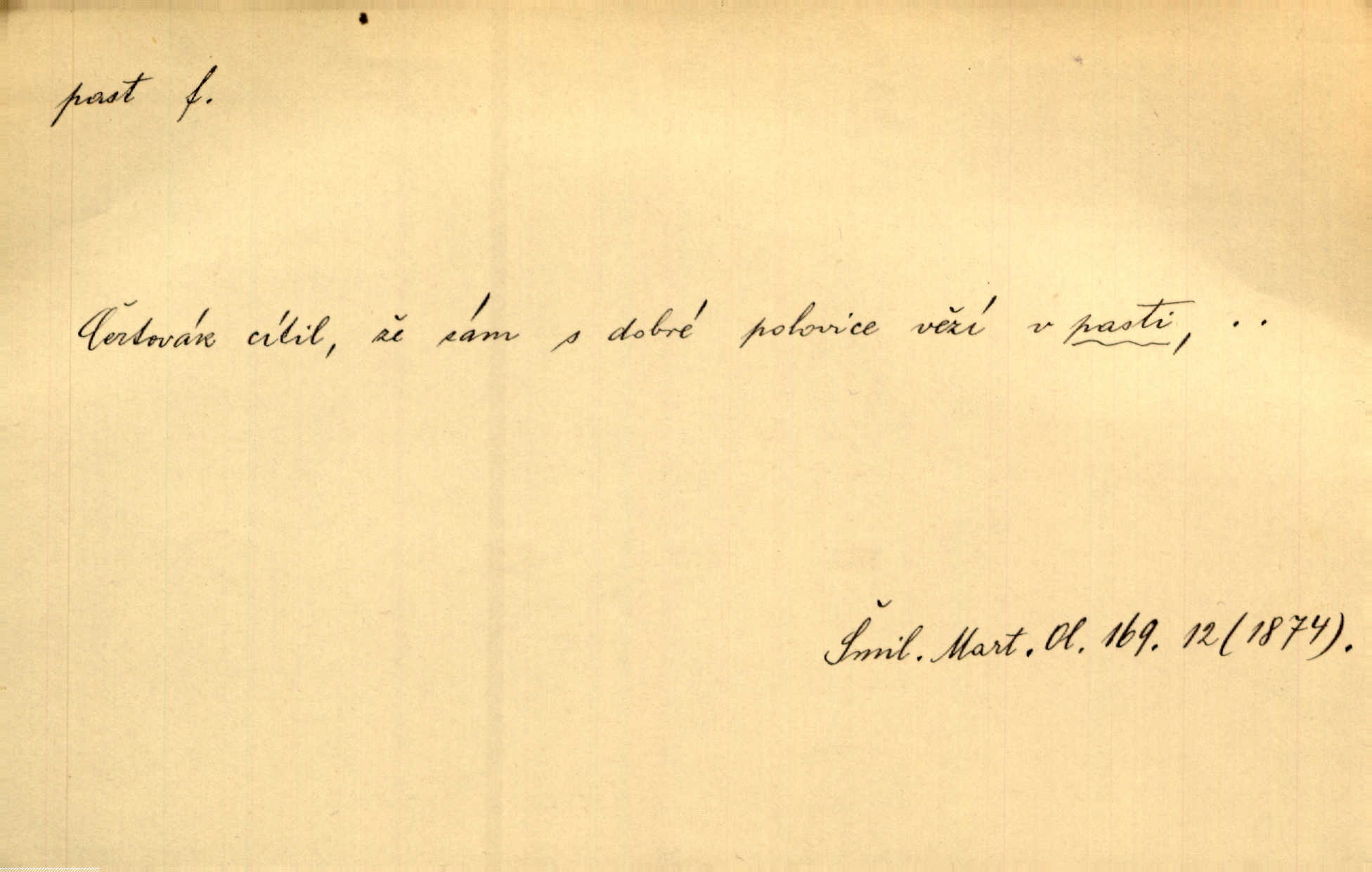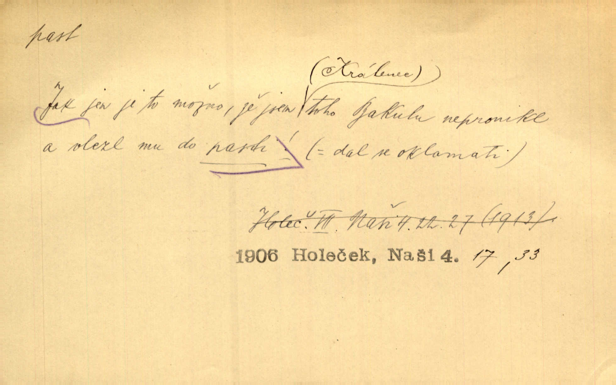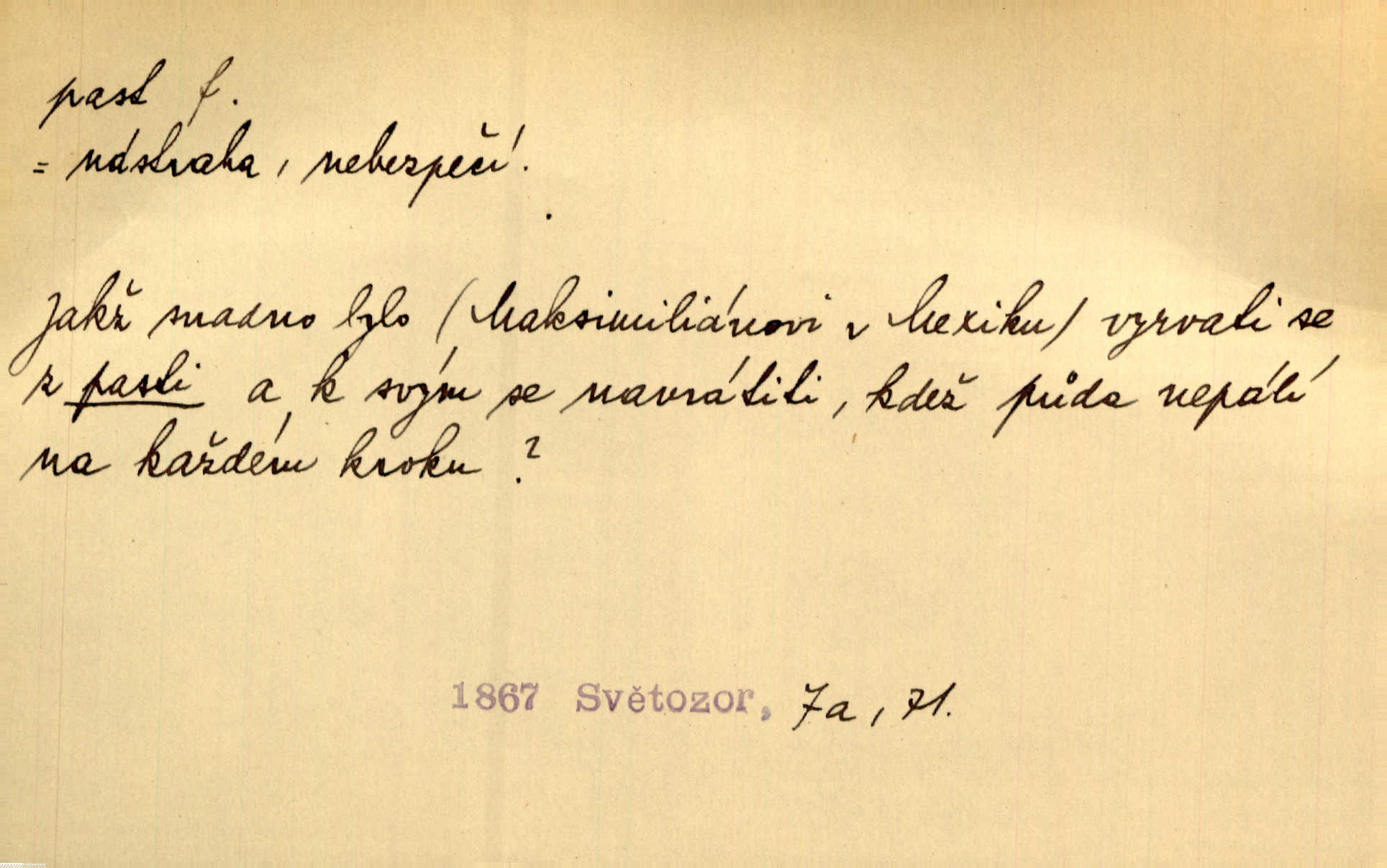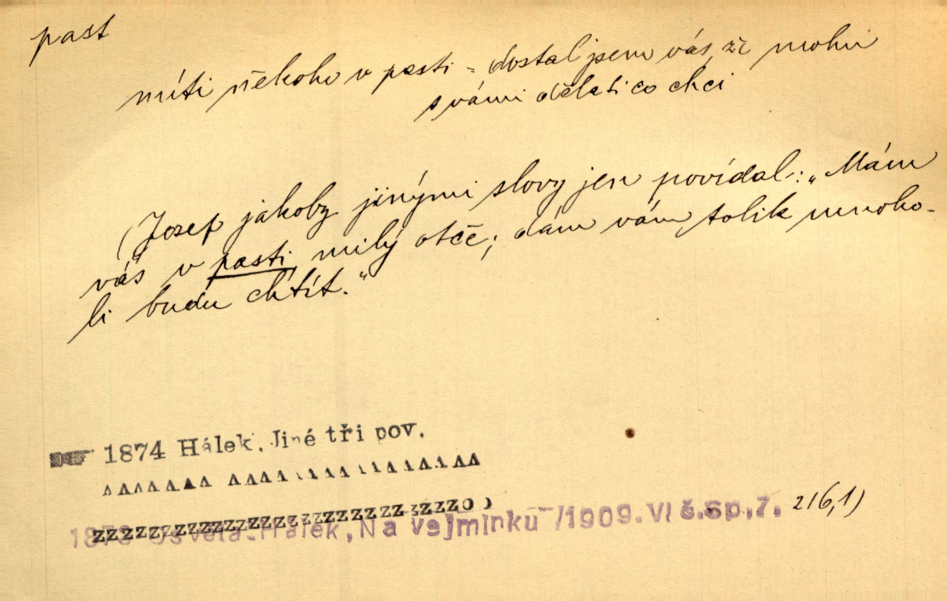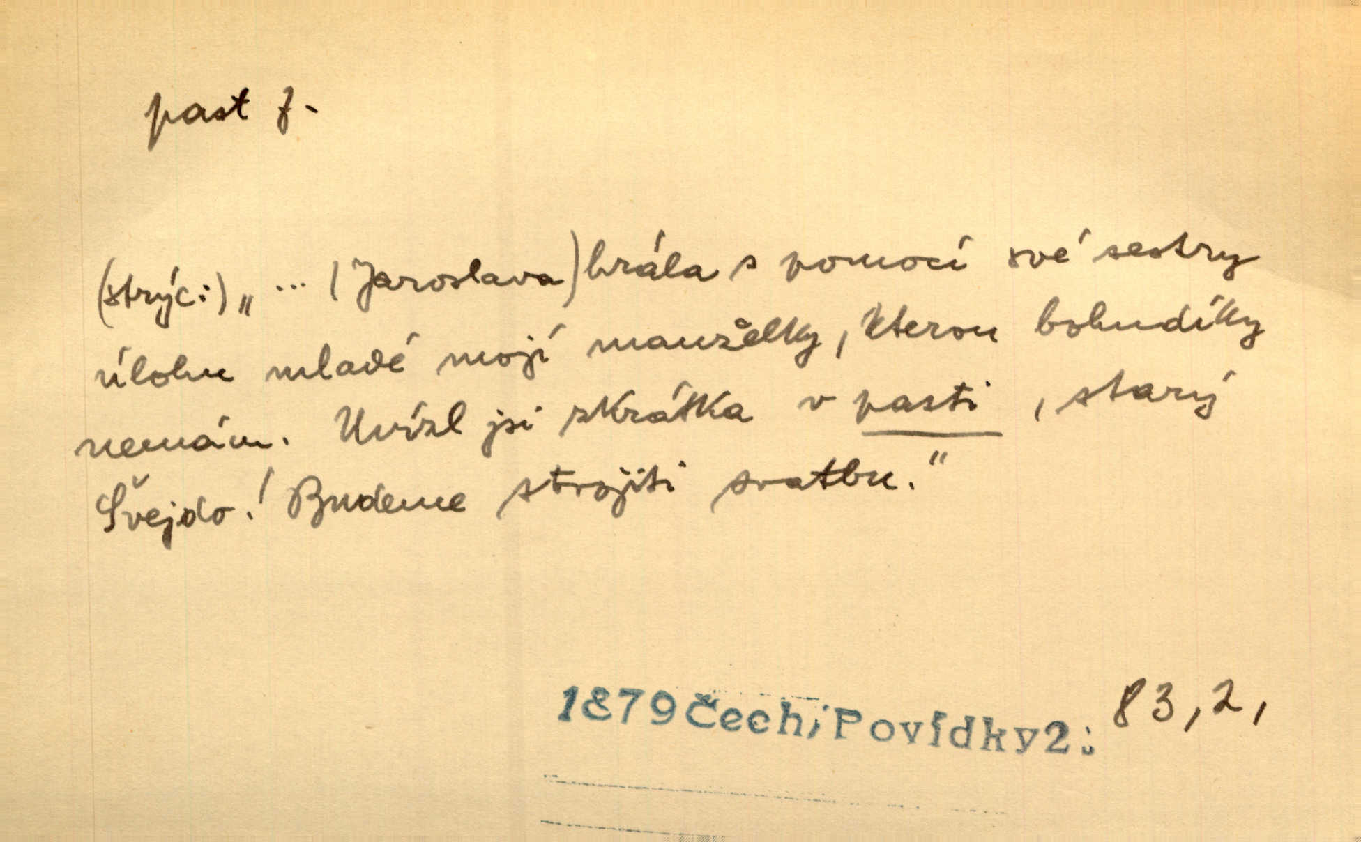 - past, -i f. zařízení k lapání škodné zvěře. Kde kdo v sousedství měl nějakou pasť na ptáky anebo na myši. Ner. Hošík vstával sahaje po své holi, na níž byly přivěšeny tři drátěné pasti. Kosm. Snad ji [lišku] chytne, já s ním byl pasti klást. Něm. Nyní chytl se [kadeřábek] jako myš v pasti podlehl nástrahám. Dyk. Světnice nízká, okénka jako do pasti malá. Rais. Huž sme kerak v pasti, vojska všudy kolem do kola obklíčeni. Jir. Hola, brachu, zle si steleš, do pasti hlavu strkáš v nebezpečí se vydáváš. Hol. Kdo se jednou v pasti přiskřípl, podruhé stěží do ní vleze byl oklamán, obelstěn. Šmil. Žert. Do té pasti manželské já nikdy nepolezu do stavu manželského. Svět. D nástraha, záloha uchystaná k zajetí, obklíčení někoho; léčka, úklad k přelstění, oklamání někoho. Jakmile tam [na Vítkově] bude naše posádka, nesmí ani jediný jezdec cestou k těm dvěma branám, a Pražané budou v pasti. Jir. Tlupa křižáků je [husity] měla v pasti. Mach. [Žižka] je sklíčen od pánů z Plzeňska a z té pasti nevyrazí. Jir. Již jsme je [podloudníky] měli zcela v pasti měli chyceny. Mož. Vida, že jest v pasti, dal se do běhu nebezpečně obklíčen. Prav. Byl to nějaký pěkný kvítek, který tu past na pátera Dominika nastrojil. Schulz. Jak jen je to možno, že jsem toho Bakulu nepronikl a vlezl mu do pasti. Hol. Strojí [intelekt] slovní pasti, aby vytvořil paradoxní slovní situace. K. Čap.