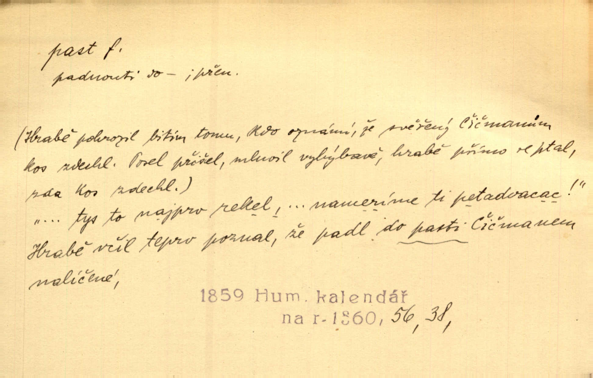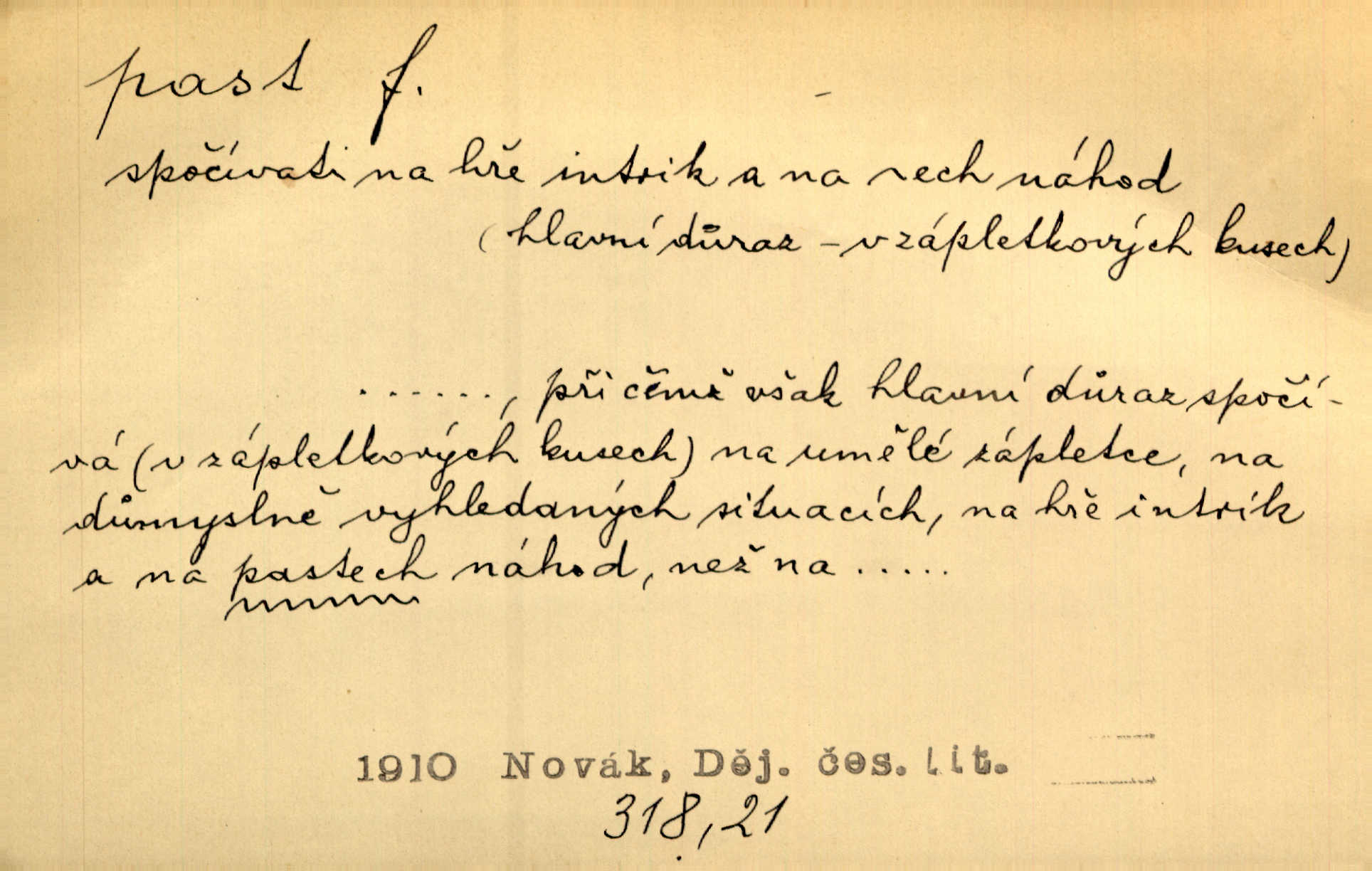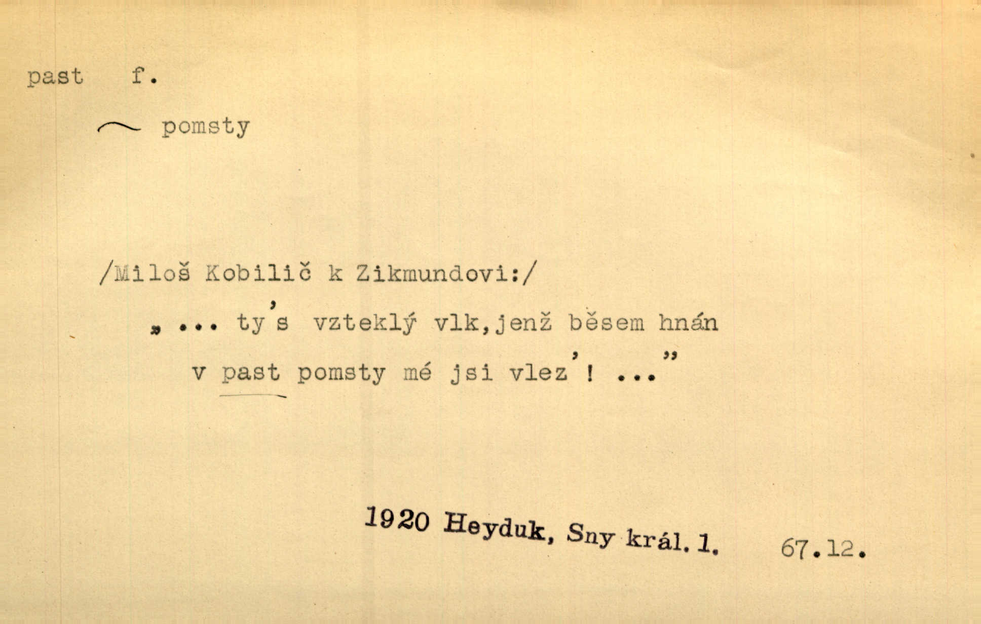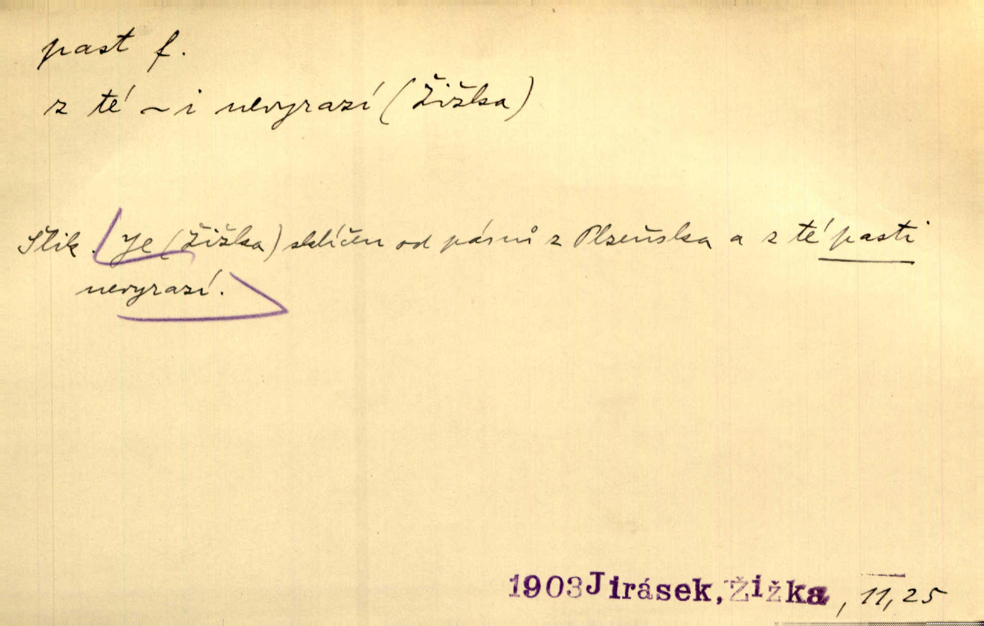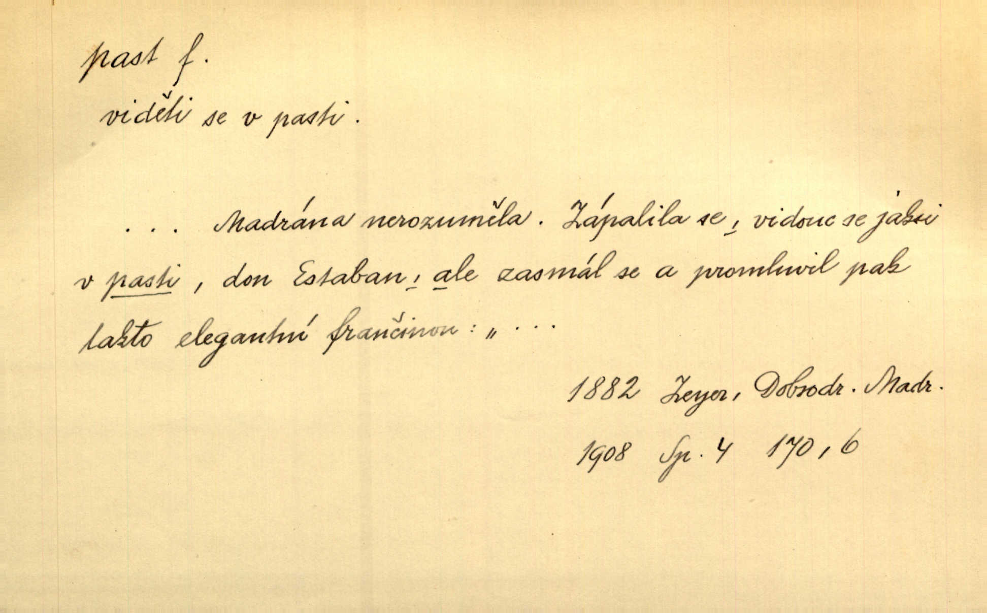 - past, -i f. zařízení k lapání škodné zvěře. Kde kdo v sousedství měl nějakou pasť na ptáky anebo na myši. Ner. Hošík vstával sahaje po své holi, na níž byly přivěšeny tři drátěné pasti. Kosm. Snad ji [lišku] chytne, já s ním byl pasti klást. Něm. Nyní chytl se [kadeřábek] jako myš v pasti podlehl nástrahám. Dyk. Světnice nízká, okénka jako do pasti malá. Rais. Huž sme kerak v pasti, vojska všudy kolem do kola obklíčeni. Jir. Hola, brachu, zle si steleš, do pasti hlavu strkáš v nebezpečí se vydáváš. Hol. Kdo se jednou v pasti přiskřípl, podruhé stěží do ní vleze byl oklamán, obelstěn. Šmil. Žert. Do té pasti manželské já nikdy nepolezu do stavu manželského. Svět. D nástraha, záloha uchystaná k zajetí, obklíčení někoho; léčka, úklad k přelstění, oklamání někoho. Jakmile tam [na Vítkově] bude naše posádka, nesmí ani jediný jezdec cestou k těm dvěma branám, a Pražané budou v pasti. Jir. Tlupa křižáků je [husity] měla v pasti. Mach. [Žižka] je sklíčen od pánů z Plzeňska a z té pasti nevyrazí. Jir. Již jsme je [podloudníky] měli zcela v pasti měli chyceny. Mož. Vida, že jest v pasti, dal se do běhu nebezpečně obklíčen. Prav. Byl to nějaký pěkný kvítek, který tu past na pátera Dominika nastrojil. Schulz. Jak jen je to možno, že jsem toho Bakulu nepronikl a vlezl mu do pasti. Hol. Strojí [intelekt] slovní pasti, aby vytvořil paradoxní slovní situace. K. Čap.