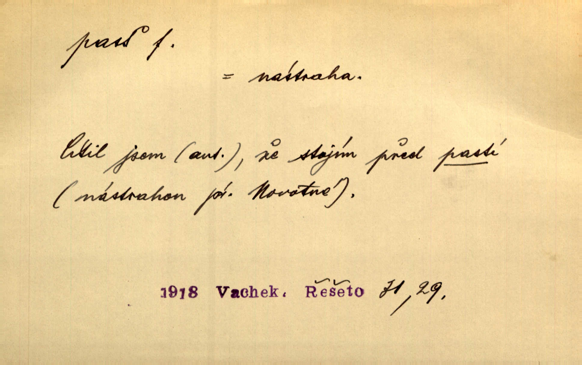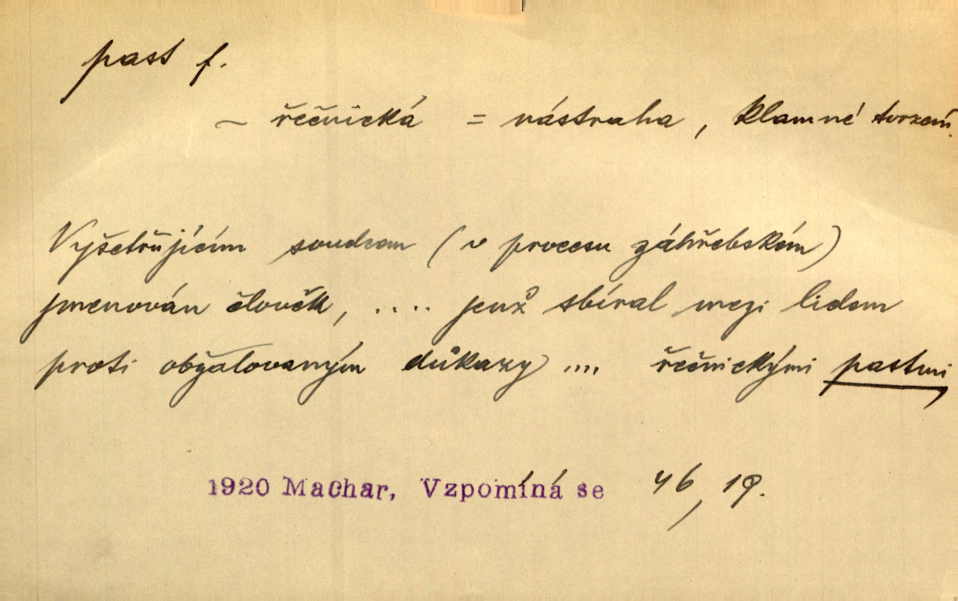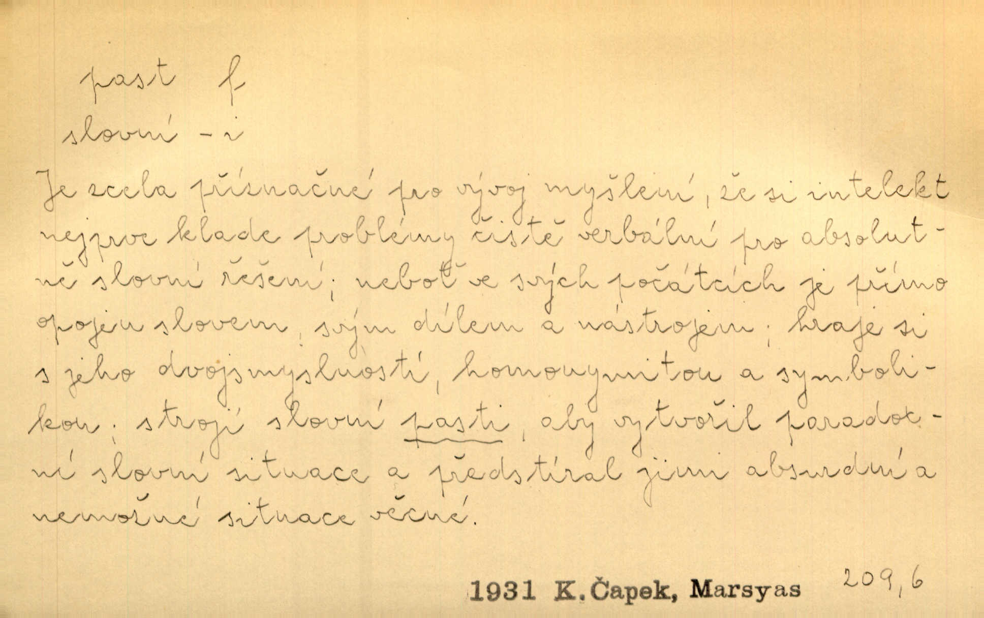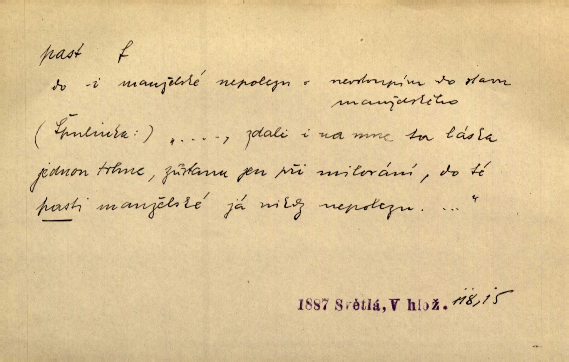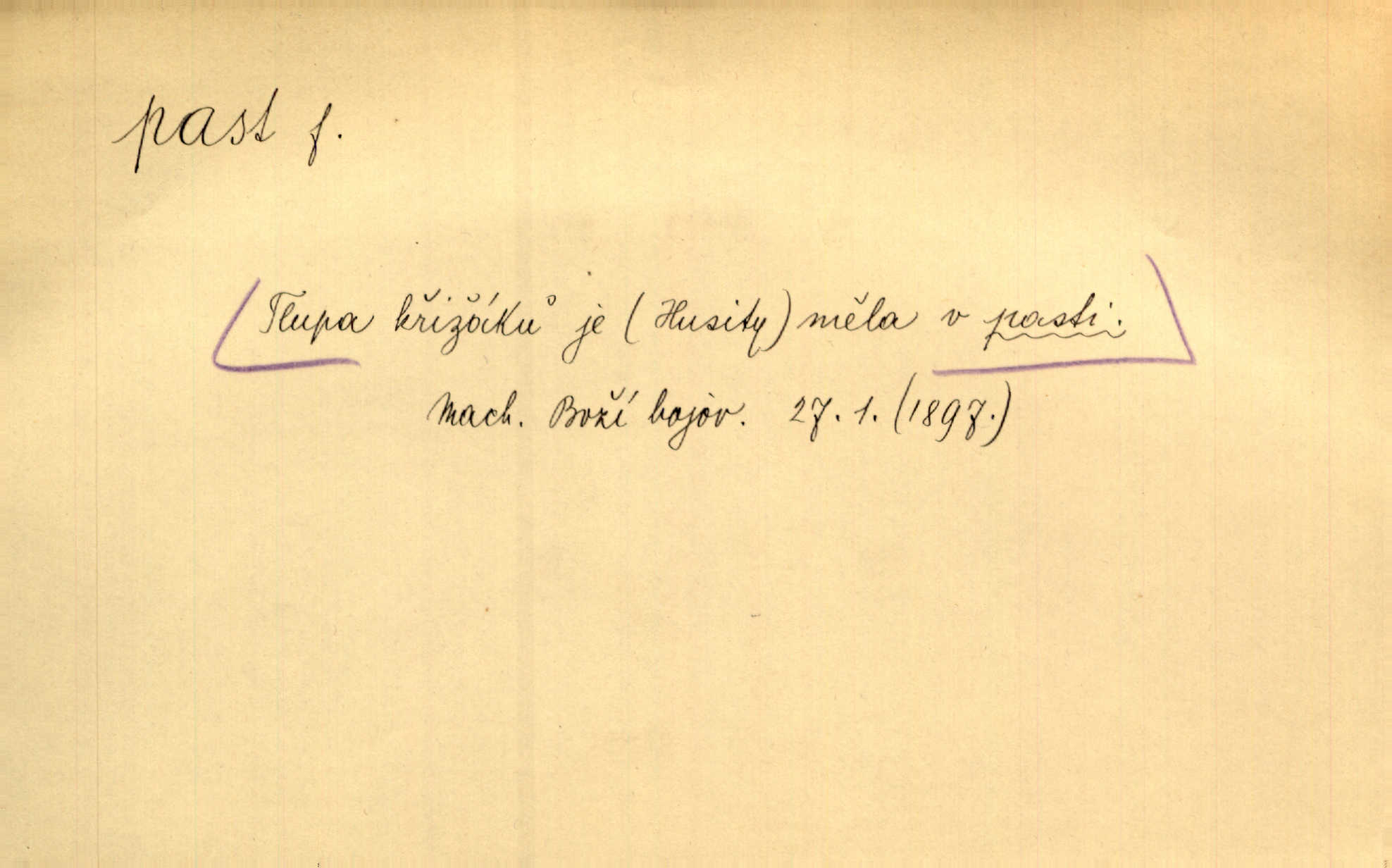 - past, -i f. zařízení k lapání škodné zvěře. Kde kdo v sousedství měl nějakou pasť na ptáky anebo na myši. Ner. Hošík vstával sahaje po své holi, na níž byly přivěšeny tři drátěné pasti. Kosm. Snad ji [lišku] chytne, já s ním byl pasti klást. Něm. Nyní chytl se [kadeřábek] jako myš v pasti podlehl nástrahám. Dyk. Světnice nízká, okénka jako do pasti malá. Rais. Huž sme kerak v pasti, vojska všudy kolem do kola obklíčeni. Jir. Hola, brachu, zle si steleš, do pasti hlavu strkáš v nebezpečí se vydáváš. Hol. Kdo se jednou v pasti přiskřípl, podruhé stěží do ní vleze byl oklamán, obelstěn. Šmil. Žert. Do té pasti manželské já nikdy nepolezu do stavu manželského. Svět. D nástraha, záloha uchystaná k zajetí, obklíčení někoho; léčka, úklad k přelstění, oklamání někoho. Jakmile tam [na Vítkově] bude naše posádka, nesmí ani jediný jezdec cestou k těm dvěma branám, a Pražané budou v pasti. Jir. Tlupa křižáků je [husity] měla v pasti. Mach. [Žižka] je sklíčen od pánů z Plzeňska a z té pasti nevyrazí. Jir. Již jsme je [podloudníky] měli zcela v pasti měli chyceny. Mož. Vida, že jest v pasti, dal se do běhu nebezpečně obklíčen. Prav. Byl to nějaký pěkný kvítek, který tu past na pátera Dominika nastrojil. Schulz. Jak jen je to možno, že jsem toho Bakulu nepronikl a vlezl mu do pasti. Hol. Strojí [intelekt] slovní pasti, aby vytvořil paradoxní slovní situace. K. Čap.