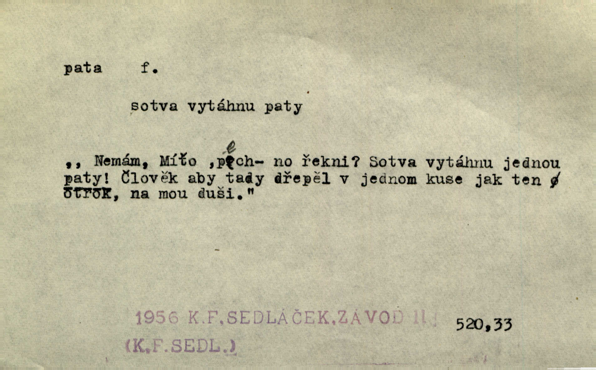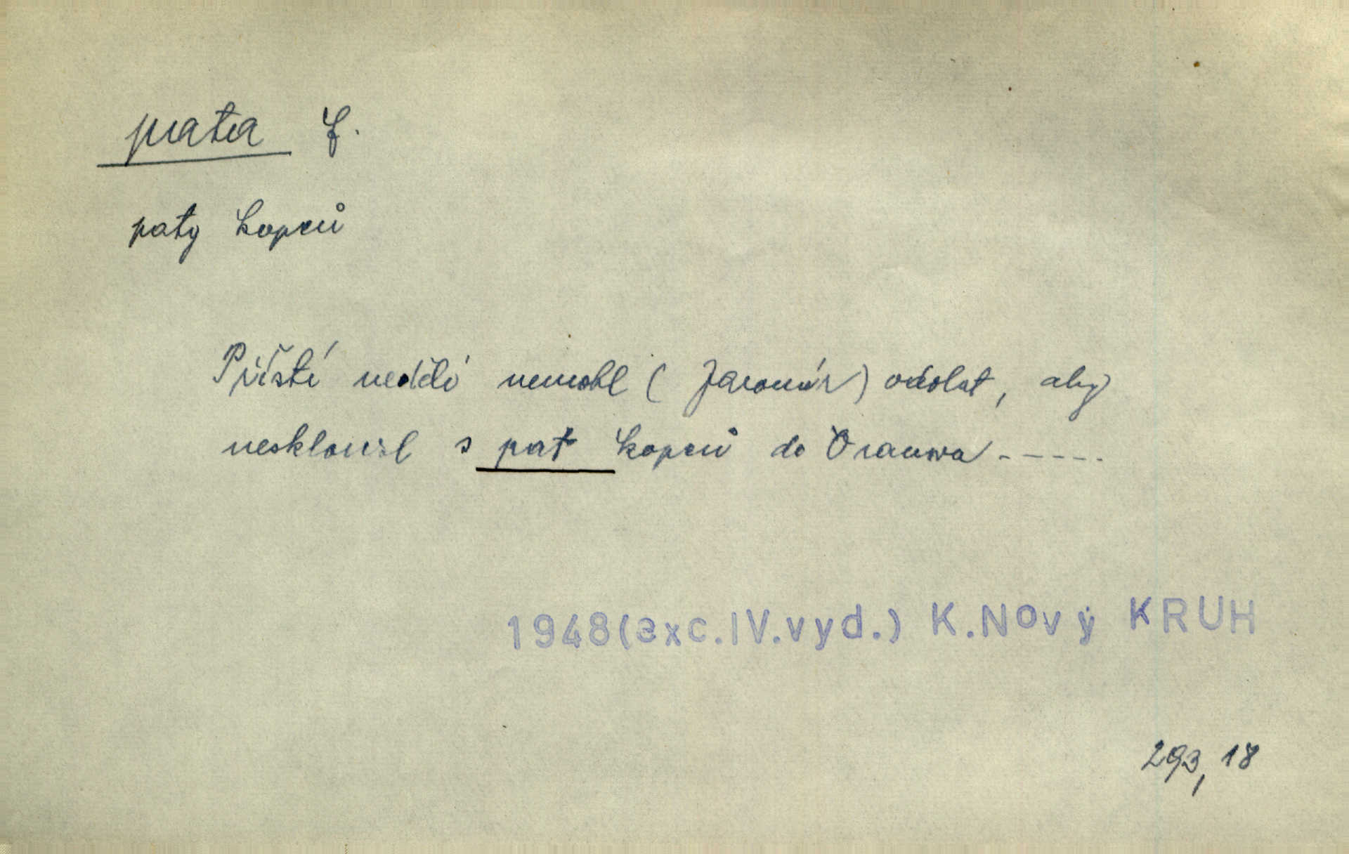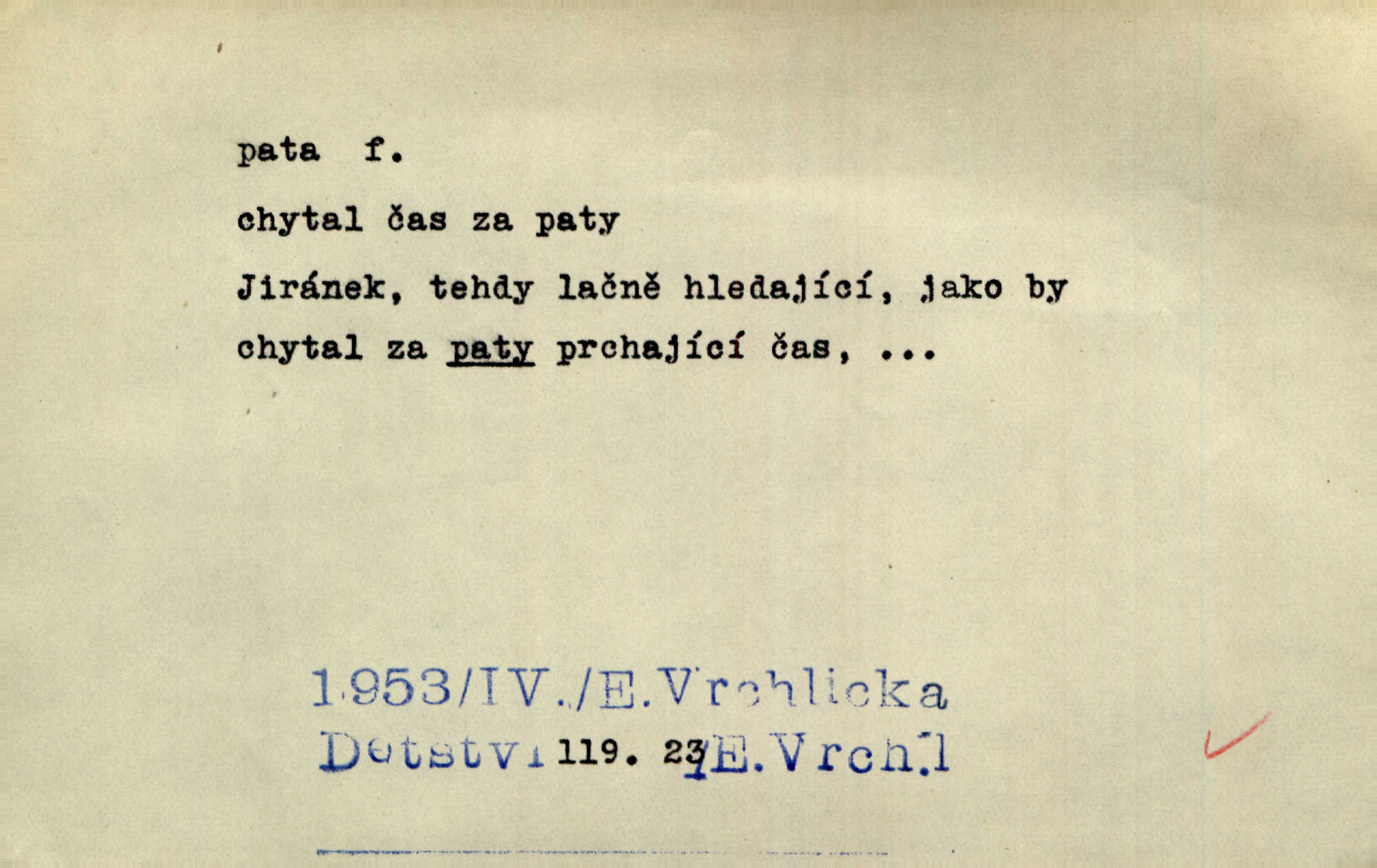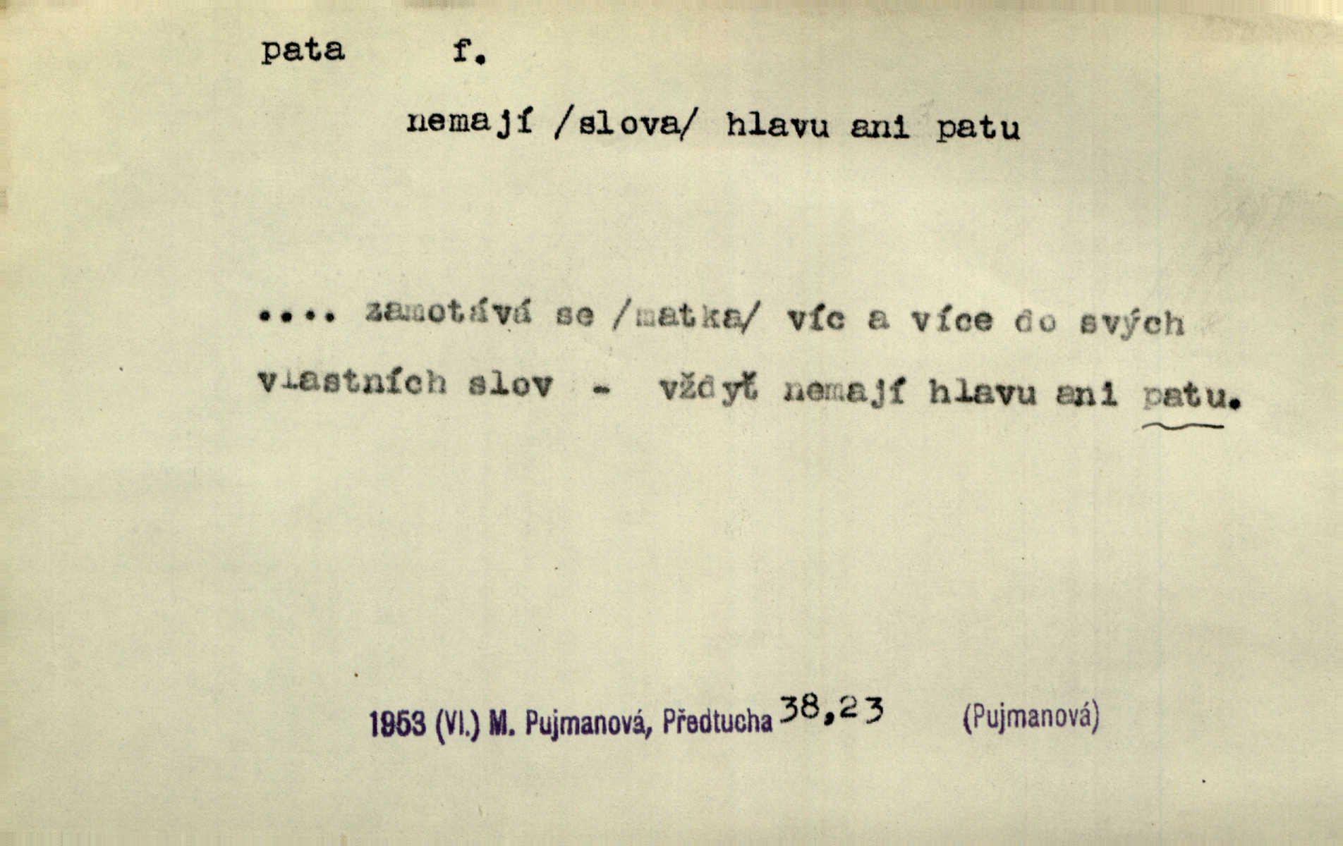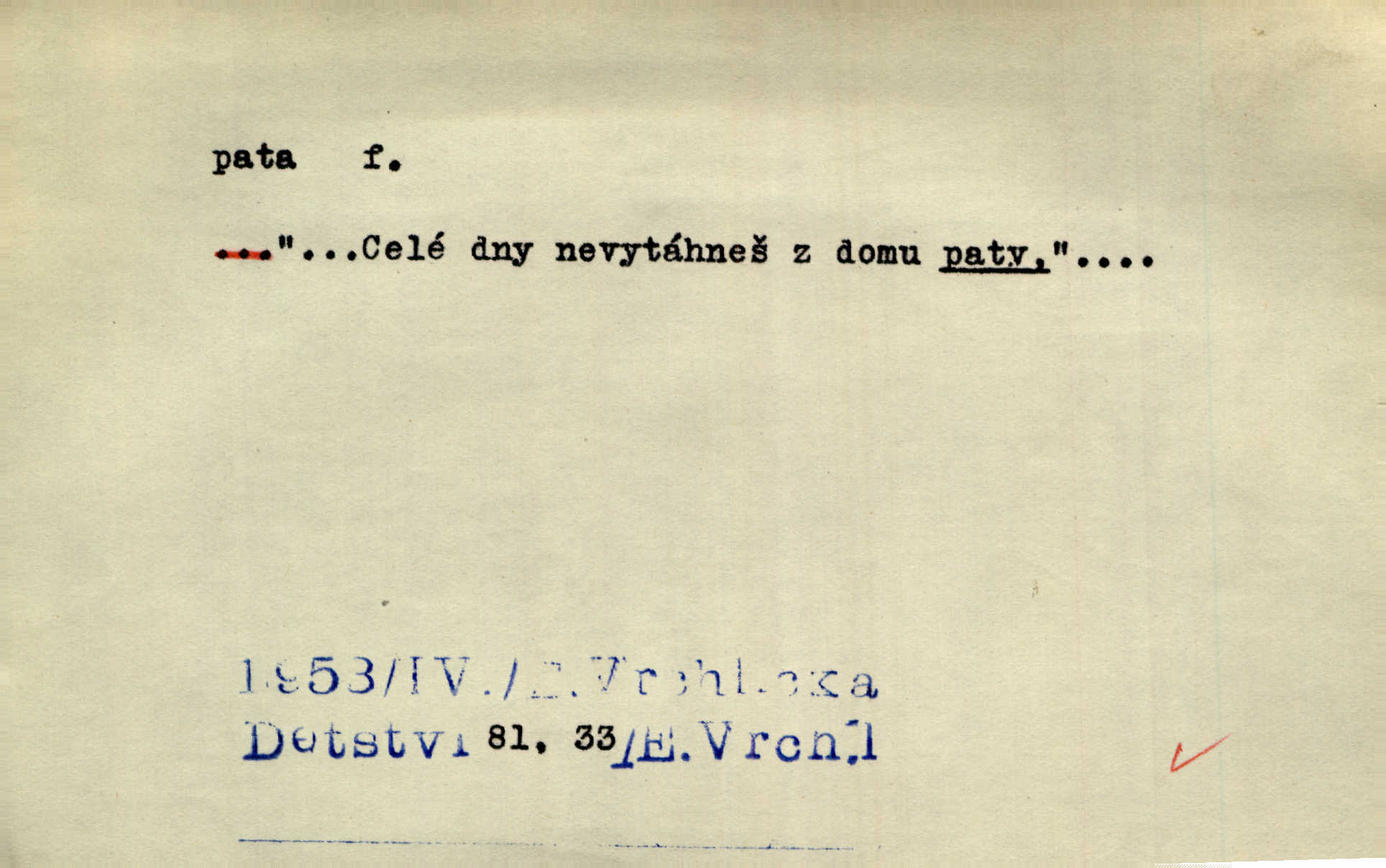 - pata, -y f. nejzadnější část chodidla nohy s výstupkem nazad přečnívajícím. Přitisknuv k sobě kolena strkal paty do zadu. Jir. Šel vážně, klada paty hodně k sobě. Jir. Veník radostí se otočil na pravé patě. Hál. Mistr se otočil na patě a běžel domů. Herrm. Jste knížeti nepohodlnými sousedy jako trn v patě. Hol. Jeden nebo dva srnci, které se mu podařilo upytlačiti, nebyli by mu vytrhli trn z paty nepomohli z tísně. Vrba. Stopa je obrácena patou k silnici; kdo ji udělal, šel tímto směrem otiskem paty. K. Čap. Šedý šat pokrýval jeho postavu od hlavy až k patám celou. Něm. Panímáma přehlížela syna od hlavy k patě. Rais. Ale jdi, brebto, vždyť to nemá paty ani hlavy, co žvatláš nemá smyslu. Šim. Báseň mívá hlavu a patu dobrý smysl. Mach. To psaní má hlavu i patu. Pekárek. Nepřítel je nám v patách těsně za námi. Zey. Téměř v patách za panem Vorlíčkem vstoupil bez zaklepání jiný pán. Krás. Msta v patách kráčí jeho činu. Mácha. Co pořád se jí věší na paty, když vidí, že ho ráda nemá chodí ustavičně za ní. Jir. Bída věšela se mu na paty pronásledovala jej. Baar. Za každou laní šel její kolouch — takový hloupý ještě, zrovna se mámě lepil na paty šel těsně za ní. Vrba. Všem třem se vytrvale lepí smůla na paty pronásleduje je neštěstí. Sez. Musím se bát vytáhnout paty z pokoje odejít. Kun. Selka nemešká, sebere košík a zdvihá paty, jako by prášil utíká. Něm. „Hale kde je Srna?“ „Vysekal se patama“ utekl. Něm. Není za těžko v širém poli za noci ukázati někomu paty utéci, zmizeti. Jan. Šťasten, kdo může v této době [letního vedra] okázat městu paty! Čech. Z domu mi ovšem vyndáte paty vyženete mne. Neff. Fána vyprovázela poslední hosty. Paní Šustrová hleděla s radostí oběma pánům na paty radovala se z jejich odchodu. Herrm. Utíkal [pytlák] do lesa, jako by mu paty namydlil velmi rychle. Šmil. Snad i s čertem by se byl spojil, aby udolal ty, co mu „šlapali na paty“ jej pronásledovali. A. Mrš. On si na toho kluka dá pozor, bude mu šlapat na paty a koukat na prsty prožene ho. Vrba. Nestavte se na paty, Pánbůh pýchu vidí nenaparujte se! Rais. Hrdina ten vzal do zaječích po způsobu všech reků, kteří platí patami utekou aniž zaplatí. Mach. Div že Pánubohu paty nehukúsala, jak se modlila byla přepjatě nábožná. Něm. Lichvařil a utiskoval lid, ale jinak si mohl paty o kostel ubrousit stále chodil do kostela. Svět. Paty si mohla uběhat. Vrba. Všecky selky si mohly utlouci paty, snášejíce na faru kde co. Vrba. Tys tomu dal! Holečku, daleko pata oka zmýlil ses! Něm. Ty rozum v patě máš, jenž na kuří ti oka dostačí jsi hloupý. Hál. Je pořádně střelená do paty potrhlá. Šim. Dostali své peníze, a jak práce jejich vypadá, to jim ani v patě neleželo pranic jim na tom nezáleželo. Herb. Bufkovi hoří koudel za patami je v úzkých. Vrba. Jak Pánbůh dopustí jeden rok a přijde pád nebo kroupy anebo nepohoda, je sedlák na patách na mizině. M. Jahn. Satirik napad kdysi kohosi, šíp vehnav jemu v patu Achillovu napadl ho na slabém jeho místě. Mach. Vodička obuvník také je zasažen ve své achillovské patě. Bouš. Ctižádost stala se jeho patou Achillovou slabou stránkou. Kun. Tu vězí Achillova pata Zákrejsovy veselohry slabina. Osv. Byli to bojovníci zvyklí pohrdati zásadně slovanským obyvatelstvem, které pod jejich obrněnou patou hynulo. Šus. Arch. Legie vedené Trajanem zarazily tu patu svou, aby vyvrátily říši dáckého Decebala zastavily se. Jir. Byly časy, kdy Turek zatknul patu na samé Cetyni usadil se. Hol. Zool. prvý chodidlový článek včel, metatarsus. D Bás. noha. Vše jiné kol a cizích lidí pata sen mého mládí šlape přeblahý. Čech. Zdálo se mu [hochovi]‚ zlatý že kvítek vyskočí, kam vstoupí její [dívčiny] paty. Klášt. D část boty, punčochy a pod., navlékaná na patu lidské nohy. Vysoká turecká bota je víc punčochou než botou, jeť holinka, nárt i podšev z jediného kusu, pata na ní trochu vycpána. Ner. Křížková spravovala na patách roztrhané punčochy. Svob. Já jsem byla pilná, celou patu [punčochy] jsem udělala. Štěp. D dolení část něčeho, co se vypíná, strmí do výše, úpatí, spodek, spodní kraj. Jsme u paty hory Golgothy. Ner. Na vrchu vysokém, jenž ve vodách své paty koupá, prastarý stál hrad. Zey. Po úbočí chlumu až k patě rozkládá se vesnice. Mach. U paty pahrbku zastavila koně. Zey. Do pat těch skal narážejí prudké vlny. Jir. U paty věže klíčník otvírá vrata. Heyd. Španělské schody vzhůru vedou. U jejich paty třpytila se voda v bizarrním fontánu. Zey. Adámková se skácela k zemi. Padla právě k patám krucifixu. Vach. U paty vítězných stěžnů [v Benátkách] válí se zaháleči. Ner. Vysoké stromy osvětleny byly od paty až do vrcholků narudlým sluncem. Svob. U paty lesa byl veliký dub na okraji. Něm. Stav. dolení část nějaké stavby n. její část; pata hráze, náspu, pilíře a pod. D zadní, spodní, okrajová n. ukončující část nějakého předmětu, patka. Na dláždění zařinčely paty ručnic. J. z Hv. „Paty“ vorů, kláda ke kládě spojovaly se „pobíječkami“. Mor. Paty lyží jsou zvednuty, to znamená, že při pohybu kupředu na rovině nebo do kopce musíte se dostávat většinou silou rukou. Zlín. Ze semen, jimž byl odříznut zaoblený konec (pata semene), vyrůstala nejprve část s dělohami. Č. les. Představený ukrojil si zlatou patu bochníka patku. Hol. Tech. spodní část předmětu n. nějaké součásti; pata kolejnic patka; pata ložiska, zubu a pod. D Geom. pata kolmice průsečík kolmice s danou přímkou.