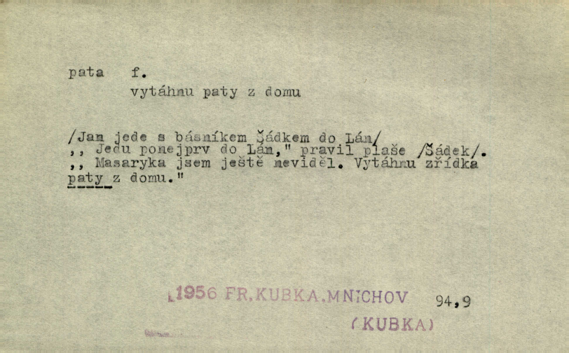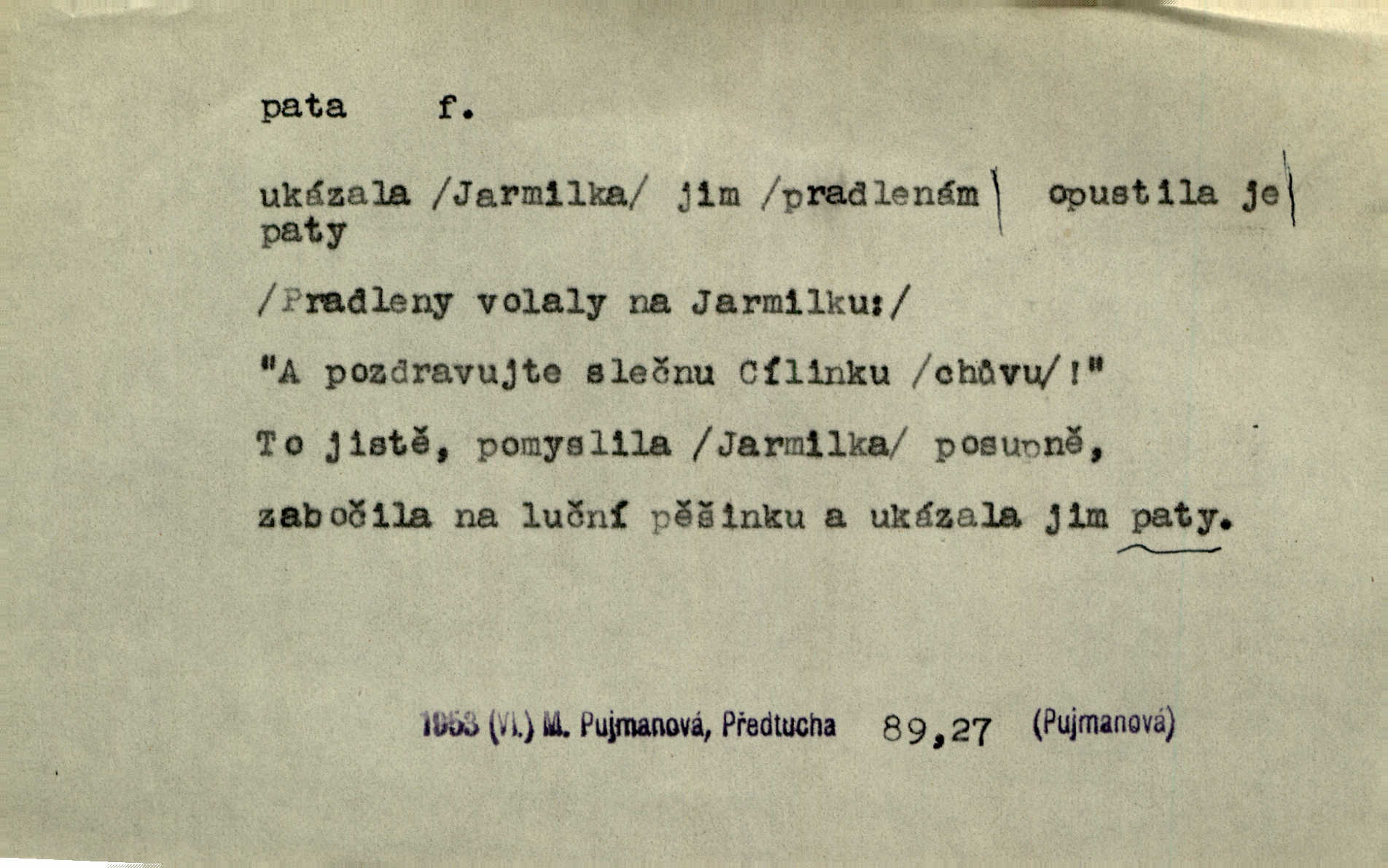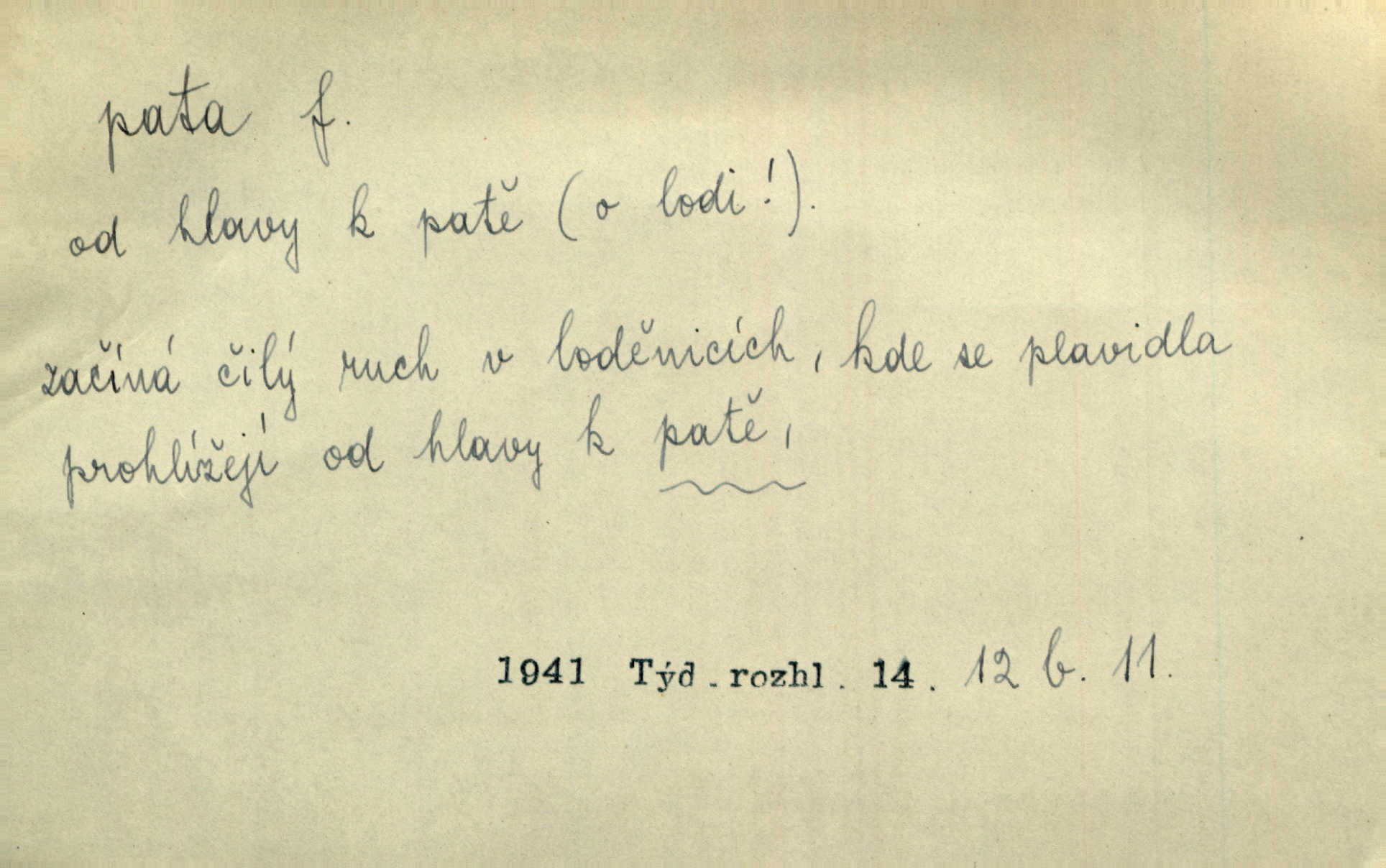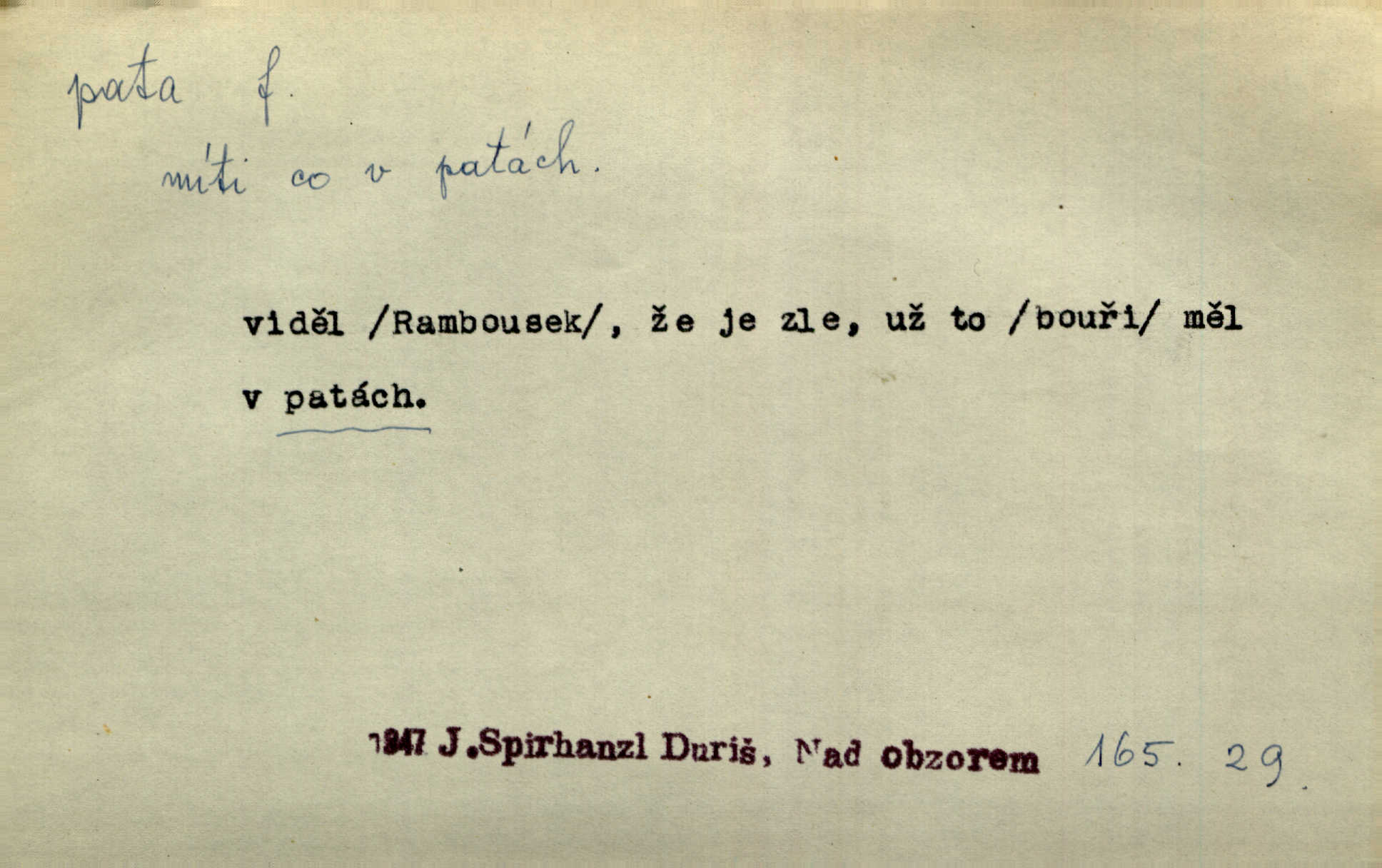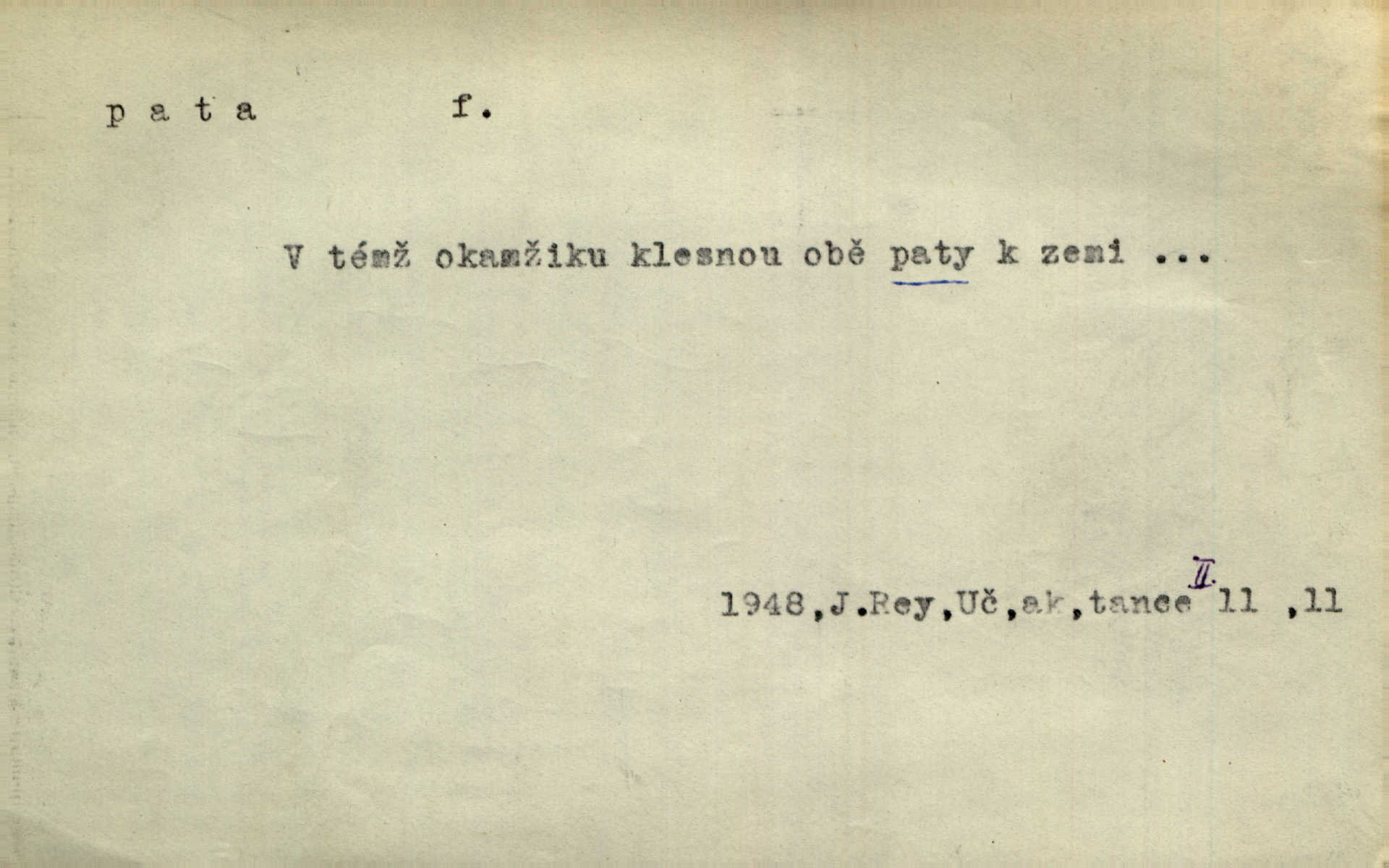 - pata, -y f. nejzadnější část chodidla nohy s výstupkem nazad přečnívajícím. Přitisknuv k sobě kolena strkal paty do zadu. Jir. Šel vážně, klada paty hodně k sobě. Jir. Veník radostí se otočil na pravé patě. Hál. Mistr se otočil na patě a běžel domů. Herrm. Jste knížeti nepohodlnými sousedy jako trn v patě. Hol. Jeden nebo dva srnci, které se mu podařilo upytlačiti, nebyli by mu vytrhli trn z paty nepomohli z tísně. Vrba. Stopa je obrácena patou k silnici; kdo ji udělal, šel tímto směrem otiskem paty. K. Čap. Šedý šat pokrýval jeho postavu od hlavy až k patám celou. Něm. Panímáma přehlížela syna od hlavy k patě. Rais. Ale jdi, brebto, vždyť to nemá paty ani hlavy, co žvatláš nemá smyslu. Šim. Báseň mívá hlavu a patu dobrý smysl. Mach. To psaní má hlavu i patu. Pekárek. Nepřítel je nám v patách těsně za námi. Zey. Téměř v patách za panem Vorlíčkem vstoupil bez zaklepání jiný pán. Krás. Msta v patách kráčí jeho činu. Mácha. Co pořád se jí věší na paty, když vidí, že ho ráda nemá chodí ustavičně za ní. Jir. Bída věšela se mu na paty pronásledovala jej. Baar. Za každou laní šel její kolouch — takový hloupý ještě, zrovna se mámě lepil na paty šel těsně za ní. Vrba. Všem třem se vytrvale lepí smůla na paty pronásleduje je neštěstí. Sez. Musím se bát vytáhnout paty z pokoje odejít. Kun. Selka nemešká, sebere košík a zdvihá paty, jako by prášil utíká. Něm. „Hale kde je Srna?“ „Vysekal se patama“ utekl. Něm. Není za těžko v širém poli za noci ukázati někomu paty utéci, zmizeti. Jan. Šťasten, kdo může v této době [letního vedra] okázat městu paty! Čech. Z domu mi ovšem vyndáte paty vyženete mne. Neff. Fána vyprovázela poslední hosty. Paní Šustrová hleděla s radostí oběma pánům na paty radovala se z jejich odchodu. Herrm. Utíkal [pytlák] do lesa, jako by mu paty namydlil velmi rychle. Šmil. Snad i s čertem by se byl spojil, aby udolal ty, co mu „šlapali na paty“ jej pronásledovali. A. Mrš. On si na toho kluka dá pozor, bude mu šlapat na paty a koukat na prsty prožene ho. Vrba. Nestavte se na paty, Pánbůh pýchu vidí nenaparujte se! Rais. Hrdina ten vzal do zaječích po způsobu všech reků, kteří platí patami utekou aniž zaplatí. Mach. Div že Pánubohu paty nehukúsala, jak se modlila byla přepjatě nábožná. Něm. Lichvařil a utiskoval lid, ale jinak si mohl paty o kostel ubrousit stále chodil do kostela. Svět. Paty si mohla uběhat. Vrba. Všecky selky si mohly utlouci paty, snášejíce na faru kde co. Vrba. Tys tomu dal! Holečku, daleko pata oka zmýlil ses! Něm. Ty rozum v patě máš, jenž na kuří ti oka dostačí jsi hloupý. Hál. Je pořádně střelená do paty potrhlá. Šim. Dostali své peníze, a jak práce jejich vypadá, to jim ani v patě neleželo pranic jim na tom nezáleželo. Herb. Bufkovi hoří koudel za patami je v úzkých. Vrba. Jak Pánbůh dopustí jeden rok a přijde pád nebo kroupy anebo nepohoda, je sedlák na patách na mizině. M. Jahn. Satirik napad kdysi kohosi, šíp vehnav jemu v patu Achillovu napadl ho na slabém jeho místě. Mach. Vodička obuvník také je zasažen ve své achillovské patě. Bouš. Ctižádost stala se jeho patou Achillovou slabou stránkou. Kun. Tu vězí Achillova pata Zákrejsovy veselohry slabina. Osv. Byli to bojovníci zvyklí pohrdati zásadně slovanským obyvatelstvem, které pod jejich obrněnou patou hynulo. Šus. Arch. Legie vedené Trajanem zarazily tu patu svou, aby vyvrátily říši dáckého Decebala zastavily se. Jir. Byly časy, kdy Turek zatknul patu na samé Cetyni usadil se. Hol. Zool. prvý chodidlový článek včel, metatarsus. D Bás. noha. Vše jiné kol a cizích lidí pata sen mého mládí šlape přeblahý. Čech. Zdálo se mu [hochovi]‚ zlatý že kvítek vyskočí, kam vstoupí její [dívčiny] paty. Klášt. D část boty, punčochy a pod., navlékaná na patu lidské nohy. Vysoká turecká bota je víc punčochou než botou, jeť holinka, nárt i podšev z jediného kusu, pata na ní trochu vycpána. Ner. Křížková spravovala na patách roztrhané punčochy. Svob. Já jsem byla pilná, celou patu [punčochy] jsem udělala. Štěp. D dolení část něčeho, co se vypíná, strmí do výše, úpatí, spodek, spodní kraj. Jsme u paty hory Golgothy. Ner. Na vrchu vysokém, jenž ve vodách své paty koupá, prastarý stál hrad. Zey. Po úbočí chlumu až k patě rozkládá se vesnice. Mach. U paty pahrbku zastavila koně. Zey. Do pat těch skal narážejí prudké vlny. Jir. U paty věže klíčník otvírá vrata. Heyd. Španělské schody vzhůru vedou. U jejich paty třpytila se voda v bizarrním fontánu. Zey. Adámková se skácela k zemi. Padla právě k patám krucifixu. Vach. U paty vítězných stěžnů [v Benátkách] válí se zaháleči. Ner. Vysoké stromy osvětleny byly od paty až do vrcholků narudlým sluncem. Svob. U paty lesa byl veliký dub na okraji. Něm. Stav. dolení část nějaké stavby n. její část; pata hráze, náspu, pilíře a pod. D zadní, spodní, okrajová n. ukončující část nějakého předmětu, patka. Na dláždění zařinčely paty ručnic. J. z Hv. „Paty“ vorů, kláda ke kládě spojovaly se „pobíječkami“. Mor. Paty lyží jsou zvednuty, to znamená, že při pohybu kupředu na rovině nebo do kopce musíte se dostávat většinou silou rukou. Zlín. Ze semen, jimž byl odříznut zaoblený konec (pata semene), vyrůstala nejprve část s dělohami. Č. les. Představený ukrojil si zlatou patu bochníka patku. Hol. Tech. spodní část předmětu n. nějaké součásti; pata kolejnic patka; pata ložiska, zubu a pod. D Geom. pata kolmice průsečík kolmice s danou přímkou.