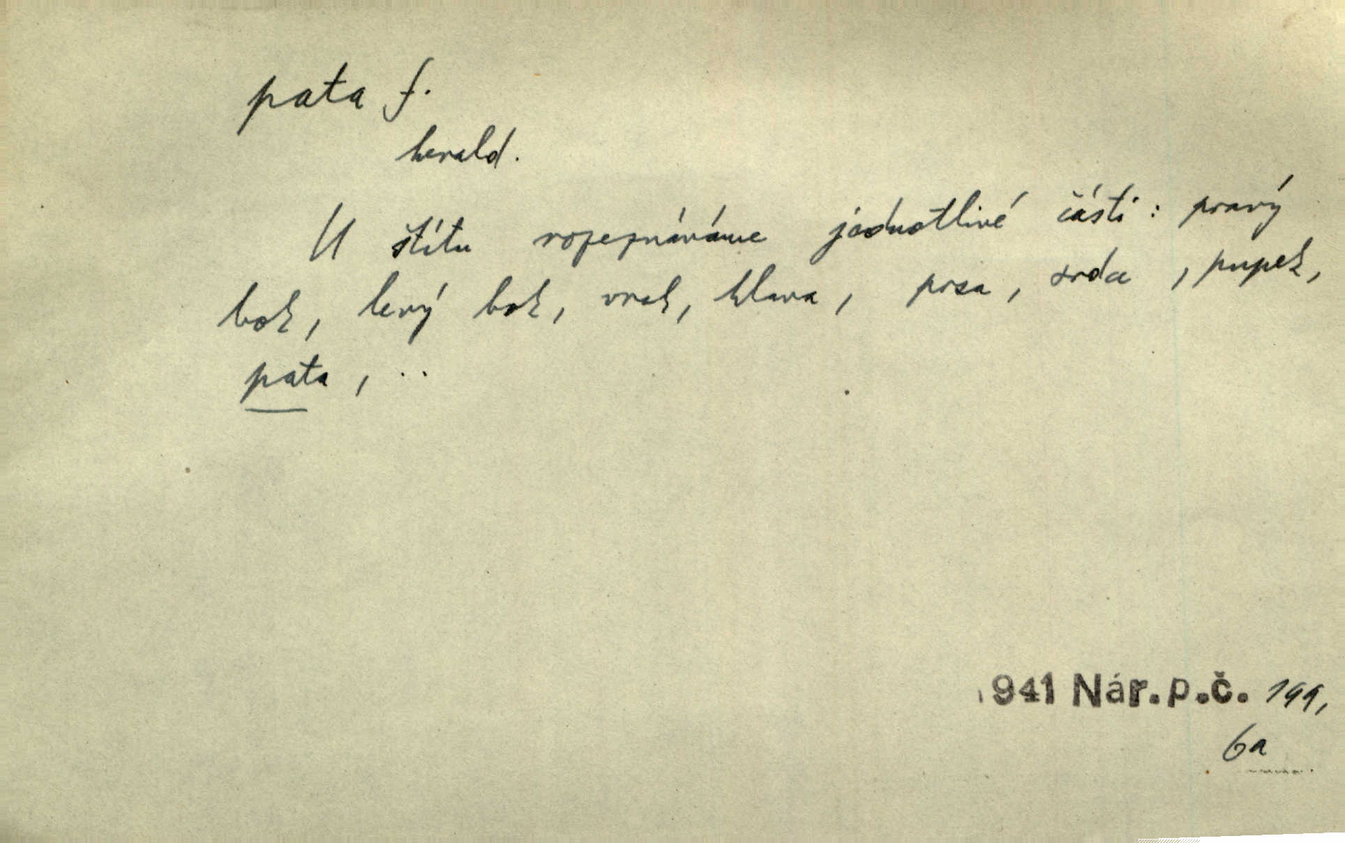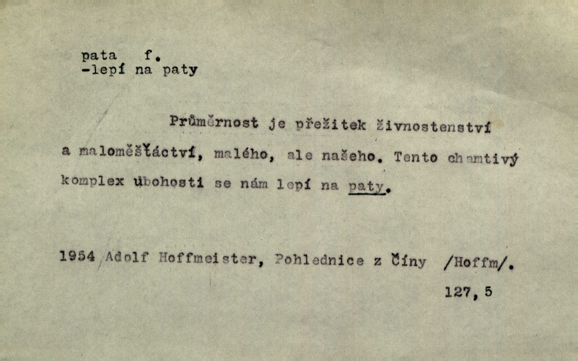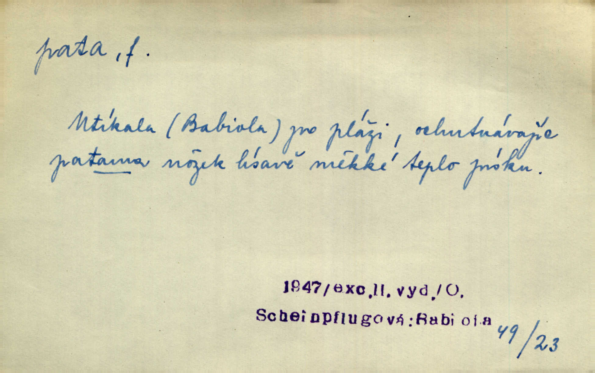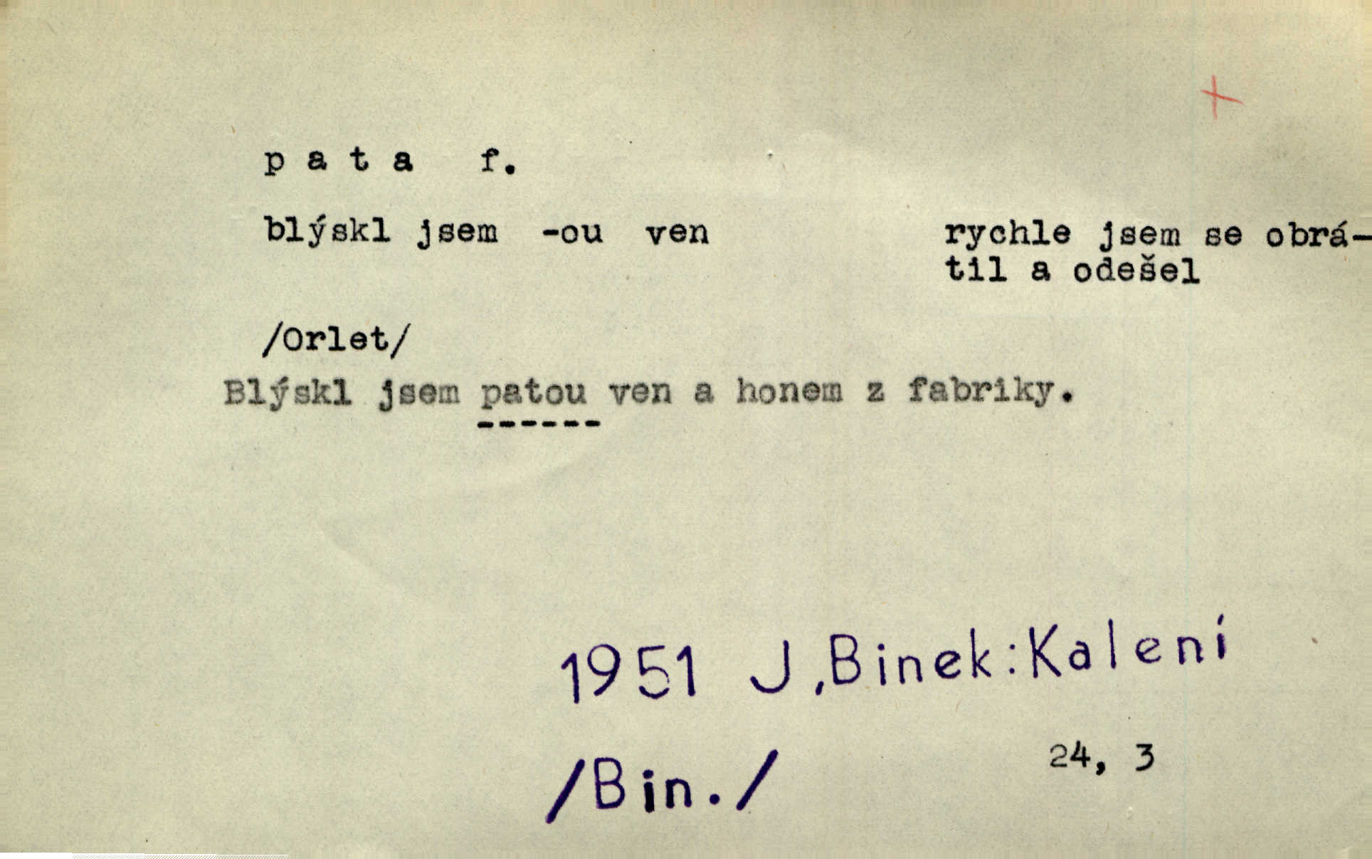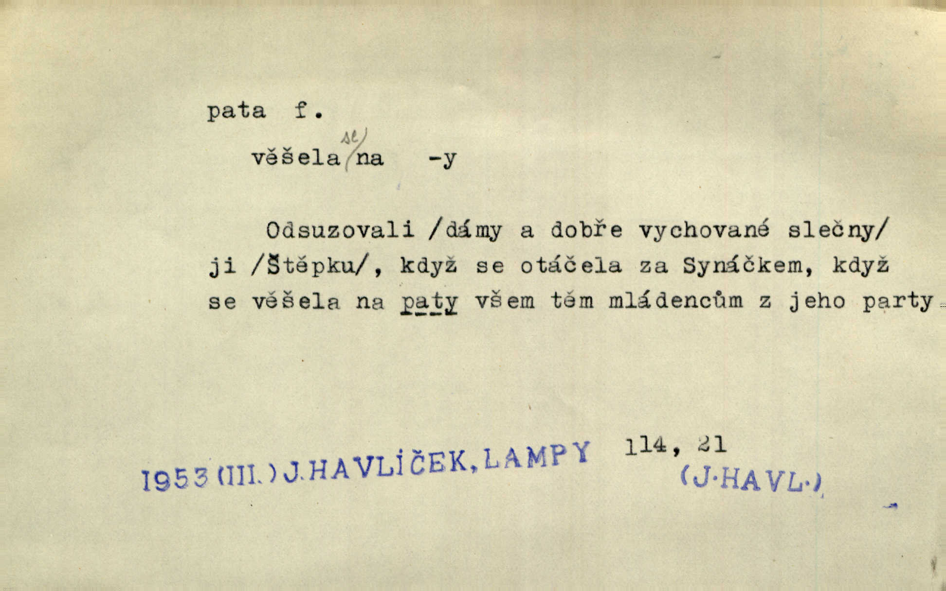 - pata, -y f. nejzadnější část chodidla nohy s výstupkem nazad přečnívajícím. Přitisknuv k sobě kolena strkal paty do zadu. Jir. Šel vážně, klada paty hodně k sobě. Jir. Veník radostí se otočil na pravé patě. Hál. Mistr se otočil na patě a běžel domů. Herrm. Jste knížeti nepohodlnými sousedy jako trn v patě. Hol. Jeden nebo dva srnci, které se mu podařilo upytlačiti, nebyli by mu vytrhli trn z paty nepomohli z tísně. Vrba. Stopa je obrácena patou k silnici; kdo ji udělal, šel tímto směrem otiskem paty. K. Čap. Šedý šat pokrýval jeho postavu od hlavy až k patám celou. Něm. Panímáma přehlížela syna od hlavy k patě. Rais. Ale jdi, brebto, vždyť to nemá paty ani hlavy, co žvatláš nemá smyslu. Šim. Báseň mívá hlavu a patu dobrý smysl. Mach. To psaní má hlavu i patu. Pekárek. Nepřítel je nám v patách těsně za námi. Zey. Téměř v patách za panem Vorlíčkem vstoupil bez zaklepání jiný pán. Krás. Msta v patách kráčí jeho činu. Mácha. Co pořád se jí věší na paty, když vidí, že ho ráda nemá chodí ustavičně za ní. Jir. Bída věšela se mu na paty pronásledovala jej. Baar. Za každou laní šel její kolouch — takový hloupý ještě, zrovna se mámě lepil na paty šel těsně za ní. Vrba. Všem třem se vytrvale lepí smůla na paty pronásleduje je neštěstí. Sez. Musím se bát vytáhnout paty z pokoje odejít. Kun. Selka nemešká, sebere košík a zdvihá paty, jako by prášil utíká. Něm. „Hale kde je Srna?“ „Vysekal se patama“ utekl. Něm. Není za těžko v širém poli za noci ukázati někomu paty utéci, zmizeti. Jan. Šťasten, kdo může v této době [letního vedra] okázat městu paty! Čech. Z domu mi ovšem vyndáte paty vyženete mne. Neff. Fána vyprovázela poslední hosty. Paní Šustrová hleděla s radostí oběma pánům na paty radovala se z jejich odchodu. Herrm. Utíkal [pytlák] do lesa, jako by mu paty namydlil velmi rychle. Šmil. Snad i s čertem by se byl spojil, aby udolal ty, co mu „šlapali na paty“ jej pronásledovali. A. Mrš. On si na toho kluka dá pozor, bude mu šlapat na paty a koukat na prsty prožene ho. Vrba. Nestavte se na paty, Pánbůh pýchu vidí nenaparujte se! Rais. Hrdina ten vzal do zaječích po způsobu všech reků, kteří platí patami utekou aniž zaplatí. Mach. Div že Pánubohu paty nehukúsala, jak se modlila byla přepjatě nábožná. Něm. Lichvařil a utiskoval lid, ale jinak si mohl paty o kostel ubrousit stále chodil do kostela. Svět. Paty si mohla uběhat. Vrba. Všecky selky si mohly utlouci paty, snášejíce na faru kde co. Vrba. Tys tomu dal! Holečku, daleko pata oka zmýlil ses! Něm. Ty rozum v patě máš, jenž na kuří ti oka dostačí jsi hloupý. Hál. Je pořádně střelená do paty potrhlá. Šim. Dostali své peníze, a jak práce jejich vypadá, to jim ani v patě neleželo pranic jim na tom nezáleželo. Herb. Bufkovi hoří koudel za patami je v úzkých. Vrba. Jak Pánbůh dopustí jeden rok a přijde pád nebo kroupy anebo nepohoda, je sedlák na patách na mizině. M. Jahn. Satirik napad kdysi kohosi, šíp vehnav jemu v patu Achillovu napadl ho na slabém jeho místě. Mach. Vodička obuvník také je zasažen ve své achillovské patě. Bouš. Ctižádost stala se jeho patou Achillovou slabou stránkou. Kun. Tu vězí Achillova pata Zákrejsovy veselohry slabina. Osv. Byli to bojovníci zvyklí pohrdati zásadně slovanským obyvatelstvem, které pod jejich obrněnou patou hynulo. Šus. Arch. Legie vedené Trajanem zarazily tu patu svou, aby vyvrátily říši dáckého Decebala zastavily se. Jir. Byly časy, kdy Turek zatknul patu na samé Cetyni usadil se. Hol. Zool. prvý chodidlový článek včel, metatarsus. D Bás. noha. Vše jiné kol a cizích lidí pata sen mého mládí šlape přeblahý. Čech. Zdálo se mu [hochovi]‚ zlatý že kvítek vyskočí, kam vstoupí její [dívčiny] paty. Klášt. D část boty, punčochy a pod., navlékaná na patu lidské nohy. Vysoká turecká bota je víc punčochou než botou, jeť holinka, nárt i podšev z jediného kusu, pata na ní trochu vycpána. Ner. Křížková spravovala na patách roztrhané punčochy. Svob. Já jsem byla pilná, celou patu [punčochy] jsem udělala. Štěp. D dolení část něčeho, co se vypíná, strmí do výše, úpatí, spodek, spodní kraj. Jsme u paty hory Golgothy. Ner. Na vrchu vysokém, jenž ve vodách své paty koupá, prastarý stál hrad. Zey. Po úbočí chlumu až k patě rozkládá se vesnice. Mach. U paty pahrbku zastavila koně. Zey. Do pat těch skal narážejí prudké vlny. Jir. U paty věže klíčník otvírá vrata. Heyd. Španělské schody vzhůru vedou. U jejich paty třpytila se voda v bizarrním fontánu. Zey. Adámková se skácela k zemi. Padla právě k patám krucifixu. Vach. U paty vítězných stěžnů [v Benátkách] válí se zaháleči. Ner. Vysoké stromy osvětleny byly od paty až do vrcholků narudlým sluncem. Svob. U paty lesa byl veliký dub na okraji. Něm. Stav. dolení část nějaké stavby n. její část; pata hráze, náspu, pilíře a pod. D zadní, spodní, okrajová n. ukončující část nějakého předmětu, patka. Na dláždění zařinčely paty ručnic. J. z Hv. „Paty“ vorů, kláda ke kládě spojovaly se „pobíječkami“. Mor. Paty lyží jsou zvednuty, to znamená, že při pohybu kupředu na rovině nebo do kopce musíte se dostávat většinou silou rukou. Zlín. Ze semen, jimž byl odříznut zaoblený konec (pata semene), vyrůstala nejprve část s dělohami. Č. les. Představený ukrojil si zlatou patu bochníka patku. Hol. Tech. spodní část předmětu n. nějaké součásti; pata kolejnic patka; pata ložiska, zubu a pod. D Geom. pata kolmice průsečík kolmice s danou přímkou.