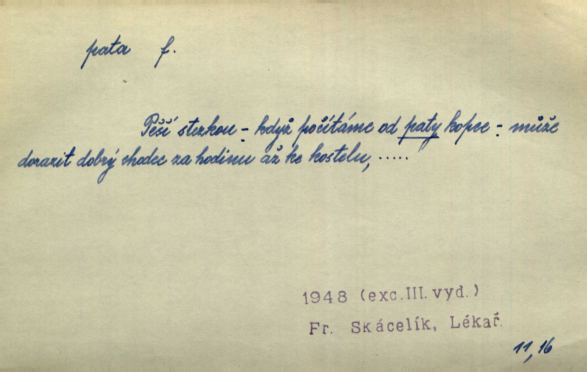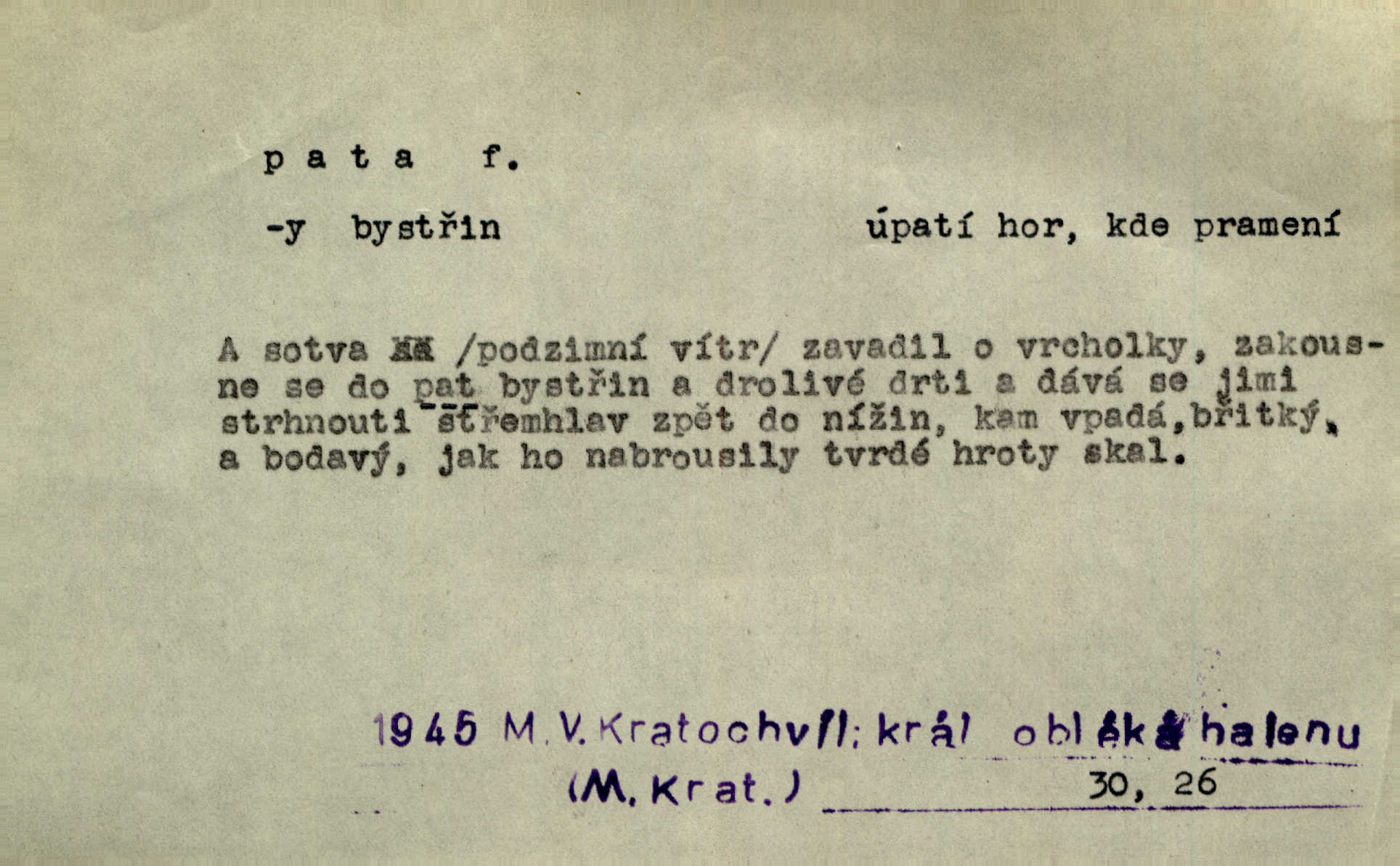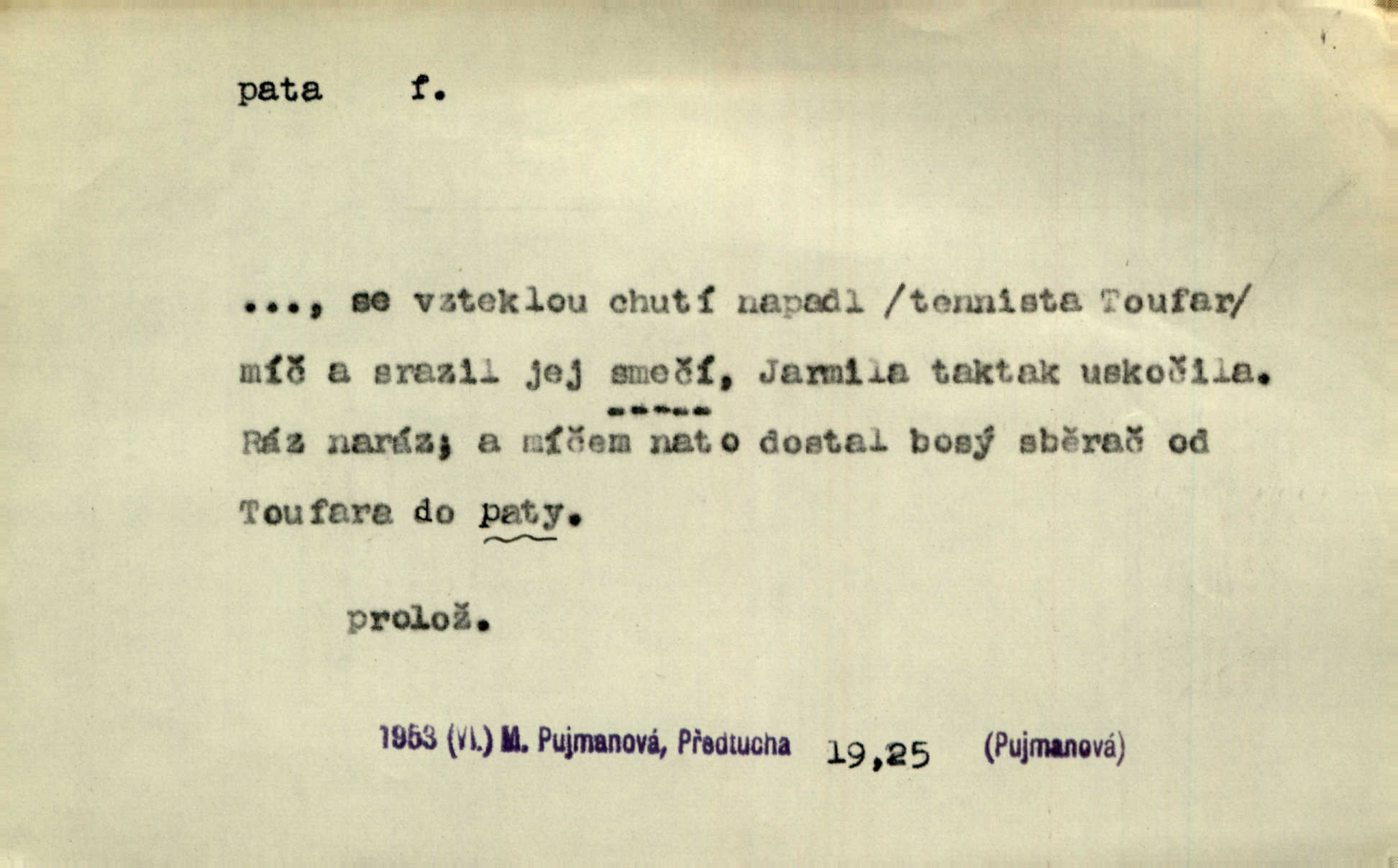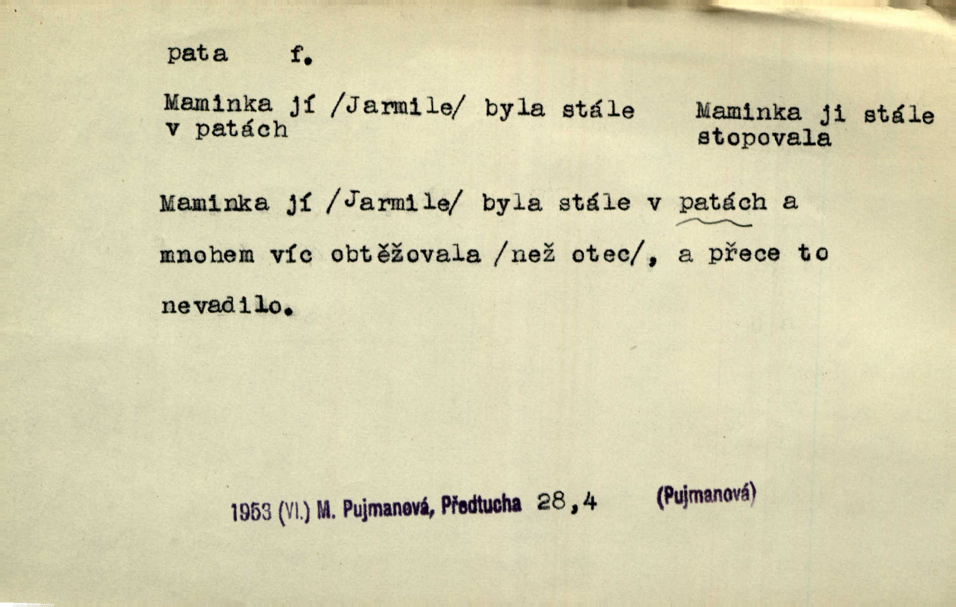 - pata, -y f. nejzadnější část chodidla nohy s výstupkem nazad přečnívajícím. Přitisknuv k sobě kolena strkal paty do zadu. Jir. Šel vážně, klada paty hodně k sobě. Jir. Veník radostí se otočil na pravé patě. Hál. Mistr se otočil na patě a běžel domů. Herrm. Jste knížeti nepohodlnými sousedy jako trn v patě. Hol. Jeden nebo dva srnci, které se mu podařilo upytlačiti, nebyli by mu vytrhli trn z paty nepomohli z tísně. Vrba. Stopa je obrácena patou k silnici; kdo ji udělal, šel tímto směrem otiskem paty. K. Čap. Šedý šat pokrýval jeho postavu od hlavy až k patám celou. Něm. Panímáma přehlížela syna od hlavy k patě. Rais. Ale jdi, brebto, vždyť to nemá paty ani hlavy, co žvatláš nemá smyslu. Šim. Báseň mívá hlavu a patu dobrý smysl. Mach. To psaní má hlavu i patu. Pekárek. Nepřítel je nám v patách těsně za námi. Zey. Téměř v patách za panem Vorlíčkem vstoupil bez zaklepání jiný pán. Krás. Msta v patách kráčí jeho činu. Mácha. Co pořád se jí věší na paty, když vidí, že ho ráda nemá chodí ustavičně za ní. Jir. Bída věšela se mu na paty pronásledovala jej. Baar. Za každou laní šel její kolouch — takový hloupý ještě, zrovna se mámě lepil na paty šel těsně za ní. Vrba. Všem třem se vytrvale lepí smůla na paty pronásleduje je neštěstí. Sez. Musím se bát vytáhnout paty z pokoje odejít. Kun. Selka nemešká, sebere košík a zdvihá paty, jako by prášil utíká. Něm. „Hale kde je Srna?“ „Vysekal se patama“ utekl. Něm. Není za těžko v širém poli za noci ukázati někomu paty utéci, zmizeti. Jan. Šťasten, kdo může v této době [letního vedra] okázat městu paty! Čech. Z domu mi ovšem vyndáte paty vyženete mne. Neff. Fána vyprovázela poslední hosty. Paní Šustrová hleděla s radostí oběma pánům na paty radovala se z jejich odchodu. Herrm. Utíkal [pytlák] do lesa, jako by mu paty namydlil velmi rychle. Šmil. Snad i s čertem by se byl spojil, aby udolal ty, co mu „šlapali na paty“ jej pronásledovali. A. Mrš. On si na toho kluka dá pozor, bude mu šlapat na paty a koukat na prsty prožene ho. Vrba. Nestavte se na paty, Pánbůh pýchu vidí nenaparujte se! Rais. Hrdina ten vzal do zaječích po způsobu všech reků, kteří platí patami utekou aniž zaplatí. Mach. Div že Pánubohu paty nehukúsala, jak se modlila byla přepjatě nábožná. Něm. Lichvařil a utiskoval lid, ale jinak si mohl paty o kostel ubrousit stále chodil do kostela. Svět. Paty si mohla uběhat. Vrba. Všecky selky si mohly utlouci paty, snášejíce na faru kde co. Vrba. Tys tomu dal! Holečku, daleko pata oka zmýlil ses! Něm. Ty rozum v patě máš, jenž na kuří ti oka dostačí jsi hloupý. Hál. Je pořádně střelená do paty potrhlá. Šim. Dostali své peníze, a jak práce jejich vypadá, to jim ani v patě neleželo pranic jim na tom nezáleželo. Herb. Bufkovi hoří koudel za patami je v úzkých. Vrba. Jak Pánbůh dopustí jeden rok a přijde pád nebo kroupy anebo nepohoda, je sedlák na patách na mizině. M. Jahn. Satirik napad kdysi kohosi, šíp vehnav jemu v patu Achillovu napadl ho na slabém jeho místě. Mach. Vodička obuvník také je zasažen ve své achillovské patě. Bouš. Ctižádost stala se jeho patou Achillovou slabou stránkou. Kun. Tu vězí Achillova pata Zákrejsovy veselohry slabina. Osv. Byli to bojovníci zvyklí pohrdati zásadně slovanským obyvatelstvem, které pod jejich obrněnou patou hynulo. Šus. Arch. Legie vedené Trajanem zarazily tu patu svou, aby vyvrátily říši dáckého Decebala zastavily se. Jir. Byly časy, kdy Turek zatknul patu na samé Cetyni usadil se. Hol. Zool. prvý chodidlový článek včel, metatarsus. D Bás. noha. Vše jiné kol a cizích lidí pata sen mého mládí šlape přeblahý. Čech. Zdálo se mu [hochovi]‚ zlatý že kvítek vyskočí, kam vstoupí její [dívčiny] paty. Klášt. D část boty, punčochy a pod., navlékaná na patu lidské nohy. Vysoká turecká bota je víc punčochou než botou, jeť holinka, nárt i podšev z jediného kusu, pata na ní trochu vycpána. Ner. Křížková spravovala na patách roztrhané punčochy. Svob. Já jsem byla pilná, celou patu [punčochy] jsem udělala. Štěp. D dolení část něčeho, co se vypíná, strmí do výše, úpatí, spodek, spodní kraj. Jsme u paty hory Golgothy. Ner. Na vrchu vysokém, jenž ve vodách své paty koupá, prastarý stál hrad. Zey. Po úbočí chlumu až k patě rozkládá se vesnice. Mach. U paty pahrbku zastavila koně. Zey. Do pat těch skal narážejí prudké vlny. Jir. U paty věže klíčník otvírá vrata. Heyd. Španělské schody vzhůru vedou. U jejich paty třpytila se voda v bizarrním fontánu. Zey. Adámková se skácela k zemi. Padla právě k patám krucifixu. Vach. U paty vítězných stěžnů [v Benátkách] válí se zaháleči. Ner. Vysoké stromy osvětleny byly od paty až do vrcholků narudlým sluncem. Svob. U paty lesa byl veliký dub na okraji. Něm. Stav. dolení část nějaké stavby n. její část; pata hráze, náspu, pilíře a pod. D zadní, spodní, okrajová n. ukončující část nějakého předmětu, patka. Na dláždění zařinčely paty ručnic. J. z Hv. „Paty“ vorů, kláda ke kládě spojovaly se „pobíječkami“. Mor. Paty lyží jsou zvednuty, to znamená, že při pohybu kupředu na rovině nebo do kopce musíte se dostávat většinou silou rukou. Zlín. Ze semen, jimž byl odříznut zaoblený konec (pata semene), vyrůstala nejprve část s dělohami. Č. les. Představený ukrojil si zlatou patu bochníka patku. Hol. Tech. spodní část předmětu n. nějaké součásti; pata kolejnic patka; pata ložiska, zubu a pod. D Geom. pata kolmice průsečík kolmice s danou přímkou.