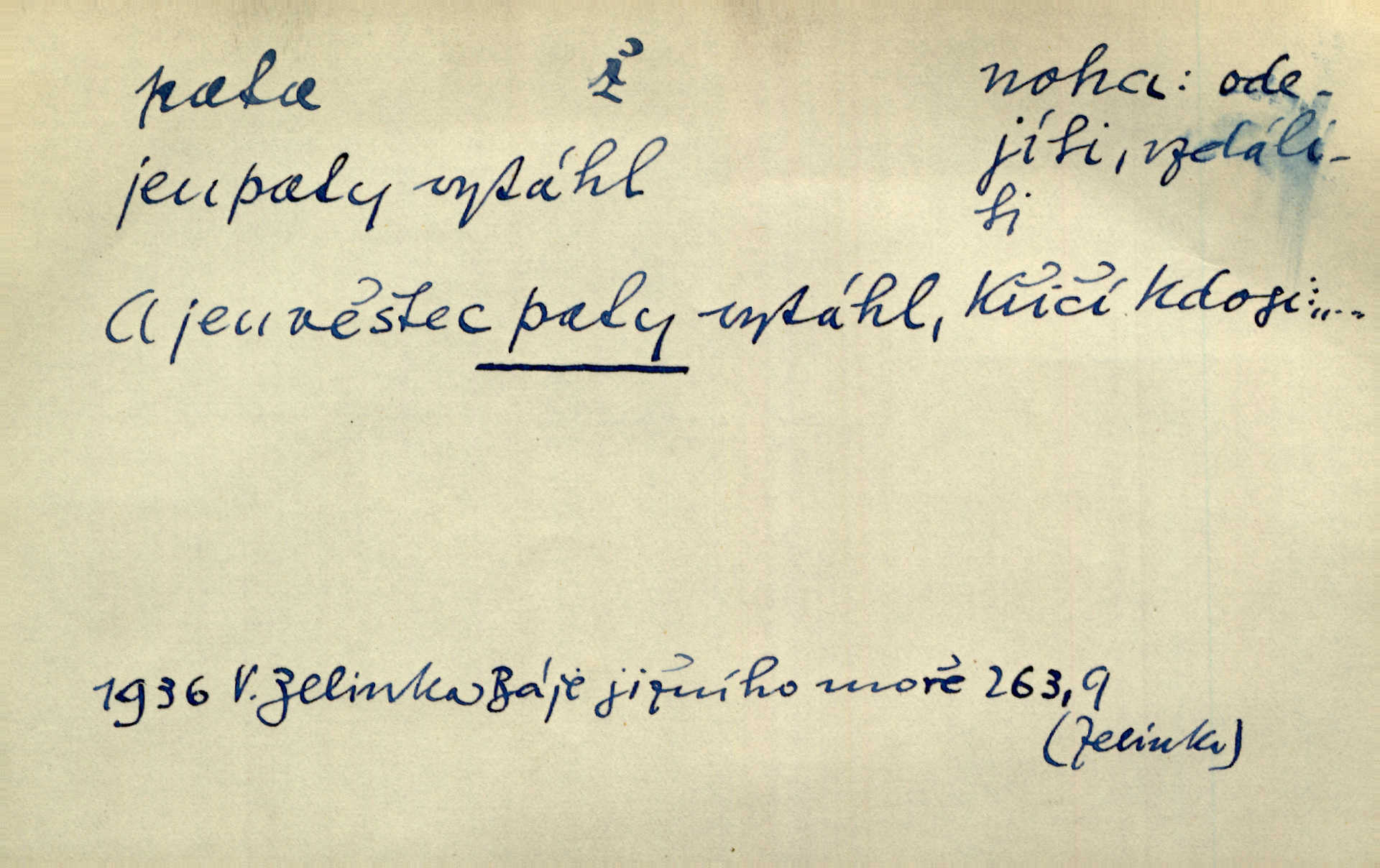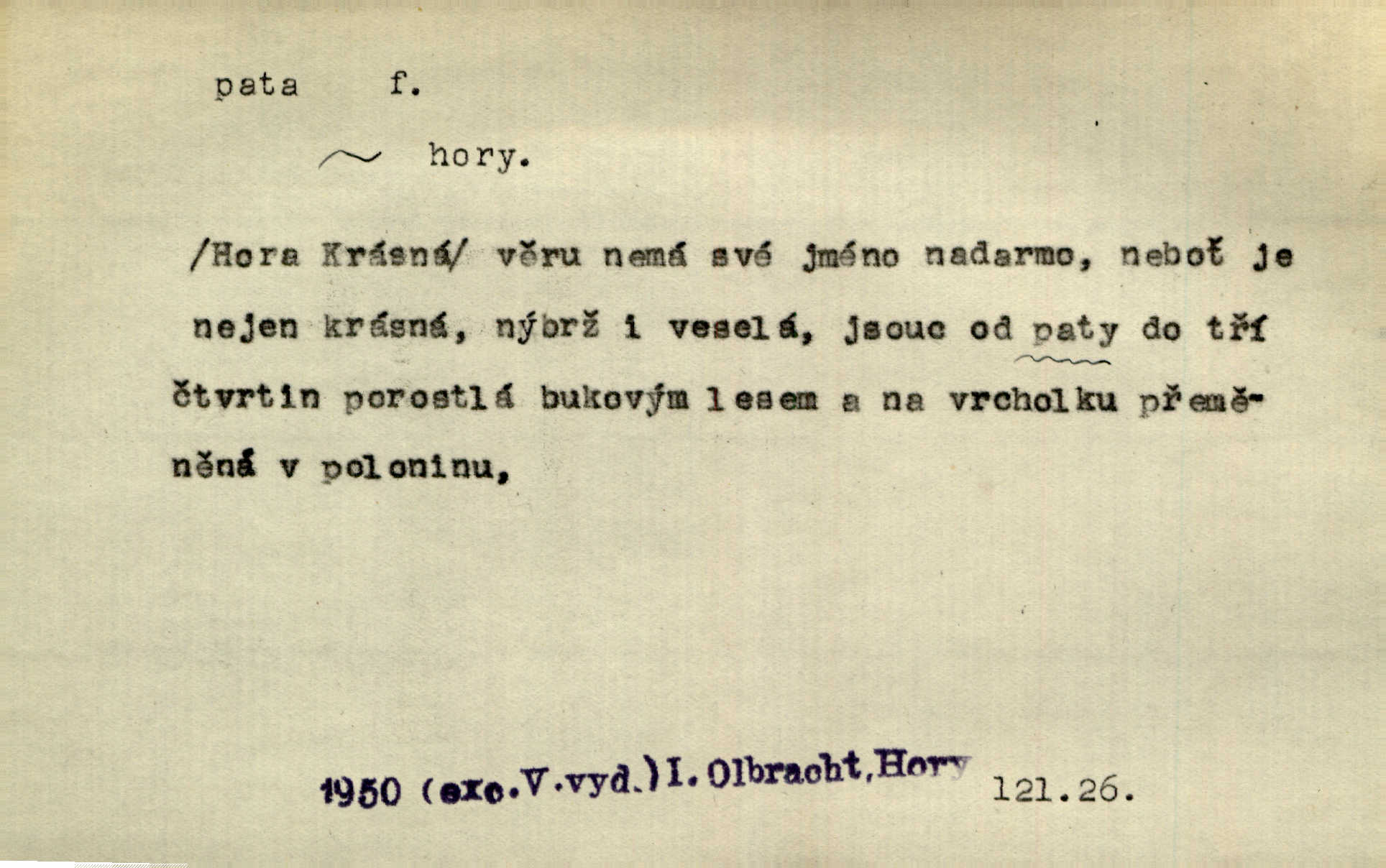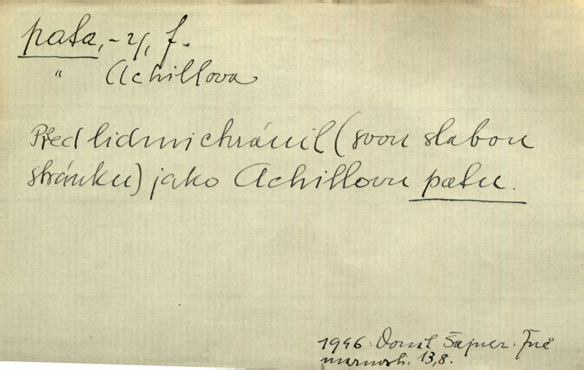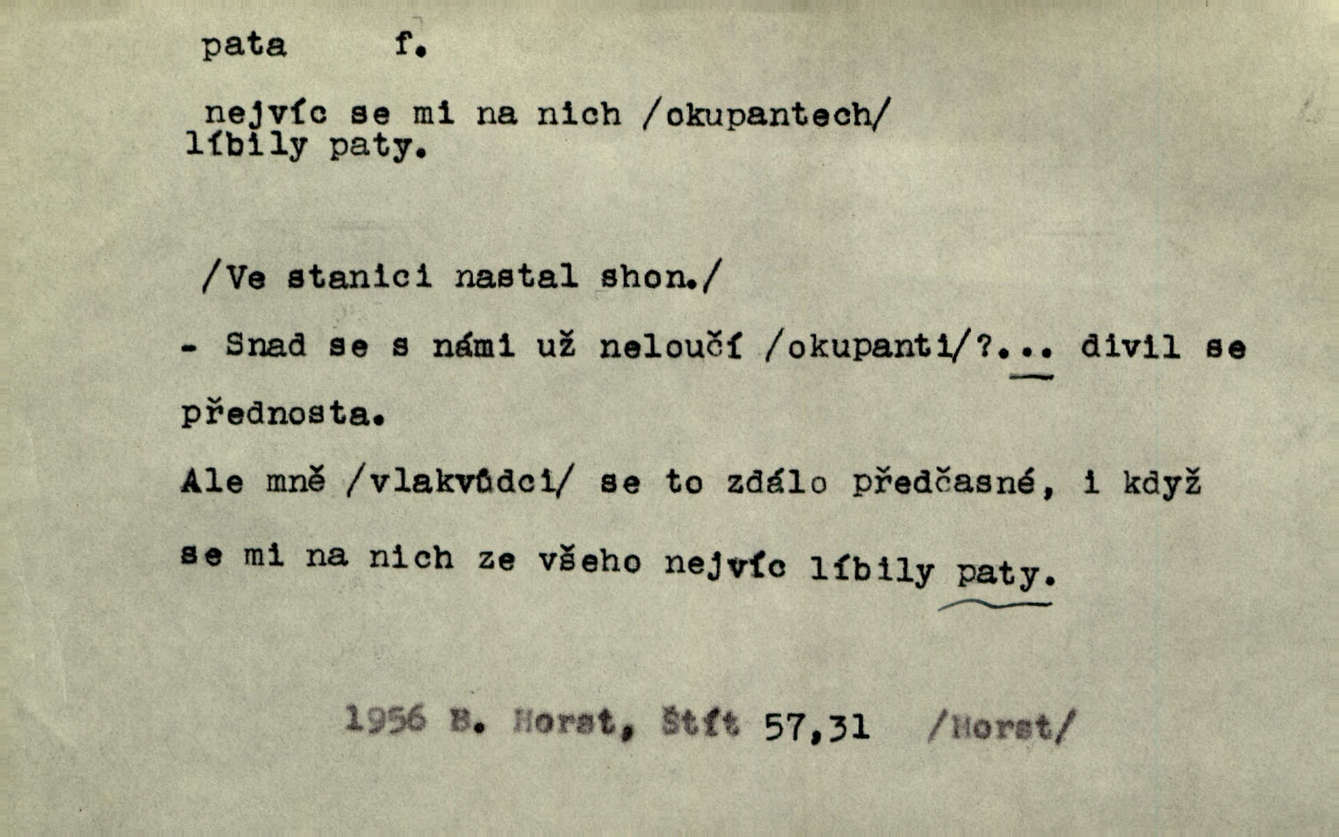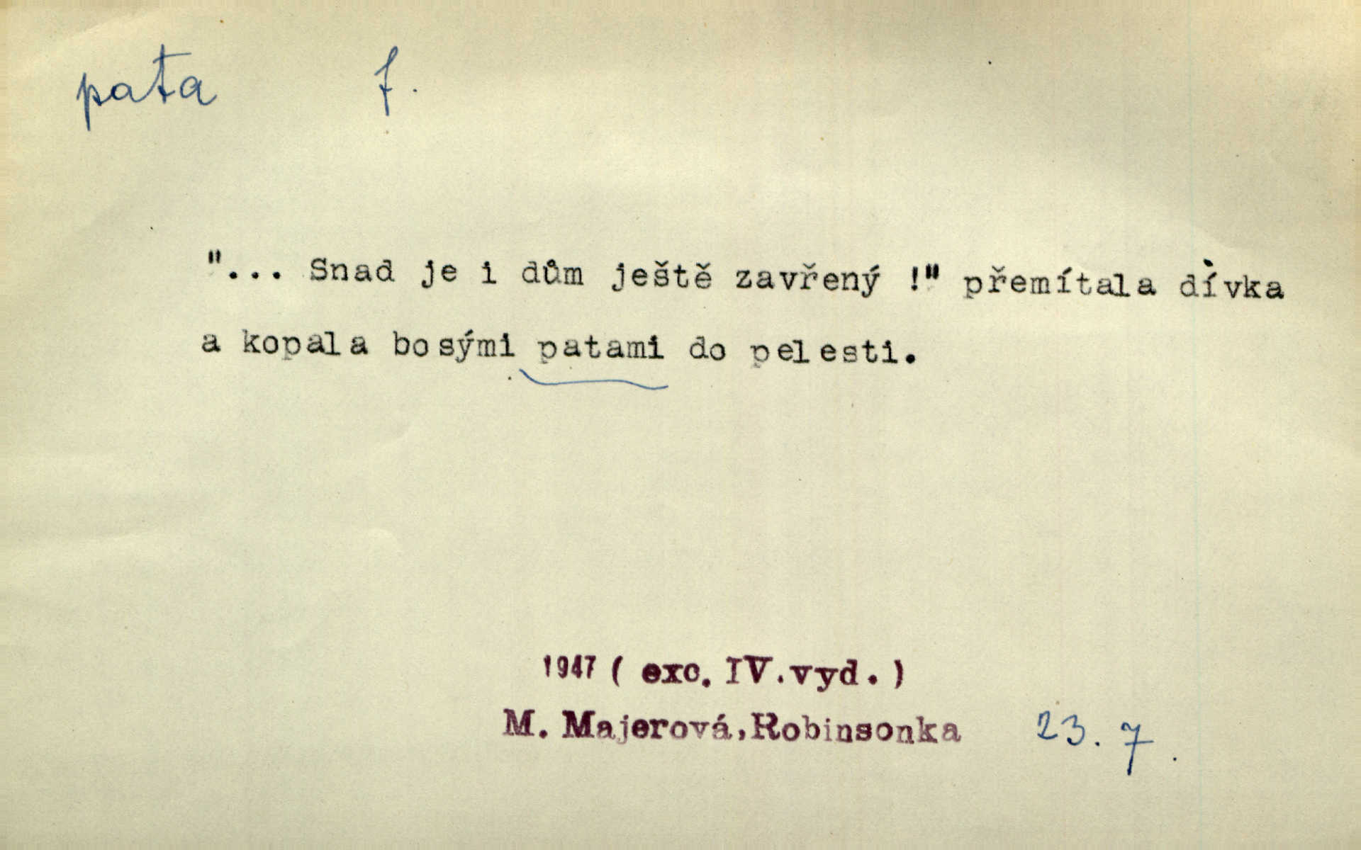- pata, -y f. nejzadnější část chodidla nohy s výstupkem nazad přečnívajícím. Přitisknuv k sobě kolena strkal paty do zadu. Jir. Šel vážně, klada paty hodně k sobě. Jir. Veník radostí se otočil na pravé patě. Hál. Mistr se otočil na patě a běžel domů. Herrm. Jste knížeti nepohodlnými sousedy jako trn v patě. Hol. Jeden nebo dva srnci, které se mu podařilo upytlačiti, nebyli by mu vytrhli trn z paty nepomohli z tísně. Vrba. Stopa je obrácena patou k silnici; kdo ji udělal, šel tímto směrem otiskem paty. K. Čap. Šedý šat pokrýval jeho postavu od hlavy až k patám celou. Něm. Panímáma přehlížela syna od hlavy k patě. Rais. Ale jdi, brebto, vždyť to nemá paty ani hlavy, co žvatláš nemá smyslu. Šim. Báseň mívá hlavu a patu dobrý smysl. Mach. To psaní má hlavu i patu. Pekárek. Nepřítel je nám v patách těsně za námi. Zey. Téměř v patách za panem Vorlíčkem vstoupil bez zaklepání jiný pán. Krás. Msta v patách kráčí jeho činu. Mácha. Co pořád se jí věší na paty, když vidí, že ho ráda nemá chodí ustavičně za ní. Jir. Bída věšela se mu na paty pronásledovala jej. Baar. Za každou laní šel její kolouch — takový hloupý ještě, zrovna se mámě lepil na paty šel těsně za ní. Vrba. Všem třem se vytrvale lepí smůla na paty pronásleduje je neštěstí. Sez. Musím se bát vytáhnout paty z pokoje odejít. Kun. Selka nemešká, sebere košík a zdvihá paty, jako by prášil utíká. Něm. „Hale kde je Srna?“ „Vysekal se patama“ utekl. Něm. Není za těžko v širém poli za noci ukázati někomu paty utéci, zmizeti. Jan. Šťasten, kdo může v této době [letního vedra] okázat městu paty! Čech. Z domu mi ovšem vyndáte paty vyženete mne. Neff. Fána vyprovázela poslední hosty. Paní Šustrová hleděla s radostí oběma pánům na paty radovala se z jejich odchodu. Herrm. Utíkal [pytlák] do lesa, jako by mu paty namydlil velmi rychle. Šmil. Snad i s čertem by se byl spojil, aby udolal ty, co mu „šlapali na paty“ jej pronásledovali. A. Mrš. On si na toho kluka dá pozor, bude mu šlapat na paty a koukat na prsty prožene ho. Vrba. Nestavte se na paty, Pánbůh pýchu vidí nenaparujte se! Rais. Hrdina ten vzal do zaječích po způsobu všech reků, kteří platí patami utekou aniž zaplatí. Mach. Div že Pánubohu paty nehukúsala, jak se modlila byla přepjatě nábožná. Něm. Lichvařil a utiskoval lid, ale jinak si mohl paty o kostel ubrousit stále chodil do kostela. Svět. Paty si mohla uběhat. Vrba. Všecky selky si mohly utlouci paty, snášejíce na faru kde co. Vrba. Tys tomu dal! Holečku, daleko pata oka zmýlil ses! Něm. Ty rozum v patě máš, jenž na kuří ti oka dostačí jsi hloupý. Hál. Je pořádně střelená do paty potrhlá. Šim. Dostali své peníze, a jak práce jejich vypadá, to jim ani v patě neleželo pranic jim na tom nezáleželo. Herb. Bufkovi hoří koudel za patami je v úzkých. Vrba. Jak Pánbůh dopustí jeden rok a přijde pád nebo kroupy anebo nepohoda, je sedlák na patách na mizině. M. Jahn. Satirik napad kdysi kohosi, šíp vehnav jemu v patu Achillovu napadl ho na slabém jeho místě. Mach. Vodička obuvník také je zasažen ve své achillovské patě. Bouš. Ctižádost stala se jeho patou Achillovou slabou stránkou. Kun. Tu vězí Achillova pata Zákrejsovy veselohry slabina. Osv. Byli to bojovníci zvyklí pohrdati zásadně slovanským obyvatelstvem, které pod jejich obrněnou patou hynulo. Šus. Arch. Legie vedené Trajanem zarazily tu patu svou, aby vyvrátily říši dáckého Decebala zastavily se. Jir. Byly časy, kdy Turek zatknul patu na samé Cetyni usadil se. Hol. Zool. prvý chodidlový článek včel, metatarsus. D Bás. noha. Vše jiné kol a cizích lidí pata sen mého mládí šlape přeblahý. Čech. Zdálo se mu [hochovi]‚ zlatý že kvítek vyskočí, kam vstoupí její [dívčiny] paty. Klášt. D část boty, punčochy a pod., navlékaná na patu lidské nohy. Vysoká turecká bota je víc punčochou než botou, jeť holinka, nárt i podšev z jediného kusu, pata na ní trochu vycpána. Ner. Křížková spravovala na patách roztrhané punčochy. Svob. Já jsem byla pilná, celou patu [punčochy] jsem udělala. Štěp. D dolení část něčeho, co se vypíná, strmí do výše, úpatí, spodek, spodní kraj. Jsme u paty hory Golgothy. Ner. Na vrchu vysokém, jenž ve vodách své paty koupá, prastarý stál hrad. Zey. Po úbočí chlumu až k patě rozkládá se vesnice. Mach. U paty pahrbku zastavila koně. Zey. Do pat těch skal narážejí prudké vlny. Jir. U paty věže klíčník otvírá vrata. Heyd. Španělské schody vzhůru vedou. U jejich paty třpytila se voda v bizarrním fontánu. Zey. Adámková se skácela k zemi. Padla právě k patám krucifixu. Vach. U paty vítězných stěžnů [v Benátkách] válí se zaháleči. Ner. Vysoké stromy osvětleny byly od paty až do vrcholků narudlým sluncem. Svob. U paty lesa byl veliký dub na okraji. Něm. Stav. dolení část nějaké stavby n. její část; pata hráze, náspu, pilíře a pod. D zadní, spodní, okrajová n. ukončující část nějakého předmětu, patka. Na dláždění zařinčely paty ručnic. J. z Hv. „Paty“ vorů, kláda ke kládě spojovaly se „pobíječkami“. Mor. Paty lyží jsou zvednuty, to znamená, že při pohybu kupředu na rovině nebo do kopce musíte se dostávat většinou silou rukou. Zlín. Ze semen, jimž byl odříznut zaoblený konec (pata semene), vyrůstala nejprve část s dělohami. Č. les. Představený ukrojil si zlatou patu bochníka patku. Hol. Tech. spodní část předmětu n. nějaké součásti; pata kolejnic patka; pata ložiska, zubu a pod. D Geom. pata kolmice průsečík kolmice s danou přímkou.