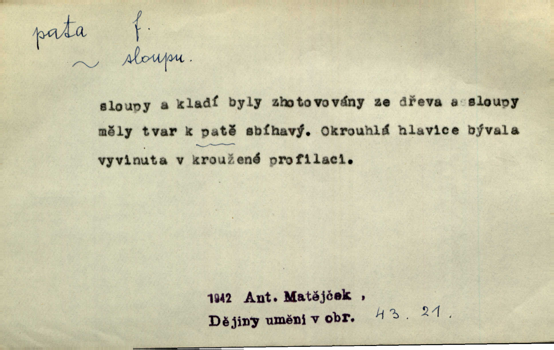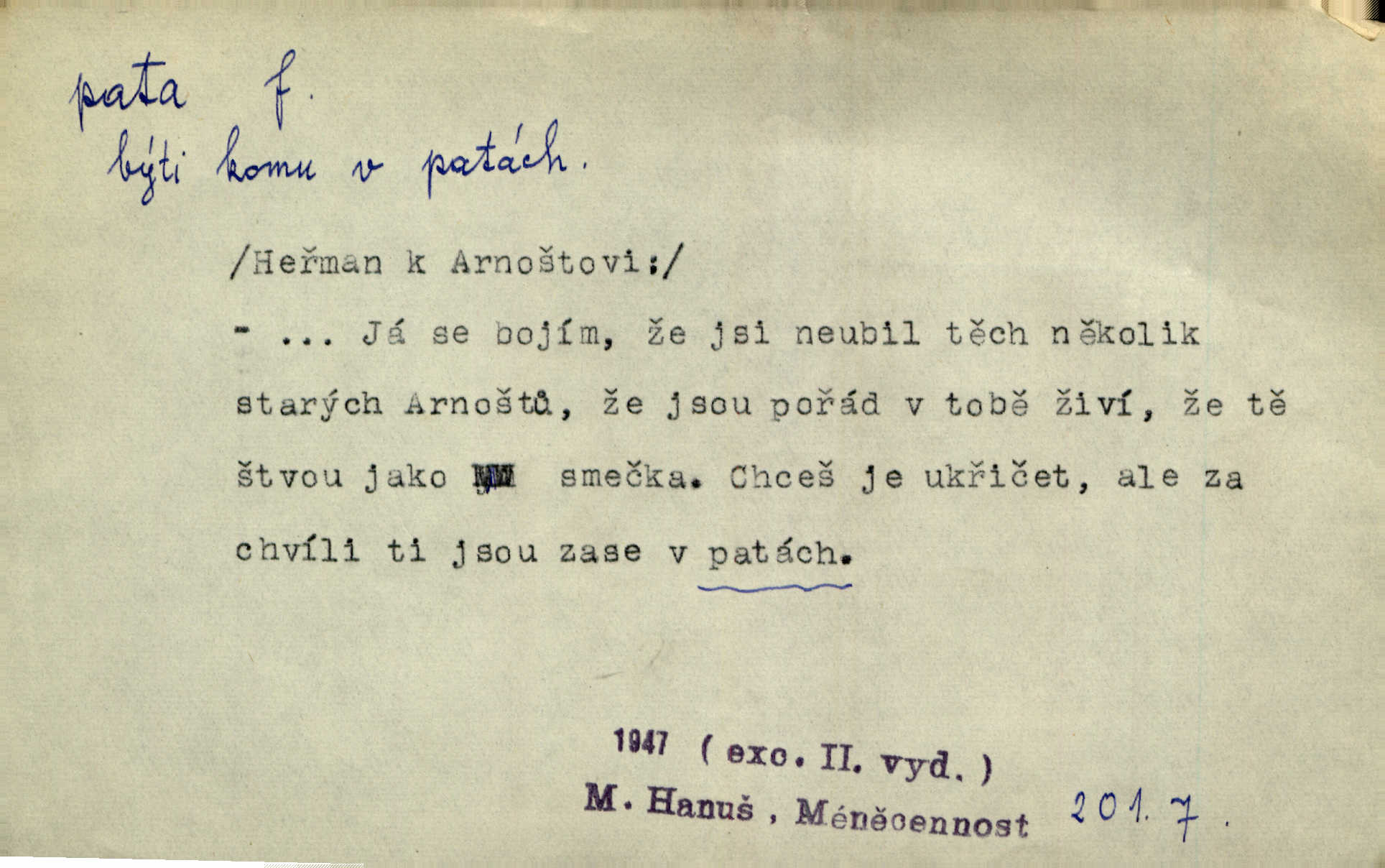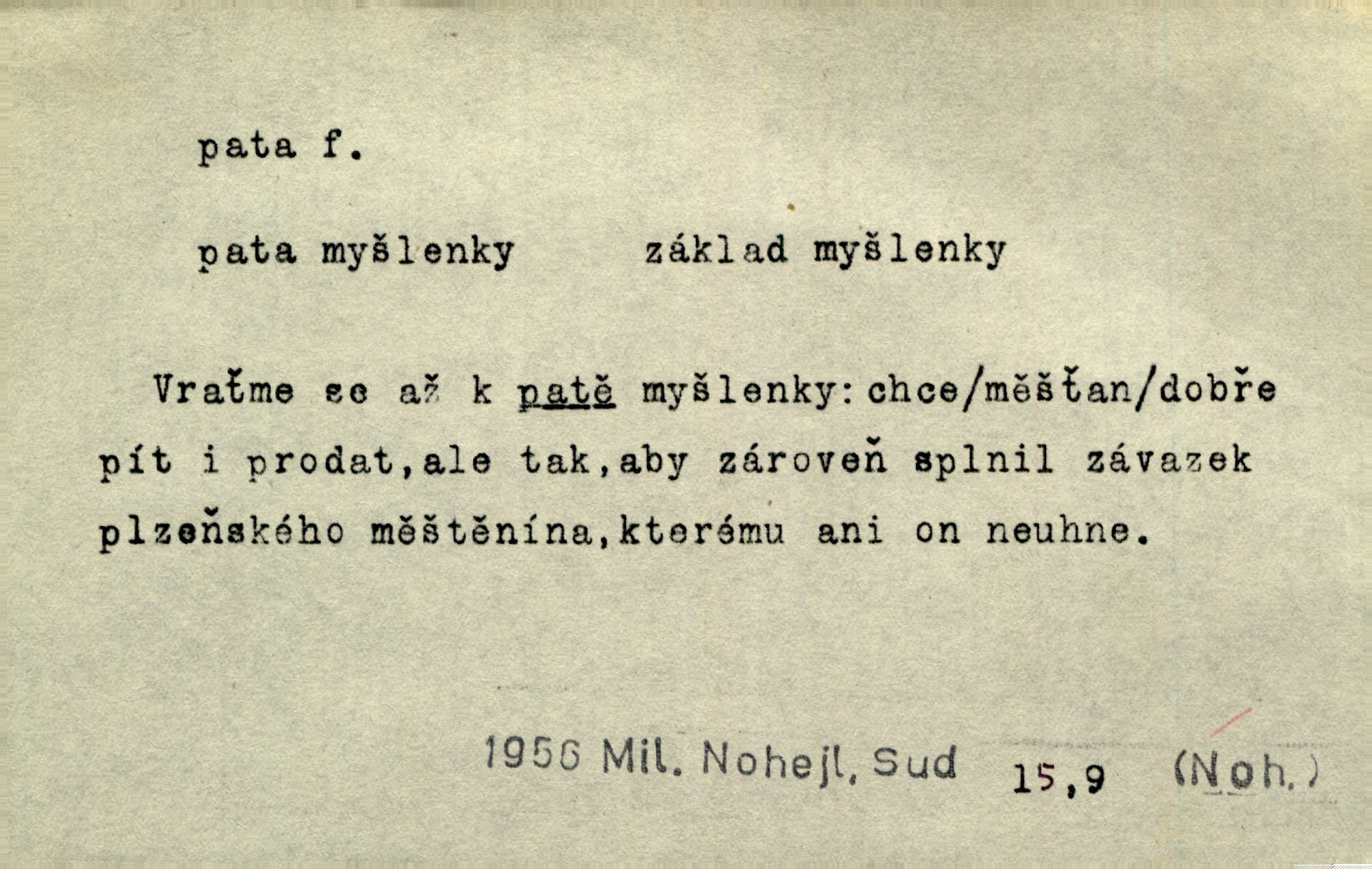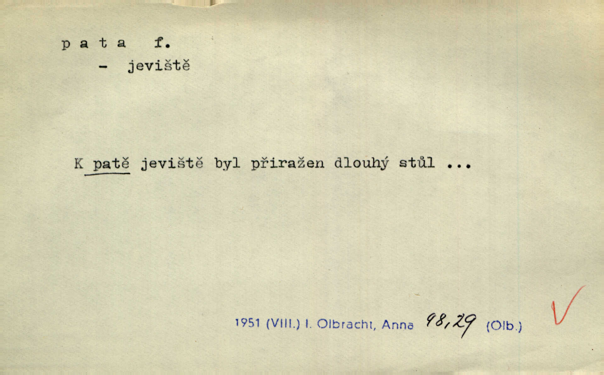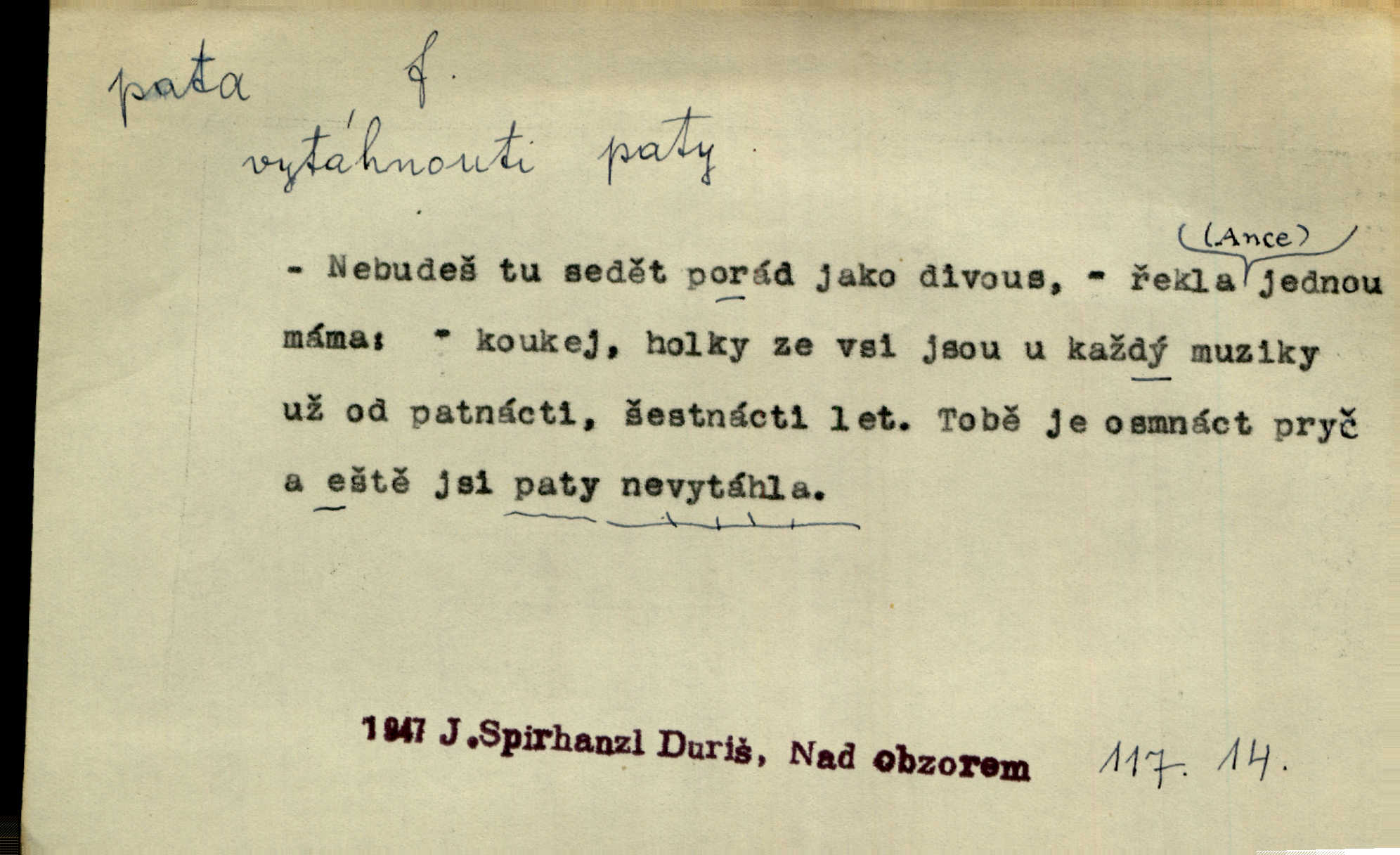 - pata, -y f. nejzadnější část chodidla nohy s výstupkem nazad přečnívajícím. Přitisknuv k sobě kolena strkal paty do zadu. Jir. Šel vážně, klada paty hodně k sobě. Jir. Veník radostí se otočil na pravé patě. Hál. Mistr se otočil na patě a běžel domů. Herrm. Jste knížeti nepohodlnými sousedy jako trn v patě. Hol. Jeden nebo dva srnci, které se mu podařilo upytlačiti, nebyli by mu vytrhli trn z paty nepomohli z tísně. Vrba. Stopa je obrácena patou k silnici; kdo ji udělal, šel tímto směrem otiskem paty. K. Čap. Šedý šat pokrýval jeho postavu od hlavy až k patám celou. Něm. Panímáma přehlížela syna od hlavy k patě. Rais. Ale jdi, brebto, vždyť to nemá paty ani hlavy, co žvatláš nemá smyslu. Šim. Báseň mívá hlavu a patu dobrý smysl. Mach. To psaní má hlavu i patu. Pekárek. Nepřítel je nám v patách těsně za námi. Zey. Téměř v patách za panem Vorlíčkem vstoupil bez zaklepání jiný pán. Krás. Msta v patách kráčí jeho činu. Mácha. Co pořád se jí věší na paty, když vidí, že ho ráda nemá chodí ustavičně za ní. Jir. Bída věšela se mu na paty pronásledovala jej. Baar. Za každou laní šel její kolouch — takový hloupý ještě, zrovna se mámě lepil na paty šel těsně za ní. Vrba. Všem třem se vytrvale lepí smůla na paty pronásleduje je neštěstí. Sez. Musím se bát vytáhnout paty z pokoje odejít. Kun. Selka nemešká, sebere košík a zdvihá paty, jako by prášil utíká. Něm. „Hale kde je Srna?“ „Vysekal se patama“ utekl. Něm. Není za těžko v širém poli za noci ukázati někomu paty utéci, zmizeti. Jan. Šťasten, kdo může v této době [letního vedra] okázat městu paty! Čech. Z domu mi ovšem vyndáte paty vyženete mne. Neff. Fána vyprovázela poslední hosty. Paní Šustrová hleděla s radostí oběma pánům na paty radovala se z jejich odchodu. Herrm. Utíkal [pytlák] do lesa, jako by mu paty namydlil velmi rychle. Šmil. Snad i s čertem by se byl spojil, aby udolal ty, co mu „šlapali na paty“ jej pronásledovali. A. Mrš. On si na toho kluka dá pozor, bude mu šlapat na paty a koukat na prsty prožene ho. Vrba. Nestavte se na paty, Pánbůh pýchu vidí nenaparujte se! Rais. Hrdina ten vzal do zaječích po způsobu všech reků, kteří platí patami utekou aniž zaplatí. Mach. Div že Pánubohu paty nehukúsala, jak se modlila byla přepjatě nábožná. Něm. Lichvařil a utiskoval lid, ale jinak si mohl paty o kostel ubrousit stále chodil do kostela. Svět. Paty si mohla uběhat. Vrba. Všecky selky si mohly utlouci paty, snášejíce na faru kde co. Vrba. Tys tomu dal! Holečku, daleko pata oka zmýlil ses! Něm. Ty rozum v patě máš, jenž na kuří ti oka dostačí jsi hloupý. Hál. Je pořádně střelená do paty potrhlá. Šim. Dostali své peníze, a jak práce jejich vypadá, to jim ani v patě neleželo pranic jim na tom nezáleželo. Herb. Bufkovi hoří koudel za patami je v úzkých. Vrba. Jak Pánbůh dopustí jeden rok a přijde pád nebo kroupy anebo nepohoda, je sedlák na patách na mizině. M. Jahn. Satirik napad kdysi kohosi, šíp vehnav jemu v patu Achillovu napadl ho na slabém jeho místě. Mach. Vodička obuvník také je zasažen ve své achillovské patě. Bouš. Ctižádost stala se jeho patou Achillovou slabou stránkou. Kun. Tu vězí Achillova pata Zákrejsovy veselohry slabina. Osv. Byli to bojovníci zvyklí pohrdati zásadně slovanským obyvatelstvem, které pod jejich obrněnou patou hynulo. Šus. Arch. Legie vedené Trajanem zarazily tu patu svou, aby vyvrátily říši dáckého Decebala zastavily se. Jir. Byly časy, kdy Turek zatknul patu na samé Cetyni usadil se. Hol. Zool. prvý chodidlový článek včel, metatarsus. D Bás. noha. Vše jiné kol a cizích lidí pata sen mého mládí šlape přeblahý. Čech. Zdálo se mu [hochovi]‚ zlatý že kvítek vyskočí, kam vstoupí její [dívčiny] paty. Klášt. D část boty, punčochy a pod., navlékaná na patu lidské nohy. Vysoká turecká bota je víc punčochou než botou, jeť holinka, nárt i podšev z jediného kusu, pata na ní trochu vycpána. Ner. Křížková spravovala na patách roztrhané punčochy. Svob. Já jsem byla pilná, celou patu [punčochy] jsem udělala. Štěp. D dolení část něčeho, co se vypíná, strmí do výše, úpatí, spodek, spodní kraj. Jsme u paty hory Golgothy. Ner. Na vrchu vysokém, jenž ve vodách své paty koupá, prastarý stál hrad. Zey. Po úbočí chlumu až k patě rozkládá se vesnice. Mach. U paty pahrbku zastavila koně. Zey. Do pat těch skal narážejí prudké vlny. Jir. U paty věže klíčník otvírá vrata. Heyd. Španělské schody vzhůru vedou. U jejich paty třpytila se voda v bizarrním fontánu. Zey. Adámková se skácela k zemi. Padla právě k patám krucifixu. Vach. U paty vítězných stěžnů [v Benátkách] válí se zaháleči. Ner. Vysoké stromy osvětleny byly od paty až do vrcholků narudlým sluncem. Svob. U paty lesa byl veliký dub na okraji. Něm. Stav. dolení část nějaké stavby n. její část; pata hráze, náspu, pilíře a pod. D zadní, spodní, okrajová n. ukončující část nějakého předmětu, patka. Na dláždění zařinčely paty ručnic. J. z Hv. „Paty“ vorů, kláda ke kládě spojovaly se „pobíječkami“. Mor. Paty lyží jsou zvednuty, to znamená, že při pohybu kupředu na rovině nebo do kopce musíte se dostávat většinou silou rukou. Zlín. Ze semen, jimž byl odříznut zaoblený konec (pata semene), vyrůstala nejprve část s dělohami. Č. les. Představený ukrojil si zlatou patu bochníka patku. Hol. Tech. spodní část předmětu n. nějaké součásti; pata kolejnic patka; pata ložiska, zubu a pod. D Geom. pata kolmice průsečík kolmice s danou přímkou.