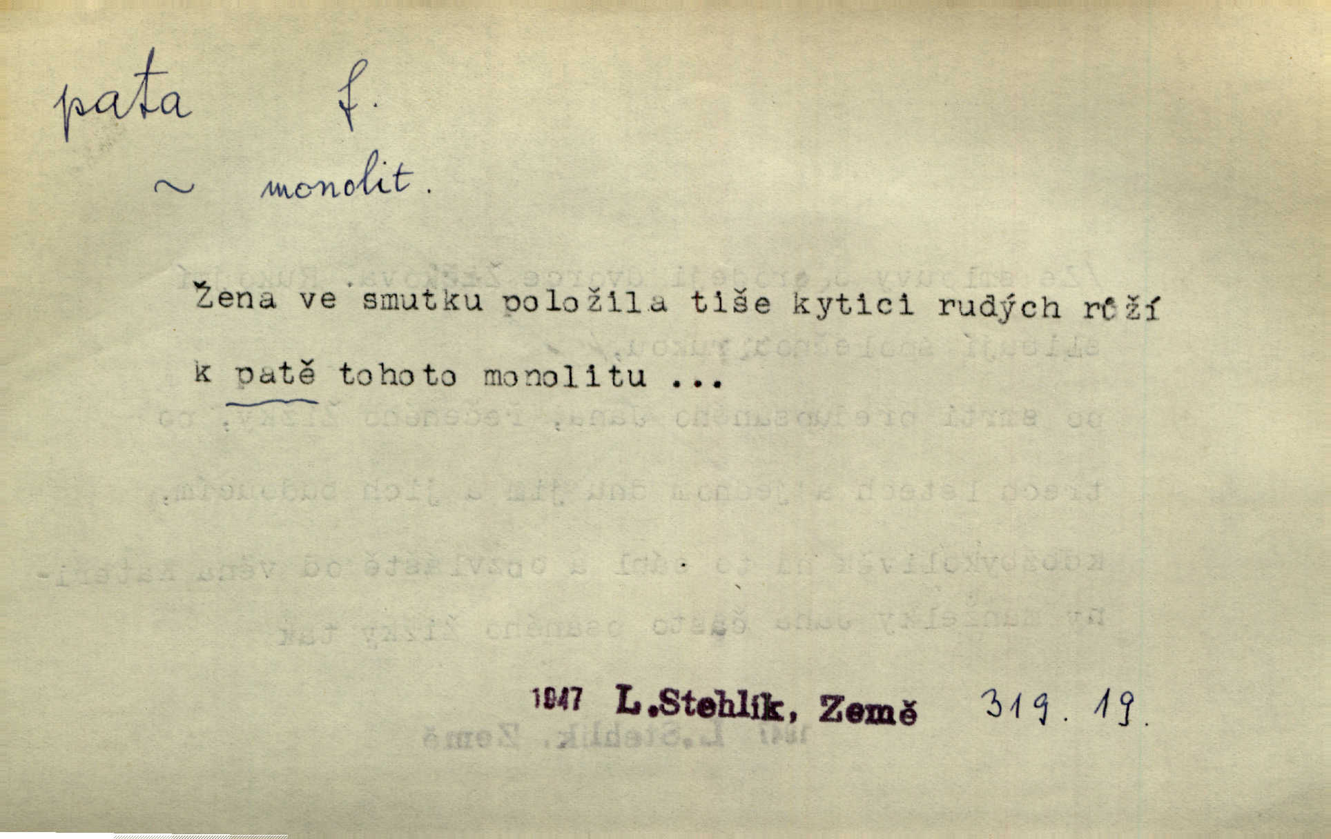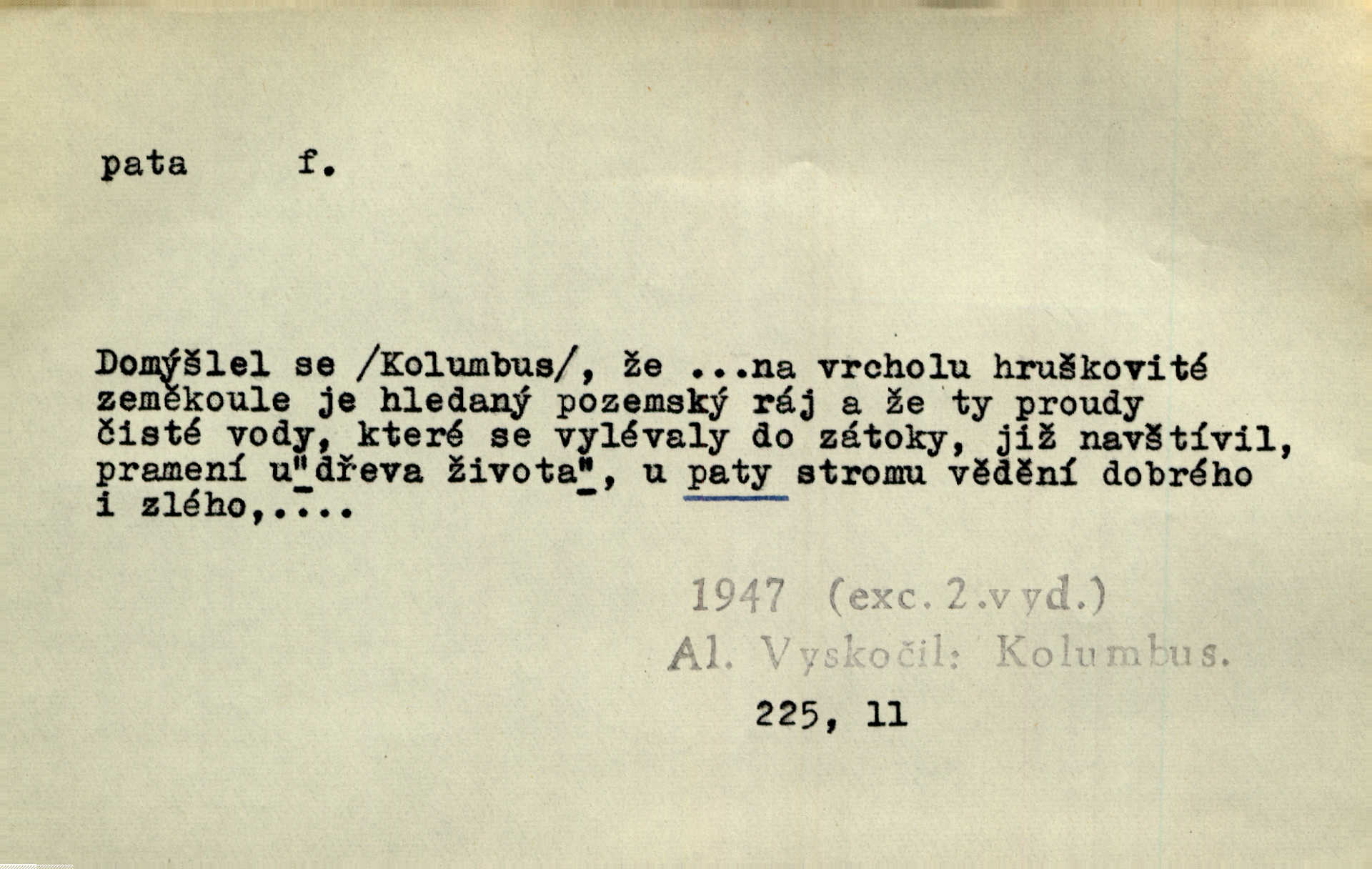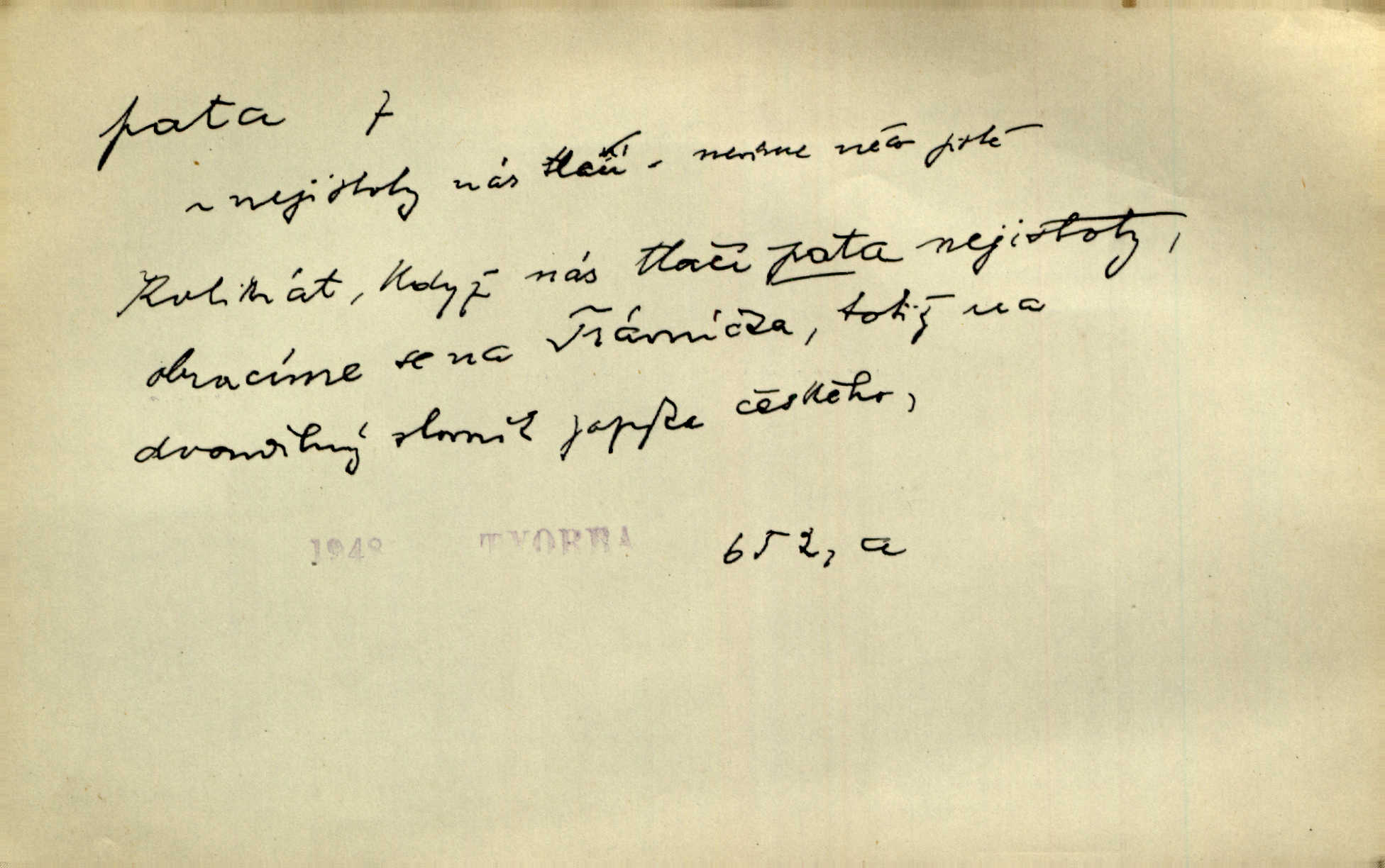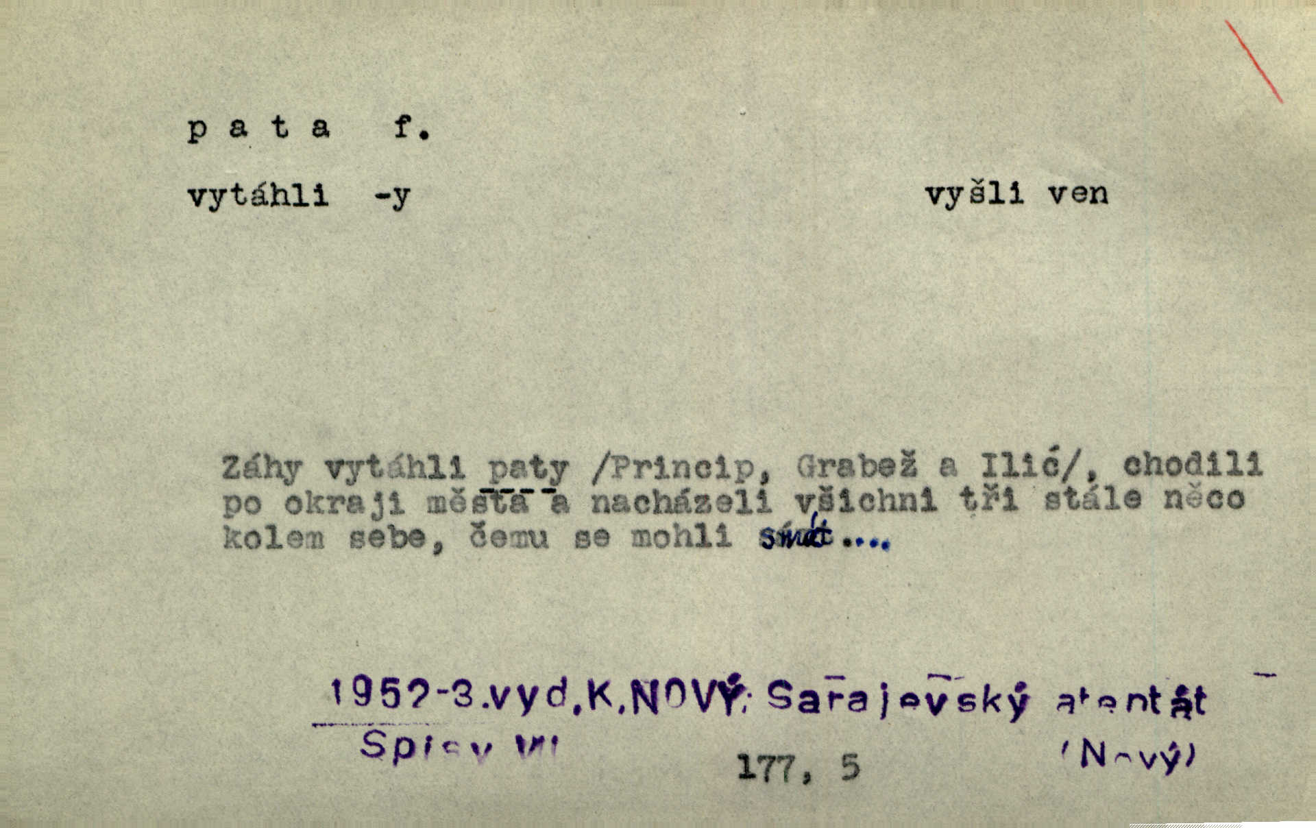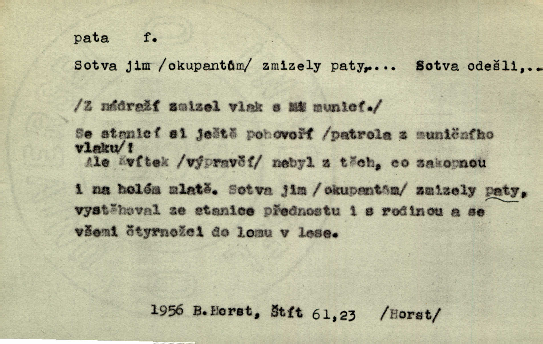 - pata, -y f. nejzadnější část chodidla nohy s výstupkem nazad přečnívajícím. Přitisknuv k sobě kolena strkal paty do zadu. Jir. Šel vážně, klada paty hodně k sobě. Jir. Veník radostí se otočil na pravé patě. Hál. Mistr se otočil na patě a běžel domů. Herrm. Jste knížeti nepohodlnými sousedy jako trn v patě. Hol. Jeden nebo dva srnci, které se mu podařilo upytlačiti, nebyli by mu vytrhli trn z paty nepomohli z tísně. Vrba. Stopa je obrácena patou k silnici; kdo ji udělal, šel tímto směrem otiskem paty. K. Čap. Šedý šat pokrýval jeho postavu od hlavy až k patám celou. Něm. Panímáma přehlížela syna od hlavy k patě. Rais. Ale jdi, brebto, vždyť to nemá paty ani hlavy, co žvatláš nemá smyslu. Šim. Báseň mívá hlavu a patu dobrý smysl. Mach. To psaní má hlavu i patu. Pekárek. Nepřítel je nám v patách těsně za námi. Zey. Téměř v patách za panem Vorlíčkem vstoupil bez zaklepání jiný pán. Krás. Msta v patách kráčí jeho činu. Mácha. Co pořád se jí věší na paty, když vidí, že ho ráda nemá chodí ustavičně za ní. Jir. Bída věšela se mu na paty pronásledovala jej. Baar. Za každou laní šel její kolouch — takový hloupý ještě, zrovna se mámě lepil na paty šel těsně za ní. Vrba. Všem třem se vytrvale lepí smůla na paty pronásleduje je neštěstí. Sez. Musím se bát vytáhnout paty z pokoje odejít. Kun. Selka nemešká, sebere košík a zdvihá paty, jako by prášil utíká. Něm. „Hale kde je Srna?“ „Vysekal se patama“ utekl. Něm. Není za těžko v širém poli za noci ukázati někomu paty utéci, zmizeti. Jan. Šťasten, kdo může v této době [letního vedra] okázat městu paty! Čech. Z domu mi ovšem vyndáte paty vyženete mne. Neff. Fána vyprovázela poslední hosty. Paní Šustrová hleděla s radostí oběma pánům na paty radovala se z jejich odchodu. Herrm. Utíkal [pytlák] do lesa, jako by mu paty namydlil velmi rychle. Šmil. Snad i s čertem by se byl spojil, aby udolal ty, co mu „šlapali na paty“ jej pronásledovali. A. Mrš. On si na toho kluka dá pozor, bude mu šlapat na paty a koukat na prsty prožene ho. Vrba. Nestavte se na paty, Pánbůh pýchu vidí nenaparujte se! Rais. Hrdina ten vzal do zaječích po způsobu všech reků, kteří platí patami utekou aniž zaplatí. Mach. Div že Pánubohu paty nehukúsala, jak se modlila byla přepjatě nábožná. Něm. Lichvařil a utiskoval lid, ale jinak si mohl paty o kostel ubrousit stále chodil do kostela. Svět. Paty si mohla uběhat. Vrba. Všecky selky si mohly utlouci paty, snášejíce na faru kde co. Vrba. Tys tomu dal! Holečku, daleko pata oka zmýlil ses! Něm. Ty rozum v patě máš, jenž na kuří ti oka dostačí jsi hloupý. Hál. Je pořádně střelená do paty potrhlá. Šim. Dostali své peníze, a jak práce jejich vypadá, to jim ani v patě neleželo pranic jim na tom nezáleželo. Herb. Bufkovi hoří koudel za patami je v úzkých. Vrba. Jak Pánbůh dopustí jeden rok a přijde pád nebo kroupy anebo nepohoda, je sedlák na patách na mizině. M. Jahn. Satirik napad kdysi kohosi, šíp vehnav jemu v patu Achillovu napadl ho na slabém jeho místě. Mach. Vodička obuvník také je zasažen ve své achillovské patě. Bouš. Ctižádost stala se jeho patou Achillovou slabou stránkou. Kun. Tu vězí Achillova pata Zákrejsovy veselohry slabina. Osv. Byli to bojovníci zvyklí pohrdati zásadně slovanským obyvatelstvem, které pod jejich obrněnou patou hynulo. Šus. Arch. Legie vedené Trajanem zarazily tu patu svou, aby vyvrátily říši dáckého Decebala zastavily se. Jir. Byly časy, kdy Turek zatknul patu na samé Cetyni usadil se. Hol. Zool. prvý chodidlový článek včel, metatarsus. D Bás. noha. Vše jiné kol a cizích lidí pata sen mého mládí šlape přeblahý. Čech. Zdálo se mu [hochovi]‚ zlatý že kvítek vyskočí, kam vstoupí její [dívčiny] paty. Klášt. D část boty, punčochy a pod., navlékaná na patu lidské nohy. Vysoká turecká bota je víc punčochou než botou, jeť holinka, nárt i podšev z jediného kusu, pata na ní trochu vycpána. Ner. Křížková spravovala na patách roztrhané punčochy. Svob. Já jsem byla pilná, celou patu [punčochy] jsem udělala. Štěp. D dolení část něčeho, co se vypíná, strmí do výše, úpatí, spodek, spodní kraj. Jsme u paty hory Golgothy. Ner. Na vrchu vysokém, jenž ve vodách své paty koupá, prastarý stál hrad. Zey. Po úbočí chlumu až k patě rozkládá se vesnice. Mach. U paty pahrbku zastavila koně. Zey. Do pat těch skal narážejí prudké vlny. Jir. U paty věže klíčník otvírá vrata. Heyd. Španělské schody vzhůru vedou. U jejich paty třpytila se voda v bizarrním fontánu. Zey. Adámková se skácela k zemi. Padla právě k patám krucifixu. Vach. U paty vítězných stěžnů [v Benátkách] válí se zaháleči. Ner. Vysoké stromy osvětleny byly od paty až do vrcholků narudlým sluncem. Svob. U paty lesa byl veliký dub na okraji. Něm. Stav. dolení část nějaké stavby n. její část; pata hráze, náspu, pilíře a pod. D zadní, spodní, okrajová n. ukončující část nějakého předmětu, patka. Na dláždění zařinčely paty ručnic. J. z Hv. „Paty“ vorů, kláda ke kládě spojovaly se „pobíječkami“. Mor. Paty lyží jsou zvednuty, to znamená, že při pohybu kupředu na rovině nebo do kopce musíte se dostávat většinou silou rukou. Zlín. Ze semen, jimž byl odříznut zaoblený konec (pata semene), vyrůstala nejprve část s dělohami. Č. les. Představený ukrojil si zlatou patu bochníka patku. Hol. Tech. spodní část předmětu n. nějaké součásti; pata kolejnic patka; pata ložiska, zubu a pod. D Geom. pata kolmice průsečík kolmice s danou přímkou.
