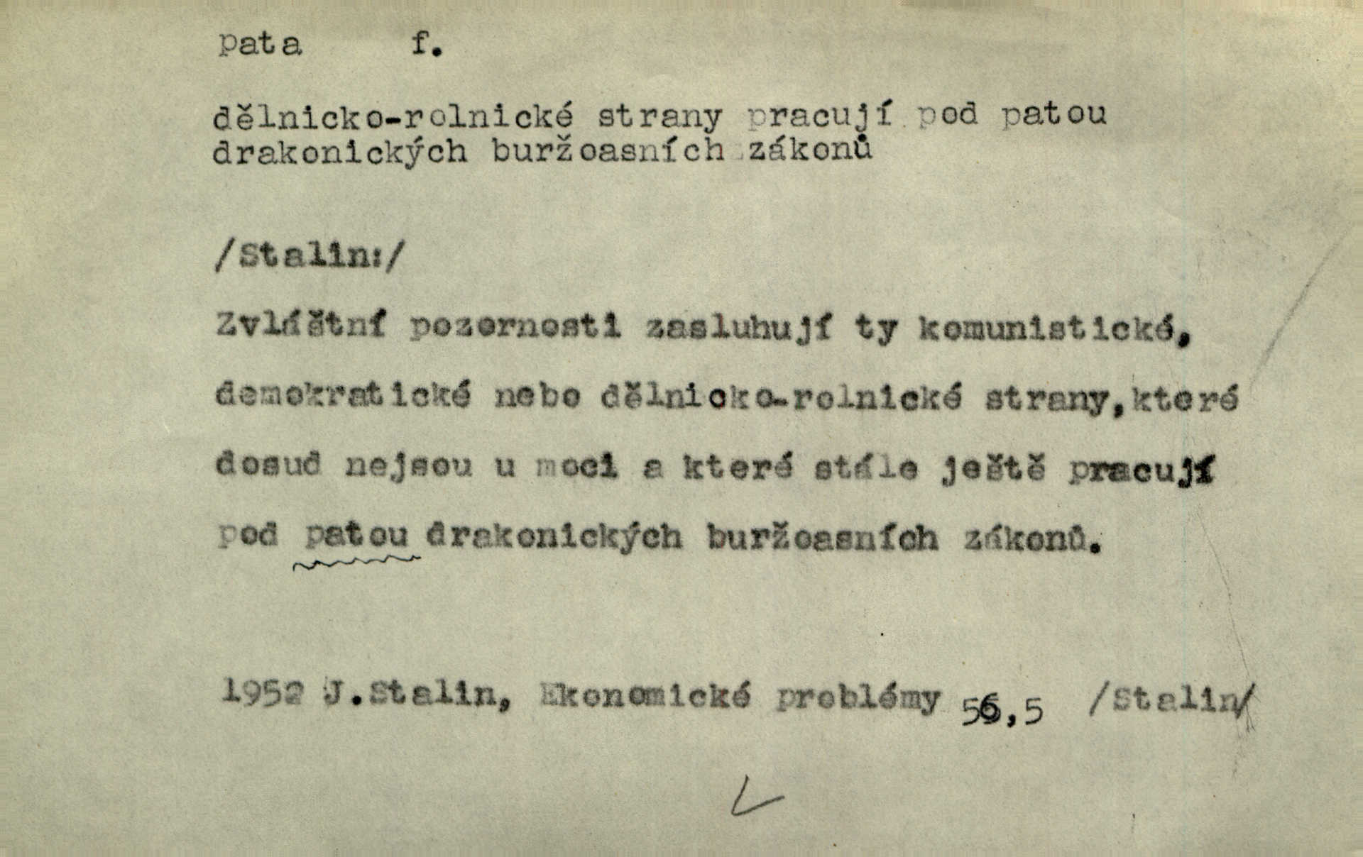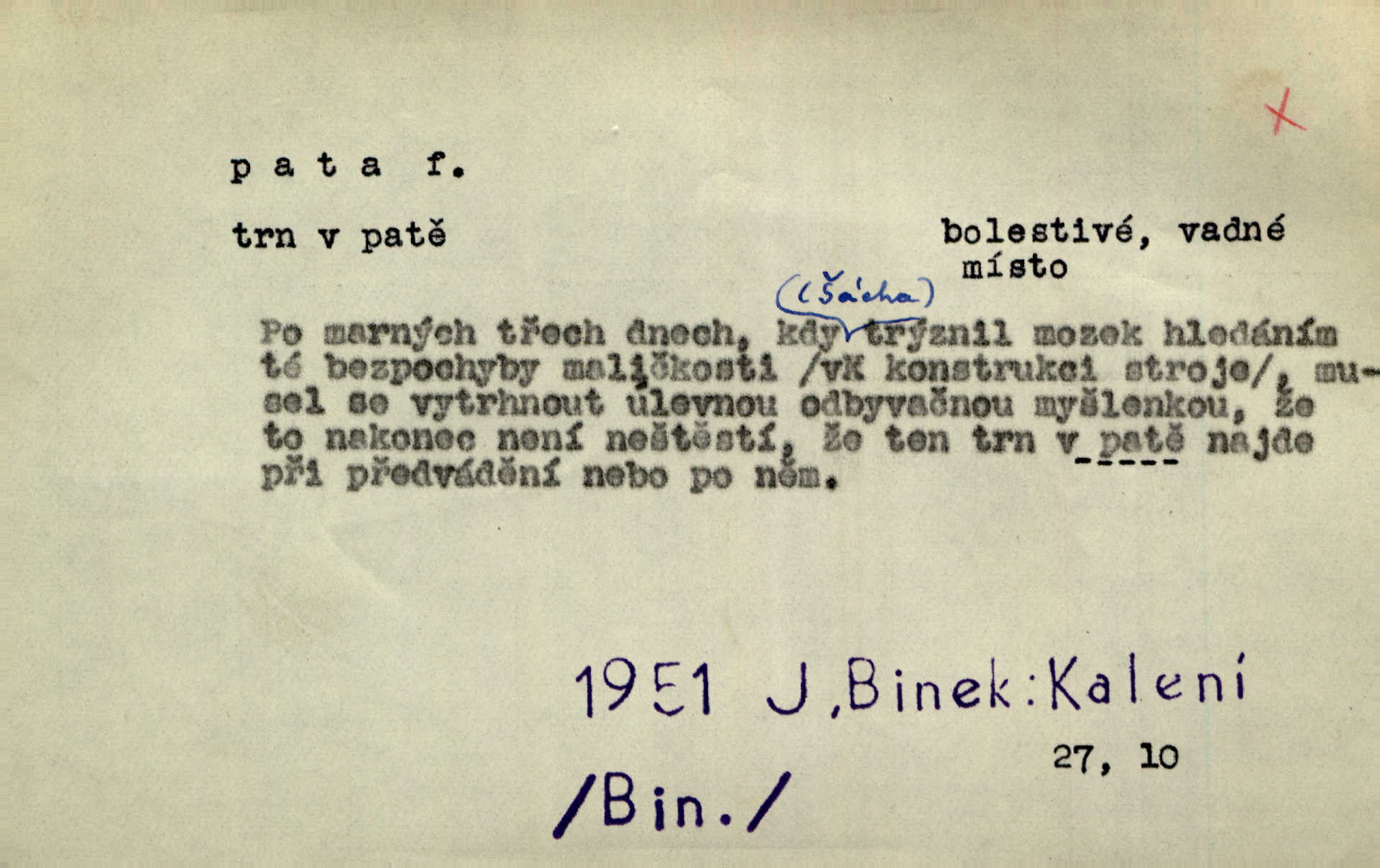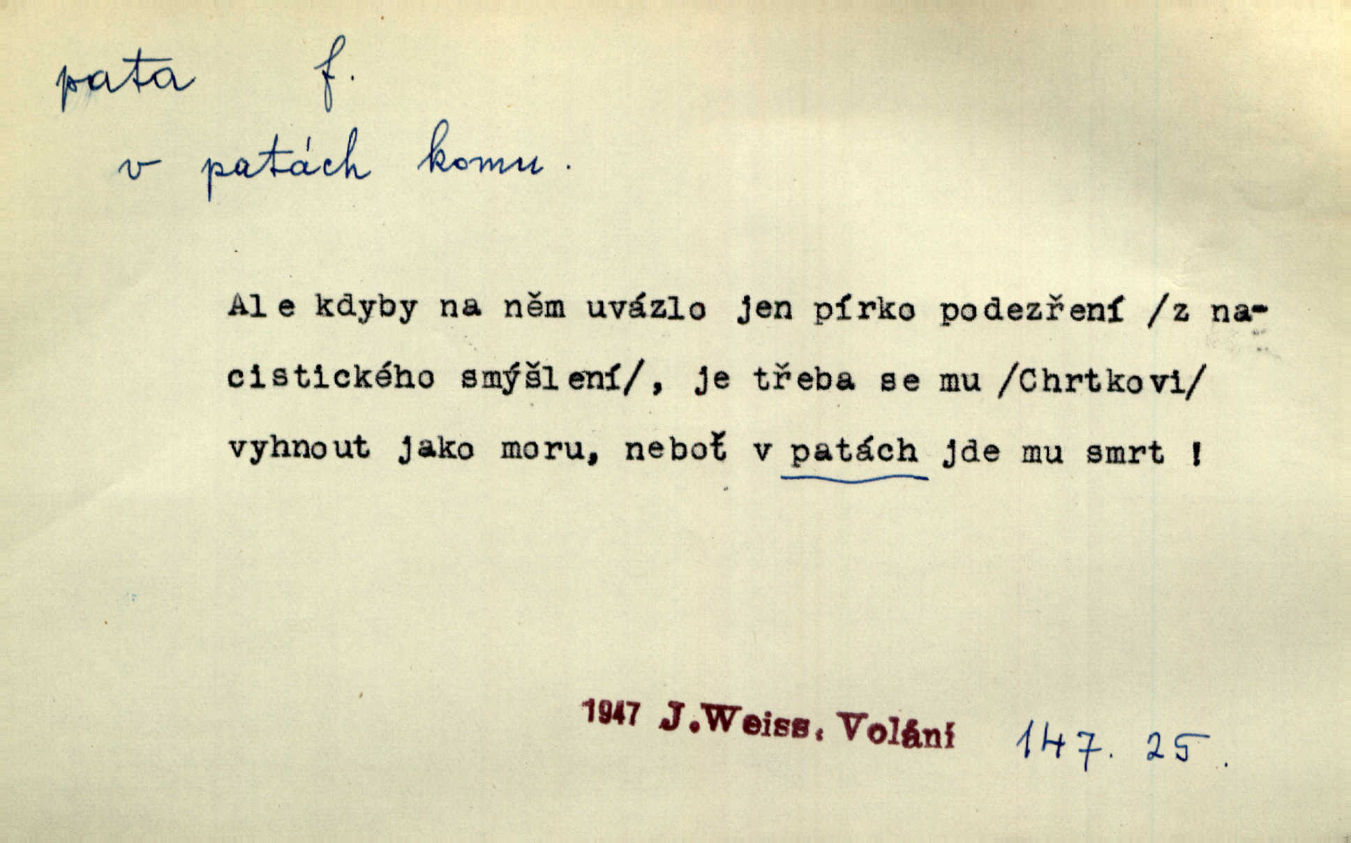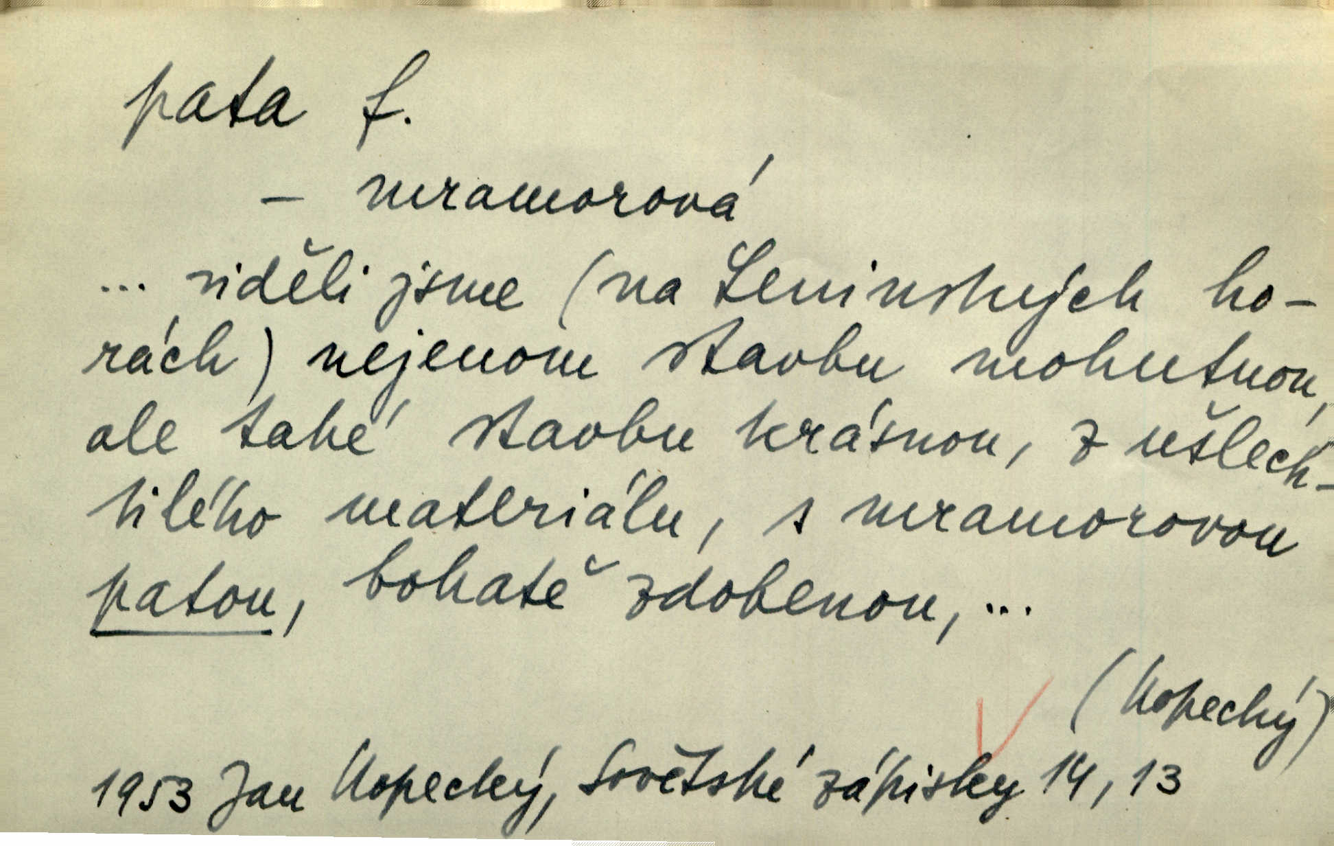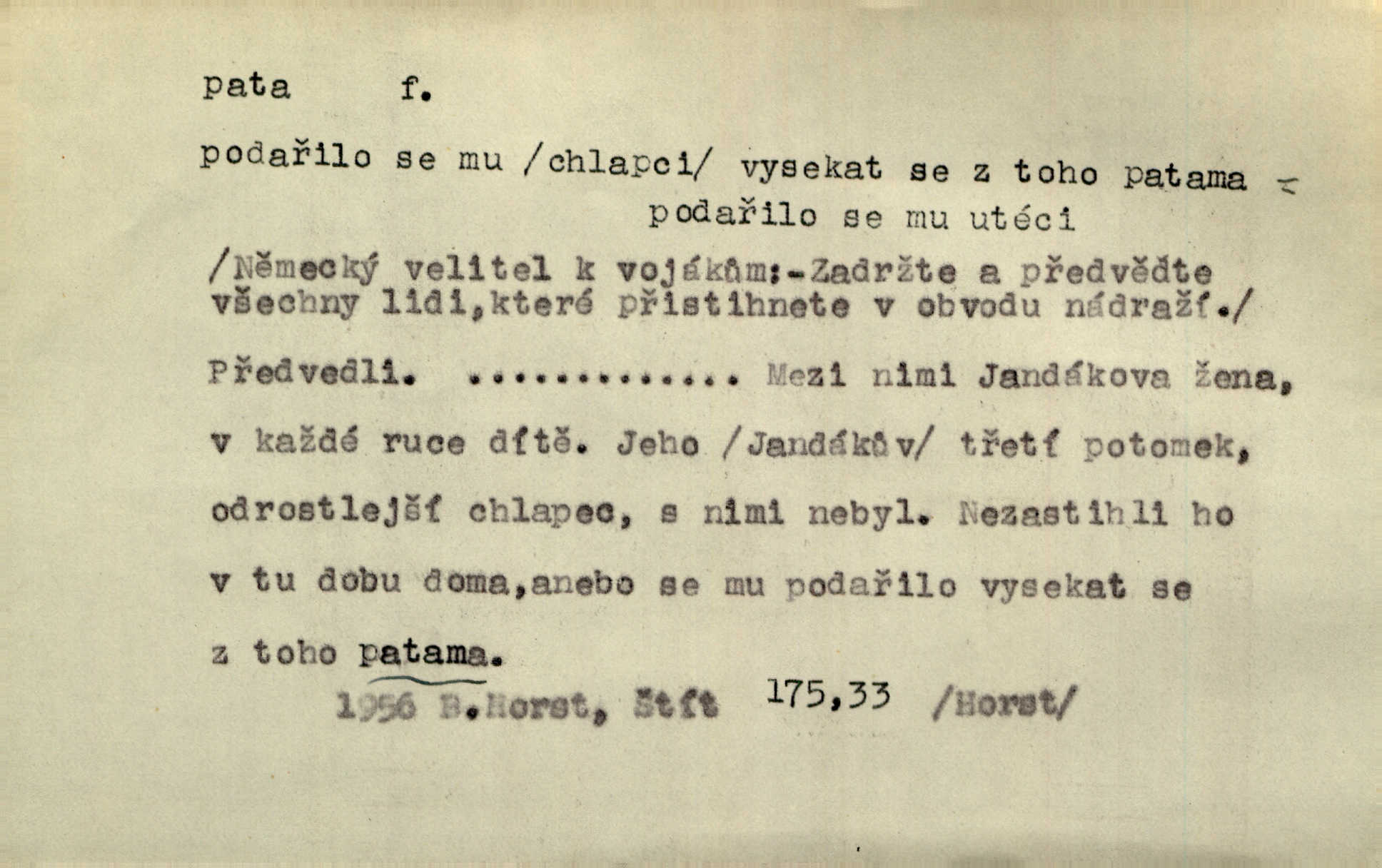 - pata, -y f. nejzadnější část chodidla nohy s výstupkem nazad přečnívajícím. Přitisknuv k sobě kolena strkal paty do zadu. Jir. Šel vážně, klada paty hodně k sobě. Jir. Veník radostí se otočil na pravé patě. Hál. Mistr se otočil na patě a běžel domů. Herrm. Jste knížeti nepohodlnými sousedy jako trn v patě. Hol. Jeden nebo dva srnci, které se mu podařilo upytlačiti, nebyli by mu vytrhli trn z paty nepomohli z tísně. Vrba. Stopa je obrácena patou k silnici; kdo ji udělal, šel tímto směrem otiskem paty. K. Čap. Šedý šat pokrýval jeho postavu od hlavy až k patám celou. Něm. Panímáma přehlížela syna od hlavy k patě. Rais. Ale jdi, brebto, vždyť to nemá paty ani hlavy, co žvatláš nemá smyslu. Šim. Báseň mívá hlavu a patu dobrý smysl. Mach. To psaní má hlavu i patu. Pekárek. Nepřítel je nám v patách těsně za námi. Zey. Téměř v patách za panem Vorlíčkem vstoupil bez zaklepání jiný pán. Krás. Msta v patách kráčí jeho činu. Mácha. Co pořád se jí věší na paty, když vidí, že ho ráda nemá chodí ustavičně za ní. Jir. Bída věšela se mu na paty pronásledovala jej. Baar. Za každou laní šel její kolouch — takový hloupý ještě, zrovna se mámě lepil na paty šel těsně za ní. Vrba. Všem třem se vytrvale lepí smůla na paty pronásleduje je neštěstí. Sez. Musím se bát vytáhnout paty z pokoje odejít. Kun. Selka nemešká, sebere košík a zdvihá paty, jako by prášil utíká. Něm. „Hale kde je Srna?“ „Vysekal se patama“ utekl. Něm. Není za těžko v širém poli za noci ukázati někomu paty utéci, zmizeti. Jan. Šťasten, kdo může v této době [letního vedra] okázat městu paty! Čech. Z domu mi ovšem vyndáte paty vyženete mne. Neff. Fána vyprovázela poslední hosty. Paní Šustrová hleděla s radostí oběma pánům na paty radovala se z jejich odchodu. Herrm. Utíkal [pytlák] do lesa, jako by mu paty namydlil velmi rychle. Šmil. Snad i s čertem by se byl spojil, aby udolal ty, co mu „šlapali na paty“ jej pronásledovali. A. Mrš. On si na toho kluka dá pozor, bude mu šlapat na paty a koukat na prsty prožene ho. Vrba. Nestavte se na paty, Pánbůh pýchu vidí nenaparujte se! Rais. Hrdina ten vzal do zaječích po způsobu všech reků, kteří platí patami utekou aniž zaplatí. Mach. Div že Pánubohu paty nehukúsala, jak se modlila byla přepjatě nábožná. Něm. Lichvařil a utiskoval lid, ale jinak si mohl paty o kostel ubrousit stále chodil do kostela. Svět. Paty si mohla uběhat. Vrba. Všecky selky si mohly utlouci paty, snášejíce na faru kde co. Vrba. Tys tomu dal! Holečku, daleko pata oka zmýlil ses! Něm. Ty rozum v patě máš, jenž na kuří ti oka dostačí jsi hloupý. Hál. Je pořádně střelená do paty potrhlá. Šim. Dostali své peníze, a jak práce jejich vypadá, to jim ani v patě neleželo pranic jim na tom nezáleželo. Herb. Bufkovi hoří koudel za patami je v úzkých. Vrba. Jak Pánbůh dopustí jeden rok a přijde pád nebo kroupy anebo nepohoda, je sedlák na patách na mizině. M. Jahn. Satirik napad kdysi kohosi, šíp vehnav jemu v patu Achillovu napadl ho na slabém jeho místě. Mach. Vodička obuvník také je zasažen ve své achillovské patě. Bouš. Ctižádost stala se jeho patou Achillovou slabou stránkou. Kun. Tu vězí Achillova pata Zákrejsovy veselohry slabina. Osv. Byli to bojovníci zvyklí pohrdati zásadně slovanským obyvatelstvem, které pod jejich obrněnou patou hynulo. Šus. Arch. Legie vedené Trajanem zarazily tu patu svou, aby vyvrátily říši dáckého Decebala zastavily se. Jir. Byly časy, kdy Turek zatknul patu na samé Cetyni usadil se. Hol. Zool. prvý chodidlový článek včel, metatarsus. D Bás. noha. Vše jiné kol a cizích lidí pata sen mého mládí šlape přeblahý. Čech. Zdálo se mu [hochovi]‚ zlatý že kvítek vyskočí, kam vstoupí její [dívčiny] paty. Klášt. D část boty, punčochy a pod., navlékaná na patu lidské nohy. Vysoká turecká bota je víc punčochou než botou, jeť holinka, nárt i podšev z jediného kusu, pata na ní trochu vycpána. Ner. Křížková spravovala na patách roztrhané punčochy. Svob. Já jsem byla pilná, celou patu [punčochy] jsem udělala. Štěp. D dolení část něčeho, co se vypíná, strmí do výše, úpatí, spodek, spodní kraj. Jsme u paty hory Golgothy. Ner. Na vrchu vysokém, jenž ve vodách své paty koupá, prastarý stál hrad. Zey. Po úbočí chlumu až k patě rozkládá se vesnice. Mach. U paty pahrbku zastavila koně. Zey. Do pat těch skal narážejí prudké vlny. Jir. U paty věže klíčník otvírá vrata. Heyd. Španělské schody vzhůru vedou. U jejich paty třpytila se voda v bizarrním fontánu. Zey. Adámková se skácela k zemi. Padla právě k patám krucifixu. Vach. U paty vítězných stěžnů [v Benátkách] válí se zaháleči. Ner. Vysoké stromy osvětleny byly od paty až do vrcholků narudlým sluncem. Svob. U paty lesa byl veliký dub na okraji. Něm. Stav. dolení část nějaké stavby n. její část; pata hráze, náspu, pilíře a pod. D zadní, spodní, okrajová n. ukončující část nějakého předmětu, patka. Na dláždění zařinčely paty ručnic. J. z Hv. „Paty“ vorů, kláda ke kládě spojovaly se „pobíječkami“. Mor. Paty lyží jsou zvednuty, to znamená, že při pohybu kupředu na rovině nebo do kopce musíte se dostávat většinou silou rukou. Zlín. Ze semen, jimž byl odříznut zaoblený konec (pata semene), vyrůstala nejprve část s dělohami. Č. les. Představený ukrojil si zlatou patu bochníka patku. Hol. Tech. spodní část předmětu n. nějaké součásti; pata kolejnic patka; pata ložiska, zubu a pod. D Geom. pata kolmice průsečík kolmice s danou přímkou.