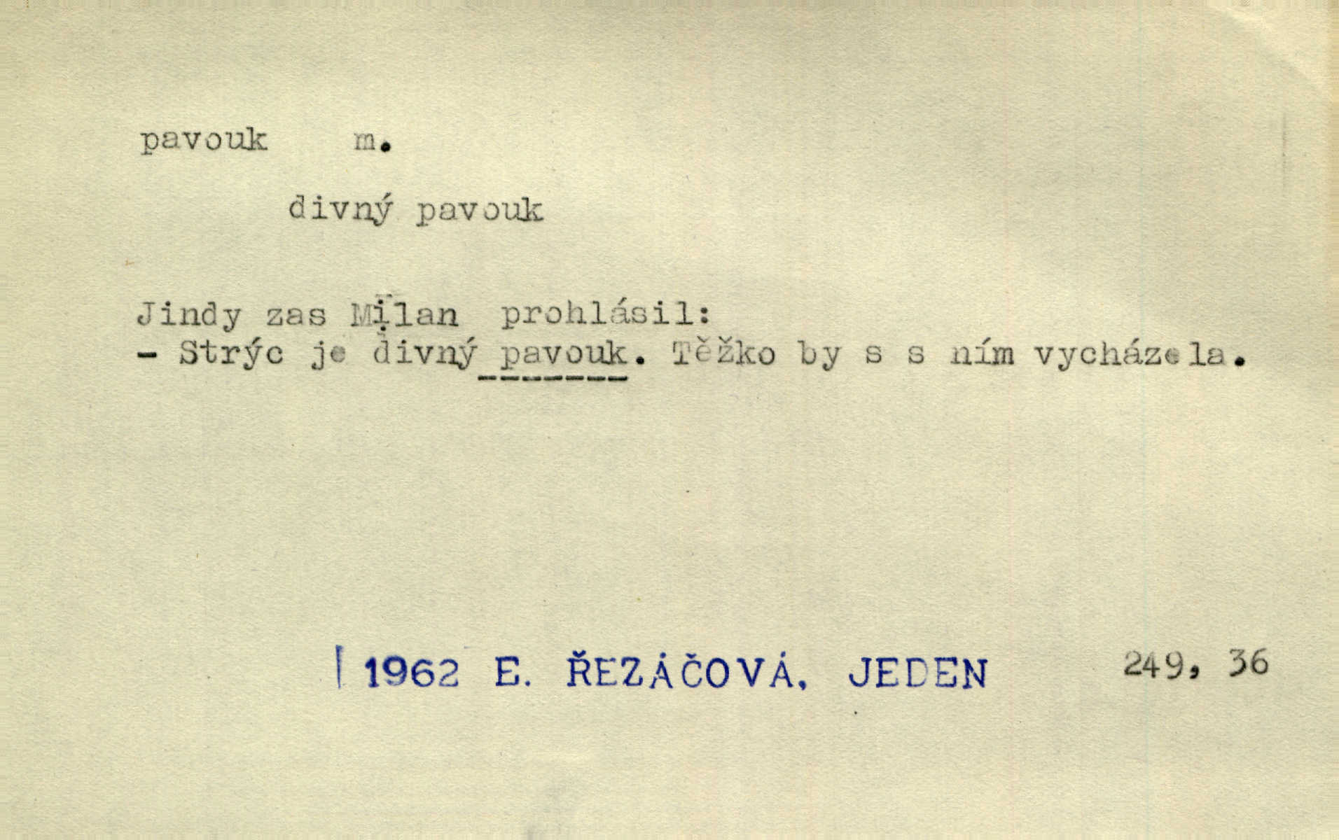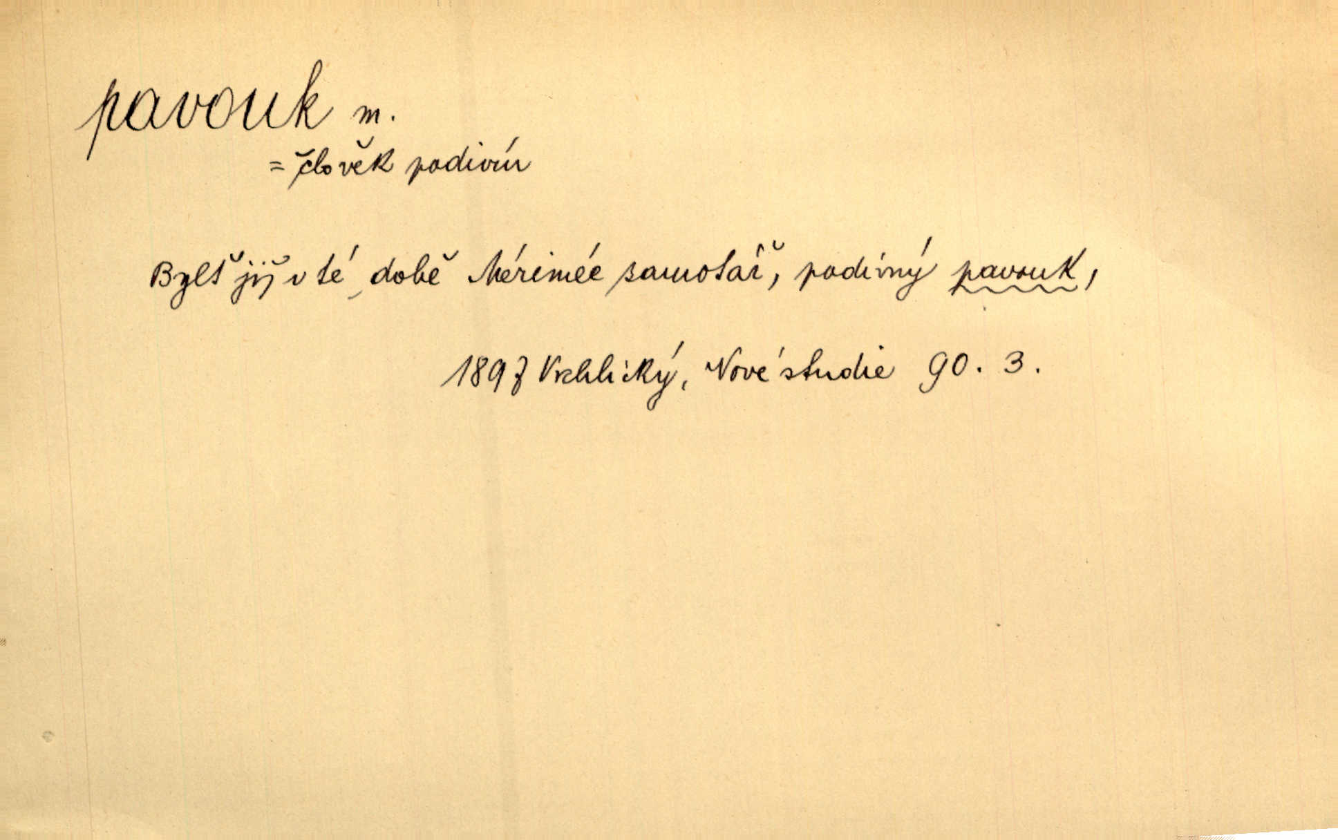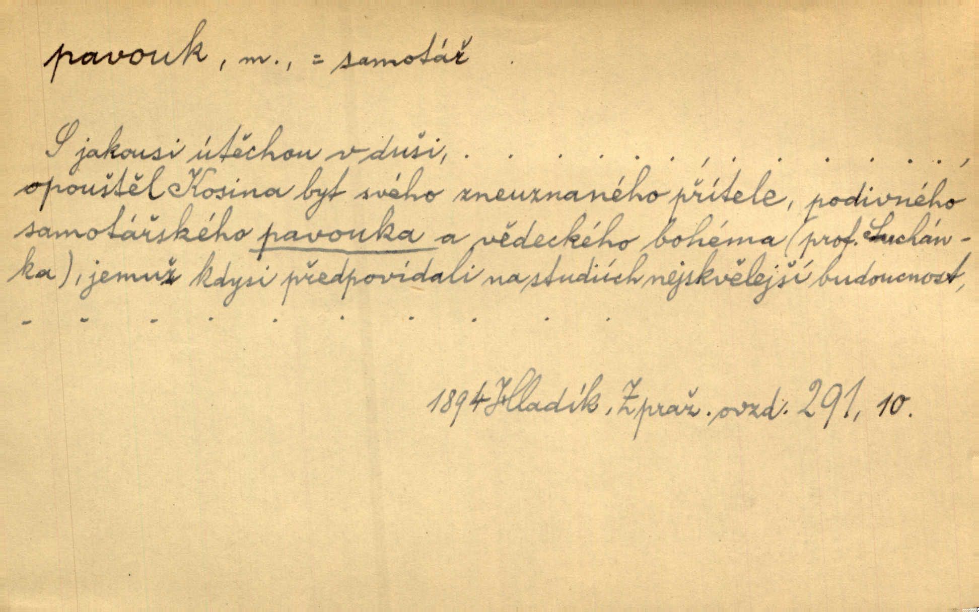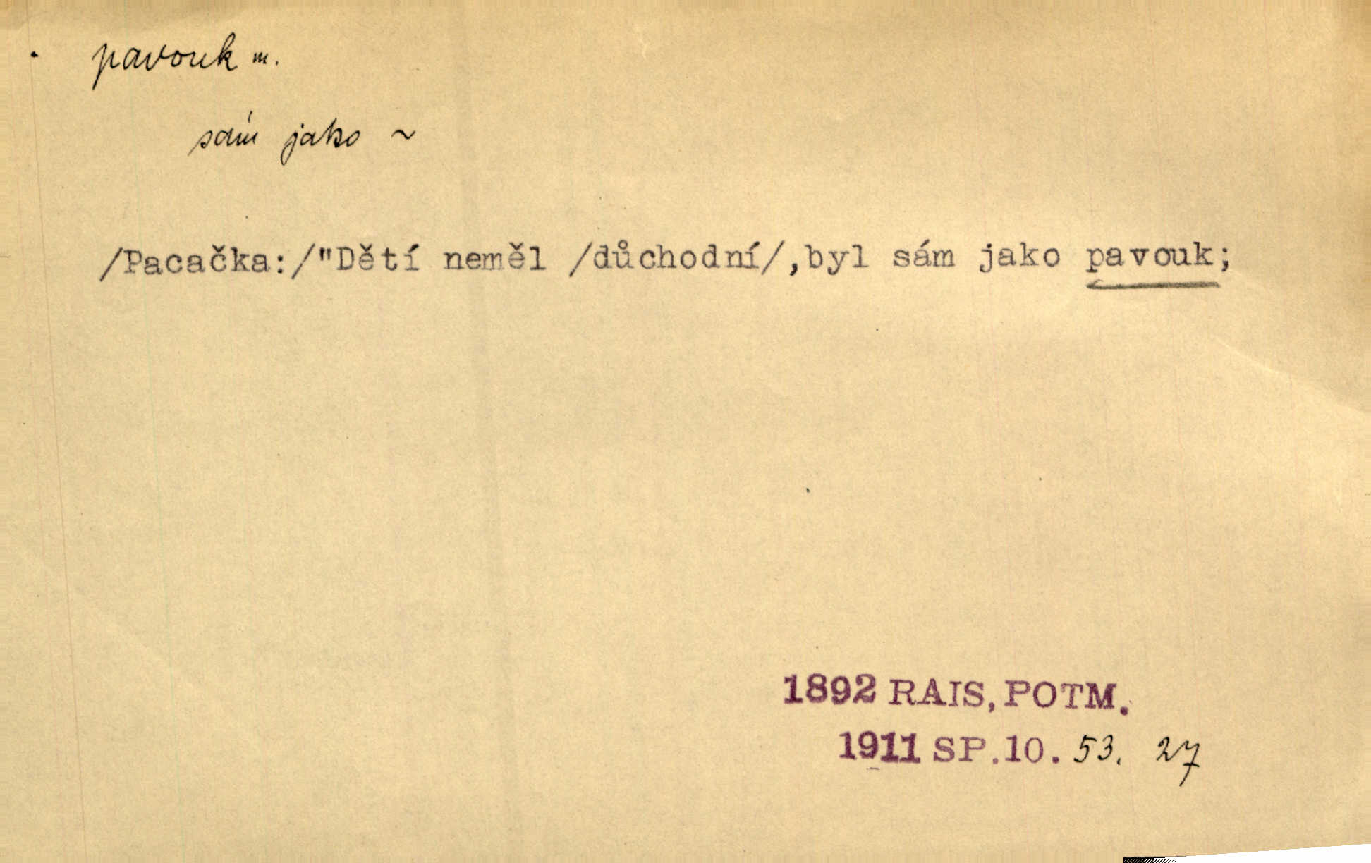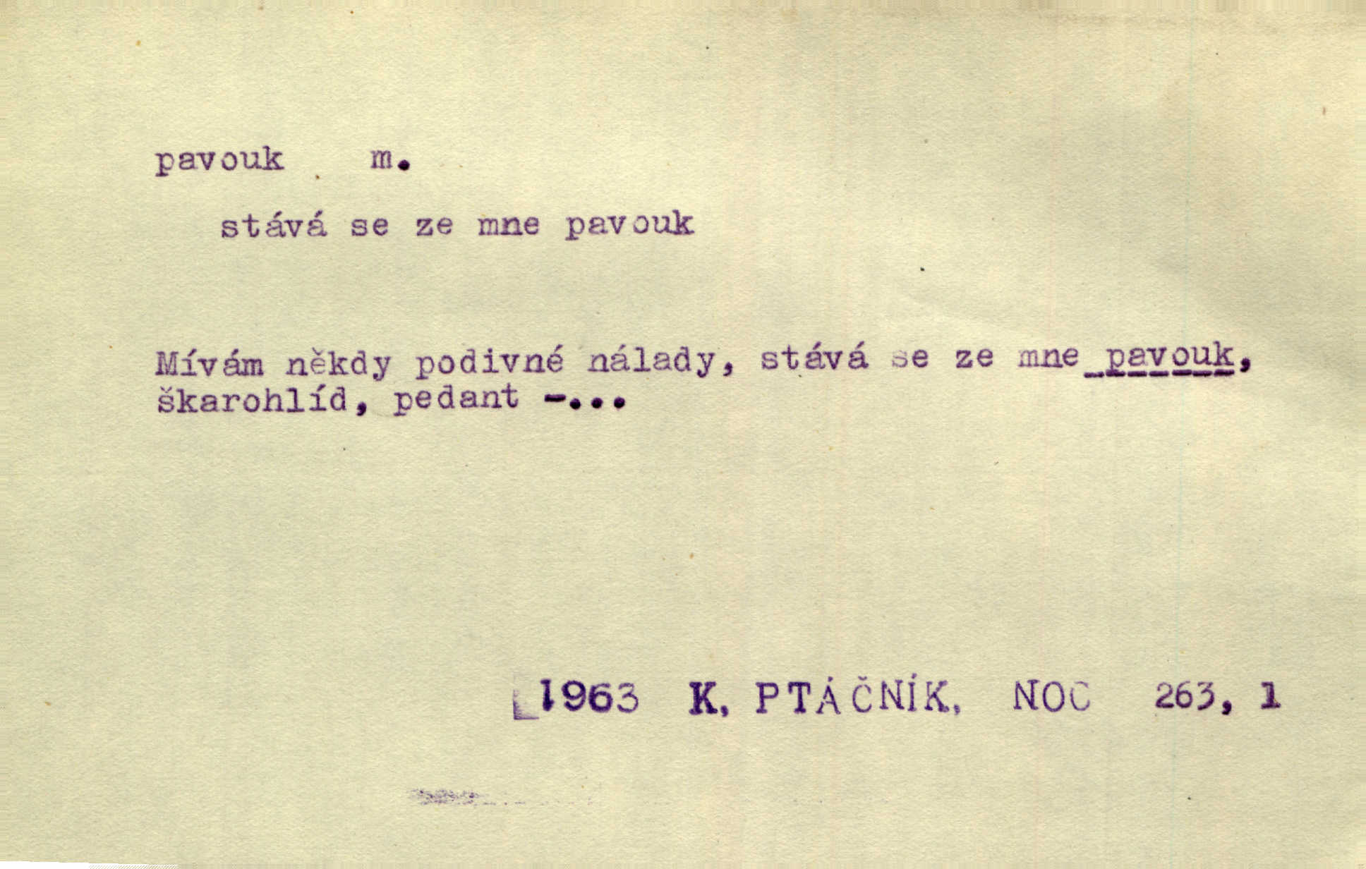 - pavouk, -a m. hmyz vyznačující se snováním pavučin. Kol do kola pavouk sítě husté upřádá. Čech. Prostřed pavučiny seděl veliký pavouk, cucal mouchu. Erb. Velký křížatý pavouk na hebké nitce spouštěl se do prázdna. Rais. Zatáhl se do krámku jako pavouk do své sítě. Vach. Dětí neměl, byl sám jako pavouk. Rais. Dlouhýma nohama statečně jako sekáč pavouk vykračoval. Jir. [Martin] po švihácku prsa vycpával, v pasu tenký jako chrt a v nohách jako pavouk. Jir. Ošíval se, jako by mu pavouk lezl po nahém těle. Šmil. Vypadá, jako by cvrčky louskal a pavouky přikusoval je hubený. Šmil. Přen. Celou ves již obetkal svojí sítí pavouk cizí. Čech. Jen vzadu tam [v hlavě] pavouk zoufalství v své zlomyslné práci neustal. Vrch. Zool. pavouci řád pavoukovitých, Araneae; pavouk křižák Epeira diadema; pavouk vodní vodouch stříbřitý; pavouk mořský krab pavoukový, druh krabů z čeledi Maidae, Maja squinado. D v sebe uzavřený, samotářský člověk, podivín, mrzout. Opouštěl byt svého přítele, podivného samotářského pavouka. Hlad. Bylť již v té době Mérimée samotář, podivný pavouk. Vrch. Bože, tenhle pan Strachovský je odporný pavouk. Svob. Byl to starý pavouk, podivous. Herrm. Jsem protivný pavouk, jehož se brzo zbavíte. Maria. Víš, jaký to jsem mrzutý pavouk. Svět. D Expr. mučivá myšlenka, starost, vrtoch. Otec roztál, měl zase různé pavouky v hlavě. Mah. Máme všichni své pavouky, i když vzdorujeme protivenstvím místa nebo doby. Neu. Ubezpečoval ji, že mu nic není, že jsou to jen takoví pavouci, kteří se mu honí v hlavě. Vrba.