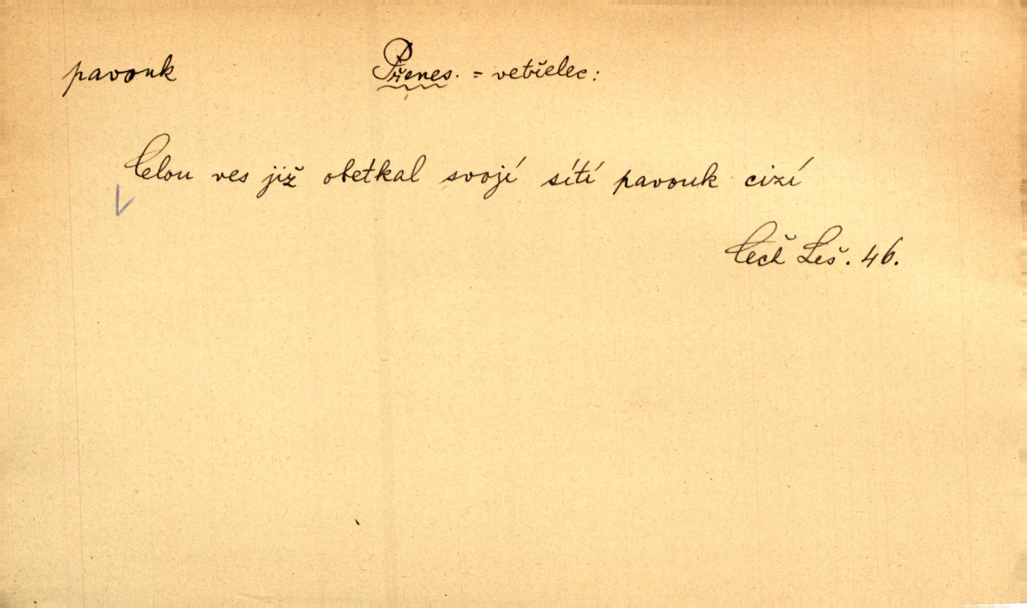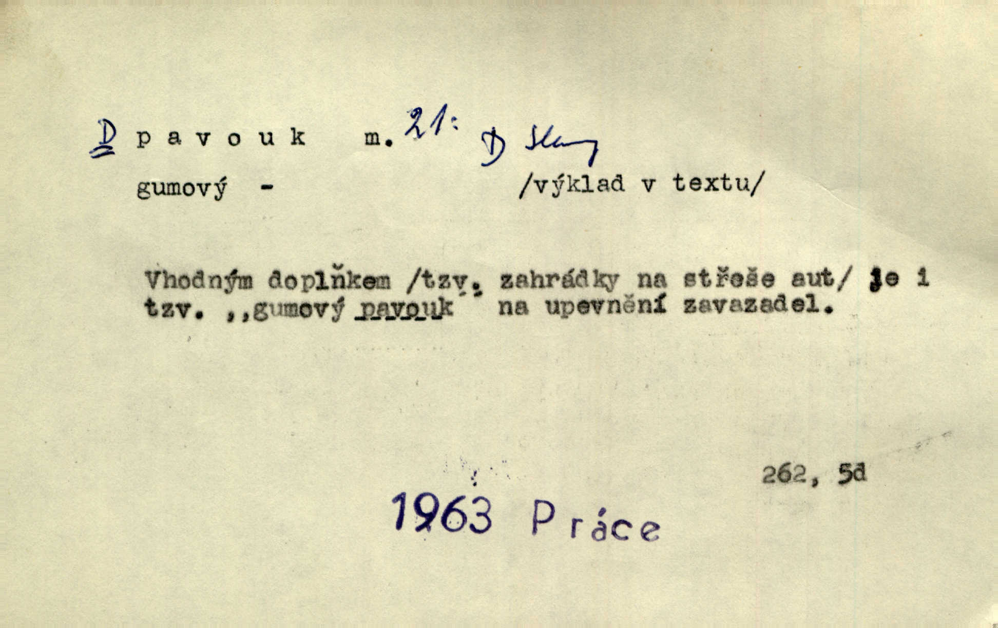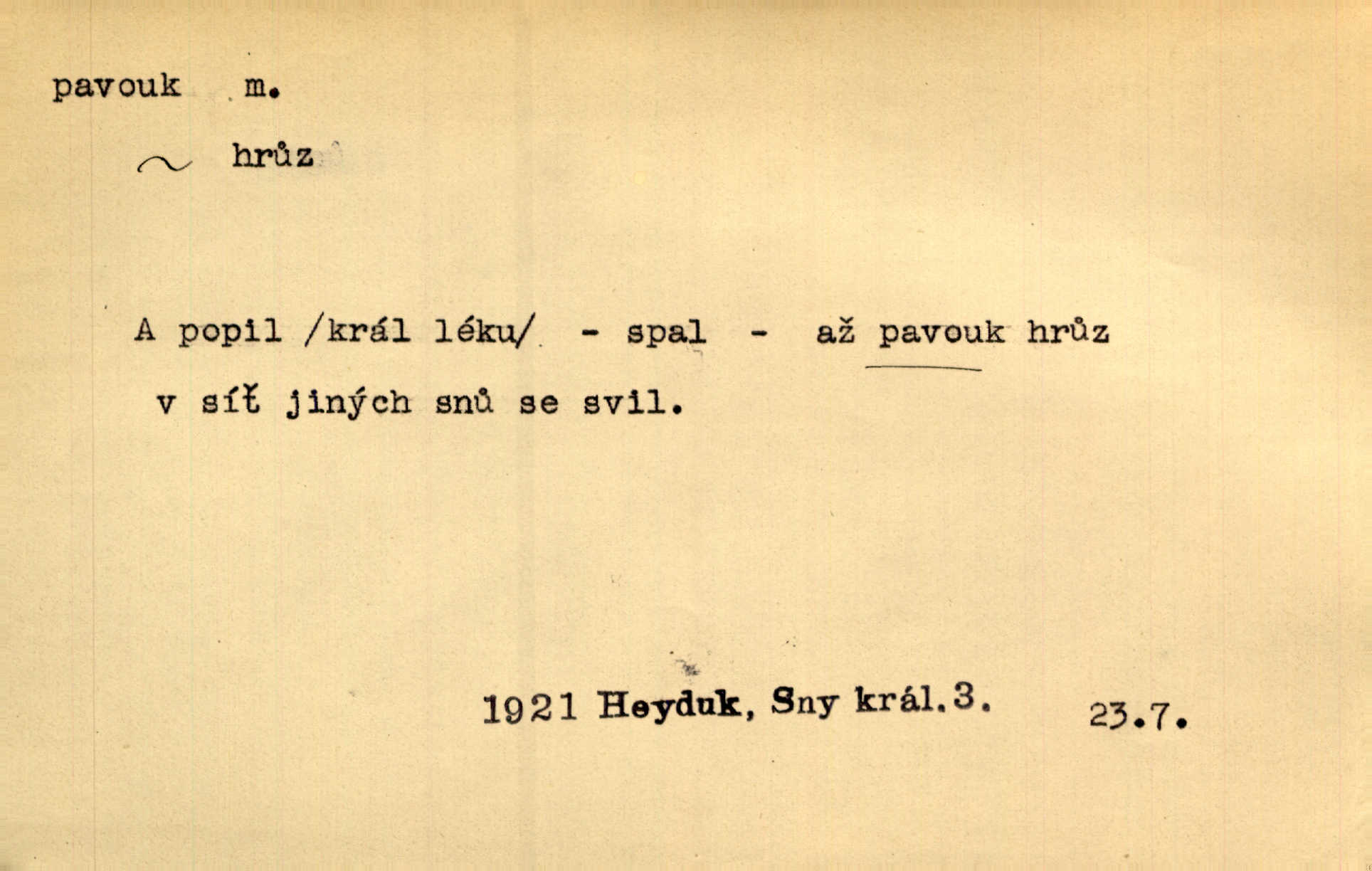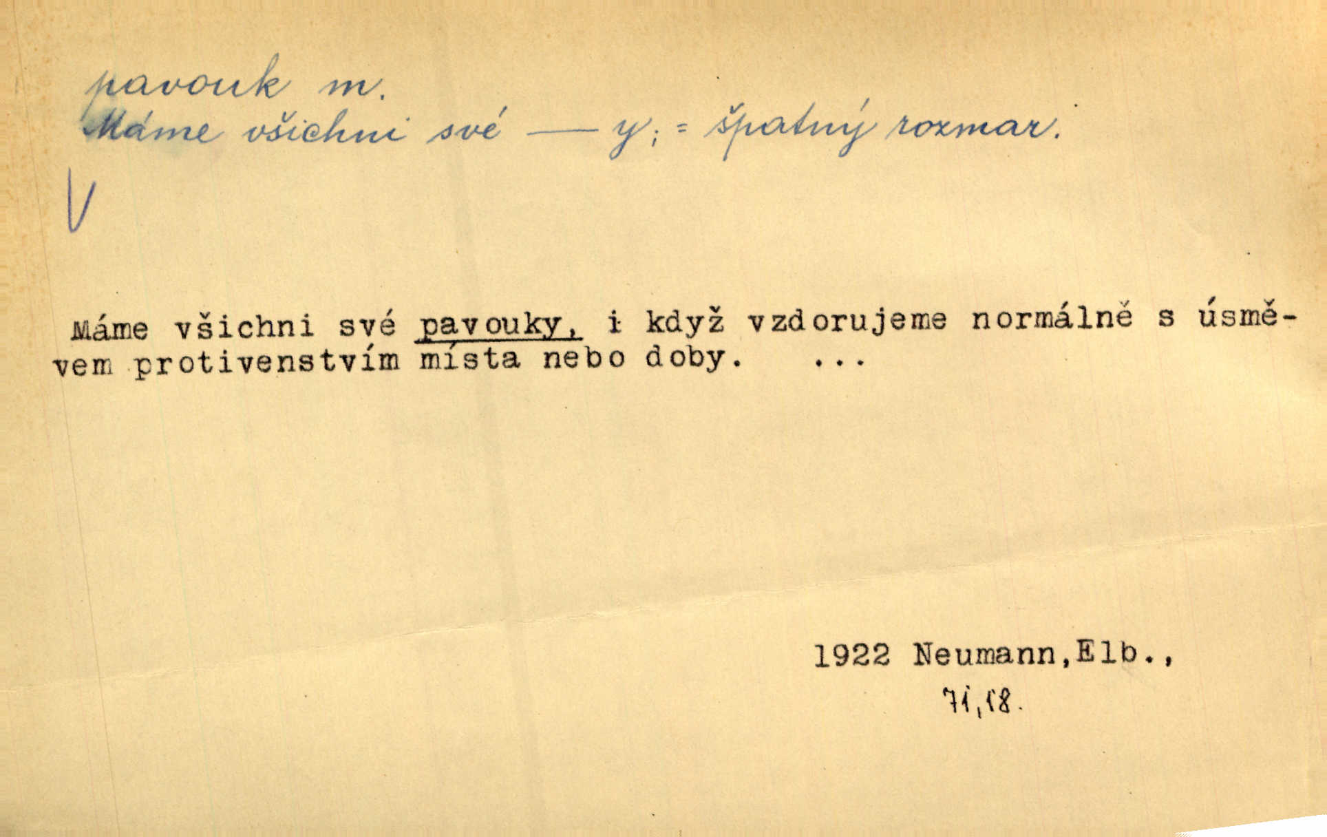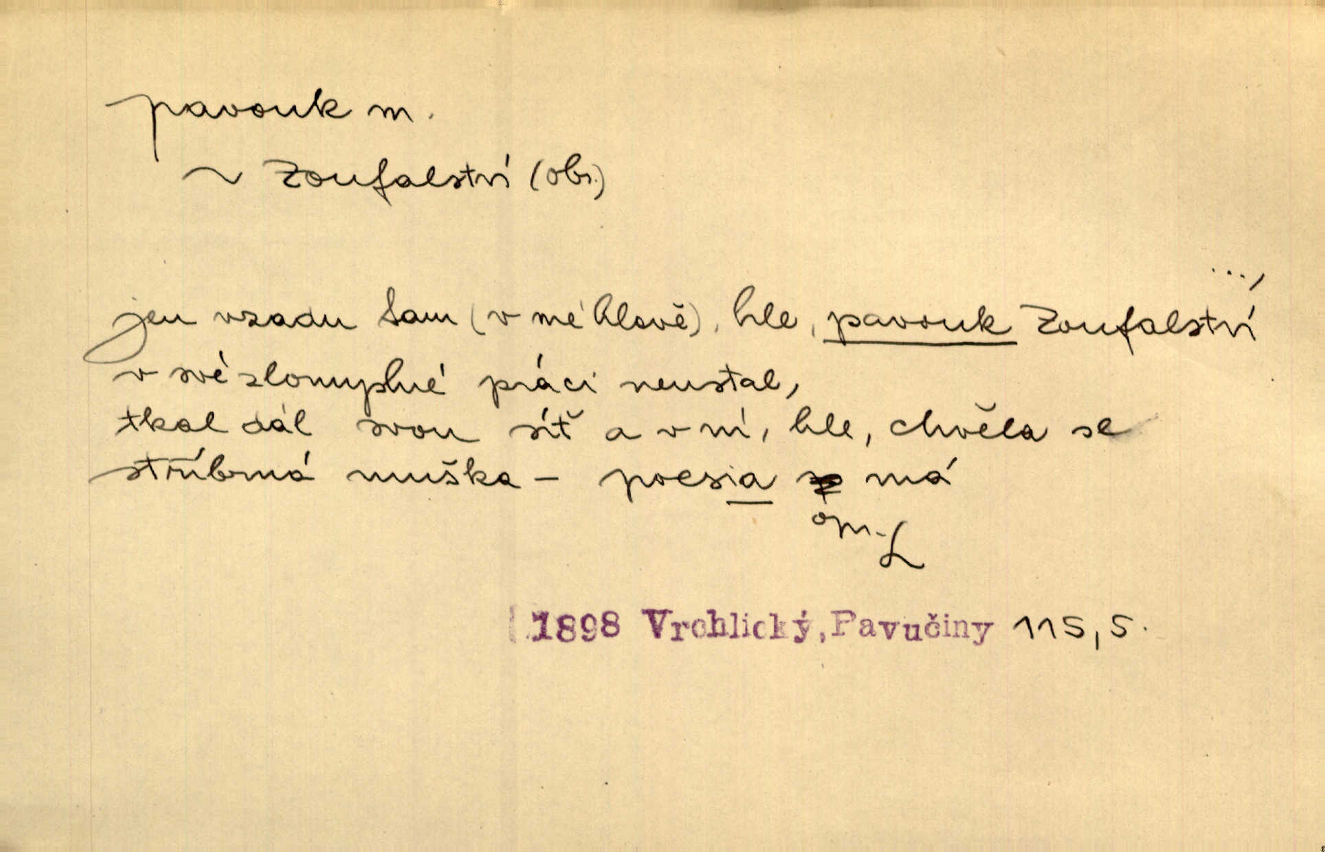 - pavouk, -a m. hmyz vyznačující se snováním pavučin. Kol do kola pavouk sítě husté upřádá. Čech. Prostřed pavučiny seděl veliký pavouk, cucal mouchu. Erb. Velký křížatý pavouk na hebké nitce spouštěl se do prázdna. Rais. Zatáhl se do krámku jako pavouk do své sítě. Vach. Dětí neměl, byl sám jako pavouk. Rais. Dlouhýma nohama statečně jako sekáč pavouk vykračoval. Jir. [Martin] po švihácku prsa vycpával, v pasu tenký jako chrt a v nohách jako pavouk. Jir. Ošíval se, jako by mu pavouk lezl po nahém těle. Šmil. Vypadá, jako by cvrčky louskal a pavouky přikusoval je hubený. Šmil. Přen. Celou ves již obetkal svojí sítí pavouk cizí. Čech. Jen vzadu tam [v hlavě] pavouk zoufalství v své zlomyslné práci neustal. Vrch. Zool. pavouci řád pavoukovitých, Araneae; pavouk křižák Epeira diadema; pavouk vodní vodouch stříbřitý; pavouk mořský krab pavoukový, druh krabů z čeledi Maidae, Maja squinado. D v sebe uzavřený, samotářský člověk, podivín, mrzout. Opouštěl byt svého přítele, podivného samotářského pavouka. Hlad. Bylť již v té době Mérimée samotář, podivný pavouk. Vrch. Bože, tenhle pan Strachovský je odporný pavouk. Svob. Byl to starý pavouk, podivous. Herrm. Jsem protivný pavouk, jehož se brzo zbavíte. Maria. Víš, jaký to jsem mrzutý pavouk. Svět. D Expr. mučivá myšlenka, starost, vrtoch. Otec roztál, měl zase různé pavouky v hlavě. Mah. Máme všichni své pavouky, i když vzdorujeme protivenstvím místa nebo doby. Neu. Ubezpečoval ji, že mu nic není, že jsou to jen takoví pavouci, kteří se mu honí v hlavě. Vrba.