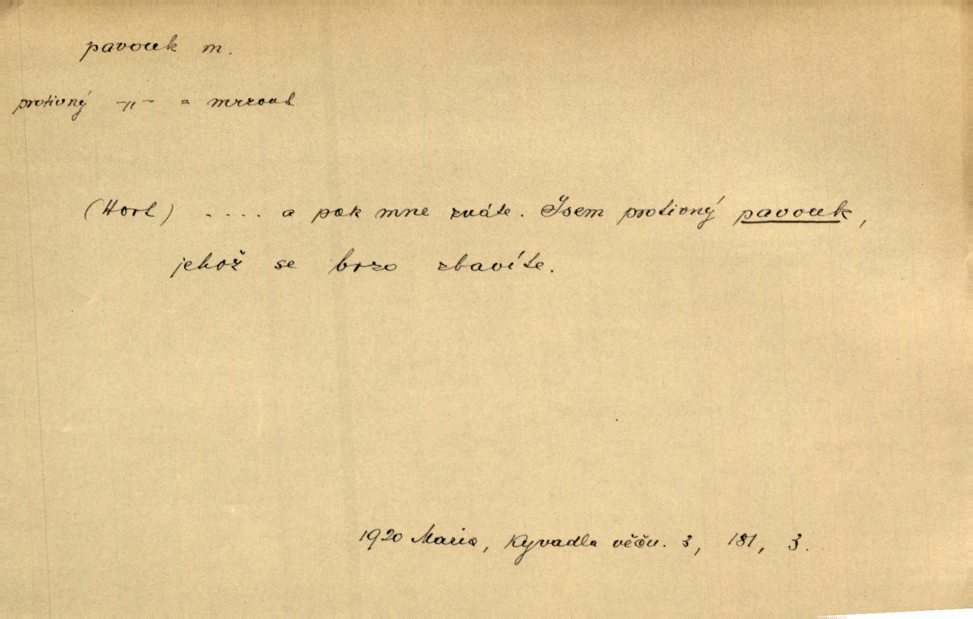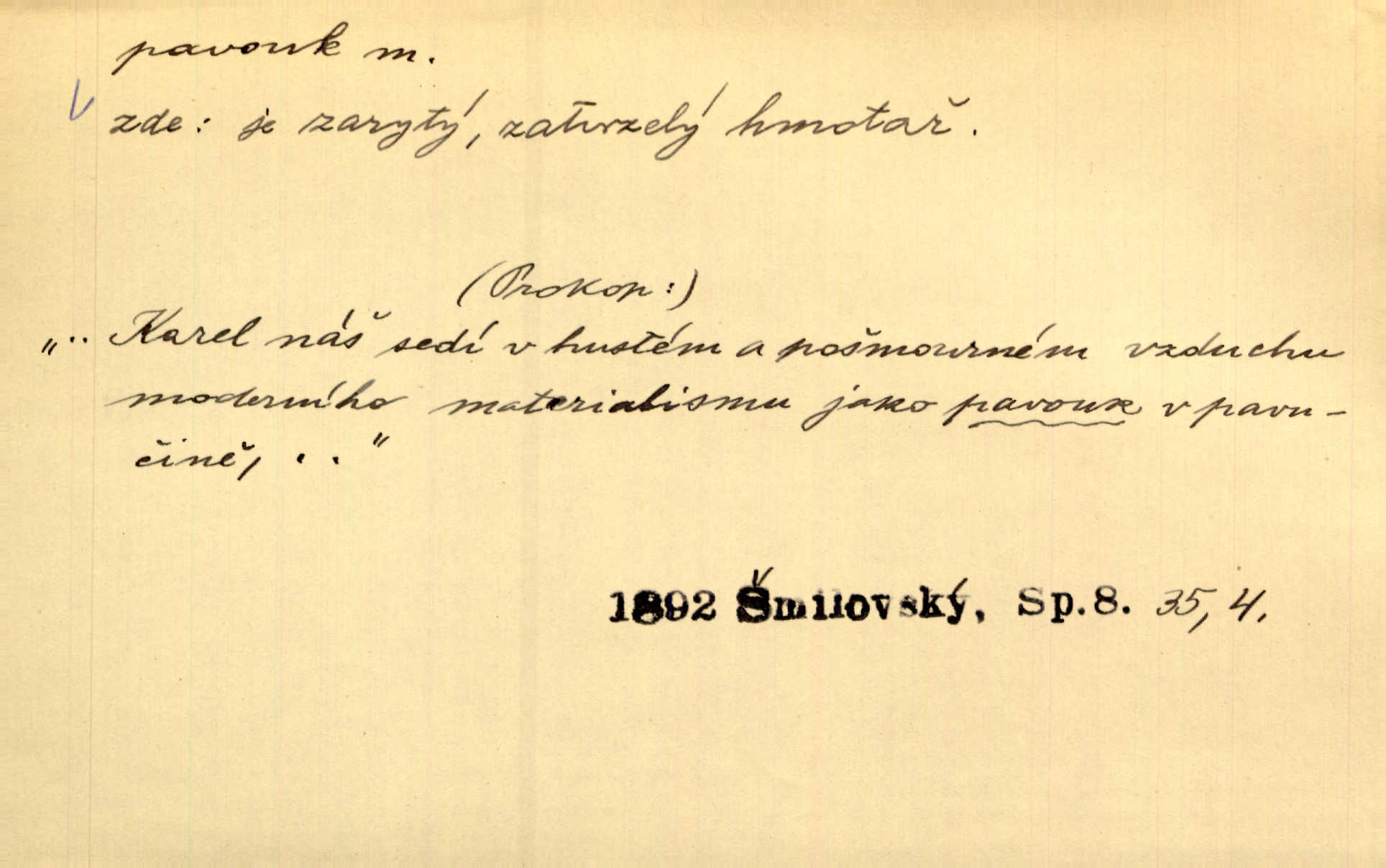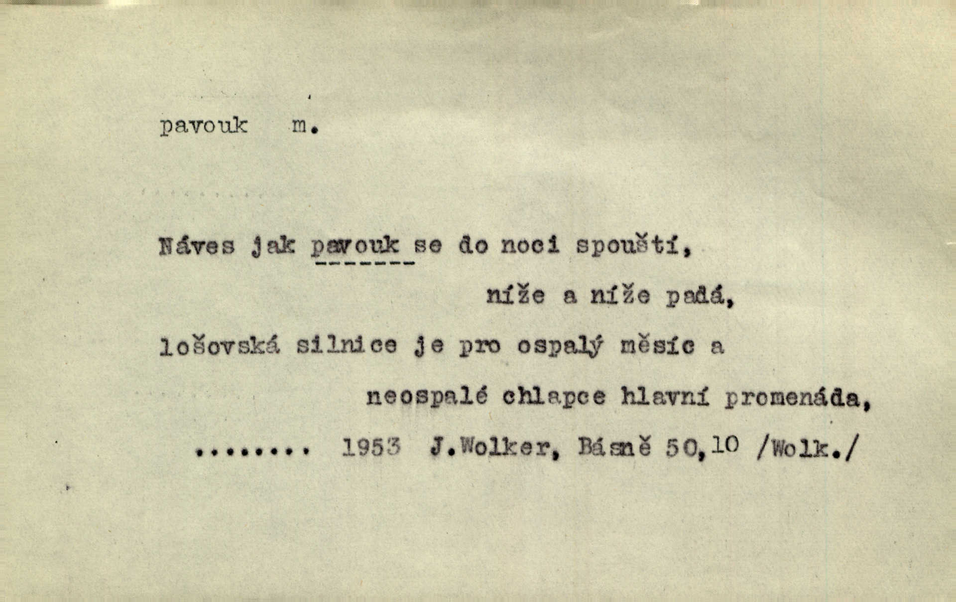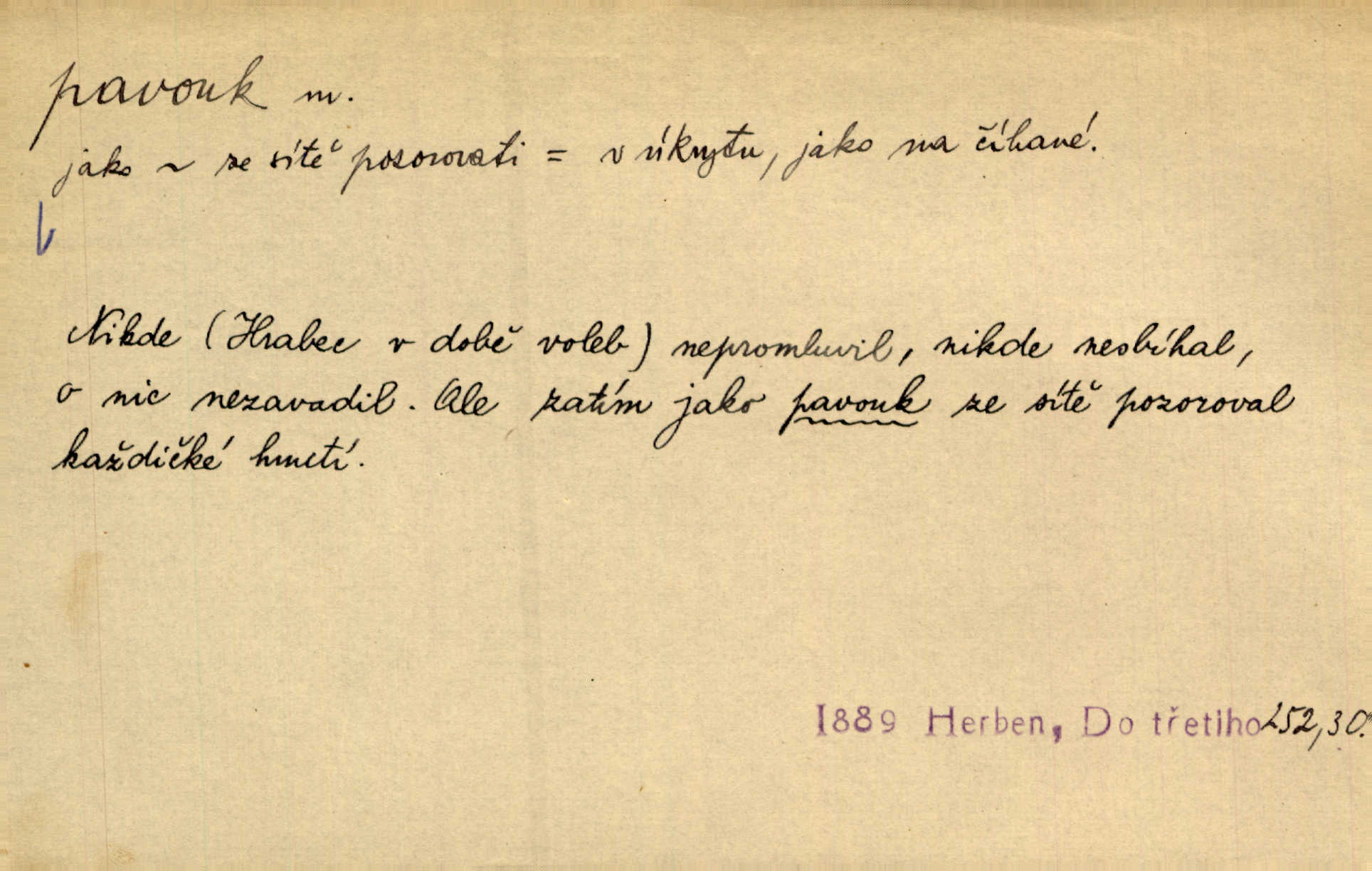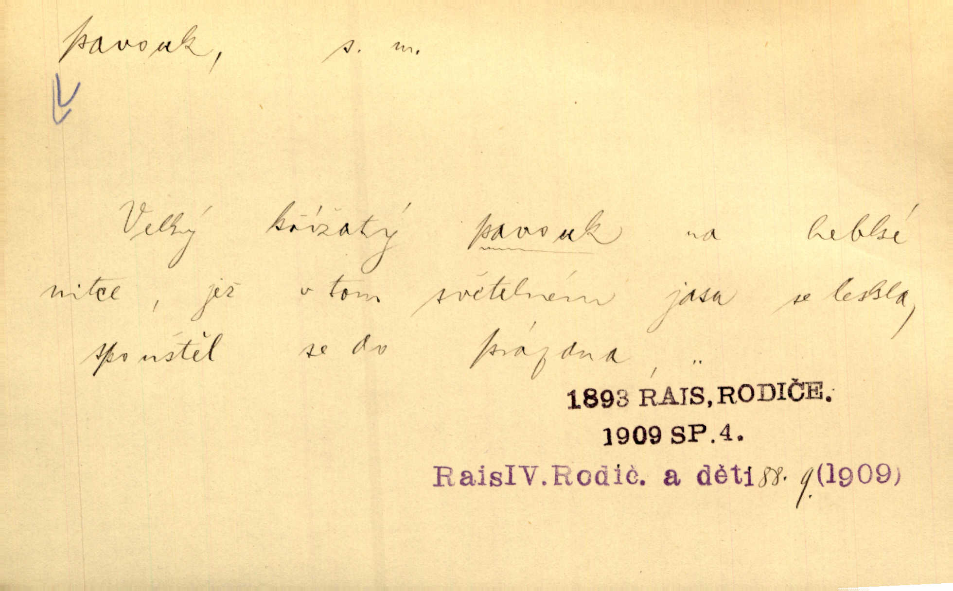 - pavouk, -a m. hmyz vyznačující se snováním pavučin. Kol do kola pavouk sítě husté upřádá. Čech. Prostřed pavučiny seděl veliký pavouk, cucal mouchu. Erb. Velký křížatý pavouk na hebké nitce spouštěl se do prázdna. Rais. Zatáhl se do krámku jako pavouk do své sítě. Vach. Dětí neměl, byl sám jako pavouk. Rais. Dlouhýma nohama statečně jako sekáč pavouk vykračoval. Jir. [Martin] po švihácku prsa vycpával, v pasu tenký jako chrt a v nohách jako pavouk. Jir. Ošíval se, jako by mu pavouk lezl po nahém těle. Šmil. Vypadá, jako by cvrčky louskal a pavouky přikusoval je hubený. Šmil. Přen. Celou ves již obetkal svojí sítí pavouk cizí. Čech. Jen vzadu tam [v hlavě] pavouk zoufalství v své zlomyslné práci neustal. Vrch. Zool. pavouci řád pavoukovitých, Araneae; pavouk křižák Epeira diadema; pavouk vodní vodouch stříbřitý; pavouk mořský krab pavoukový, druh krabů z čeledi Maidae, Maja squinado. D v sebe uzavřený, samotářský člověk, podivín, mrzout. Opouštěl byt svého přítele, podivného samotářského pavouka. Hlad. Bylť již v té době Mérimée samotář, podivný pavouk. Vrch. Bože, tenhle pan Strachovský je odporný pavouk. Svob. Byl to starý pavouk, podivous. Herrm. Jsem protivný pavouk, jehož se brzo zbavíte. Maria. Víš, jaký to jsem mrzutý pavouk. Svět. D Expr. mučivá myšlenka, starost, vrtoch. Otec roztál, měl zase různé pavouky v hlavě. Mah. Máme všichni své pavouky, i když vzdorujeme protivenstvím místa nebo doby. Neu. Ubezpečoval ji, že mu nic není, že jsou to jen takoví pavouci, kteří se mu honí v hlavě. Vrba.