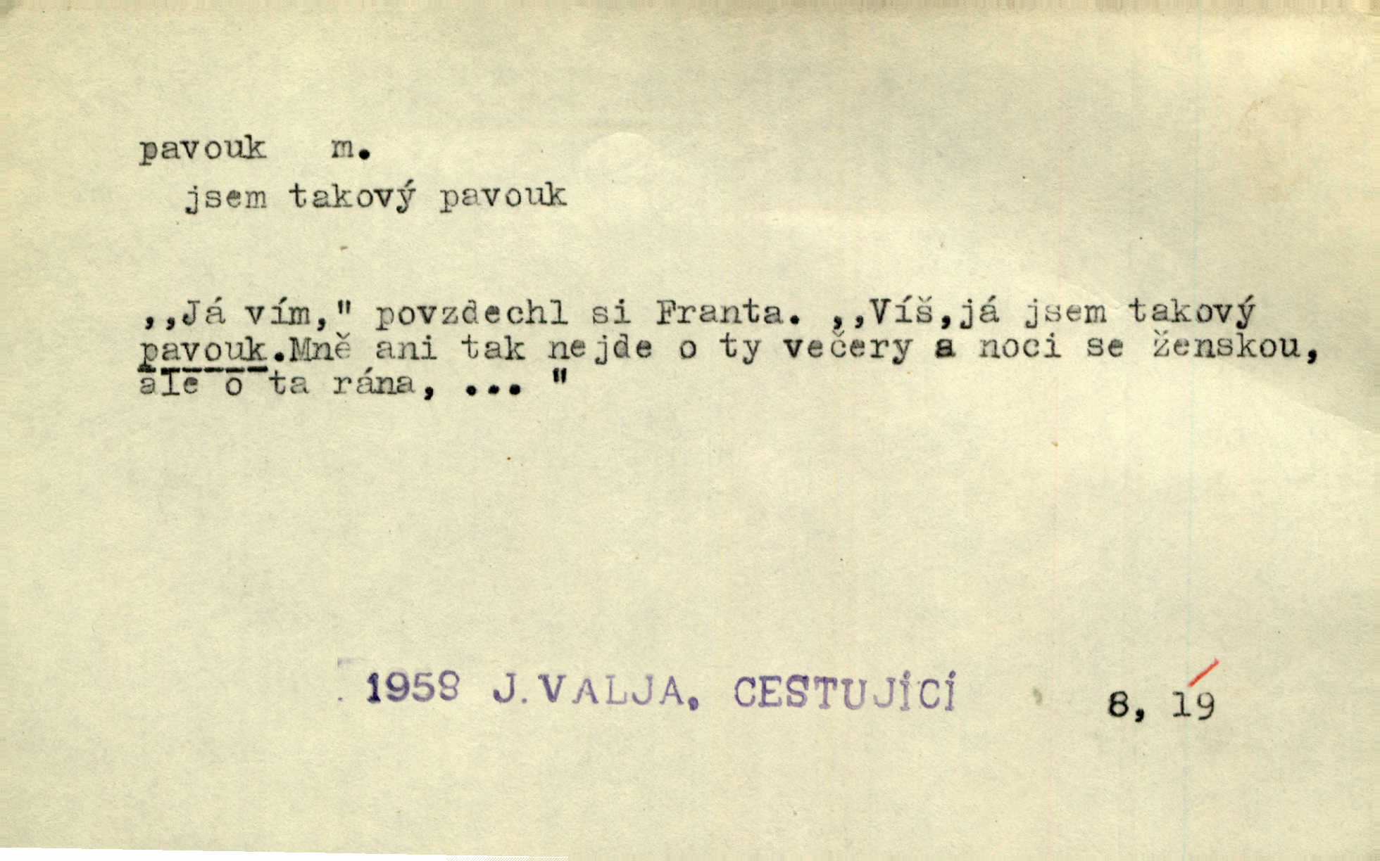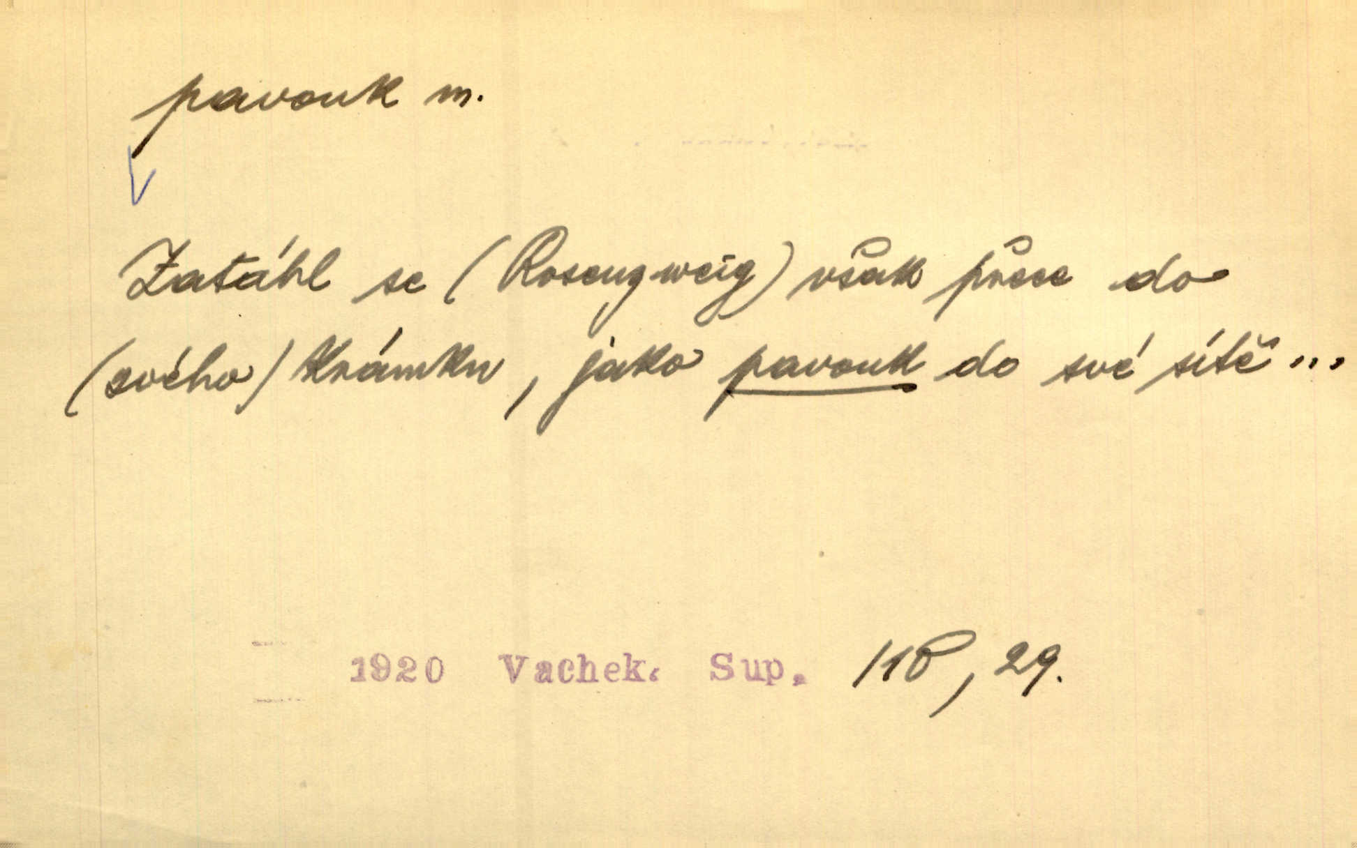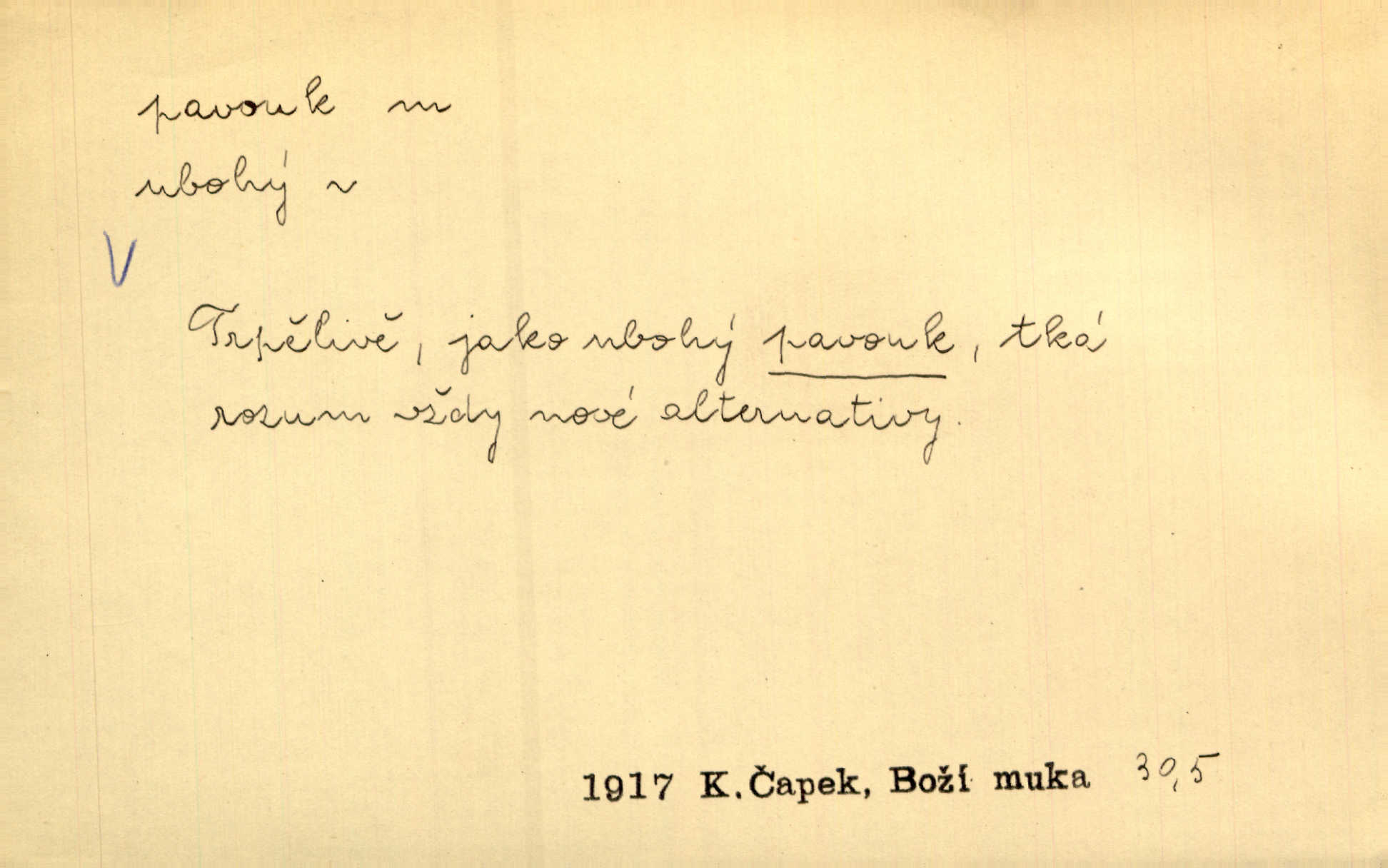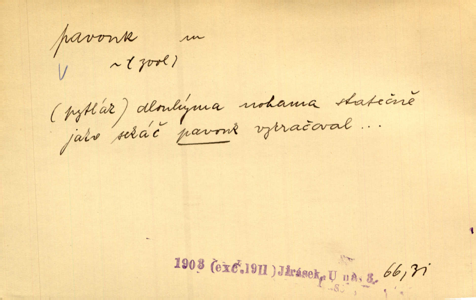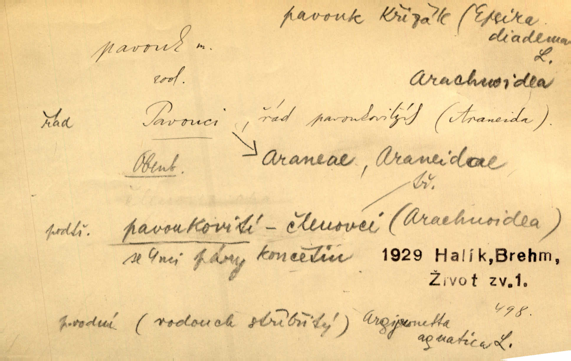 - pavouk, -a m. hmyz vyznačující se snováním pavučin. Kol do kola pavouk sítě husté upřádá. Čech. Prostřed pavučiny seděl veliký pavouk, cucal mouchu. Erb. Velký křížatý pavouk na hebké nitce spouštěl se do prázdna. Rais. Zatáhl se do krámku jako pavouk do své sítě. Vach. Dětí neměl, byl sám jako pavouk. Rais. Dlouhýma nohama statečně jako sekáč pavouk vykračoval. Jir. [Martin] po švihácku prsa vycpával, v pasu tenký jako chrt a v nohách jako pavouk. Jir. Ošíval se, jako by mu pavouk lezl po nahém těle. Šmil. Vypadá, jako by cvrčky louskal a pavouky přikusoval je hubený. Šmil. Přen. Celou ves již obetkal svojí sítí pavouk cizí. Čech. Jen vzadu tam [v hlavě] pavouk zoufalství v své zlomyslné práci neustal. Vrch. Zool. pavouci řád pavoukovitých, Araneae; pavouk křižák Epeira diadema; pavouk vodní vodouch stříbřitý; pavouk mořský krab pavoukový, druh krabů z čeledi Maidae, Maja squinado. D v sebe uzavřený, samotářský člověk, podivín, mrzout. Opouštěl byt svého přítele, podivného samotářského pavouka. Hlad. Bylť již v té době Mérimée samotář, podivný pavouk. Vrch. Bože, tenhle pan Strachovský je odporný pavouk. Svob. Byl to starý pavouk, podivous. Herrm. Jsem protivný pavouk, jehož se brzo zbavíte. Maria. Víš, jaký to jsem mrzutý pavouk. Svět. D Expr. mučivá myšlenka, starost, vrtoch. Otec roztál, měl zase různé pavouky v hlavě. Mah. Máme všichni své pavouky, i když vzdorujeme protivenstvím místa nebo doby. Neu. Ubezpečoval ji, že mu nic není, že jsou to jen takoví pavouci, kteří se mu honí v hlavě. Vrba.