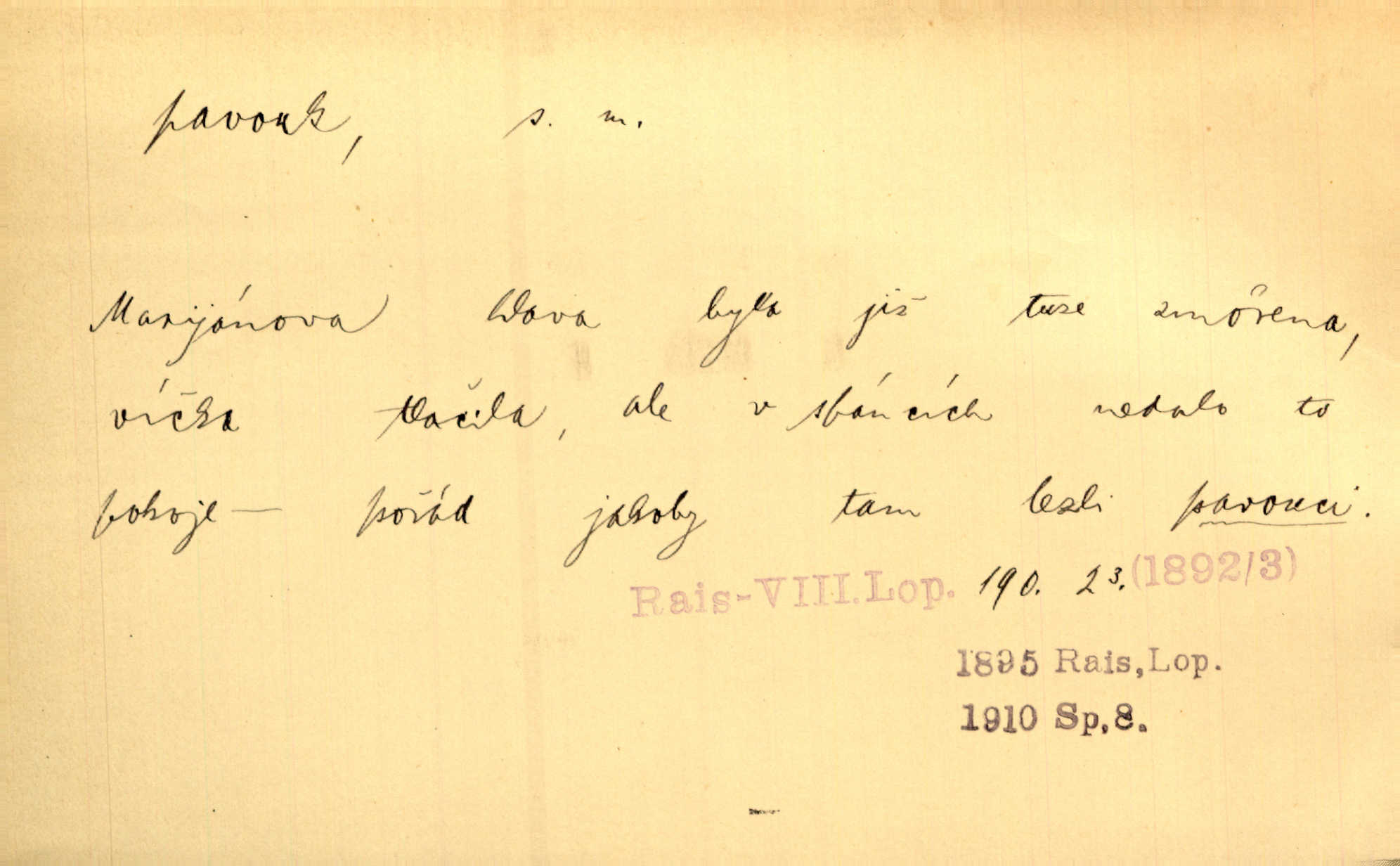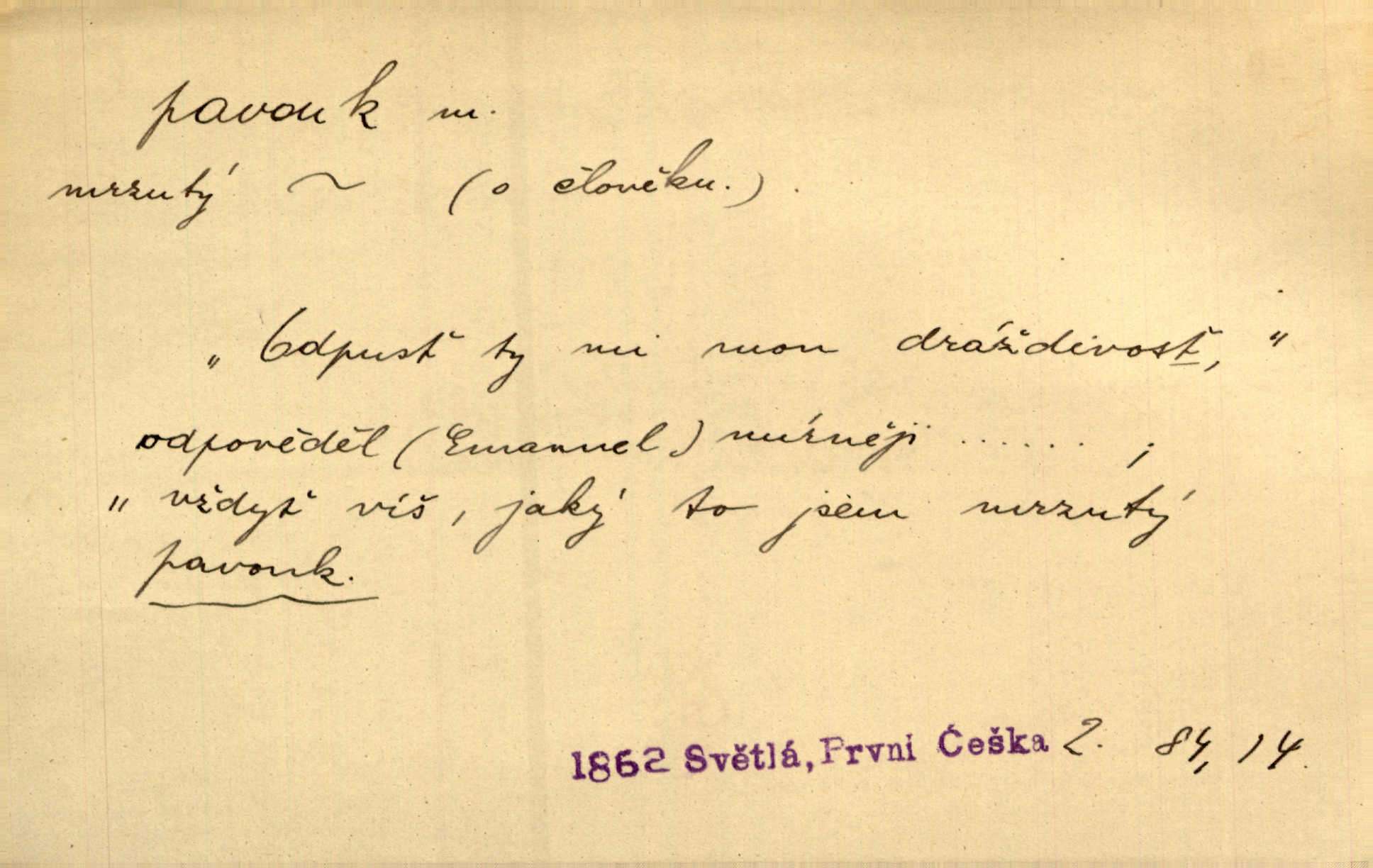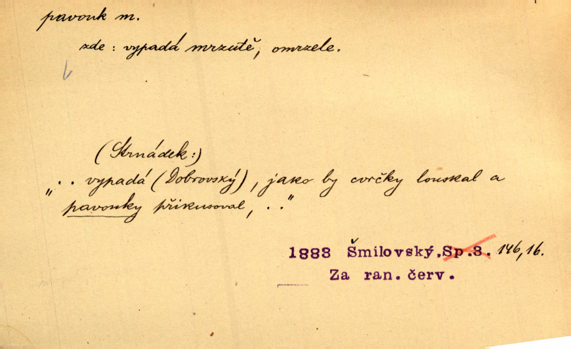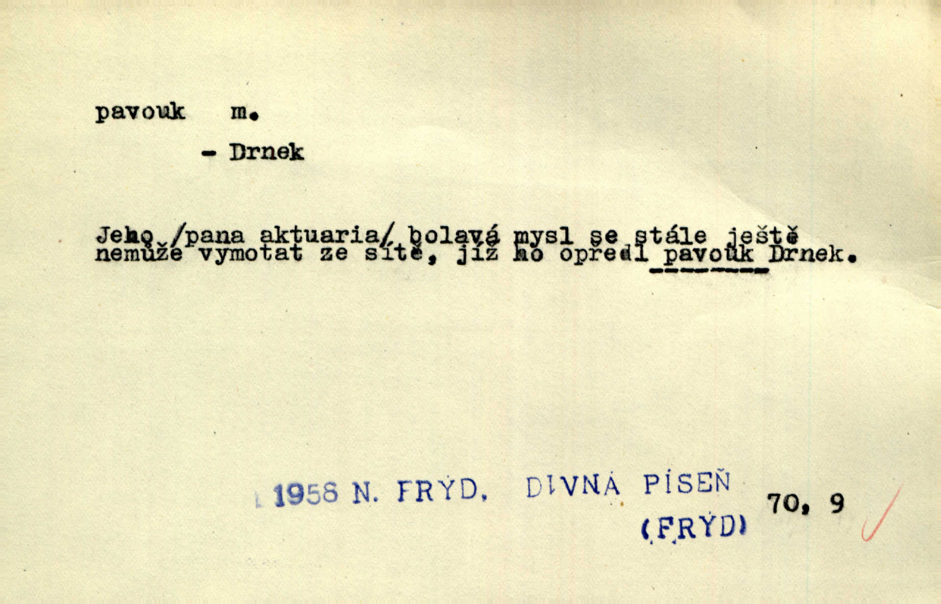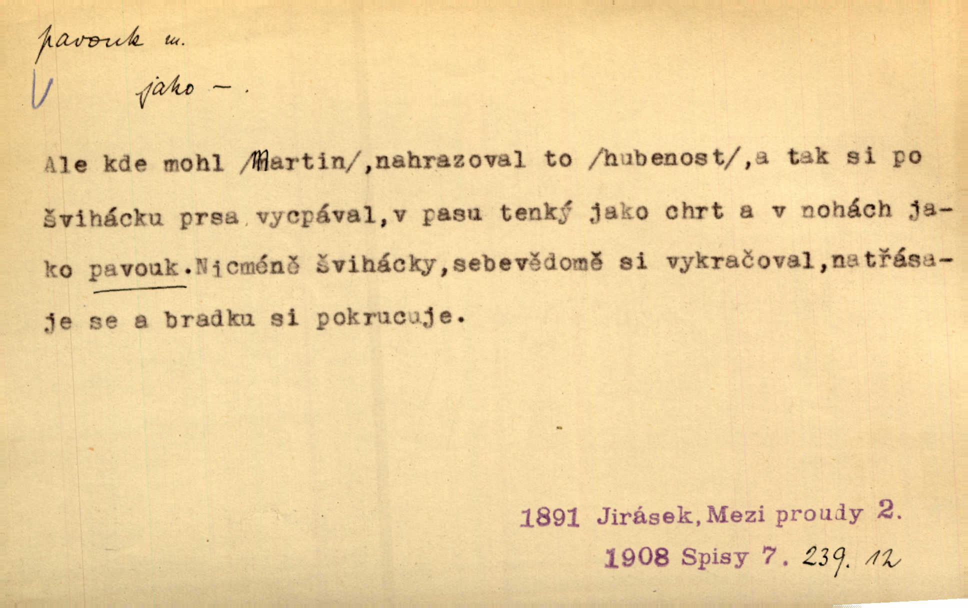 - pavouk, -a m. hmyz vyznačující se snováním pavučin. Kol do kola pavouk sítě husté upřádá. Čech. Prostřed pavučiny seděl veliký pavouk, cucal mouchu. Erb. Velký křížatý pavouk na hebké nitce spouštěl se do prázdna. Rais. Zatáhl se do krámku jako pavouk do své sítě. Vach. Dětí neměl, byl sám jako pavouk. Rais. Dlouhýma nohama statečně jako sekáč pavouk vykračoval. Jir. [Martin] po švihácku prsa vycpával, v pasu tenký jako chrt a v nohách jako pavouk. Jir. Ošíval se, jako by mu pavouk lezl po nahém těle. Šmil. Vypadá, jako by cvrčky louskal a pavouky přikusoval je hubený. Šmil. Přen. Celou ves již obetkal svojí sítí pavouk cizí. Čech. Jen vzadu tam [v hlavě] pavouk zoufalství v své zlomyslné práci neustal. Vrch. Zool. pavouci řád pavoukovitých, Araneae; pavouk křižák Epeira diadema; pavouk vodní vodouch stříbřitý; pavouk mořský krab pavoukový, druh krabů z čeledi Maidae, Maja squinado. D v sebe uzavřený, samotářský člověk, podivín, mrzout. Opouštěl byt svého přítele, podivného samotářského pavouka. Hlad. Bylť již v té době Mérimée samotář, podivný pavouk. Vrch. Bože, tenhle pan Strachovský je odporný pavouk. Svob. Byl to starý pavouk, podivous. Herrm. Jsem protivný pavouk, jehož se brzo zbavíte. Maria. Víš, jaký to jsem mrzutý pavouk. Svět. D Expr. mučivá myšlenka, starost, vrtoch. Otec roztál, měl zase různé pavouky v hlavě. Mah. Máme všichni své pavouky, i když vzdorujeme protivenstvím místa nebo doby. Neu. Ubezpečoval ji, že mu nic není, že jsou to jen takoví pavouci, kteří se mu honí v hlavě. Vrba.