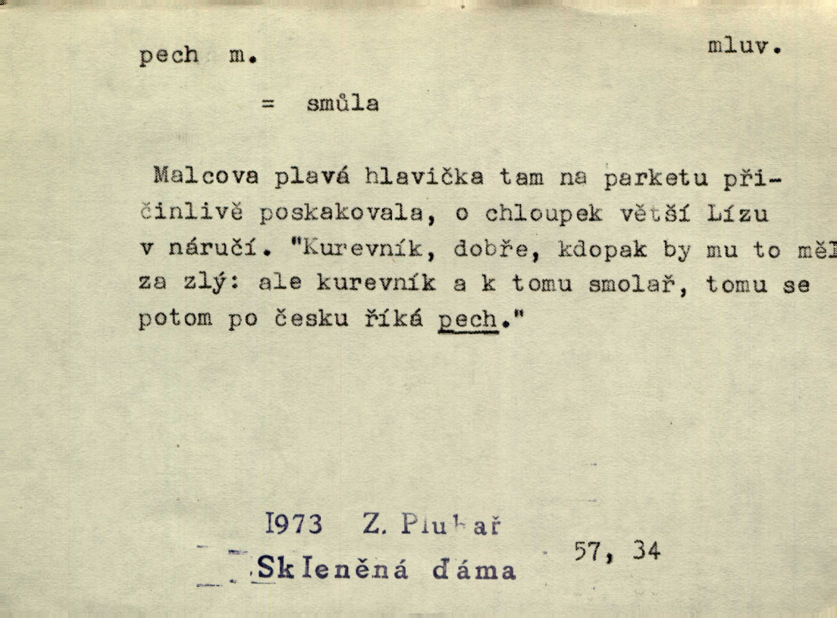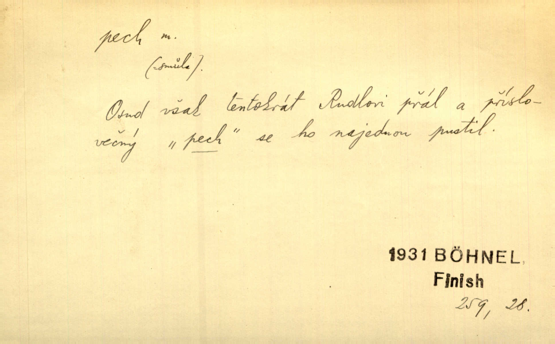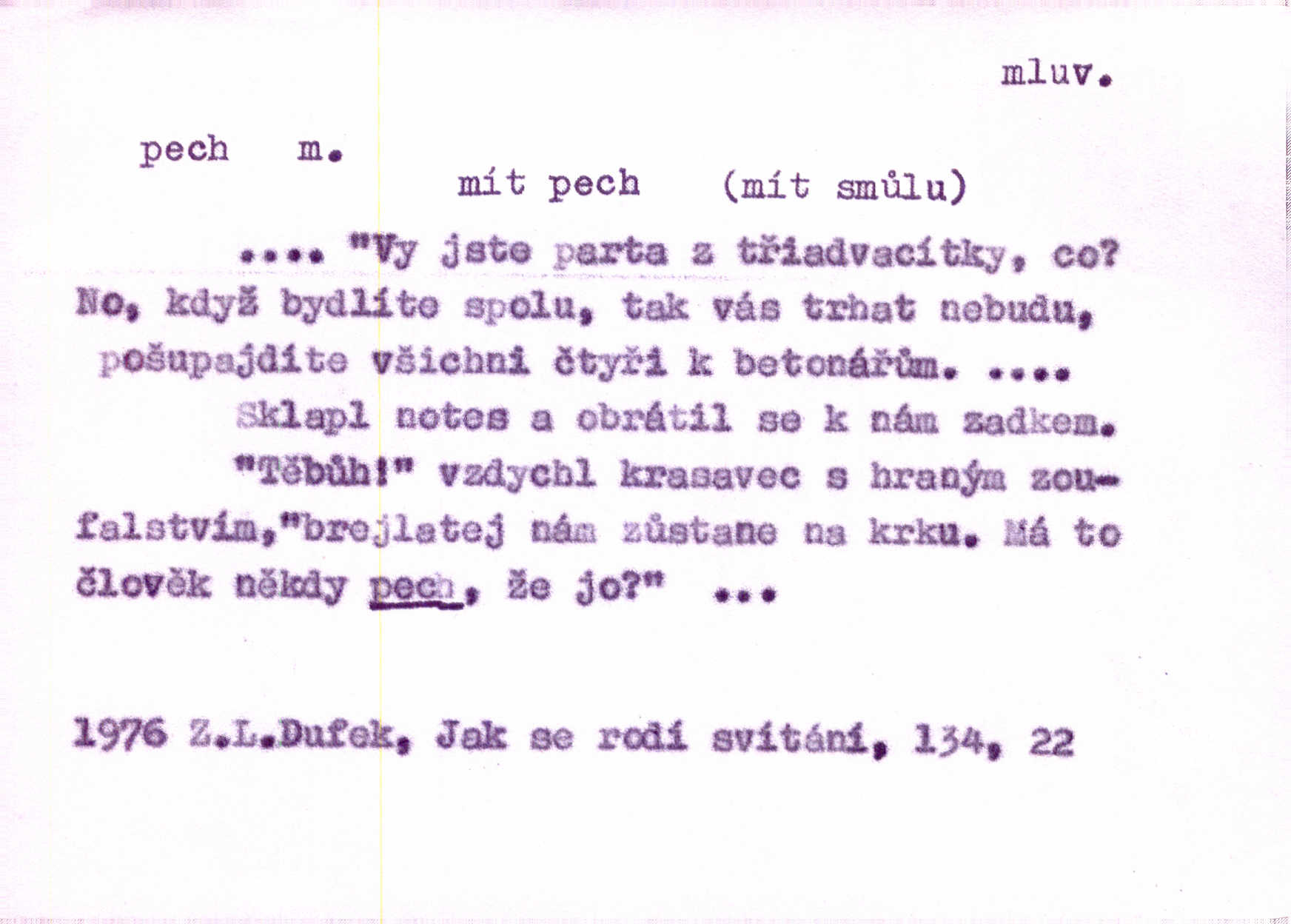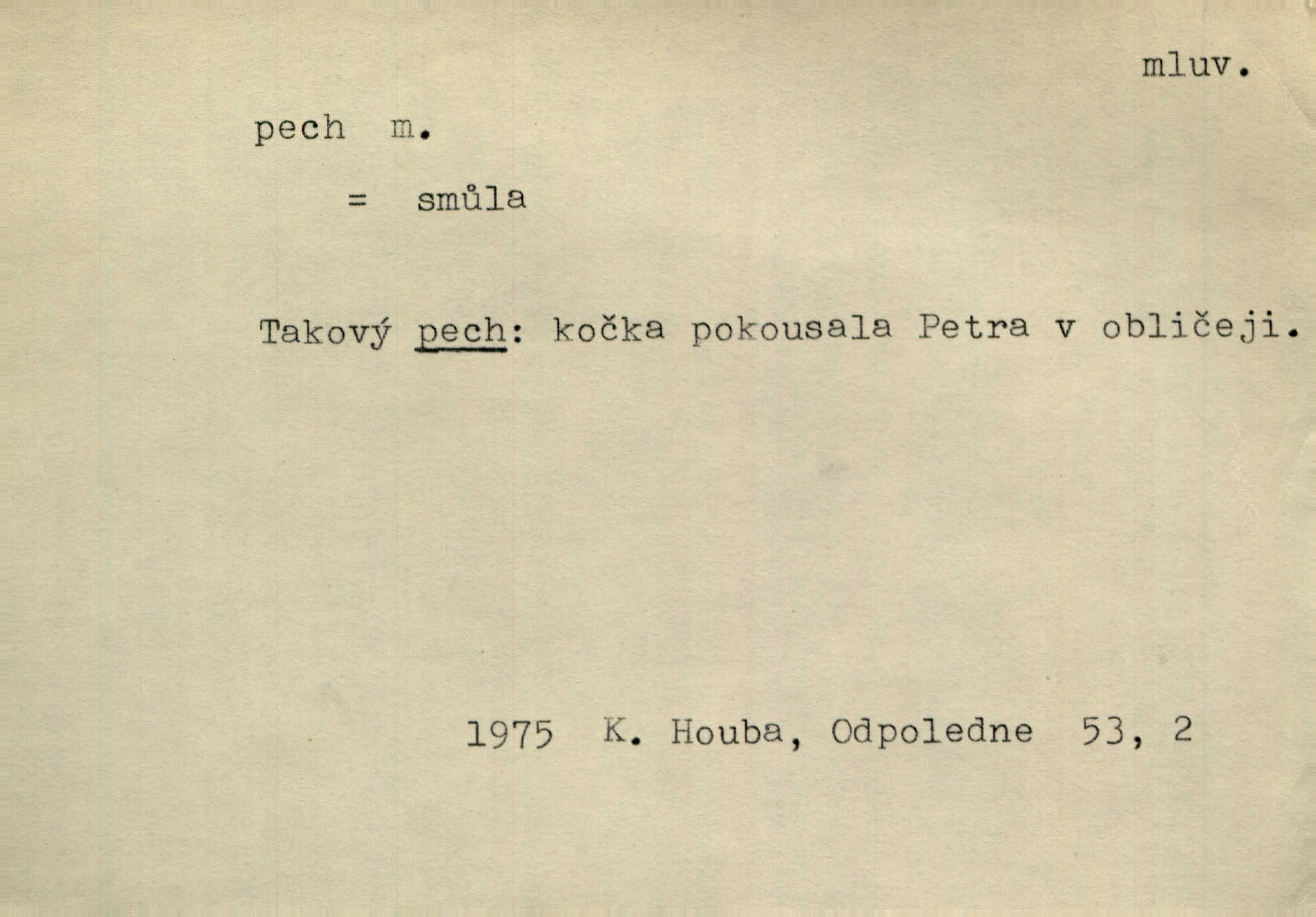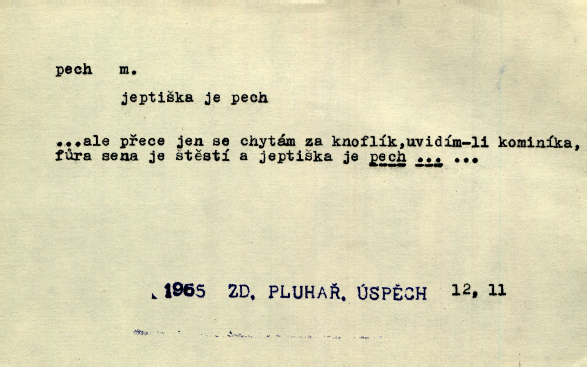 - pech, -u m. lid. nezdar, smůla. Osud tentokrát Rudlovi přál a příslovečný „pech“ se ho pustil. Böhn. Mám zatracenej pech v svým životě! Zaor. Ten [první hoch] štěstí měl, ten [druhý] pech. Dyk.