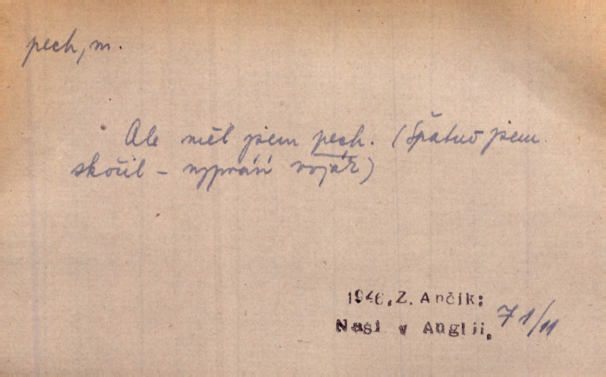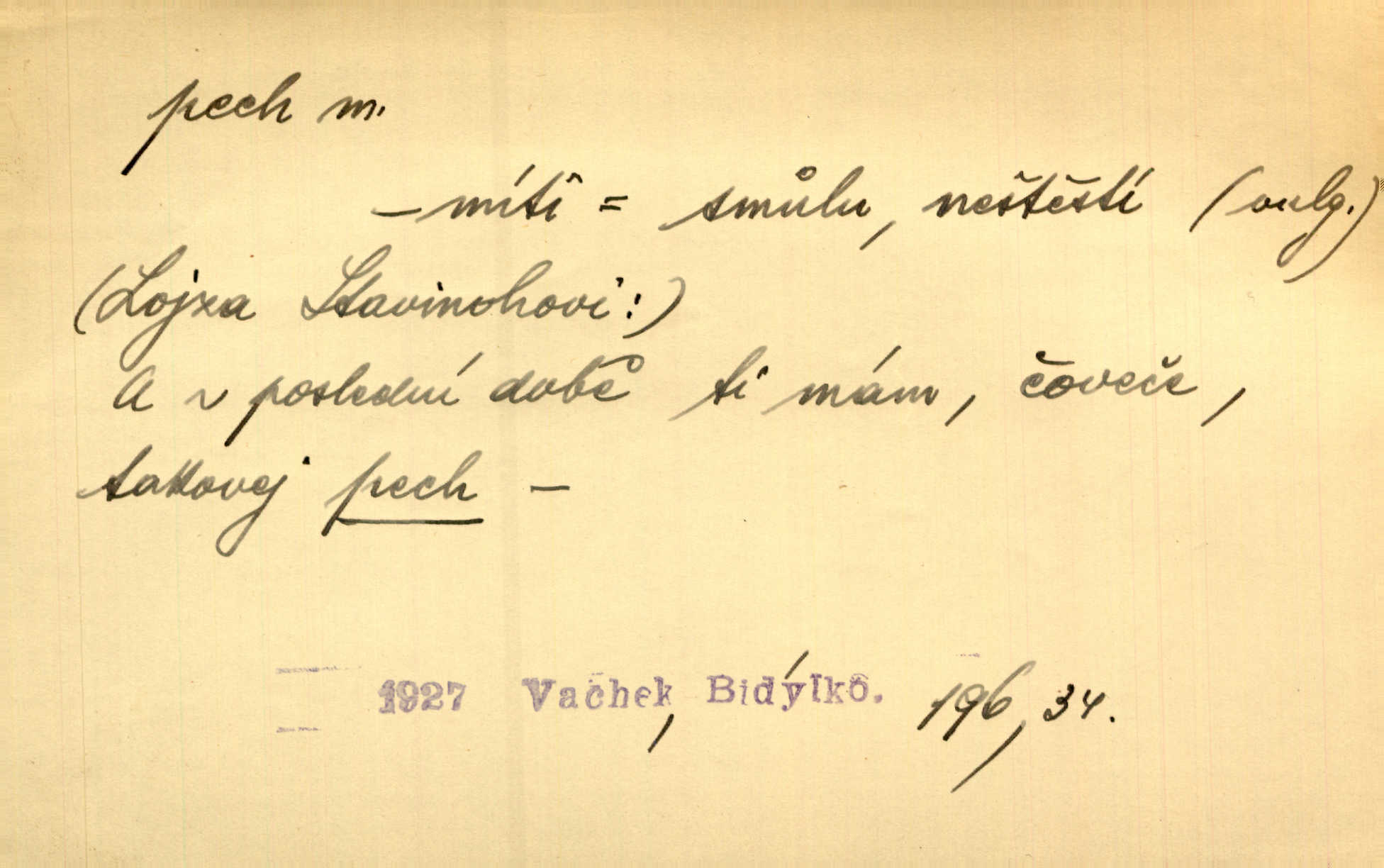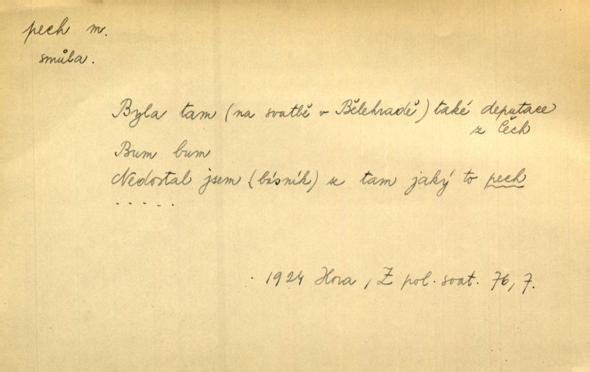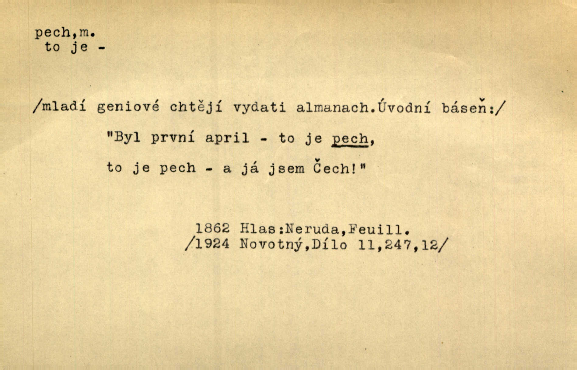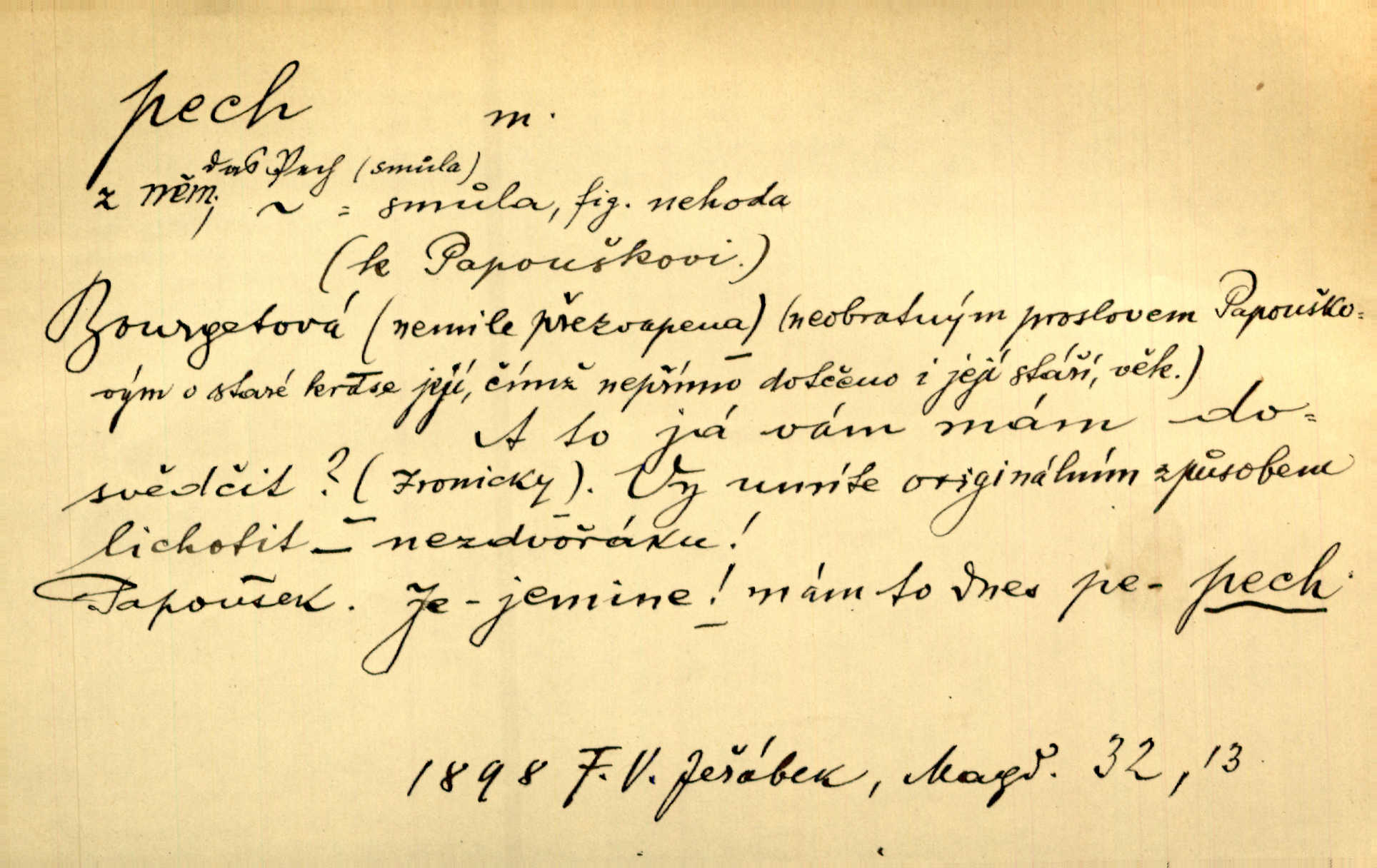 - pech, -u m. lid. nezdar, smůla. Osud tentokrát Rudlovi přál a příslovečný „pech“ se ho pustil. Böhn. Mám zatracenej pech v svým životě! Zaor. Ten [první hoch] štěstí měl, ten [druhý] pech. Dyk.